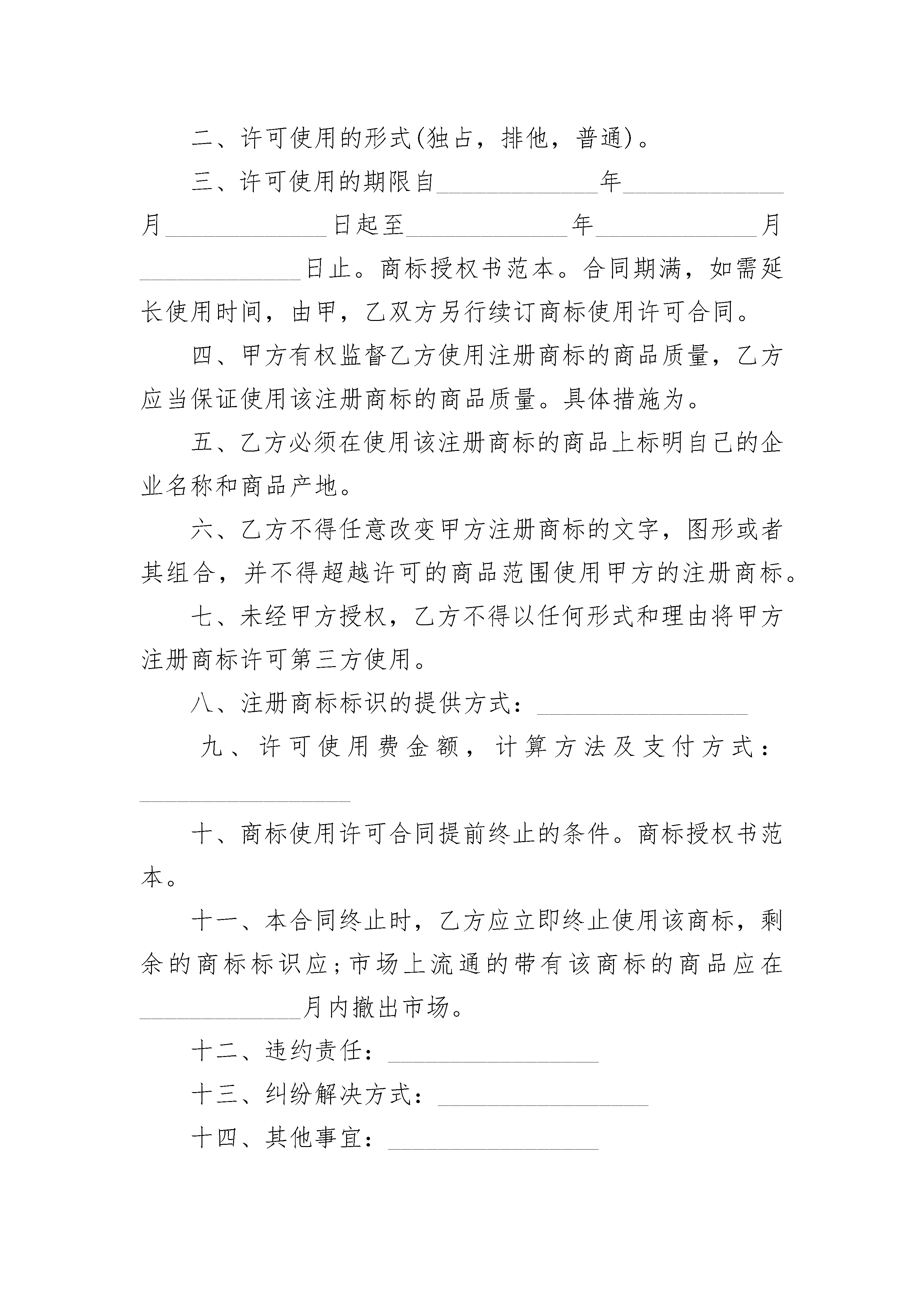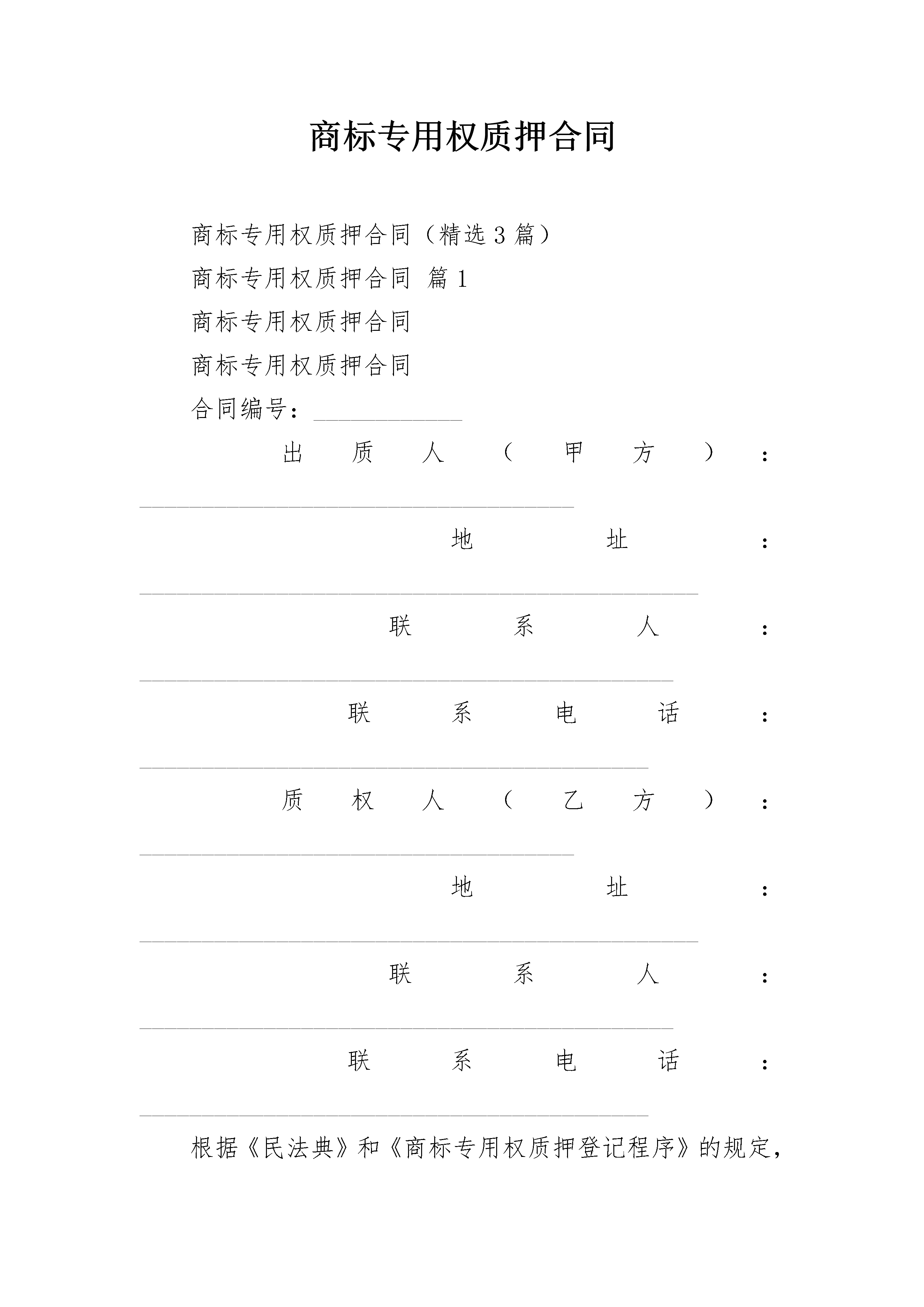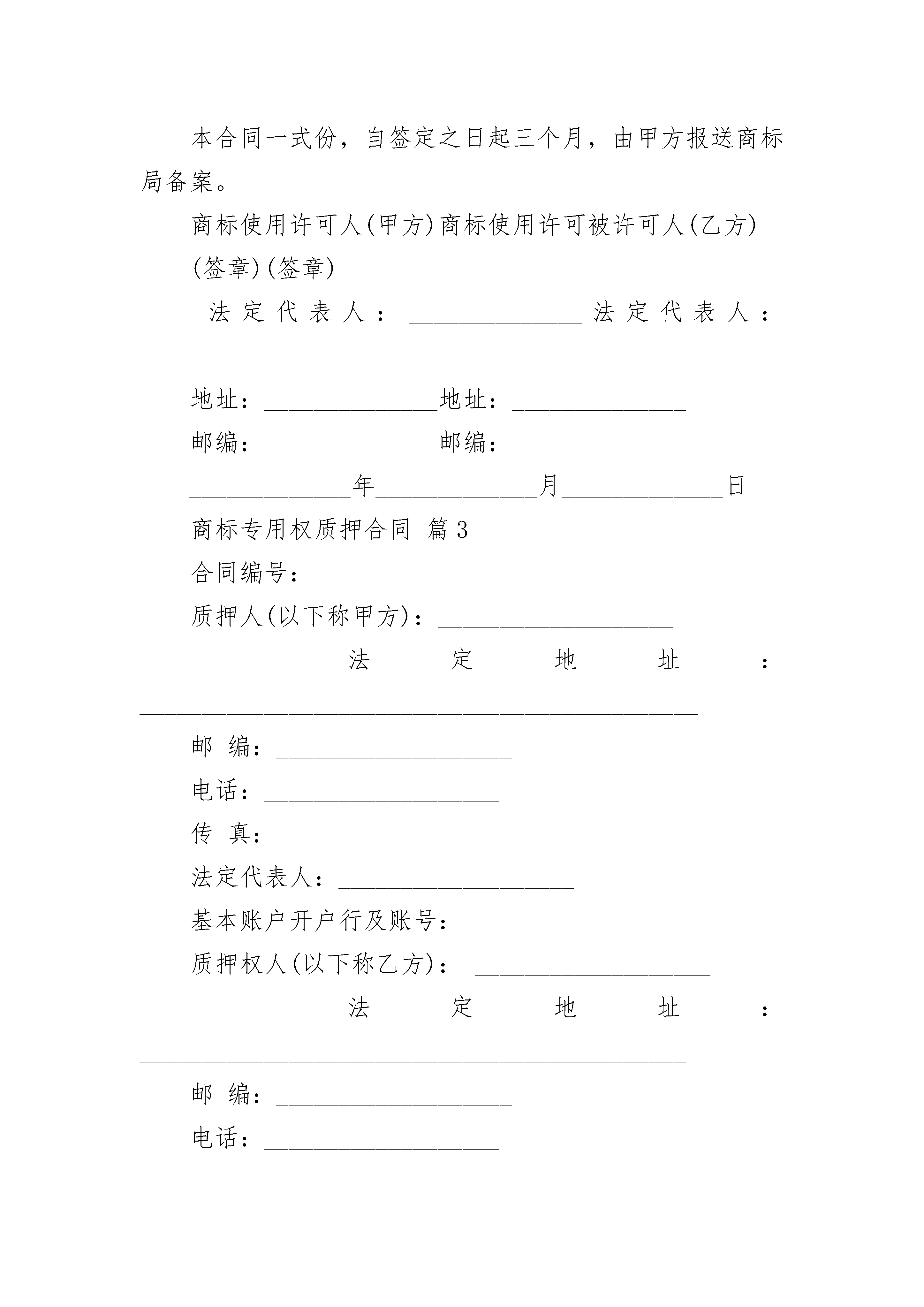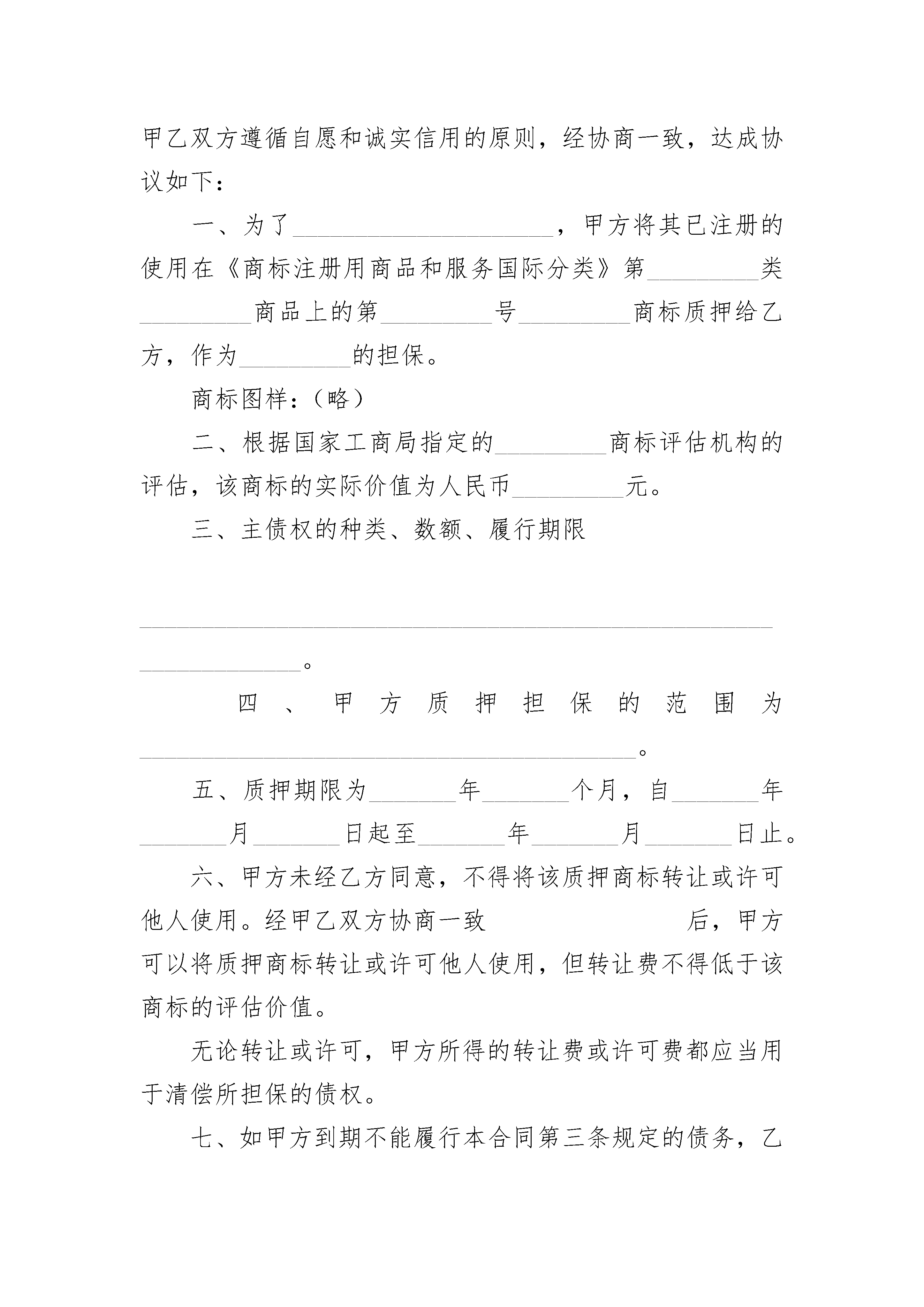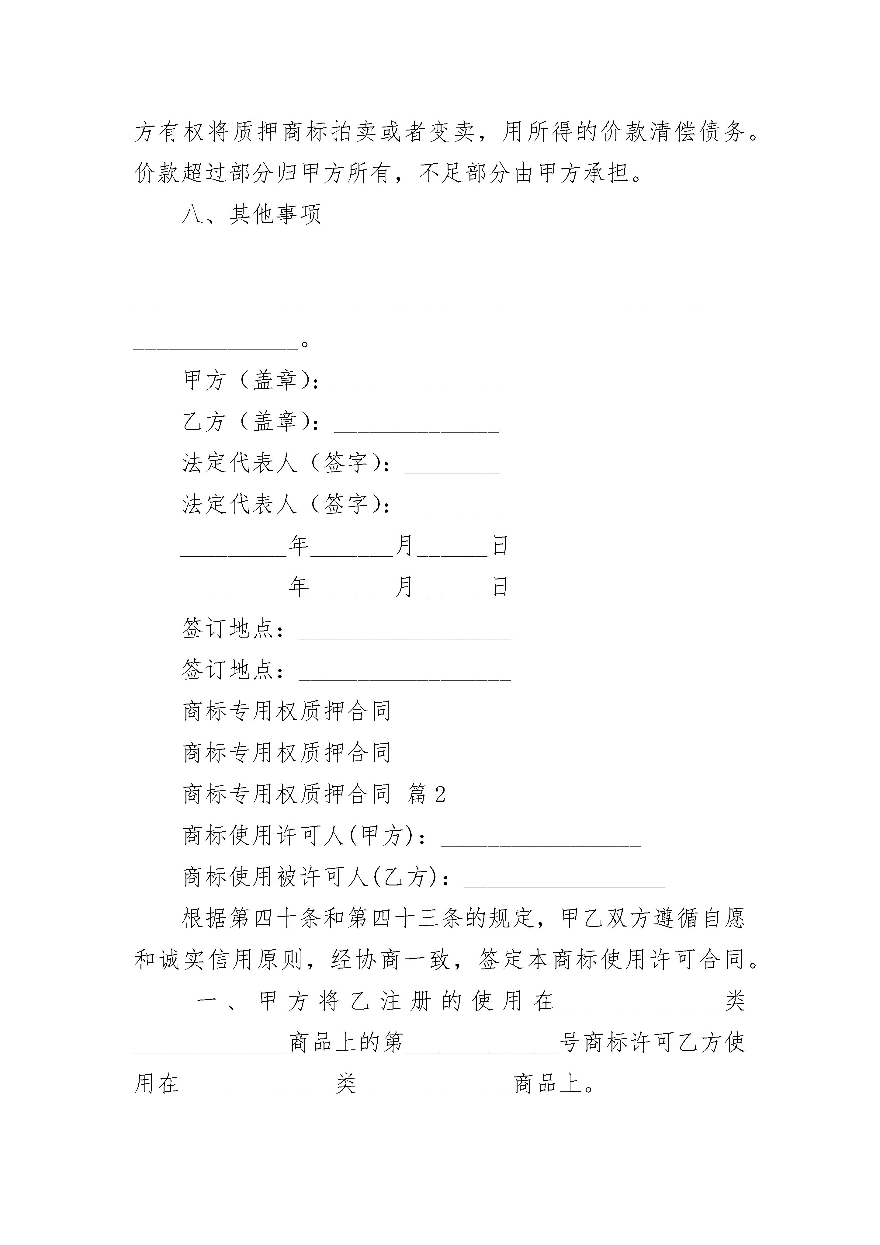 商标专用权质押合同商标专用权质押合同(精选3篇)商标专用权质押合同篇1商标专用权质押合同商标专用权质押合同合同编号:____________出质人(甲方):___________________________________地址:_____________________________________________联系人:___________________________________________联系电话:_________________________________________质权人(乙方):___________________________________地址:_____________________________________________联系人:___________________________________________联系电话:_________________________________________根据《民法典》和《商标专用权质押登记程序》的规定,甲乙双方遵循自愿和诚实信用的原则,经协商一致,达成协议如下:一、为了_____________________,甲方将其已注册的使用在《商标注册用商品和服务国际分类》第_________类_________商品上的第_________号_________商标质押给乙方,作为_________的担保。商标图样:(略)二、根据国家工商局指定的_________商标评估机构的评估,该商标的实际价值为人民币_________元。三、主债权的种类、数额、履行期限________________________________________________________________。四、甲方质押担保的范围为________________________________________。五、质押期限为_______年_______个月,自_______年_______月_______日起至_______年_______月_______日止。六、甲方未经乙方同意,不得将该质押商标转让或许可他人使用。经甲乙双方协商一致后,甲方可以将质押商标转让或许可他人使用,但转让费不得低于该商标的评估价值。无论转让或许可,甲方所得的转让费或许可费都应当用于清偿所担保的债权。七、如甲方到期不能履行本合同第三条规定的债务,乙方有权将质押商标拍卖或者变卖,用所得的价款清偿债务。价款超过部分归甲方所有,不足部分由甲方承担。八、其他事项_________________________________________________________________。甲方(盖章):______________乙方(盖章):______________法定代表人(签字):________法定代表人(签字):_________________年_______月______日_________年_______月______日签订地点:__________________签订地点:__________________商标专用权质押合同商标专用权质押合同商标专用权质押合同篇2商标使用许可人(甲方):_________________商标使用被许可人(乙方):_________________根据第四十条和第四十三条的规定,甲乙双方遵循自愿和诚实信用原则,经协商一致,签定本商标使用许可合同。一、甲方将乙注册的使用在_____________类_____________商品上的第_____________号商标许可乙方使用在_____________类_____________商品上。二、许可使用的形式(独占,排他,普通)。三、许可使用的期限自_____________年_____________月_____________日起至_____________年_____________月_____________日止。商标授权书范本。合同期满,如需延长使用时间,由甲,乙双方另行续订商标使用许可合同。四、甲方有权监督乙方使用注册商标的商品质量,乙方应当保证使用该注册商标的商品质量。具体措施为。五、乙方必须在使用该注册商标的商品上标明自己的企业名称和商品产地。六、乙方不得任意改变甲方注册商标的文字,图形或者其组合,并不得超越许可的商品范围使用甲方的注册商标。七、未经甲方授权,乙方不得以任何形式和理由将甲方注册商标许可第三方使用。八、注册商标标识的提供方式:_________________九、许可使用费金额,计算方法及支付方式:_________________十、商标使用许可合同提前终止的条件。商标授权书范本。十一、本合同终止时,乙方应立即终止使用该