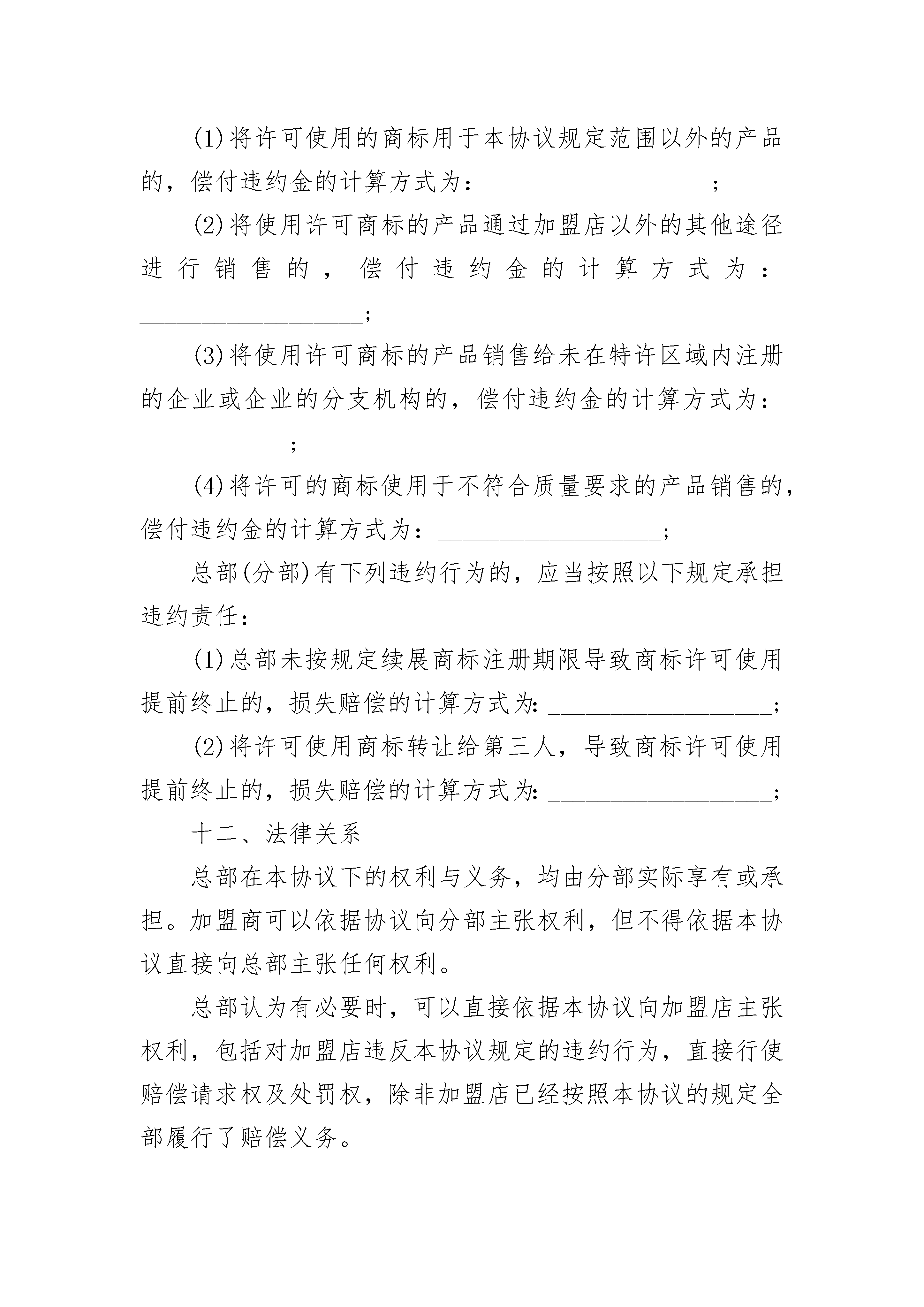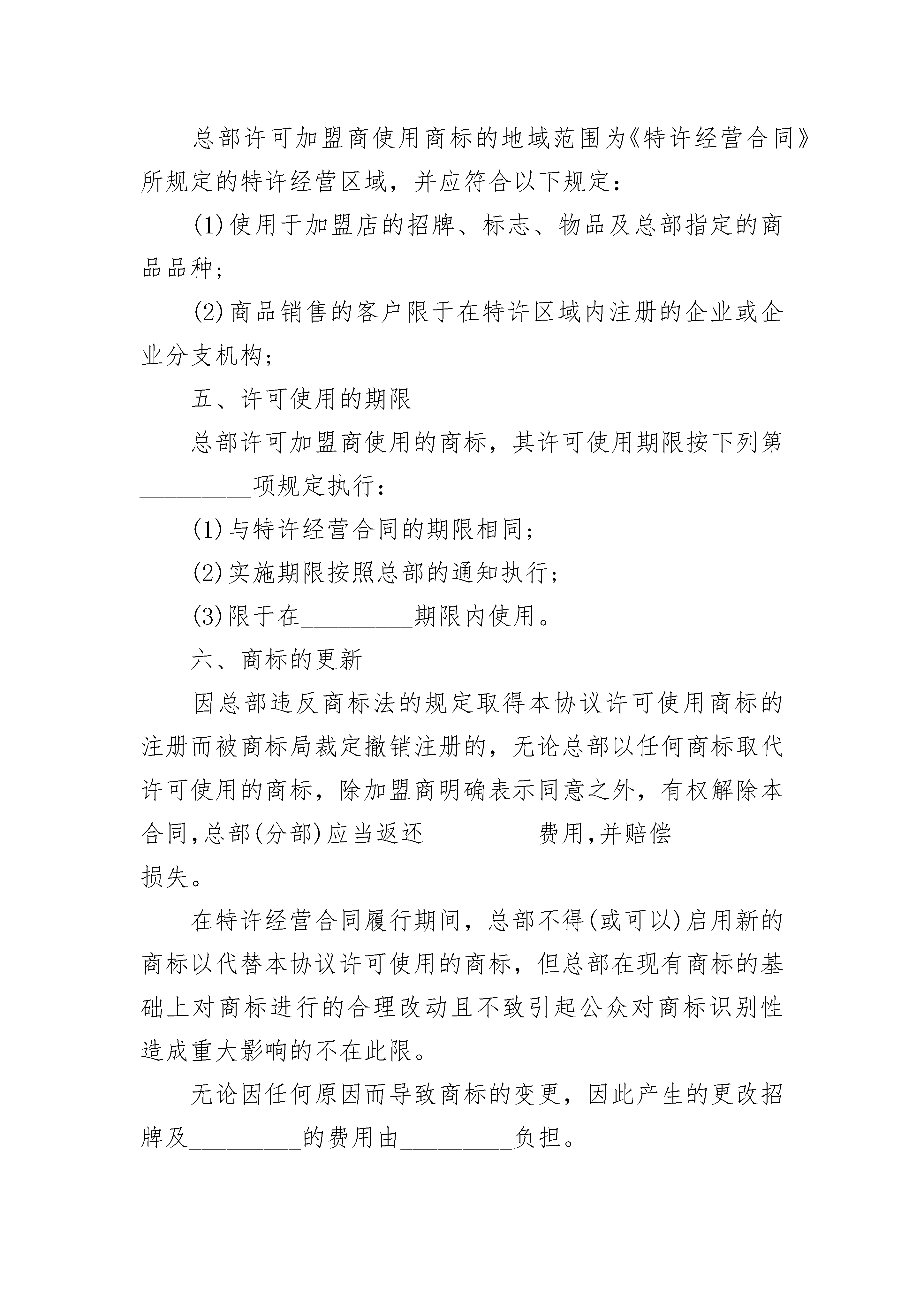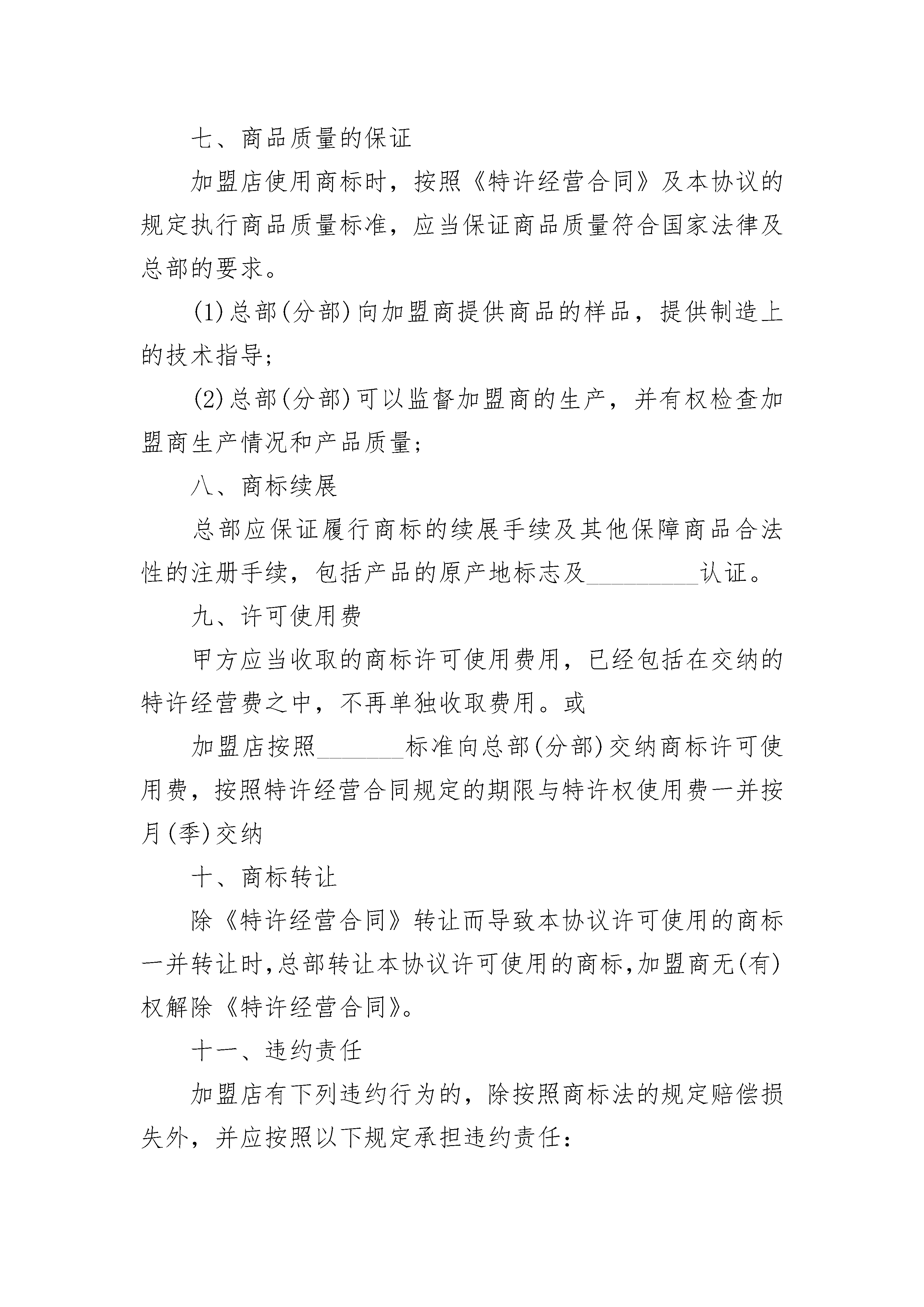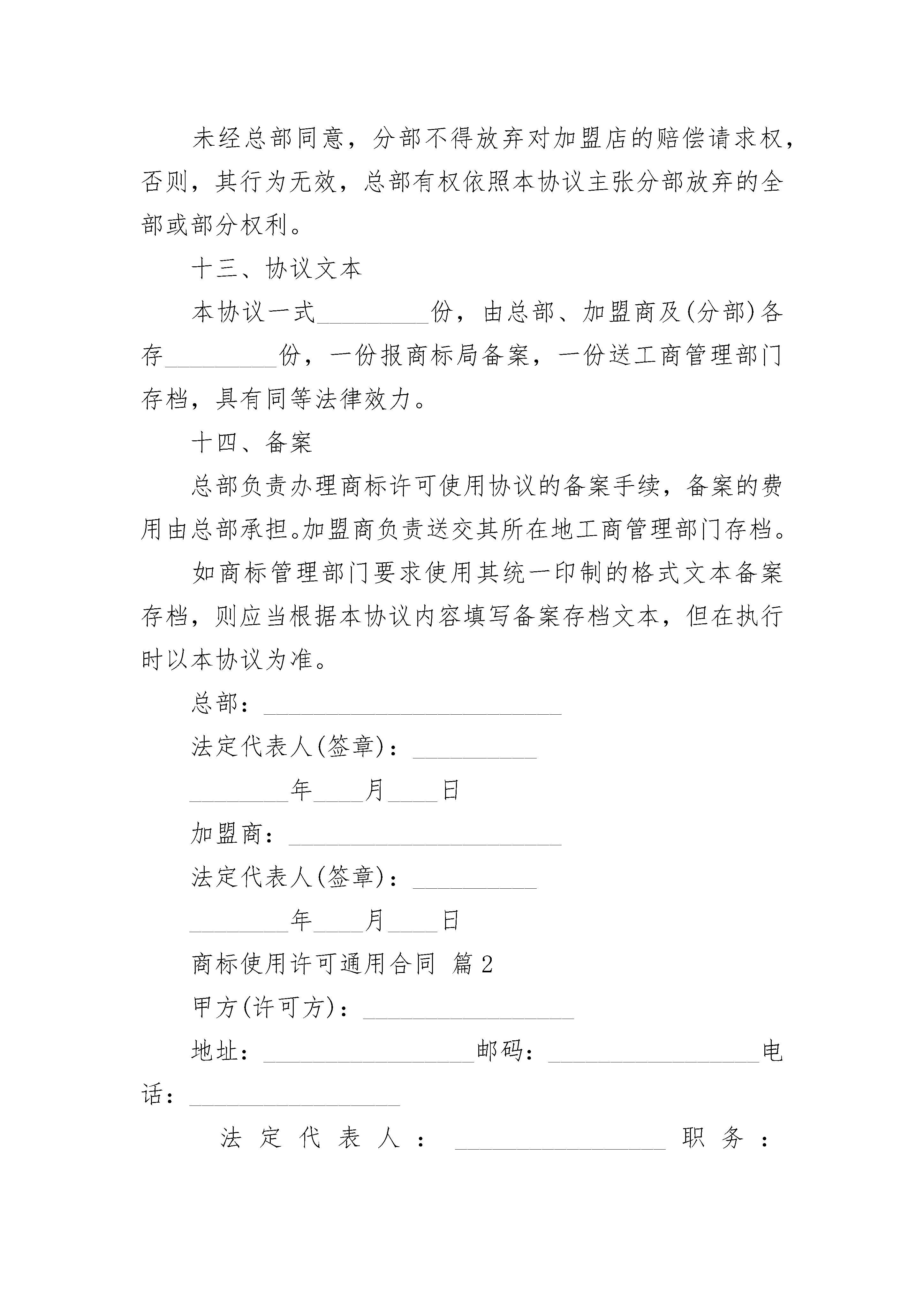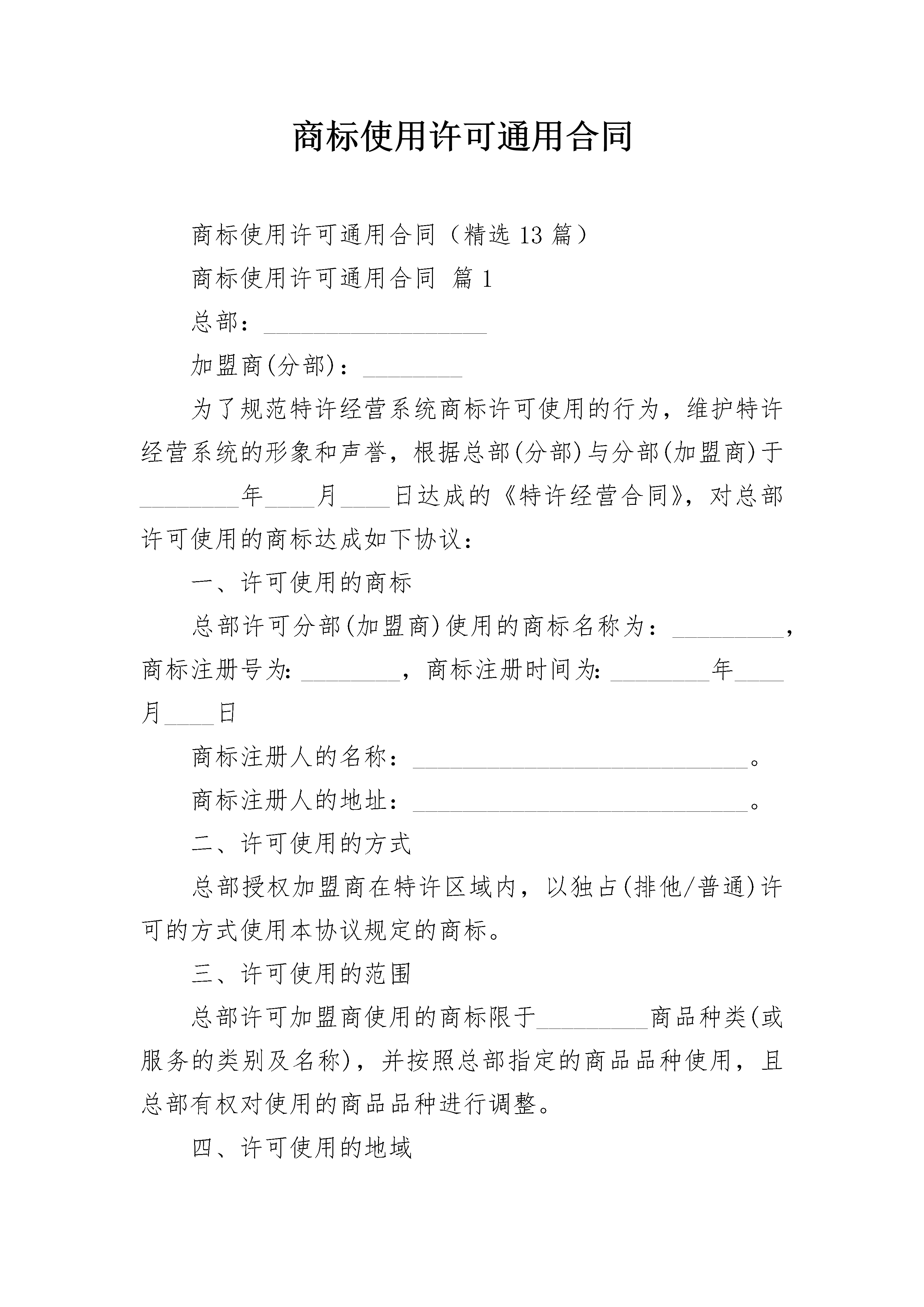 商标使用许可通用合同商标使用许可通用合同(精选13篇)商标使用许可通用合同篇1总部:__________________加盟商(分部):________为了规范特许经营系统商标许可使用的行为,维护特许经营系统的形象和声誉,根据总部(分部)与分部(加盟商)于________年____月____日达成的《特许经营合同》,对总部许可使用的商标达成如下协议:一、许可使用的商标总部许可分部(加盟商)使用的商标名称为:_________,商标注册号为:________,商标注册时间为:________年____月____日商标注册人的名称:___________________________。商标注册人的地址:___________________________。二、许可使用的方式总部授权加盟商在特许区域内,以独占(排他/普通)许可的方式使用本协议规定的商标。三、许可使用的范围总部许可加盟商使用的商标限于_________商品种类(或服务的类别及名称),并按照总部指定的商品品种使用,且总部有权对使用的商品品种进行调整。四、许可使用的地域总部许可加盟商使用商标的地域范围为《特许经营合同》所规定的特许经营区域,并应符合以下规定:(1)使用于加盟店的招牌、标志、物品及总部指定的商品品种;(2)商品销售的客户限于在特许区域内注册的企业或企业分支机构;五、许可使用的期限总部许可加盟商使用的商标,其许可使用期限按下列第_________项规定执行:(1)与特许经营合同的期限相同;(2)实施期限按照总部的通知执行;(3)限于在_________期限内使用。六、商标的更新因总部违反商标法的规定取得本协议许可使用商标的注册而被商标局裁定撤销注册的,无论总部以任何商标取代许可使用的商标,除加盟商明确表示同意之外,有权解除本合同,总部(分部)应当返还_________费用,并赔偿_________损失。在特许经营合同履行期间,总部不得(或可以)启用新的商标以代替本协议许可使用的商标,但总部在现有商标的基础上对商标进行的合理改动且不致引起公众对商标识别性造成重大影响的不在此限。无论因任何原因而导致商标的变更,因此产生的更改招牌及_________的费用由_________负担。七、商品质量的保证加盟店使用商标时,按照《特许经营合同》及本协议的规定执行商品质量标准,应当保证商品质量符合国家法律及总部的要求。(1)总部(分部)向加盟商提供商品的样品,提供制造上的技术指导;(2)总部(分部)可以监督加盟商的生产,并有权检查加盟商生产情况和产品质量;八、商标续展总部应保证履行商标的续展手续及其他保障商品合法性的注册手续,包括产品的原产地标志及_________认证。九、许可使用费甲方应当收取的商标许可使用费用,已经包括在交纳的特许经营费之中,不再单独收取费用。或加盟店按照_______标准向总部(分部)交纳商标许可使用费,按照特许经营合同规定的期限与特许权使用费一并按月(季)交纳十、商标转让除《特许经营合同》转让而导致本协议许可使用的商标一并转让时,总部转让本协议许可使用的商标,加盟商无(有)权解除《特许经营合同》。十一、违约责任加盟店有下列违约行为的,除按照商标法的规定赔偿损失外,并应按照以下规定承担违约责任:(1)将许可使用的商标用于本协议规定范围以外的产品的,偿付违约金的计算方式为:__________________;(2)将使用许可商标的产品通过加盟店以外的其他途径进行销售的,偿付违约金的计算方式为:__________________;(3)将使用许可商标的产品销售给未在特许区域内注册的企业或企业的分支机构的,偿付违约金的计算方式为:____________;(4)将许可的商标使用于不符合质量要求的产品销售的,偿付违约金的计算方式为:__________________;总部(分部)有下列违约行为的,应当按照以下规定承担违约责任:(1)总部未按规定续展商标注册期限导致商标许可使用提前终止的,损失赔偿的计算方式为:__________________;(2)将许可使用商标转让给第三人,导致商标许可使用提前终止的,损失赔偿的计算方式为:__________________;十二、法律关系总部在本协议下的权利与义务,均由分部实际享有或承担。加盟商可以依据协议向分部主张权利,但不得依据本协议直接向总部主张任何权利。总部认为有必要时,可以直接依据本协议向加盟店主张权利,包括对加盟店违反本协议规定的违约行为,直接行使赔偿请求权及处罚权,除非加盟店已经按照本协议的规定全部履行了赔偿义务。未经总部同意,分部不得放弃对加盟店的赔偿请求权,否则,其行为无效,总部有权依照本协议主张分部放弃的全部或部分权利。十三、协议文本本协议一式_________份,由总部、加盟商及(分