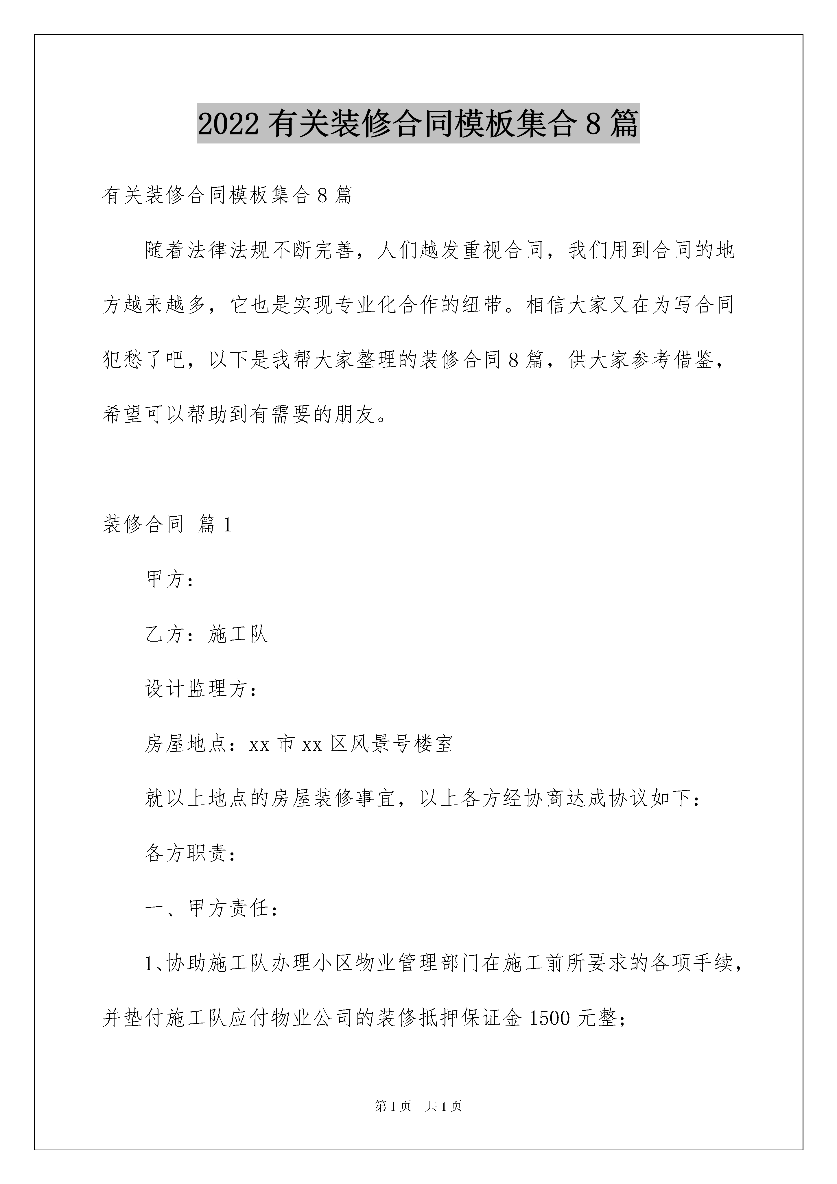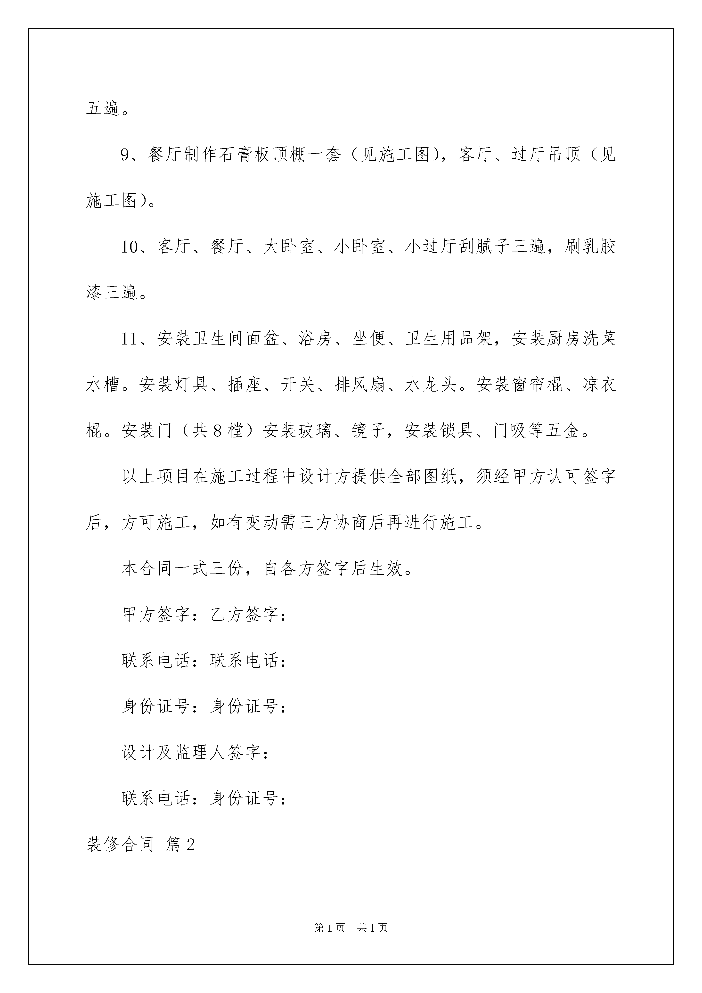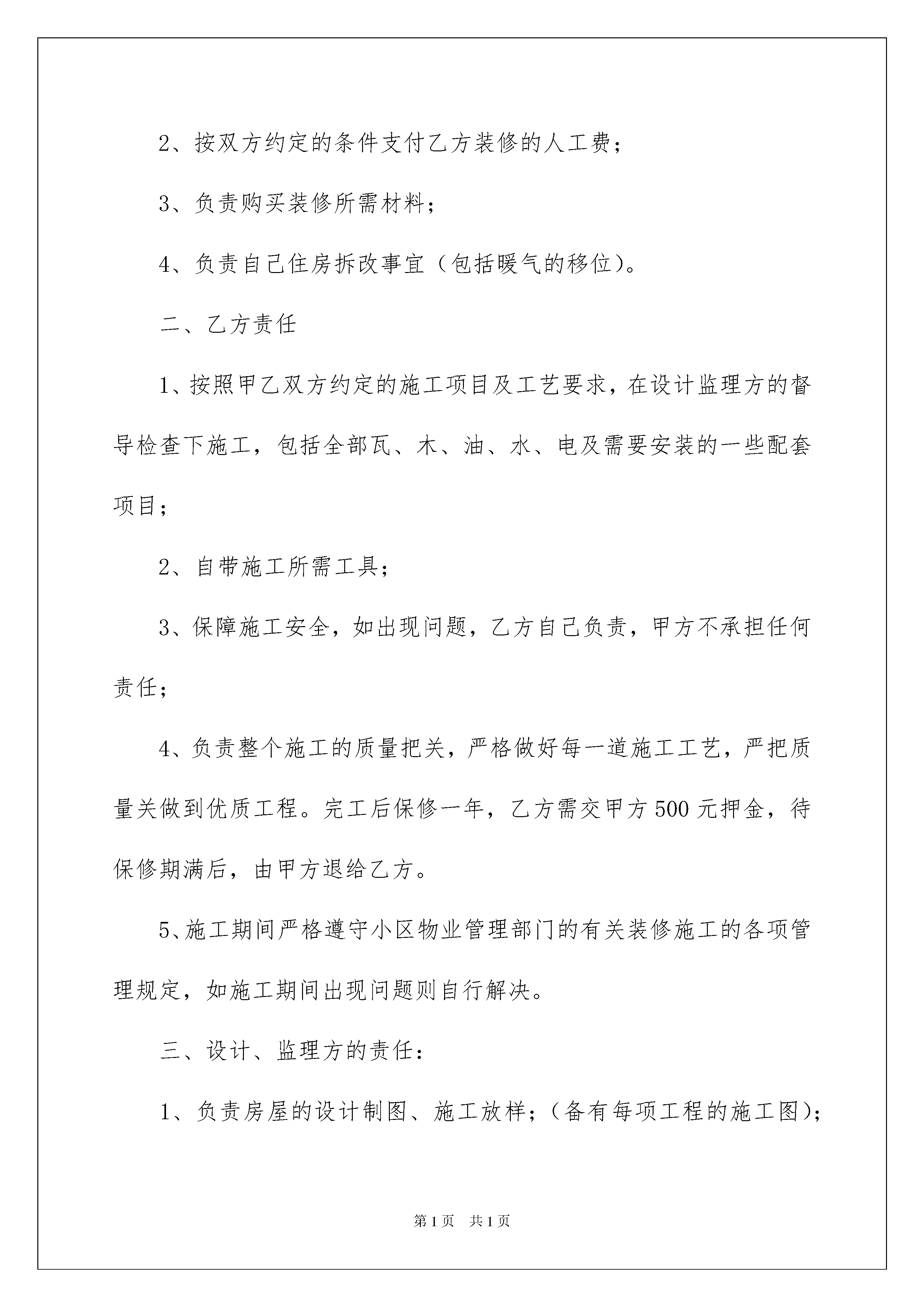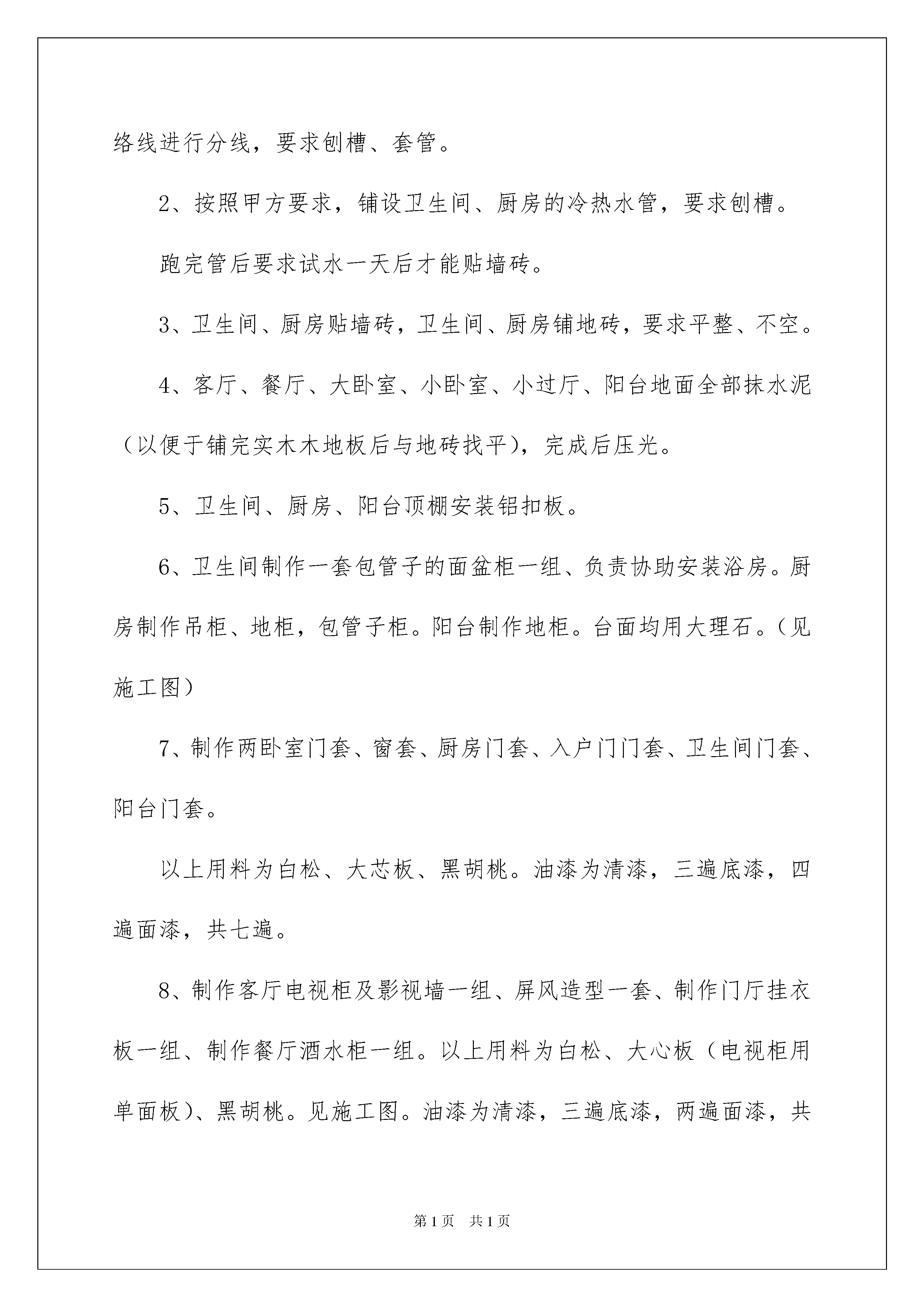 2022有关装修合同模板集合8篇有关装修合同模板集合8篇随着法律法规不断完善,人们越发重视合同,我们用到合同的地方越来越多,它也是实现专业化合作的纽带。相信大家又在为写合同犯愁了吧,以下是我帮大家整理的装修合同8篇,供大家参考借鉴,希望可以帮助到有需要的朋友。装修合同篇1甲方:乙方:施工队设计监理方:房屋地点:xx市xx区风景号楼室就以上地点的房屋装修事宜,以上各方经协商达成协议如下:各方职责:一、甲方责任:1、协助施工队办理小区物业管理部门在施工前所要求的各项手续,并垫付施工队应付物业公司的装修抵押保证金1500元整;2、按双方约定的条件支付乙方装修的人工费;3、负责购买装修所需材料;4、负责自己住房拆改事宜(包括暖气的移位)。二、乙方责任1、按照甲乙双方约定的施工项目及工艺要求,在设计监理方的督导检查下施工,包括全部瓦、木、油、水、电及需要安装的一些配套项目;2、自带施工所需工具;3、保障施工安全,如出现问题,乙方自己负责,甲方不承担任何责任;4、负责整个施工的质量把关,严格做好每一道施工工艺,严把质量关做到优质工程。完工后保修一年,乙方需交甲方500元押金,待保修期满后,由甲方退给乙方。5、施工期间严格遵守小区物业管理部门的有关装修施工的各项管理规定,如施工期间出现问题则自行解决。三、设计、监理方的责任:1、负责房屋的设计制图、施工放样;(备有每项工程的施工图);收取1200元劳务费;2、负责协助甲方选择装修材料;3、负责对施工队工程质量、工艺的具体指导和监理,每天必须到施工现场并在重要工程施工过程中与甲方共同验收后,方可进行下一工程进度(包括全部瓦、木、油、水、电等,每项工程至少有1-2次验收),收取800元工艺及监理费。上述费用分两次付清,第一次付1000元,工程结束经甲方验收合格后给付第二次的1000元款项。人工费及付款方式整个装修工程的人工费(包括设计、施工、监理费)共__________圆整。甲方按工程进度分四次支付,施工队进场施工时支付1000元整,开工15日后如履约较好(水、电改造完毕)经第一次验收合格后,再支付1000元整,吊顶、厨房及卫生间、所有门口完工并经验收合格后,再支付工程款xx元,工程全部,并按规定将施工现场清整完毕,经甲方认可与物业公司联系,确认无赔偿问题后,向施工队支付全部施工费的剩余款项。施工项目及工艺:1、按照甲方要求,对整个房屋的电线、电话线、闭路电视线、网络线进行分线,要求刨槽、套管。2、按照甲方要求,铺设卫生间、厨房的冷热水管,要求刨槽。跑完管后要求试水一天后才能贴墙砖。3、卫生间、厨房贴墙砖,卫生间、厨房铺地砖,要求平整、不空。4、客厅、餐厅、大卧室、小卧室、小过厅、阳台地面全部抹水泥(以便于铺完实木木地板后与地砖找平),完成后压光。5、卫生间、厨房、阳台顶棚安装铝扣板。6、卫生间制作一套包管子的面盆柜一组、负责协助安装浴房。厨房制作吊柜、地柜,包管子柜。阳台制作地柜。台面均用大理石。(见施工图)7、制作两卧室门套、窗套、厨房门套、入户门门套、卫生间门套、阳台门套。以上用料为白松、大芯板、黑胡桃。油漆为清漆,三遍底漆,四遍面漆,共七遍。8、制作客厅电视柜及影视墙一组、屏风造型一套、制作门厅挂衣板一组、制作餐厅酒水柜一组。以上用料为白松、大心板(电视柜用单面板)、黑胡桃。见施工图。油漆为清漆,三遍底漆,两遍面漆,共五遍。9、餐厅制作石膏板顶棚一套(见施工图),客厅、过厅吊顶(见施工图)。10、客厅、餐厅、大卧室、小卧室、小过厅刮腻子三遍,刷乳胶漆三遍。11、安装卫生间面盆、浴房、坐便、卫生用品架,安装厨房洗菜水槽。安装灯具、插座、开关、排风扇、水龙头。安装窗帘棍、凉衣棍。安装门(共8樘)安装玻璃、镜子,安装锁具、门吸等五金。以上项目在施工过程中设计方提供全部图纸,须经甲方认可签字后,方可施工,如有变动需三方协商后再进行施工。本合同一式三份,自各方签字后生效。甲方签字:乙方签字:联系电话:联系电话:身份证号:身份证号:设计及监理人签字:联系电话:身份证号:装修合同篇2随着人们对于房屋装修质量的要求越来越高,和装修公司出现装修纠纷的事件也越来越多。而一旦出现装修纠纷,装修合同就是保障住户利益的最主要依据,因此我们在签订装修合同的时候需要慎而又慎,特别需要注意装修合同之中的细节问题。装修合同之中需要注意哪些细节问题呢?下面就让我为大家介绍一下签订装修合同的时候需要注意的细节问题,让您远离装修合同纠纷,保证您的切身利益。注意装修合同之中的细节问题,我们想要了解装修合同的构成。装修合同装修住户和装修公司签订的具有法律效益的文件,对于装修