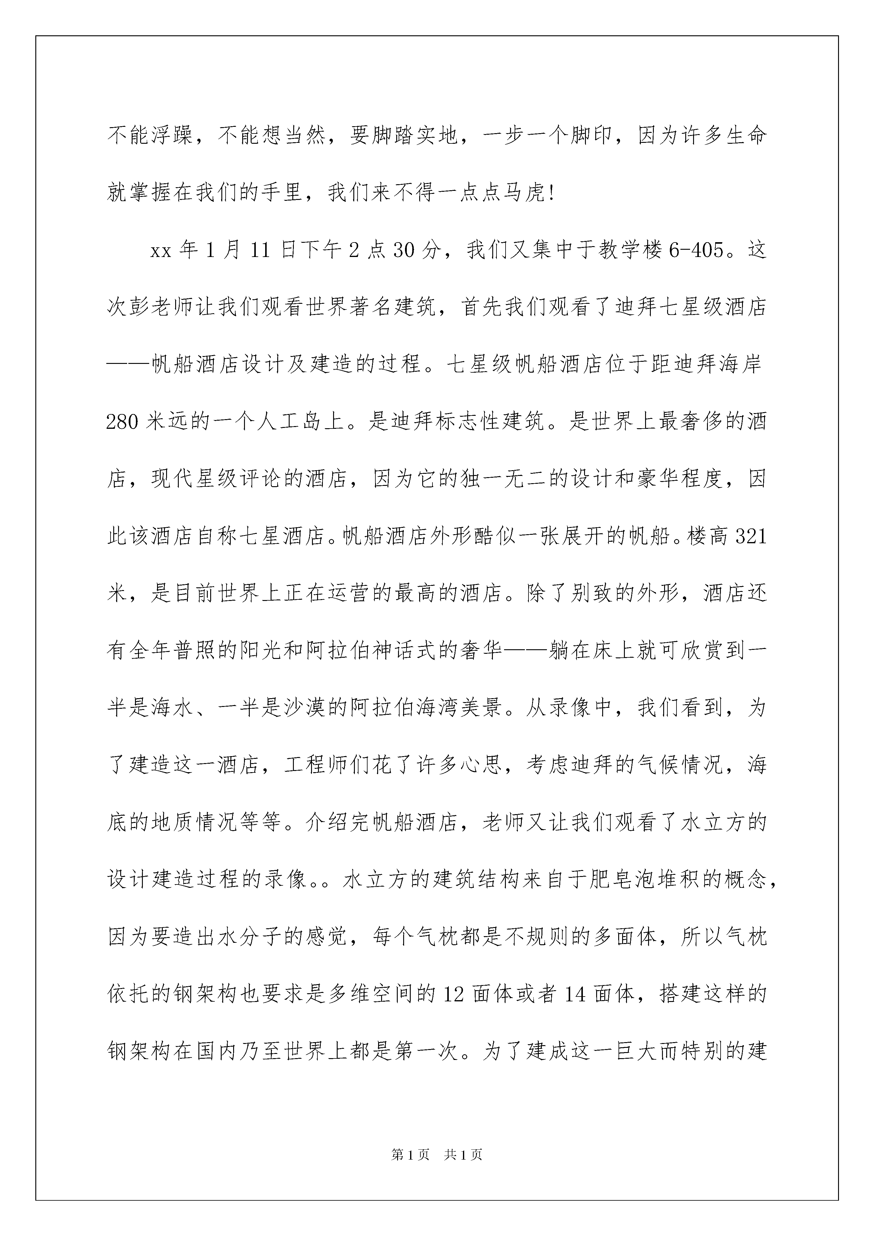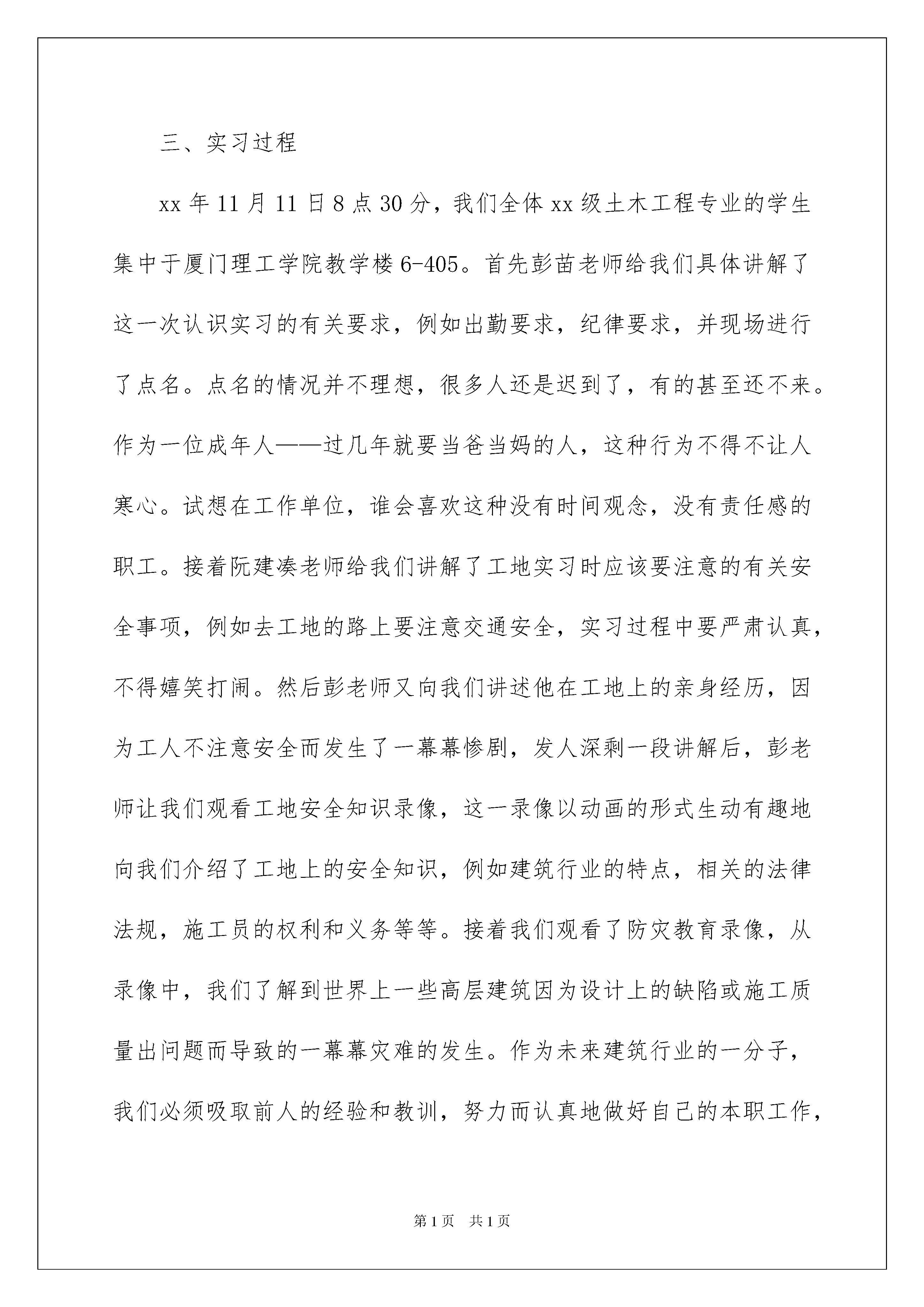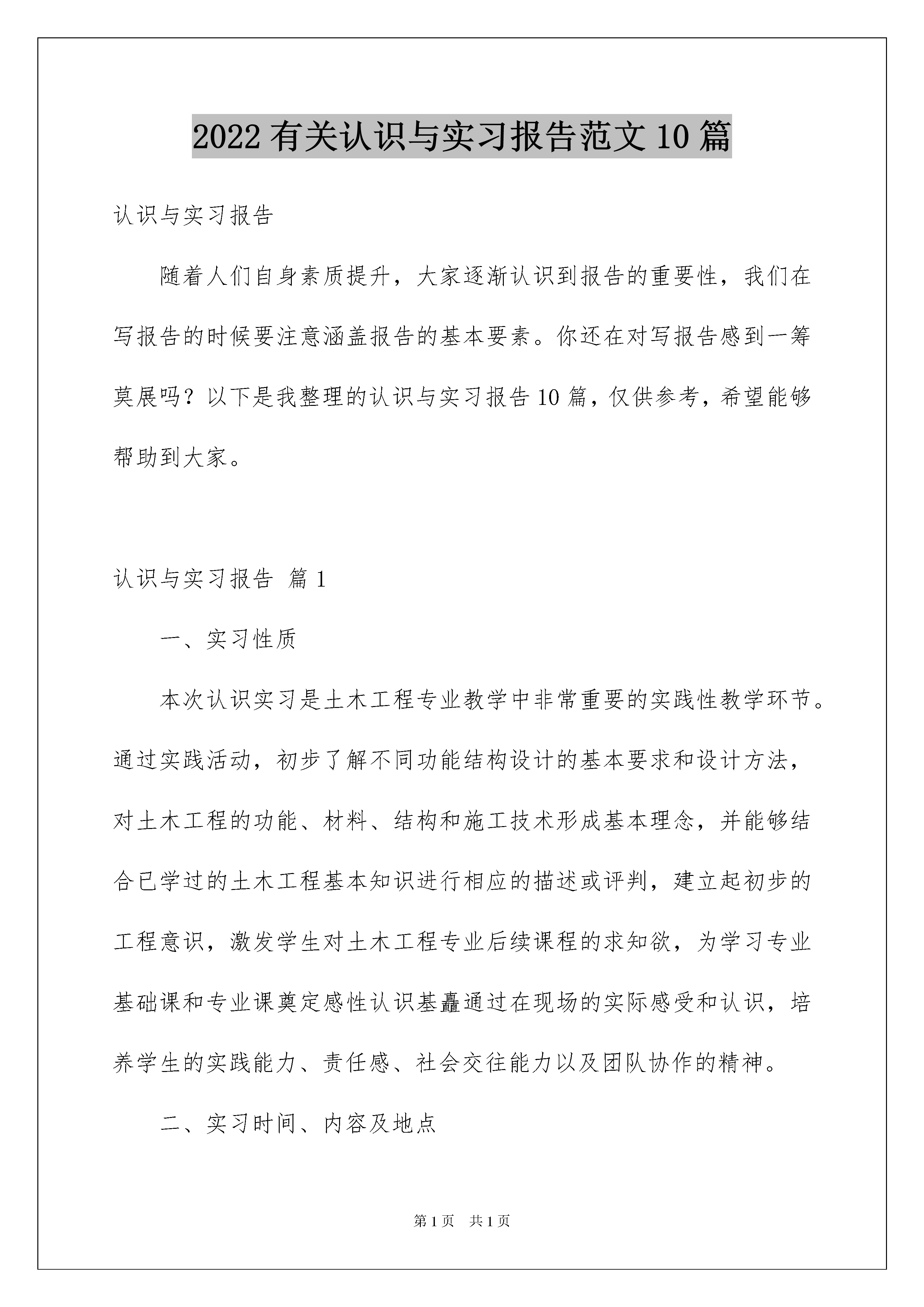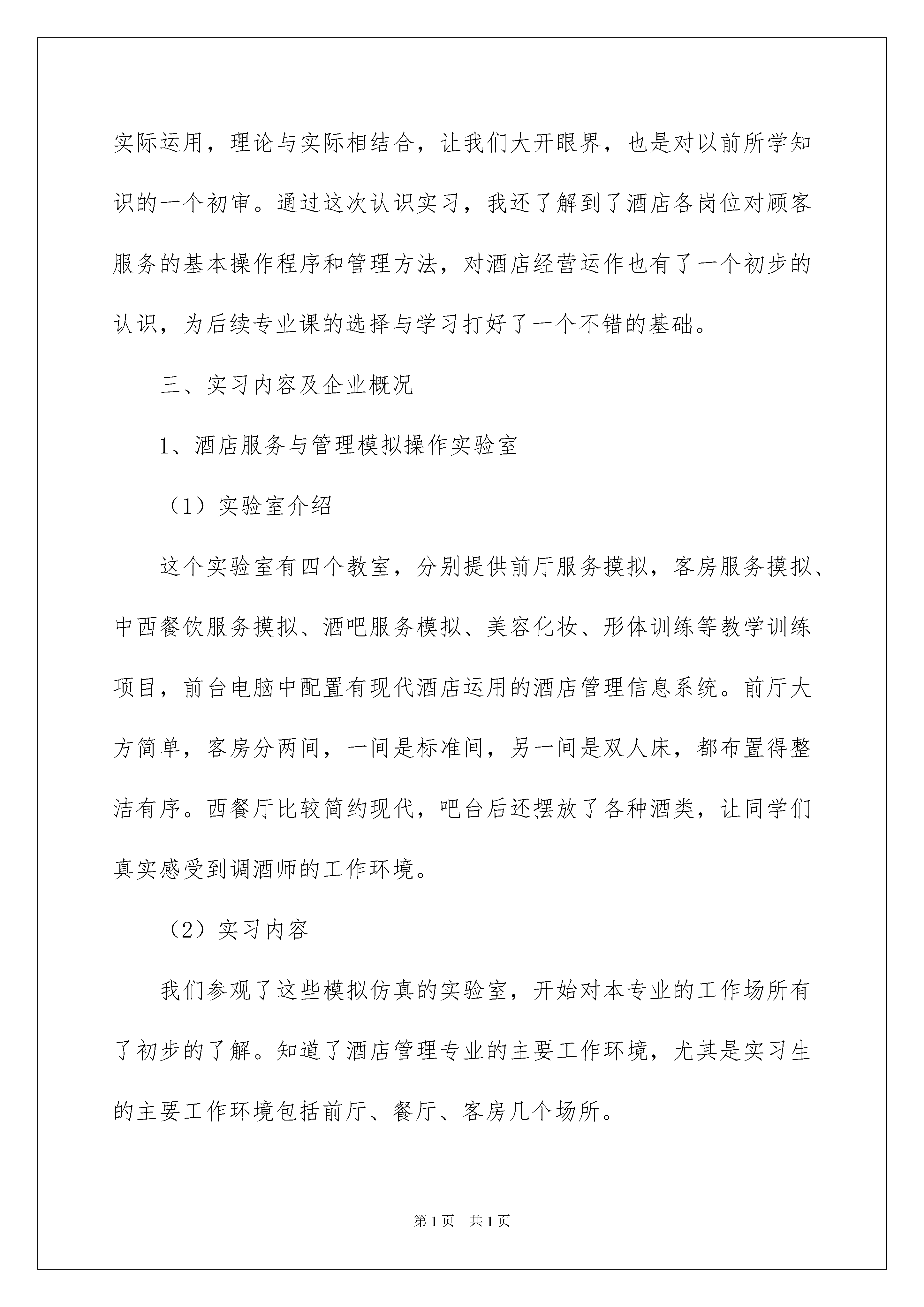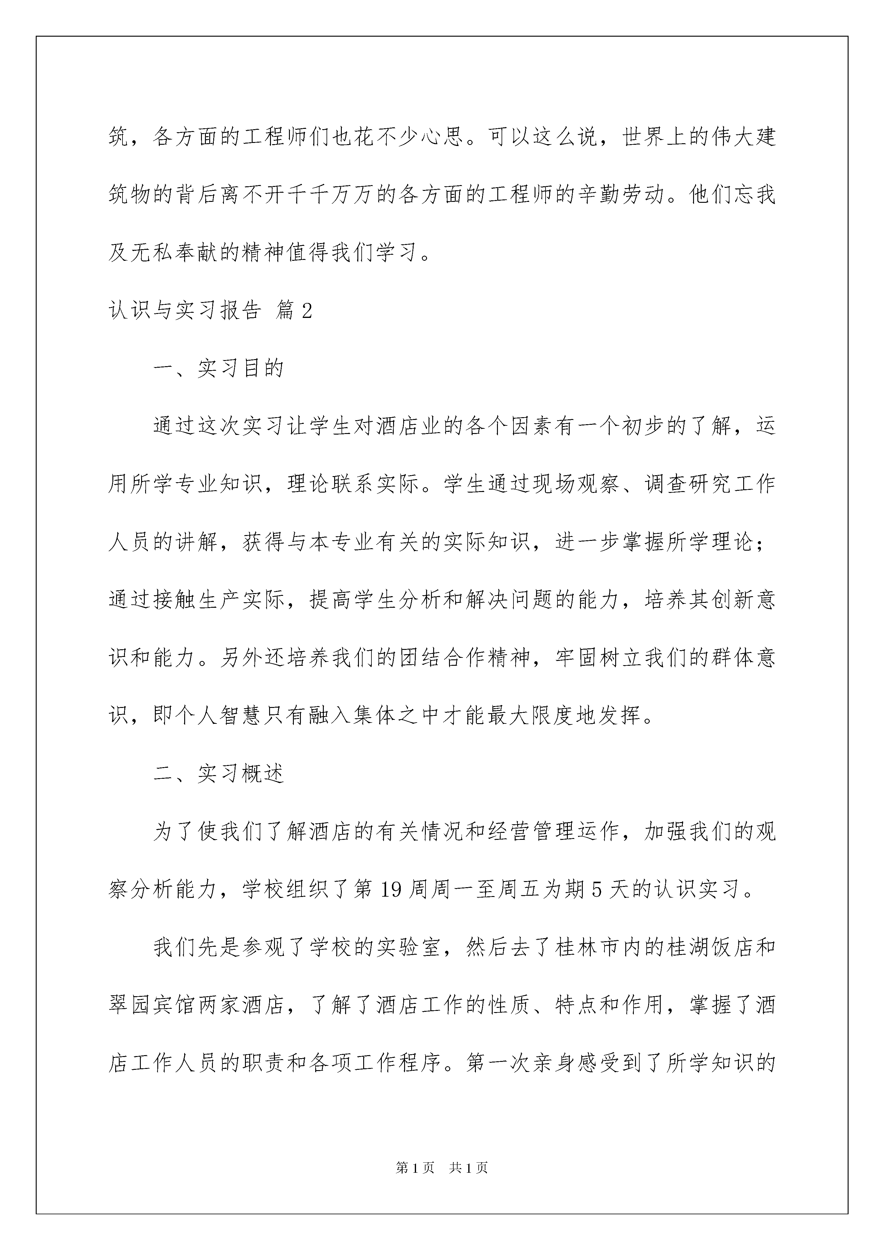 2022有关认识与实习报告范文10篇认识与实习报告随着人们自身素质提升,大家逐渐认识到报告的重要性,我们在写报告的时候要注意涵盖报告的基本要素。你还在对写报告感到一筹莫展吗?以下是我整理的认识与实习报告10篇,仅供参考,希望能够帮助到大家。认识与实习报告篇1一、实习性质本次认识实习是土木工程专业教学中非常重要的实践性教学环节。通过实践活动,初步了解不同功能结构设计的基本要求和设计方法,对土木工程的功能、材料、结构和施工技术形成基本理念,并能够结合已学过的土木工程基本知识进行相应的描述或评判,建立起初步的工程意识,激发学生对土木工程专业后续课程的求知欲,为学习专业基础课和专业课奠定感性认识基矗通过在现场的实际感受和认识,培养学生的实践能力、责任感、社会交往能力以及团队协作的精神。二、实习时间、内容及地点三、实习过程xx年11月11日8点30分,我们全体xx级土木工程专业的学生集中于厦门理工学院教学楼6-405。首先彭苗老师给我们具体讲解了这一次认识实习的有关要求,例如出勤要求,纪律要求,并现场进行了点名。点名的情况并不理想,很多人还是迟到了,有的甚至还不来。作为一位成年人——过几年就要当爸当妈的人,这种行为不得不让人寒心。试想在工作单位,谁会喜欢这种没有时间观念,没有责任感的职工。接着阮建凑老师给我们讲解了工地实习时应该要注意的有关安全事项,例如去工地的路上要注意交通安全,实习过程中要严肃认真,不得嬉笑打闹。然后彭老师又向我们讲述他在工地上的亲身经历,因为工人不注意安全而发生了一幕幕惨剧,发人深剩一段讲解后,彭老师让我们观看工地安全知识录像,这一录像以动画的形式生动有趣地向我们介绍了工地上的安全知识,例如建筑行业的特点,相关的法律法规,施工员的权利和义务等等。接着我们观看了防灾教育录像,从录像中,我们了解到世界上一些高层建筑因为设计上的缺陷或施工质量出问题而导致的一幕幕灾难的发生。作为未来建筑行业的一分子,我们必须吸取前人的经验和教训,努力而认真地做好自己的本职工作,不能浮躁,不能想当然,要脚踏实地,一步一个脚印,因为许多生命就掌握在我们的手里,我们来不得一点点马虎!xx年1月11日下午2点30分,我们又集中于教学楼6-405。这次彭老师让我们观看世界著名建筑,首先我们观看了迪拜七星级酒店——帆船酒店设计及建造的过程。七星级帆船酒店位于距迪拜海岸280米远的一个人工岛上。是迪拜标志性建筑。是世界上最奢侈的酒店,现代星级评论的酒店,因为它的独一无二的设计和豪华程度,因此该酒店自称七星酒店。帆船酒店外形酷似一张展开的帆船。楼高321米,是目前世界上正在运营的最高的酒店。除了别致的外形,酒店还有全年普照的阳光和阿拉伯神话式的奢华——躺在床上就可欣赏到一半是海水、一半是沙漠的阿拉伯海湾美景。从录像中,我们看到,为了建造这一酒店,工程师们花了许多心思,考虑迪拜的气候情况,海底的地质情况等等。介绍完帆船酒店,老师又让我们观看了水立方的设计建造过程的录像。。水立方的建筑结构来自于肥皂泡堆积的概念,因为要造出水分子的感觉,每个气枕都是不规则的多面体,所以气枕依托的钢架构也要求是多维空间的12面体或者14面体,搭建这样的钢架构在国内乃至世界上都是第一次。为了建成这一巨大而特别的建筑,各方面的工程师们也花不少心思。可以这么说,世界上的伟大建筑物的背后离不开千千万万的各方面的工程师的辛勤劳动。他们忘我及无私奉献的精神值得我们学习。认识与实习报告篇2一、实习目的通过这次实习让学生对酒店业的各个因素有一个初步的了解,运用所学专业知识,理论联系实际。学生通过现场观察、调查研究工作人员的讲解,获得与本专业有关的实际知识,进一步掌握所学理论;通过接触生产实际,提高学生分析和解决问题的能力,培养其创新意识和能力。另外还培养我们的团结合作精神,牢固树立我们的群体意识,即个人智慧只有融入集体之中才能最大限度地发挥。二、实习概述为了使我们了解酒店的有关情况和经营管理运作,加强我们的观察分析能力,学校组织了第19周周一至周五为期5天的认识实习。我们先是参观了学校的实验室,然后去了桂林市内的桂湖饭店和翠园宾馆两家酒店,了解了酒店工作的性质、特点和作用,掌握了酒店工作人员的职责和各项工作程序。第一次亲身感受到了所学知识的实际运用,理论与实际相结合,让我们大开眼界,也是对以前所学知识的一个初审。通过这次认识实习,我还了解到了酒店各岗位对顾客服务的基本操作程序和管理方法,对酒店经营运作也有了一个初步的认识,为后续专业课的选择与学习打好了一个不错的基础。三、实习内容及企业概况1、酒店服务与管理模拟操作实验室(1)实验室介绍这