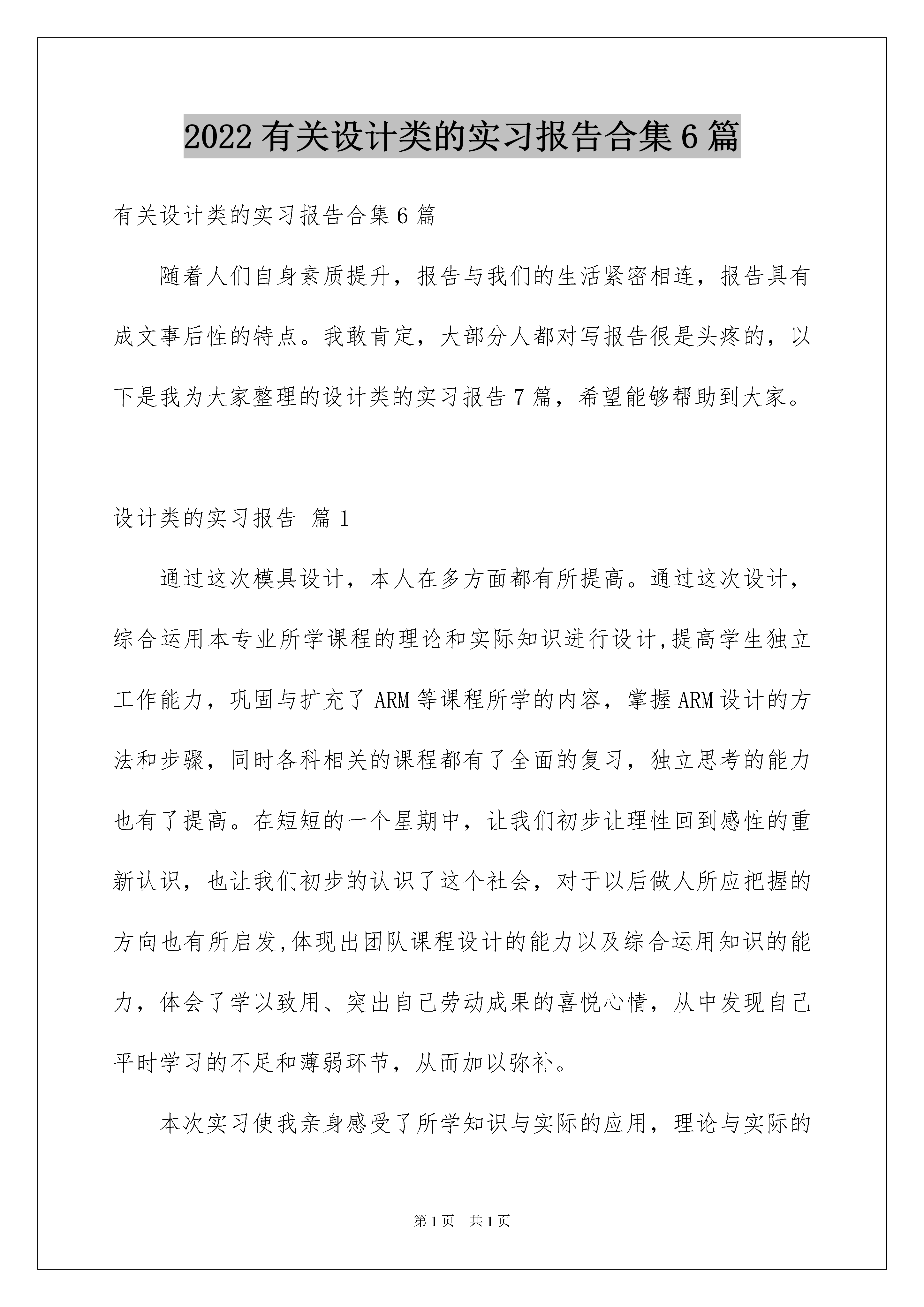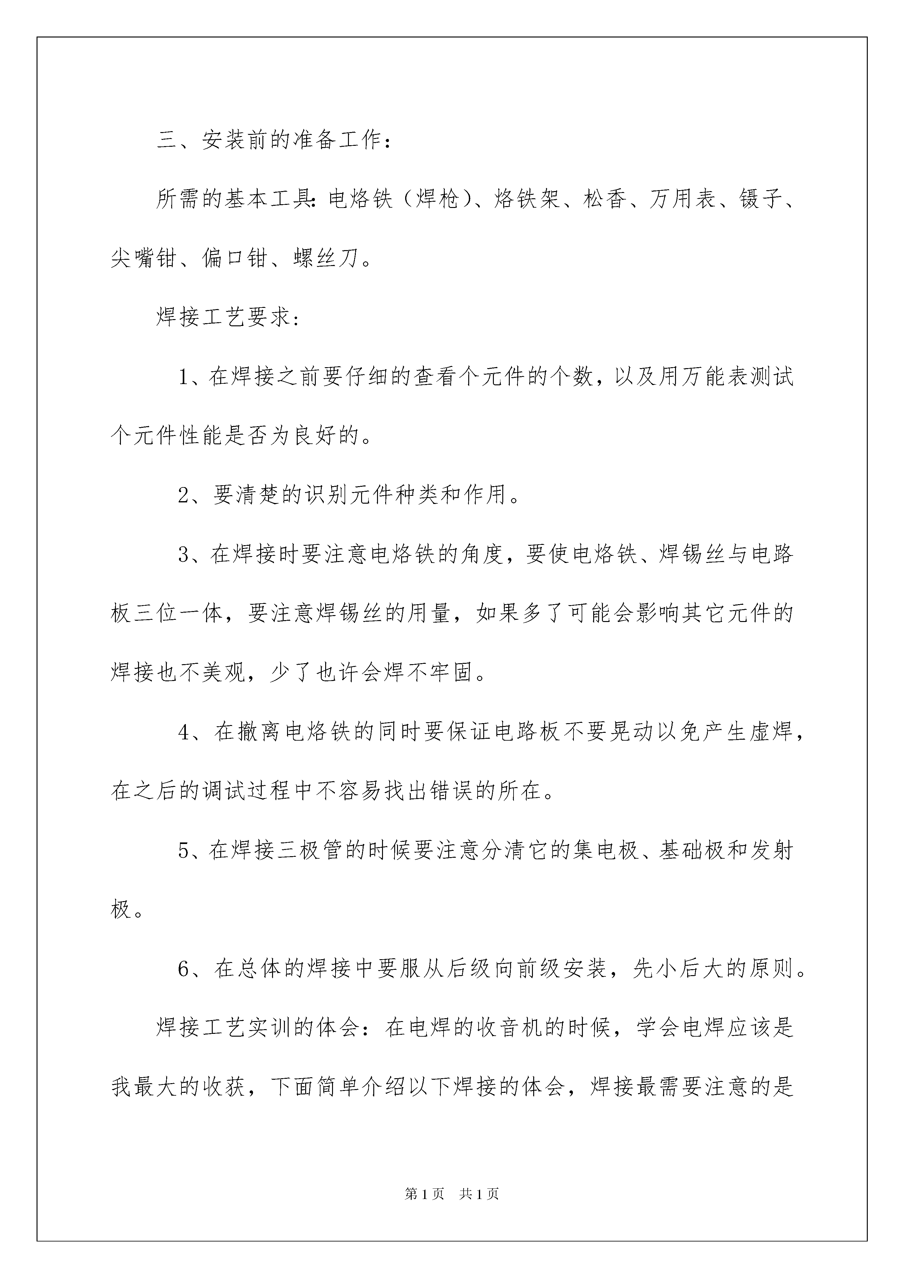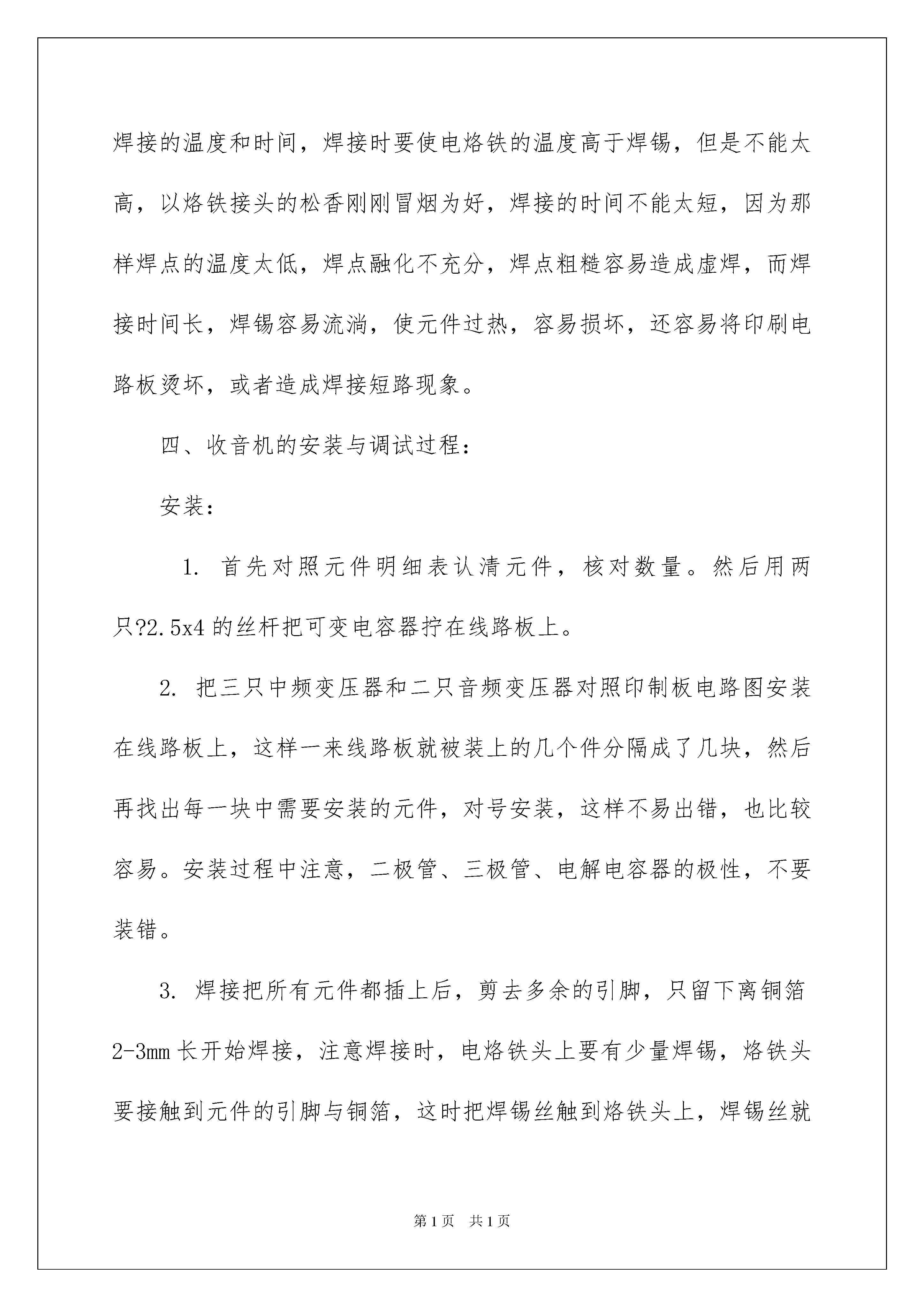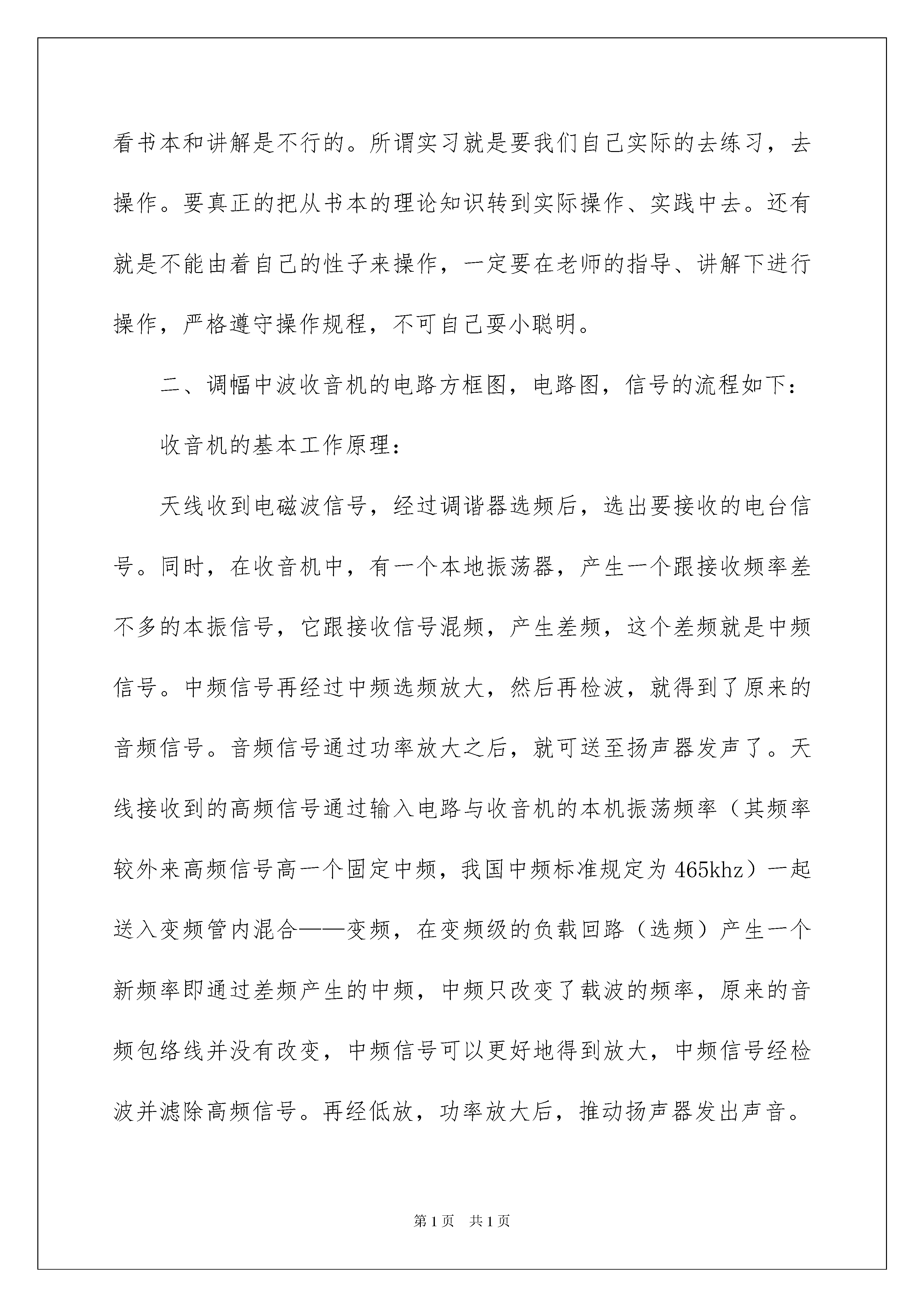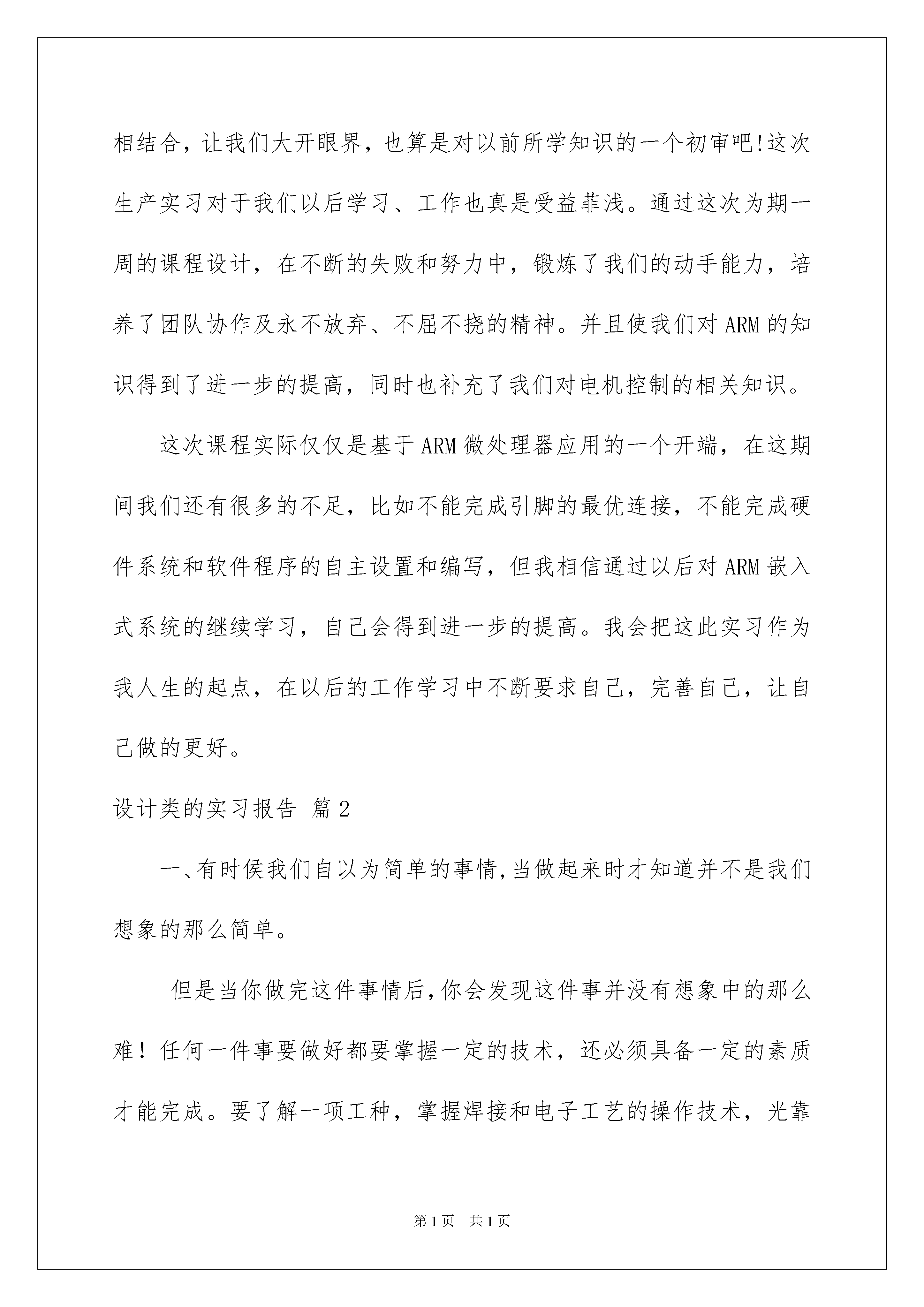 2022有关设计类的实习报告合集6篇有关设计类的实习报告合集6篇随着人们自身素质提升,报告与我们的生活紧密相连,报告具有成文事后性的特点。我敢肯定,大部分人都对写报告很是头疼的,以下是我为大家整理的设计类的实习报告7篇,希望能够帮助到大家。设计类的实习报告篇1通过这次模具设计,本人在多方面都有所提高。通过这次设计,综合运用本专业所学课程的理论和实际知识进行设计,提高学生独立工作能力,巩固与扩充了ARM等课程所学的内容,掌握ARM设计的方法和步骤,同时各科相关的课程都有了全面的复习,独立思考的能力也有了提高。在短短的一个星期中,让我们初步让理性回到感性的重新认识,也让我们初步的认识了这个社会,对于以后做人所应把握的方向也有所启发,体现出团队课程设计的能力以及综合运用知识的能力,体会了学以致用、突出自己劳动成果的喜悦心情,从中发现自己平时学习的不足和薄弱环节,从而加以弥补。本次实习使我亲身感受了所学知识与实际的应用,理论与实际的相结合,让我们大开眼界,也算是对以前所学知识的一个初审吧!这次生产实习对于我们以后学习、工作也真是受益菲浅。通过这次为期一周的课程设计,在不断的失败和努力中,锻炼了我们的动手能力,培养了团队协作及永不放弃、不屈不挠的精神。并且使我们对ARM的知识得到了进一步的提高,同时也补充了我们对电机控制的相关知识。这次课程实际仅仅是基于ARM微处理器应用的一个开端,在这期间我们还有很多的不足,比如不能完成引脚的最优连接,不能完成硬件系统和软件程序的自主设置和编写,但我相信通过以后对ARM嵌入式系统的继续学习,自己会得到进一步的提高。我会把这此实习作为我人生的起点,在以后的工作学习中不断要求自己,完善自己,让自己做的更好。设计类的实习报告篇2一、有时侯我们自以为简单的事情,当做起来时才知道并不是我们想象的那么简单。但是当你做完这件事情后,你会发现这件事并没有想象中的那么难!任何一件事要做好都要掌握一定的技术,还必须具备一定的素质才能完成。要了解一项工种,掌握焊接和电子工艺的操作技术,光靠看书本和讲解是不行的。所谓实习就是要我们自己实际的去练习,去操作。要真正的把从书本的理论知识转到实际操作、实践中去。还有就是不能由着自己的性子来操作,一定要在老师的指导、讲解下进行操作,严格遵守操作规程,不可自己耍小聪明。二、调幅中波收音机的电路方框图,电路图,信号的流程如下:收音机的基本工作原理:天线收到电磁波信号,经过调谐器选频后,选出要接收的电台信号。同时,在收音机中,有一个本地振荡器,产生一个跟接收频率差不多的本振信号,它跟接收信号混频,产生差频,这个差频就是中频信号。中频信号再经过中频选频放大,然后再检波,就得到了原来的音频信号。音频信号通过功率放大之后,就可送至扬声器发声了。天线接收到的高频信号通过输入电路与收音机的本机振荡频率(其频率较外来高频信号高一个固定中频,我国中频标准规定为465khz)一起送入变频管内混合——变频,在变频级的负载回路(选频)产生一个新频率即通过差频产生的中频,中频只改变了载波的频率,原来的音频包络线并没有改变,中频信号可以更好地得到放大,中频信号经检波并滤除高频信号。再经低放,功率放大后,推动扬声器发出声音。三、安装前的准备工作:所需的基本工具:电烙铁(焊枪)、烙铁架、松香、万用表、镊子、尖嘴钳、偏口钳、螺丝刀。焊接工艺要求:1、在焊接之前要仔细的查看个元件的个数,以及用万能表测试个元件性能是否为良好的。2、要清楚的识别元件种类和作用。3、在焊接时要注意电烙铁的角度,要使电烙铁、焊锡丝与电路板三位一体,要注意焊锡丝的用量,如果多了可能会影响其它元件的焊接也不美观,少了也许会焊不牢固。4、在撤离电烙铁的同时要保证电路板不要晃动以免产生虚焊,在之后的调试过程中不容易找出错误的所在。5、在焊接三极管的时候要注意分清它的集电极、基础极和发射极。6、在总体的焊接中要服从后级向前级安装,先小后大的原则。焊接工艺实训的体会:在电焊的收音机的时候,学会电焊应该是我最大的收获,下面简单介绍以下焊接的体会,焊接最需要注意的是焊接的温度和时间,焊接时要使电烙铁的温度高于焊锡,但是不能太高,以烙铁接头的松香刚刚冒烟为好,焊接的时间不能太短,因为那样焊点的温度太低,焊点融化不充分,焊点粗糙容易造成虚焊,而焊接时间长,焊锡容易流淌,使元件过热,容易损坏,还容易将印刷电路板烫坏,或者造成焊接短路现象。四、收音机的安装与调试过程:安装:1.首先对照元件明细表认清元件,核对数量。然后用两只?2.5x4的丝杆把可变电容器拧在线路板上。2.把三只中频变压器和二只音频变压器对照印制板