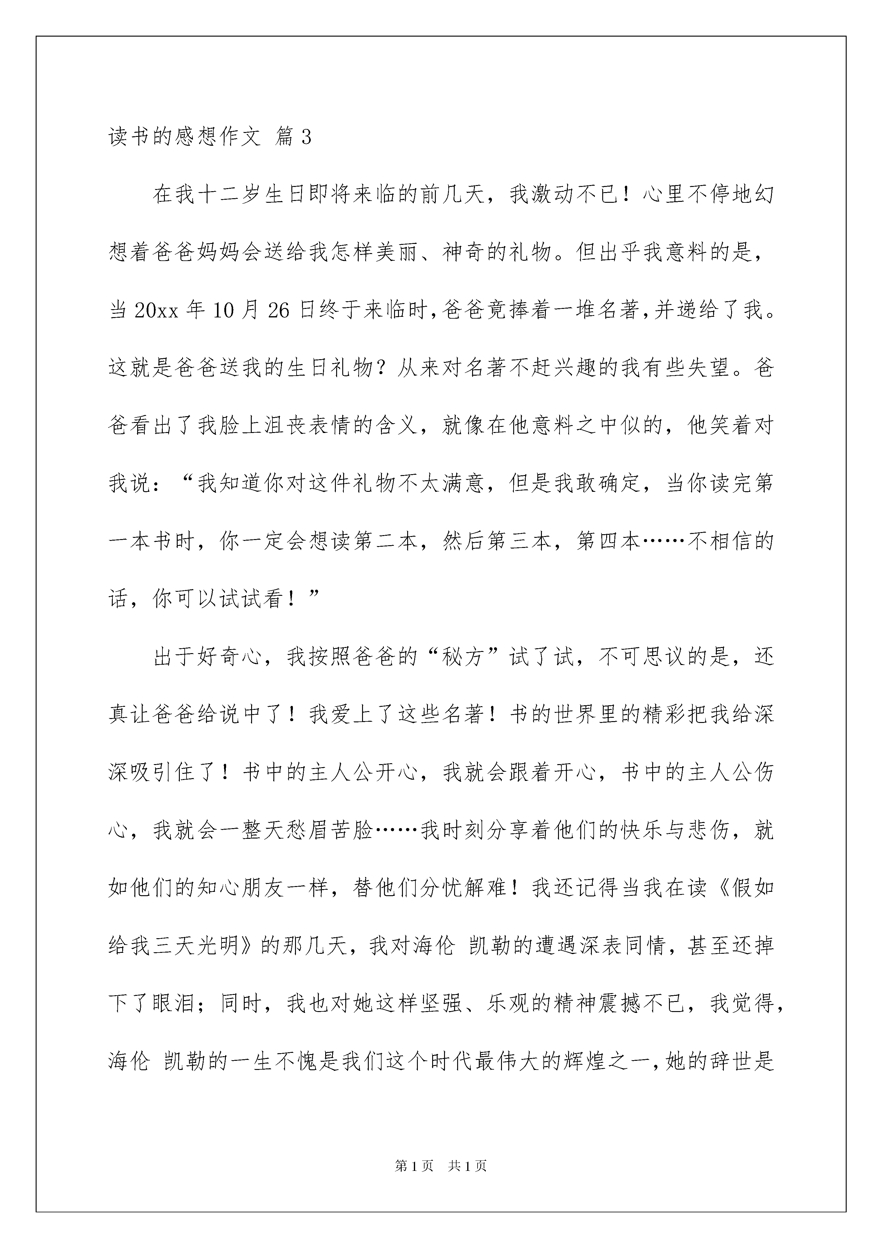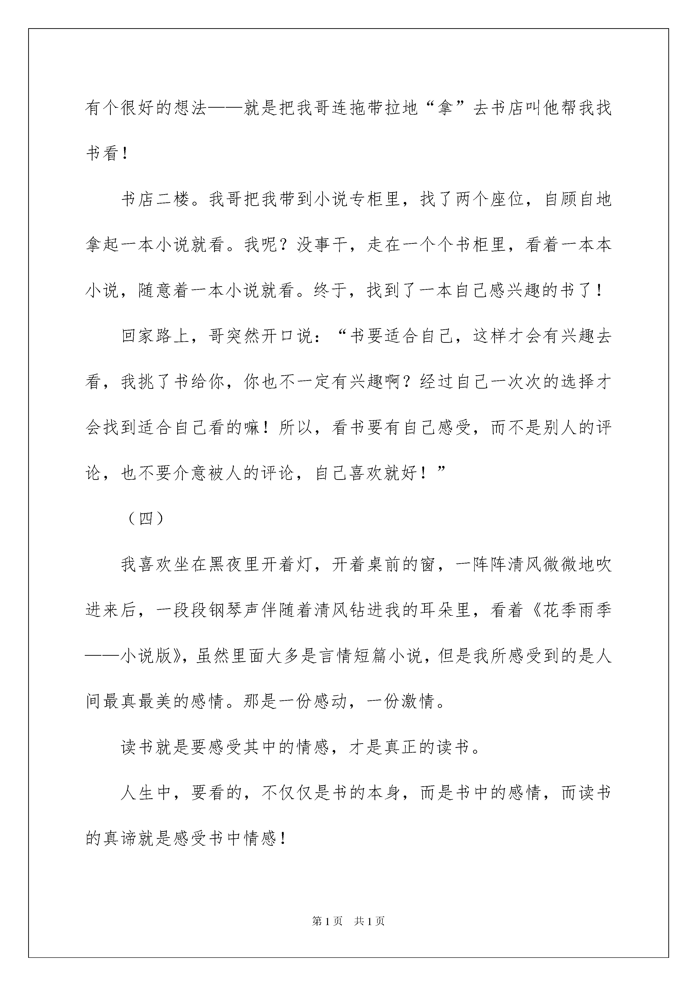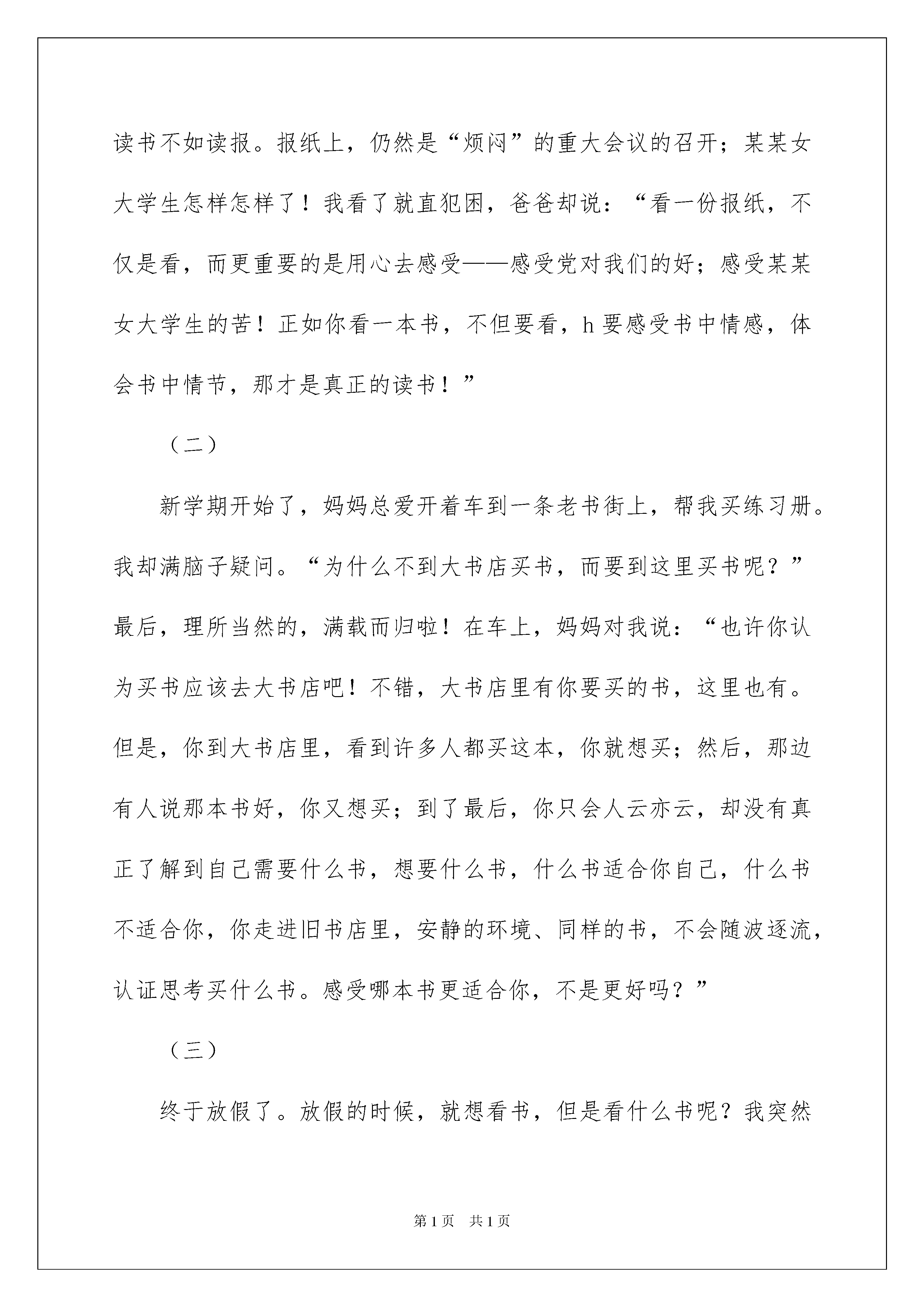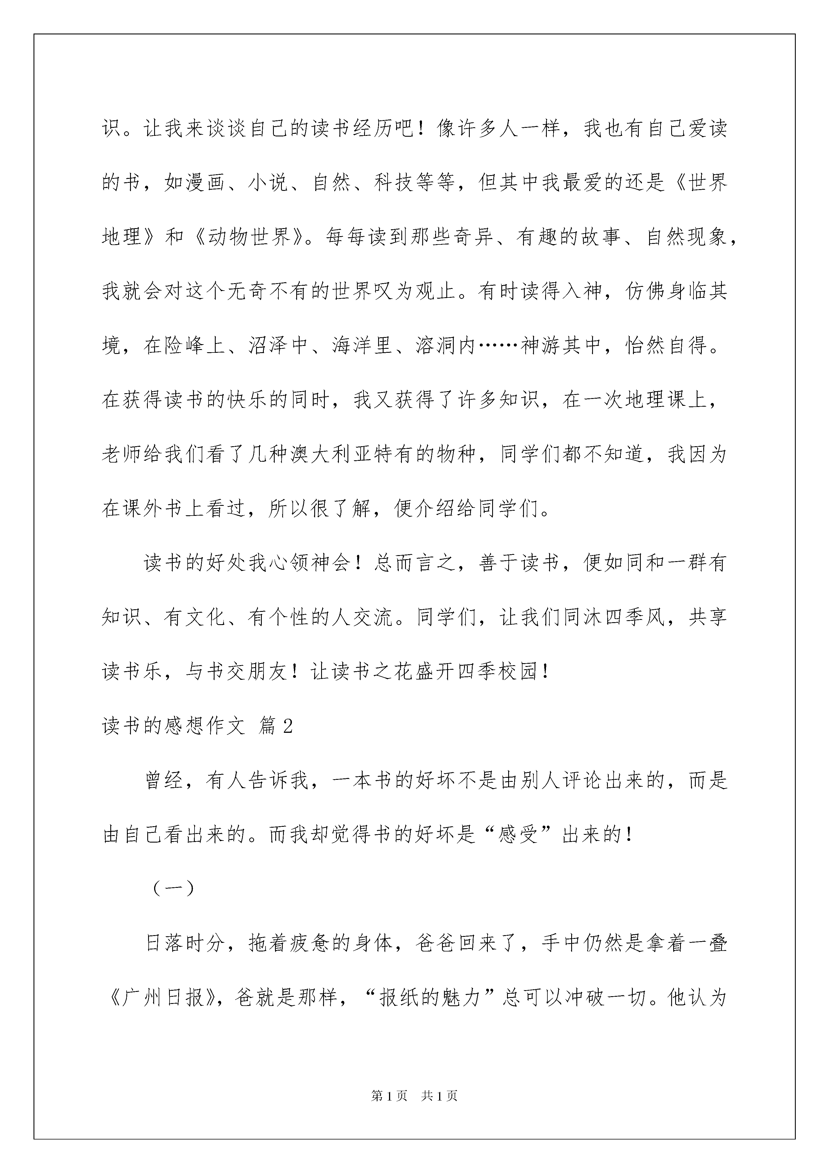 2022有关读书的感想作文合集6篇读书的感想作文在生活、工作和学习中,大家都尝试过写作文吧,借助作文人们可以实现文化交流的目的。为了让您在写作文时更加简单方便,以下是我收集整理的读书的感想作文6篇,希望对大家有所帮助。读书的感想作文篇1读书对我们益处多多,从古至今,无数的贤人都体会到读书的益处和乐趣,我们就来聊聊读书的好处吧!古代的那些文人墨客,都有一个相同的爱好---读书.书是人类进步的阶梯,读书是每个人都做过的事情,有许多人爱书如宝,手不释卷,因为一本好书可以影响一个人的一生。那么,读书有哪些好处呢?欧阳修曾说过“立身以立学为本,立学以读书为本”可见书在这位文豪心中是多么的重要,李苦禅也曾经说过“鸟欲高飞先振翅,人欲上进先读书”,这句诗深刻的告诉我们书是多么的重要,好似鸟儿的翅膀……你感受到了读书的好处了吗?读书不仅可以使我们开阔视野,增长知识,培养良好的自学能力和阅读能力,还可以进一步帮助学习课内知识。让我来谈谈自己的读书经历吧!像许多人一样,我也有自己爱读的书,如漫画、小说、自然、科技等等,但其中我最爱的还是《世界地理》和《动物世界》。每每读到那些奇异、有趣的故事、自然现象,我就会对这个无奇不有的世界叹为观止。有时读得入神,仿佛身临其境,在险峰上、沼泽中、海洋里、溶洞内……神游其中,怡然自得。在获得读书的快乐的同时,我又获得了许多知识,在一次地理课上,老师给我们看了几种澳大利亚特有的物种,同学们都不知道,我因为在课外书上看过,所以很了解,便介绍给同学们。读书的好处我心领神会!总而言之,善于读书,便如同和一群有知识、有文化、有个性的人交流。同学们,让我们同沐四季风,共享读书乐,与书交朋友!让读书之花盛开四季校园!读书的感想作文篇2曾经,有人告诉我,一本书的好坏不是由别人评论出来的,而是由自己看出来的。而我却觉得书的好坏是“感受”出来的!(一)日落时分,拖着疲惫的身体,爸爸回来了,手中仍然是拿着一叠《广州日报》,爸就是那样,“报纸的魅力”总可以冲破一切。他认为读书不如读报。报纸上,仍然是“烦闷”的重大会议的召开;某某女大学生怎样怎样了!我看了就直犯困,爸爸却说:“看一份报纸,不仅是看,而更重要的是用心去感受——感受党对我们的好;感受某某女大学生的苦!正如你看一本书,不但要看,h要感受书中情感,体会书中情节,那才是真正的读书!”(二)新学期开始了,妈妈总爱开着车到一条老书街上,帮我买练习册。我却满脑子疑问。“为什么不到大书店买书,而要到这里买书呢?”最后,理所当然的,满载而归啦!在车上,妈妈对我说:“也许你认为买书应该去大书店吧!不错,大书店里有你要买的书,这里也有。但是,你到大书店里,看到许多人都买这本,你就想买;然后,那边有人说那本书好,你又想买;到了最后,你只会人云亦云,却没有真正了解到自己需要什么书,想要什么书,什么书适合你自己,什么书不适合你,你走进旧书店里,安静的环境、同样的书,不会随波逐流,认证思考买什么书。感受哪本书更适合你,不是更好吗?”(三)终于放假了。放假的时候,就想看书,但是看什么书呢?我突然有个很好的想法——就是把我哥连拖带拉地“拿”去书店叫他帮我找书看!书店二楼。我哥把我带到小说专柜里,找了两个座位,自顾自地拿起一本小说就看。我呢?没事干,走在一个个书柜里,看着一本本小说,随意着一本小说就看。终于,找到了一本自己感兴趣的书了!回家路上,哥突然开口说:“书要适合自己,这样才会有兴趣去看,我挑了书给你,你也不一定有兴趣啊?经过自己一次次的选择才会找到适合自己看的嘛!所以,看书要有自己感受,而不是别人的评论,也不要介意被人的评论,自己喜欢就好!”(四)我喜欢坐在黑夜里开着灯,开着桌前的窗,一阵阵清风微微地吹进来后,一段段钢琴声伴随着清风钻进我的耳朵里,看着《花季雨季——小说版》,虽然里面大多是言情短篇小说,但是我所感受到的是人间最真最美的感情。那是一份感动,一份激情。读书就是要感受其中的情感,才是真正的读书。人生中,要看的,不仅仅是书的本身,而是书中的感情,而读书的真谛就是感受书中情感!读书的感想作文篇3在我十二岁生日即将来临的前几天,我激动不已!心里不停地幻想着爸爸妈妈会送给我怎样美丽、神奇的礼物。但出乎我意料的是,当20xx年10月26日终于来临时,爸爸竟捧着一堆名著,并递给了我。这就是爸爸送我的生日礼物?从来对名著不赶兴趣的我有些失望。爸爸看出了我脸上沮丧表情的含义,就像在他意料之中似的,他笑着对我说:“我知道你对这件礼物不太满意,但是我敢确定,当你读完第一本书时,你一定会想读第二本,然后第三本,第四本……不相信的话,你可以试试看!”出于好奇
