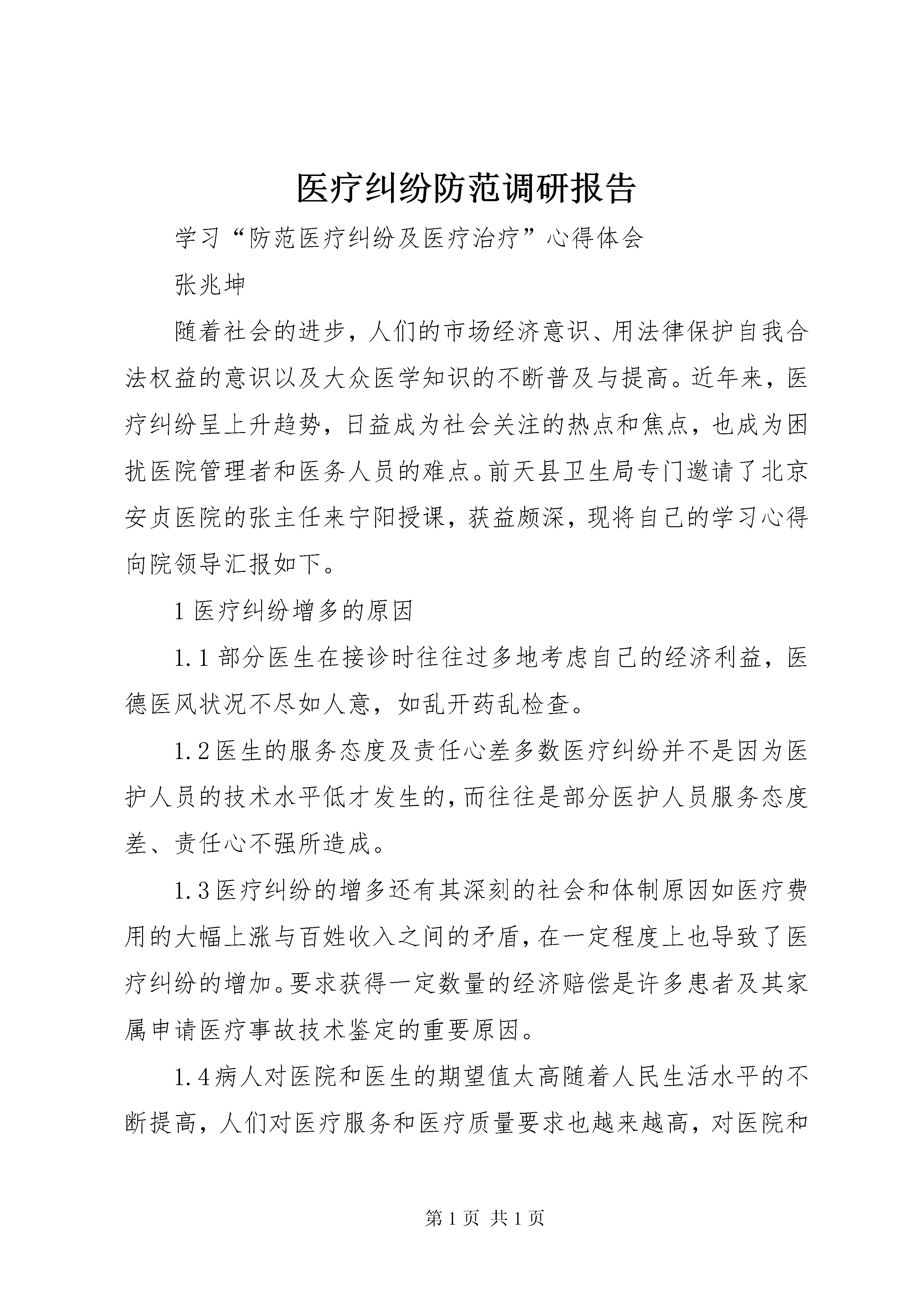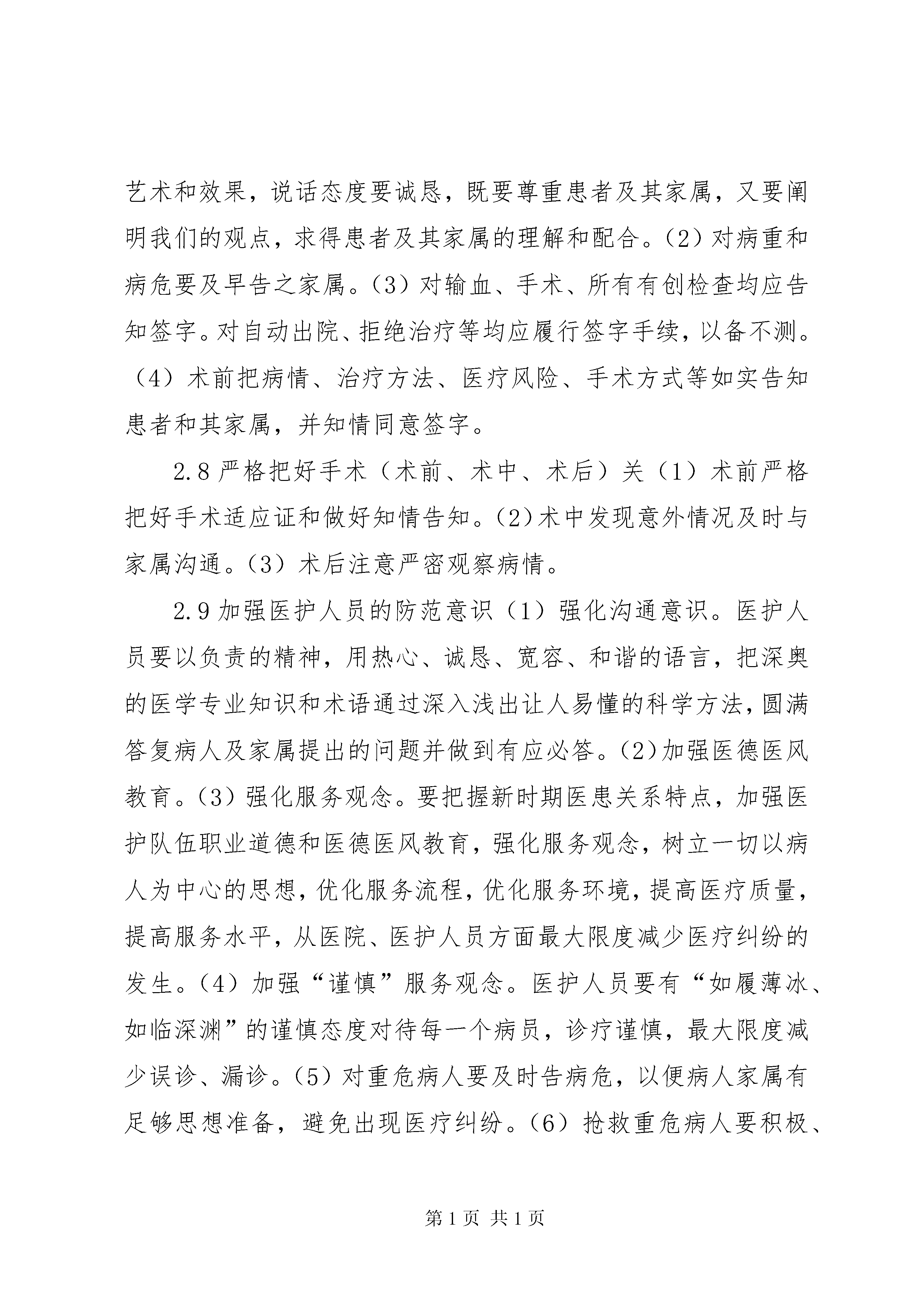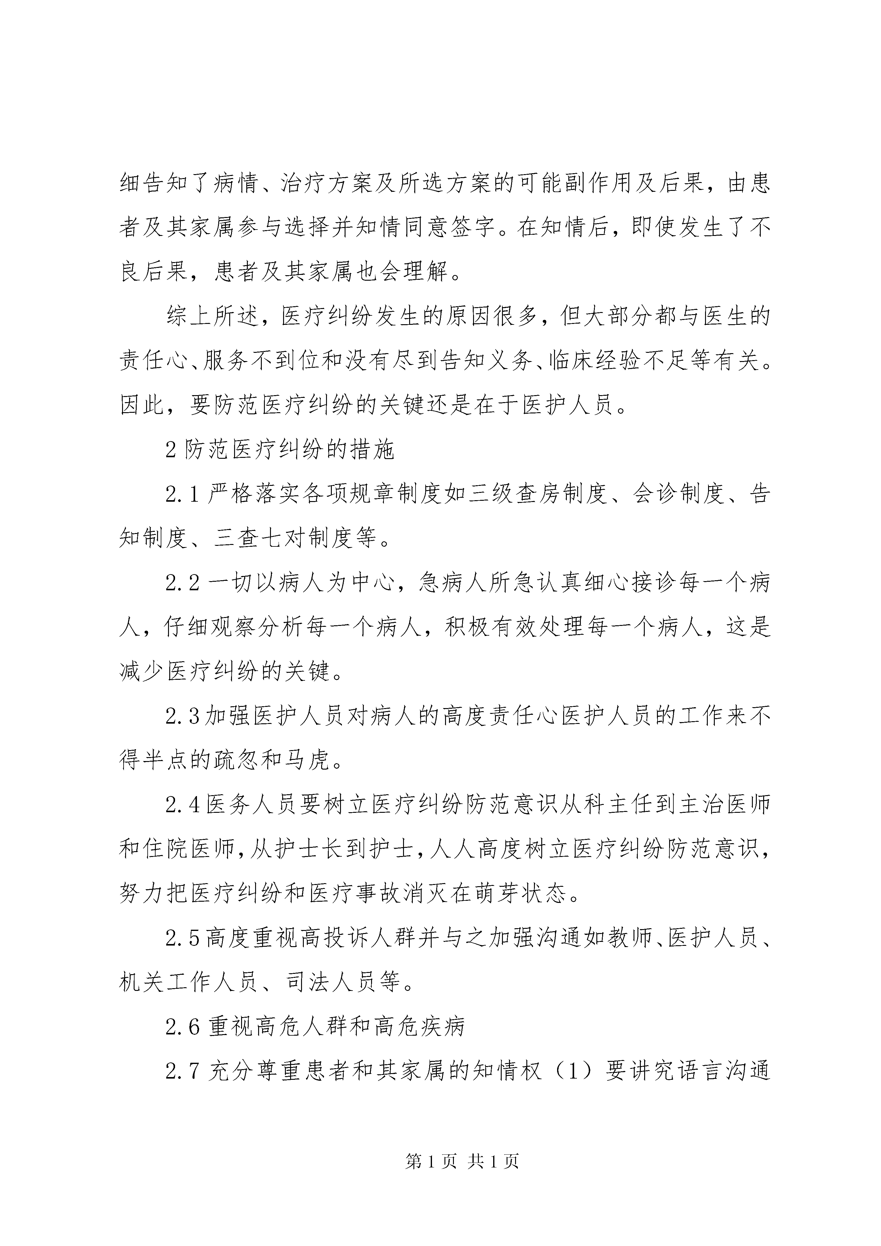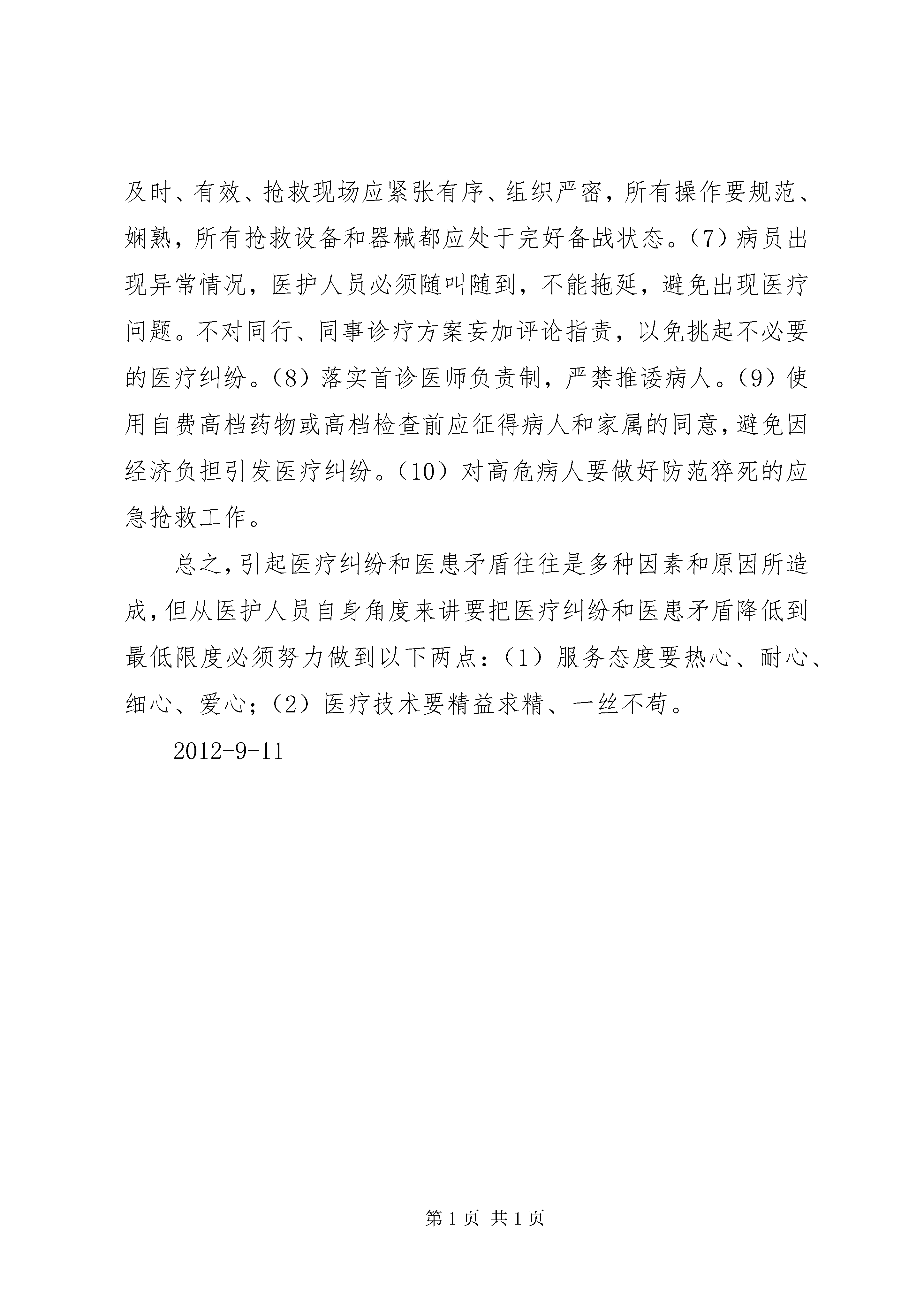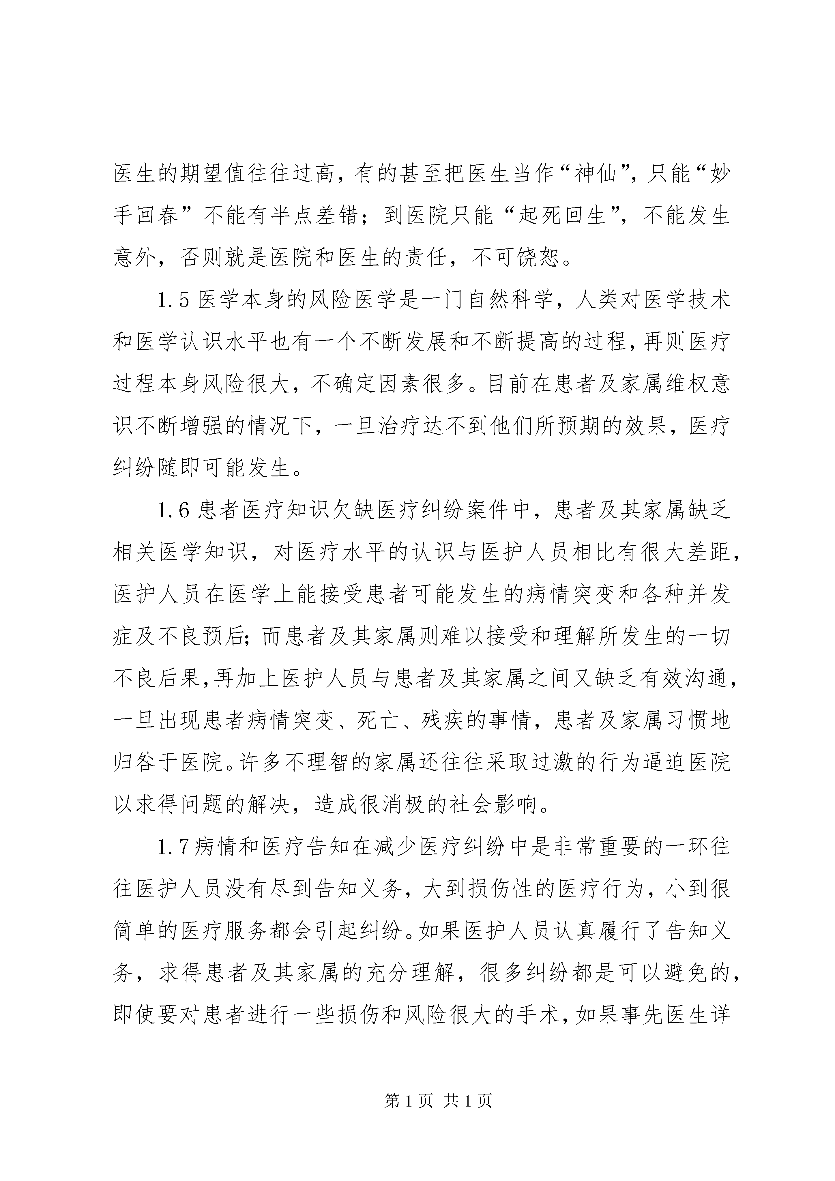 医疗纠纷防范调研报告学习“防范医疗纠纷及医疗治疗”心得体会张兆坤随着社会的进步,人们的市场经济意识、用法律保护自我合法权益的意识以及大众医学知识的不断普及与提高。近年来,医疗纠纷呈上升趋势,日益成为社会关注的热点和焦点,也成为困扰医院管理者和医务人员的难点。前天县卫生局专门邀请了北京安贞医院的张主任来宁阳授课,获益颇深,现将自己的学习心得向院领导汇报如下。1医疗纠纷增多的原因1.1部分医生在接诊时往往过多地考虑自己的经济利益,医德医风状况不尽如人意,如乱开药乱检查。1.2医生的服务态度及责任心差多数医疗纠纷并不是因为医护人员的技术水平低才发生的,而往往是部分医护人员服务态度差、责任心不强所造成。1.3医疗纠纷的增多还有其深刻的社会和体制原因如医疗费用的大幅上涨与百姓收入之间的矛盾,在一定程度上也导致了医疗纠纷的增加。要求获得一定数量的经济赔偿是许多患者及其家属申请医疗事故技术鉴定的重要原因。1.4病人对医院和医生的期望值太高随着人民生活水平的不断提高,人们对医疗服务和医疗质量要求也越来越高,对医院和医生的期望值往往过高,有的甚至把医生当作“神仙”,只能“妙手回春”不能有半点差错;到医院只能“起死回生”,不能发生意外,否则就是医院和医生的责任,不可饶恕。1.5医学本身的风险医学是一门自然科学,人类对医学技术和医学认识水平也有一个不断发展和不断提高的过程,再则医疗过程本身风险很大,不确定因素很多。目前在患者及家属维权意识不断增强的情况下,一旦治疗达不到他们所预期的效果,医疗纠纷随即可能发生。1.6患者医疗知识欠缺医疗纠纷案件中,患者及其家属缺乏相关医学知识,对医疗水平的认识与医护人员相比有很大差距,医护人员在医学上能接受患者可能发生的病情突变和各种并发症及不良预后;而患者及其家属则难以接受和理解所发生的一切不良后果,再加上医护人员与患者及其家属之间又缺乏有效沟通,一旦出现患者病情突变、死亡、残疾的事情,患者及家属习惯地归咎于医院。许多不理智的家属还往往采取过激的行为逼迫医院以求得问题的解决,造成很消极的社会影响。1.7病情和医疗告知在减少医疗纠纷中是非常重要的一环往往医护人员没有尽到告知义务,大到损伤性的医疗行为,小到很简单的医疗服务都会引起纠纷。如果医护人员认真履行了告知义务,求得患者及其家属的充分理解,很多纠纷都是可以避免的,即使要对患者进行一些损伤和风险很大的手术,如果事先医生详细告知了病情、治疗方案及所选方案的可能副作用及后果,由患者及其家属参与选择并知情同意签字。在知情后,即使发生了不良后果,患者及其家属也会理解。综上所述,医疗纠纷发生的原因很多,但大部分都与医生的责任心、服务不到位和没有尽到告知义务、临床经验不足等有关。因此,要防范医疗纠纷的关键还是在于医护人员。2防范医疗纠纷的措施2.1严格落实各项规章制度如三级查房制度、会诊制度、告知制度、三查七对制度等。2.2一切以病人为中心,急病人所急认真细心接诊每一个病人,仔细观察分析每一个病人,积极有效处理每一个病人,这是减少医疗纠纷的关键。2.3加强医护人员对病人的高度责任心医护人员的工作来不得半点的疏忽和马虎。2.4医务人员要树立医疗纠纷防范意识从科主任到主治医师和住院医师,从护士长到护士,人人高度树立医疗纠纷防范意识,努力把医疗纠纷和医疗事故消灭在萌芽状态。2.5高度重视高投诉人群并与之加强沟通如教师、医护人员、机关工作人员、司法人员等。2.6重视高危人群和高危疾病2.7充分尊重患者和其家属的知情权(1)要讲究语言沟通艺术和效果,说话态度要诚恳,既要尊重患者及其家属,又要阐明我们的观点,求得患者及其家属的理解和配合。(2)对病重和病危要及早告之家属。(3)对输血、手术、所有有创检查均应告知签字。对自动出院、拒绝治疗等均应履行签字手续,以备不测。(4)术前把病情、治疗方法、医疗风险、手术方式等如实告知患者和其家属,并知情同意签字。2.8严格把好手术(术前、术中、术后)关(1)术前严格把好手术适应证和做好知情告知。(2)术中发现意外情况及时与家属沟通。(3)术后注意严密观察病情。2.9加强医护人员的防范意识(1)强化沟通意识。医护人员要以负责的精神,用热心、诚恳、宽容、和谐的语言,把深奥的医学专业知识和术语通过深入浅出让人易懂的科学方法,圆满答复病人及家属提出的问题并做到有应必答。(2)加强医德医风教育。(3)强化服务观念。要把握新时期医患关系特点,加强医护队伍职业道德和医德医风教育,强化服务观念,树立一切以病人为中心的思想,优化服务流程,优化服务环境,提高医疗质量,提高服务水平,从医院、医护人员方面最大限度减少医疗纠纷的发生。(4)加强“谨慎”服务观念。医护人员要有“如履薄冰、如临深渊”的谨慎态度对待每一个病员,诊疗谨慎,最大限度减少误诊、漏诊