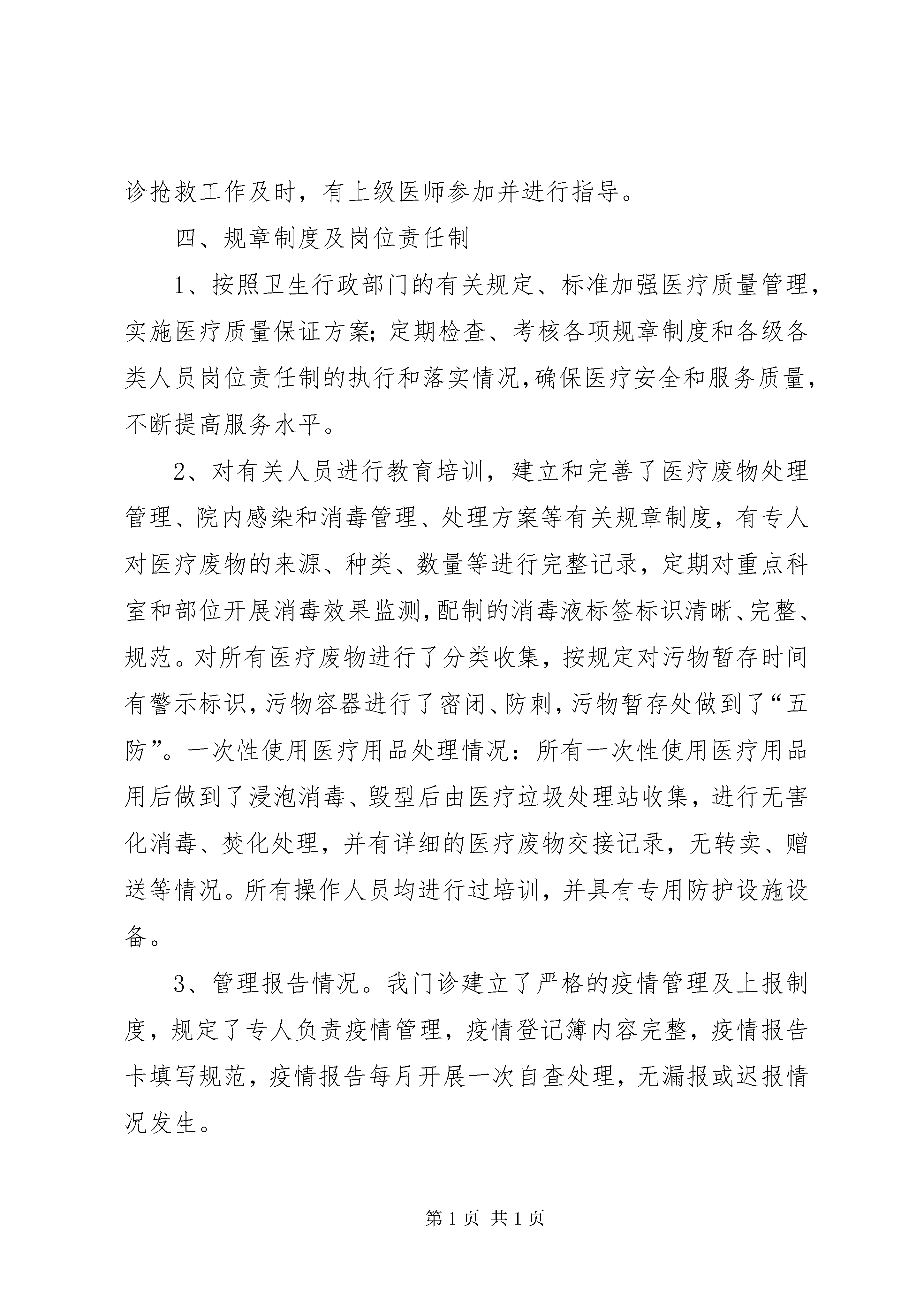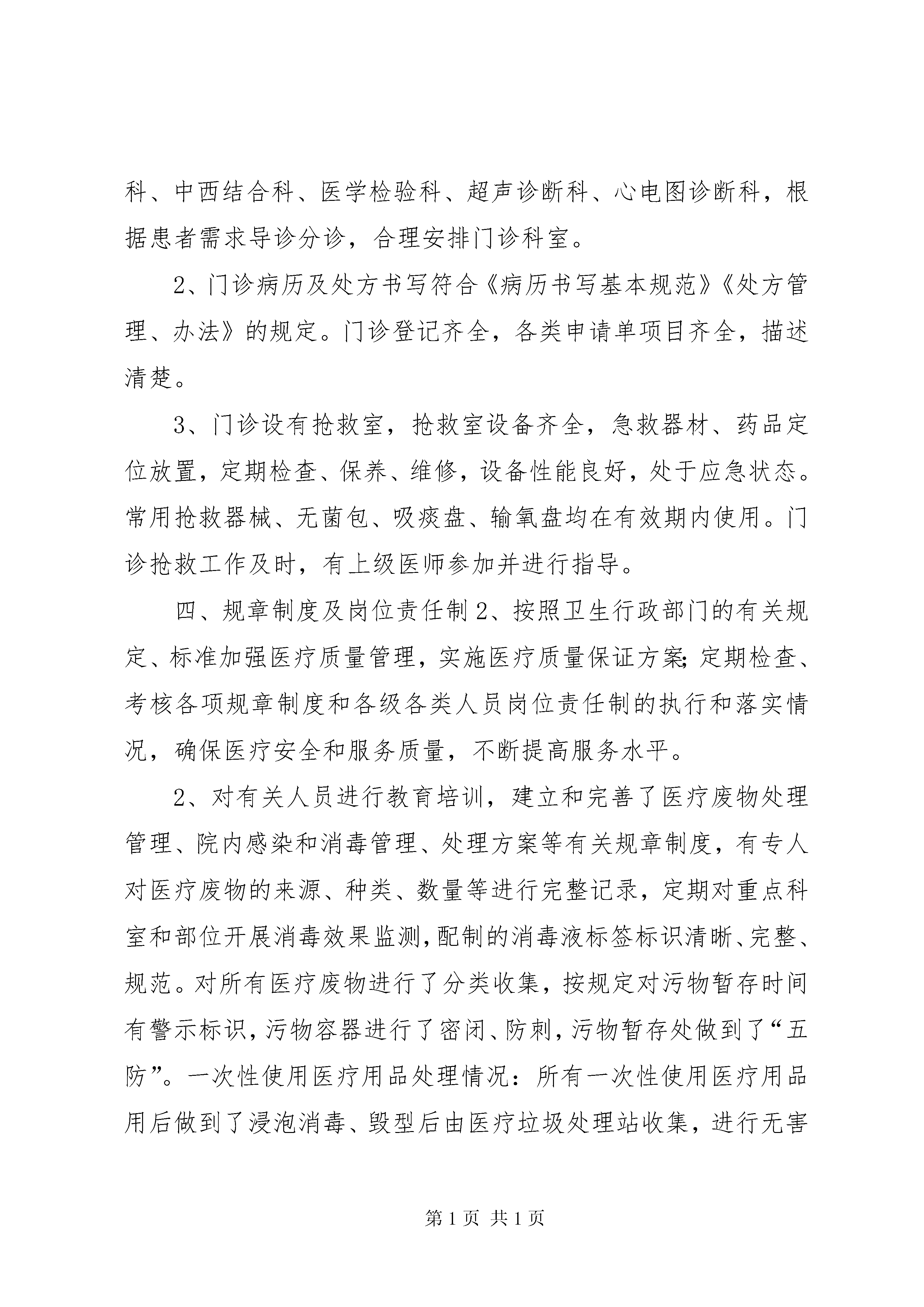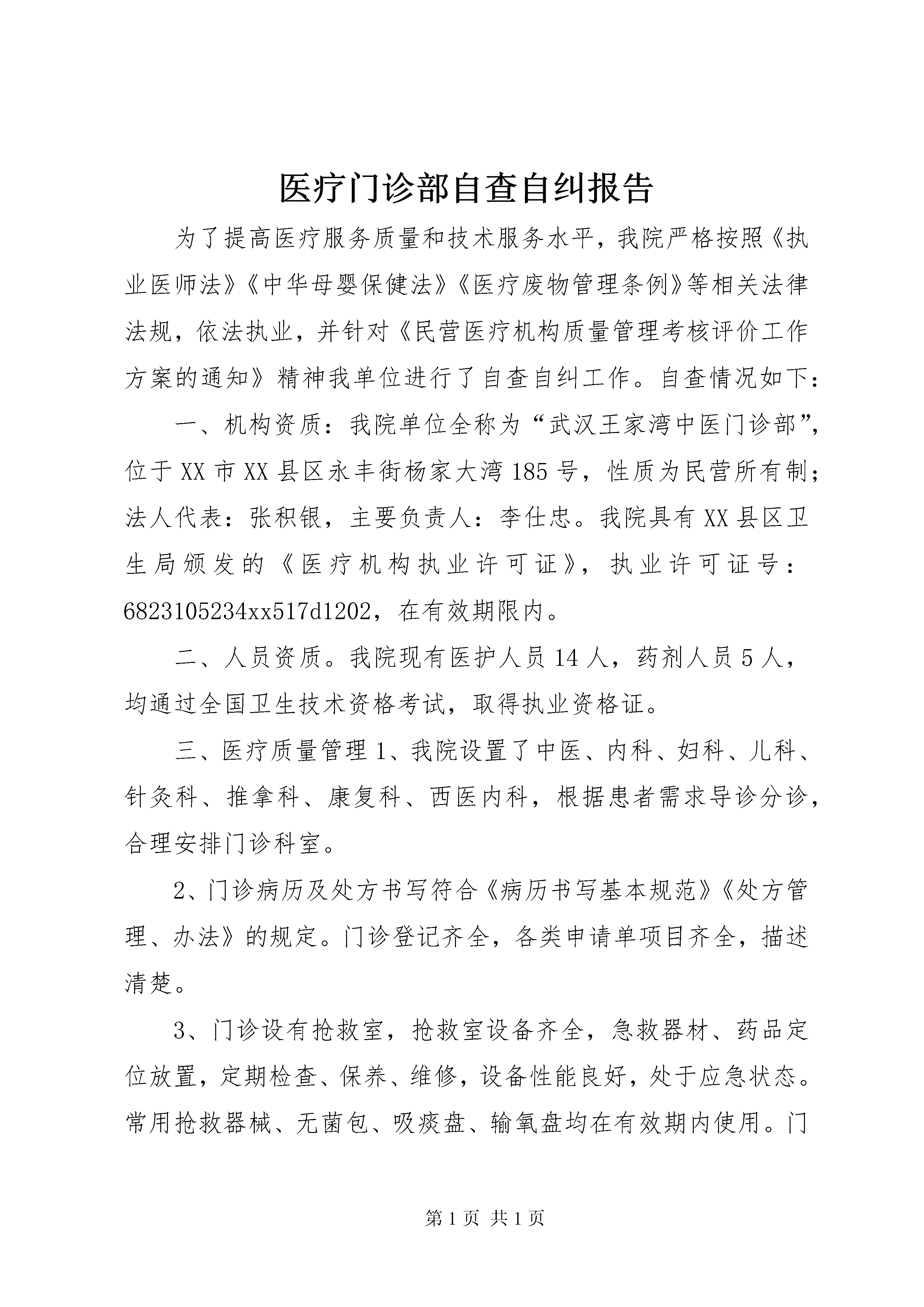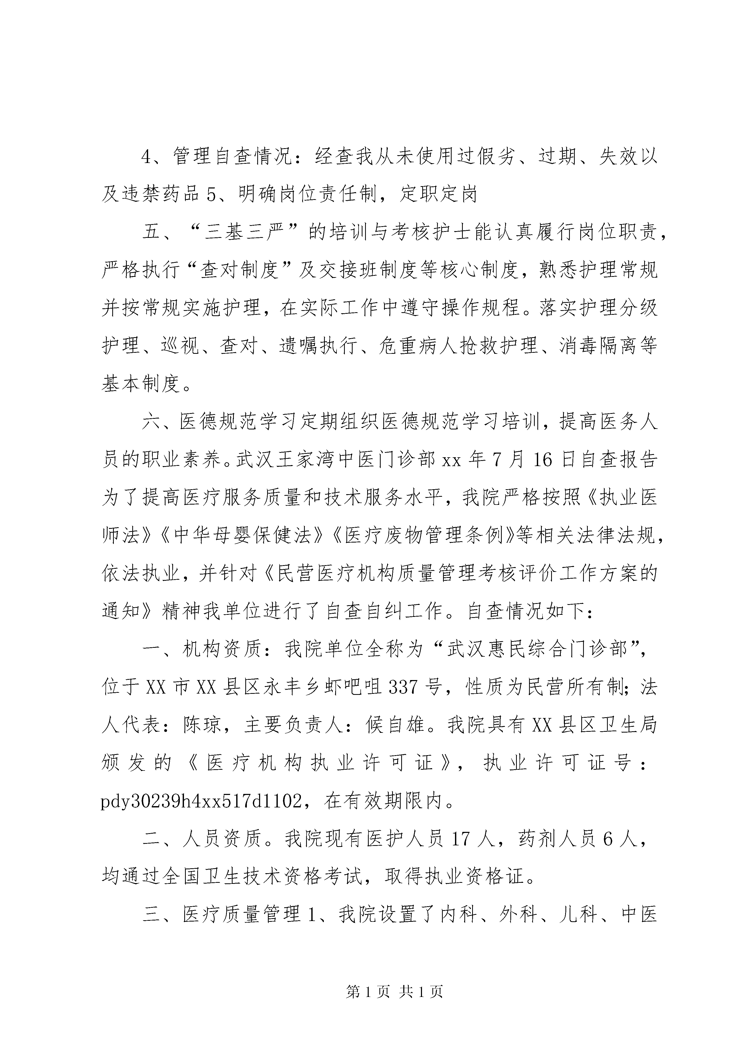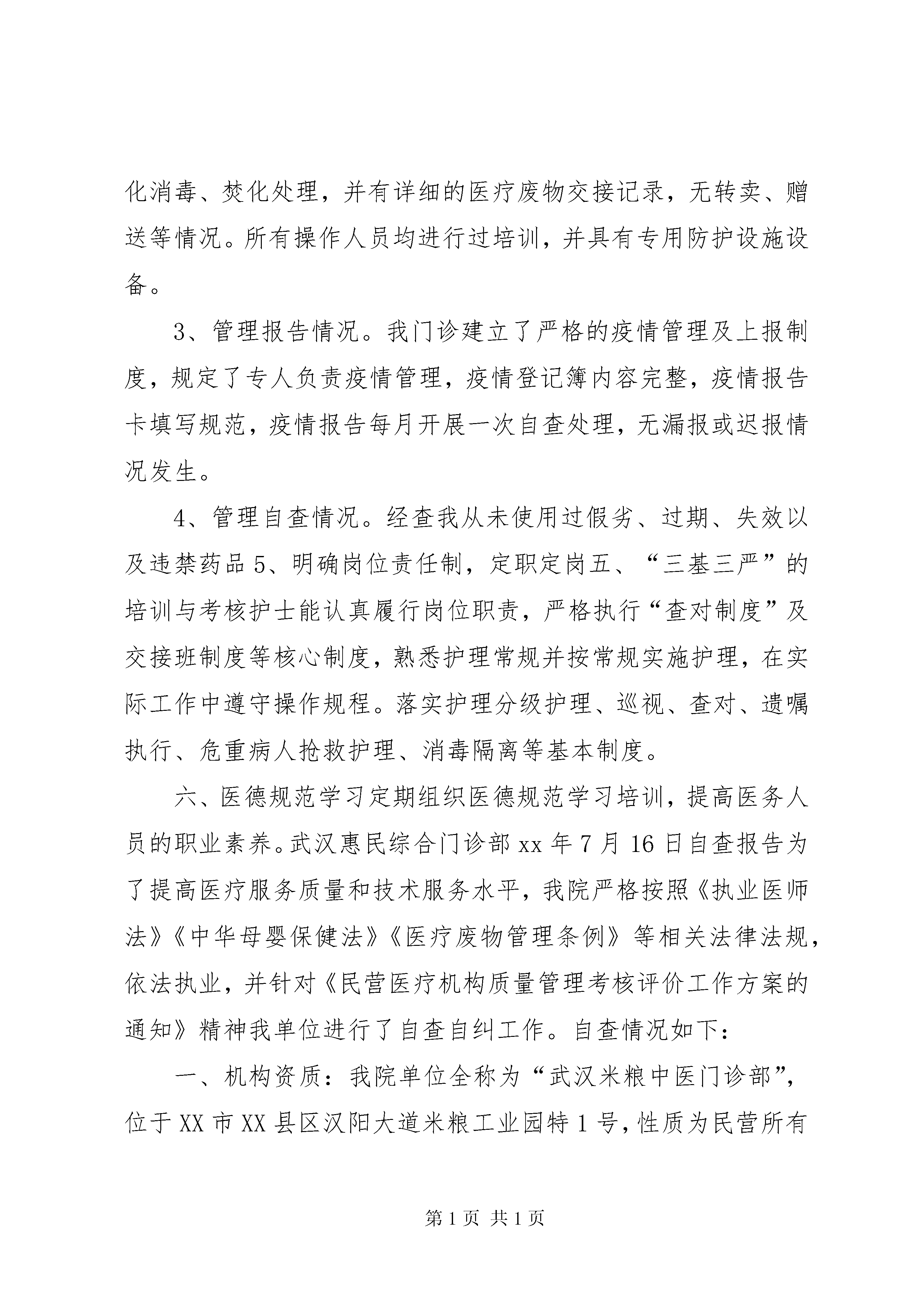 医疗门诊部自查自纠报告为了提高医疗服务质量和技术服务水平,我院严格按照《执业医师法》《中华母婴保健法》《医疗废物管理条例》等相关法律法规,依法执业,并针对《民营医疗机构质量管理考核评价工作方案的通知》精神我单位进行了自查自纠工作。自查情况如下:一、机构资质:我院单位全称为“武汉王家湾中医门诊部”,位于XX市XX县区永丰街杨家大湾185号,性质为民营所有制;法人代表:张积银,主要负责人:李仕忠。我院具有XX县区卫生局颁发的《医疗机构执业许可证》,执业许可证号:6823105234xx517d1202,在有效期限内。二、人员资质。我院现有医护人员14人,药剂人员5人,均通过全国卫生技术资格考试,取得执业资格证。三、医疗质量管理1、我院设置了中医、内科、妇科、儿科、针灸科、推拿科、康复科、西医内科,根据患者需求导诊分诊,合理安排门诊科室。2、门诊病历及处方书写符合《病历书写基本规范》《处方管理、办法》的规定。门诊登记齐全,各类申请单项目齐全,描述清楚。3、门诊设有抢救室,抢救室设备齐全,急救器材、药品定位放置,定期检查、保养、维修,设备性能良好,处于应急状态。常用抢救器械、无菌包、吸痰盘、输氧盘均在有效期内使用。门诊抢救工作及时,有上级医师参加并进行指导。四、规章制度及岗位责任制1、按照卫生行政部门的有关规定、标准加强医疗质量管理,实施医疗质量保证方案;定期检查、考核各项规章制度和各级各类人员岗位责任制的执行和落实情况,确保医疗安全和服务质量,不断提高服务水平。2、对有关人员进行教育培训,建立和完善了医疗废物处理管理、院内感染和消毒管理、处理方案等有关规章制度,有专人对医疗废物的来源、种类、数量等进行完整记录,定期对重点科室和部位开展消毒效果监测,配制的消毒液标签标识清晰、完整、规范。对所有医疗废物进行了分类收集,按规定对污物暂存时间有警示标识,污物容器进行了密闭、防刺,污物暂存处做到了“五防”。一次性使用医疗用品处理情况:所有一次性使用医疗用品用后做到了浸泡消毒、毁型后由医疗垃圾处理站收集,进行无害化消毒、焚化处理,并有详细的医疗废物交接记录,无转卖、赠送等情况。所有操作人员均进行过培训,并具有专用防护设施设备。3、管理报告情况。我门诊建立了严格的疫情管理及上报制度,规定了专人负责疫情管理,疫情登记簿内容完整,疫情报告卡填写规范,疫情报告每月开展一次自查处理,无漏报或迟报情况发生。4、管理自查情况:经查我从未使用过假劣、过期、失效以及违禁药品5、明确岗位责任制,定职定岗五、“三基三严”的培训与考核护士能认真履行岗位职责,严格执行“查对制度”及交接班制度等核心制度,熟悉护理常规并按常规实施护理,在实际工作中遵守操作规程。落实护理分级护理、巡视、查对、遗嘱执行、危重病人抢救护理、消毒隔离等基本制度。六、医德规范学习定期组织医德规范学习培训,提高医务人员的职业素养。武汉王家湾中医门诊部xx年7月16日自查报告为了提高医疗服务质量和技术服务水平,我院严格按照《执业医师法》《中华母婴保健法》《医疗废物管理条例》等相关法律法规,依法执业,并针对《民营医疗机构质量管理考核评价工作方案的通知》精神我单位进行了自查自纠工作。自查情况如下:一、机构资质:我院单位全称为“武汉惠民综合门诊部”,位于XX市XX县区永丰乡虾吧咀337号,性质为民营所有制;法人代表:陈琼,主要负责人:候自雄。我院具有XX县区卫生局颁发的《医疗机构执业许可证》,执业许可证号:pdy30239h4xx517d1102,在有效期限内。二、人员资质。我院现有医护人员17人,药剂人员6人,均通过全国卫生技术资格考试,取得执业资格证。三、医疗质量管理1、我院设置了内科、外科、儿科、中医科、中西结合科、医学检验科、超声诊断科、心电图诊断科,根据患者需求导诊分诊,合理安排门诊科室。2、门诊病历及处方书写符合《病历书写基本规范》《处方管理、办法》的规定。门诊登记齐全,各类申请单项目齐全,描述清楚。3、门诊设有抢救室,抢救室设备齐全,急救器材、药品定位放置,定期检查、保养、维修,设备性能良好,处于应急状态。常用抢救器械、无菌包、吸痰盘、输氧盘均在有效期内使用。门诊抢救工作及时,有上级医师参加并进行指导。四、规章制度及岗位责任制2、按照卫生行政部门的有关规定、标准加强医疗质量管理,实施医疗质量保证方案;定期检查、考核各项规章制度和各级各类人员岗位责任制的执行和落实情况,确保医疗安全和服务质量,不断提高服务水平。2、对有关人员进行教育培训,建立和完善了医疗废物处理管理、院内感染和消毒管理、处理方案等有关规章制度,有专人对医疗废物的来源、种类、数量等进行完整记录,定期对重点科室和部位开展消毒效果监测,配制的消毒液标签标识清晰、完整、规范。对所有医疗废物进行了分类收集,按规定对