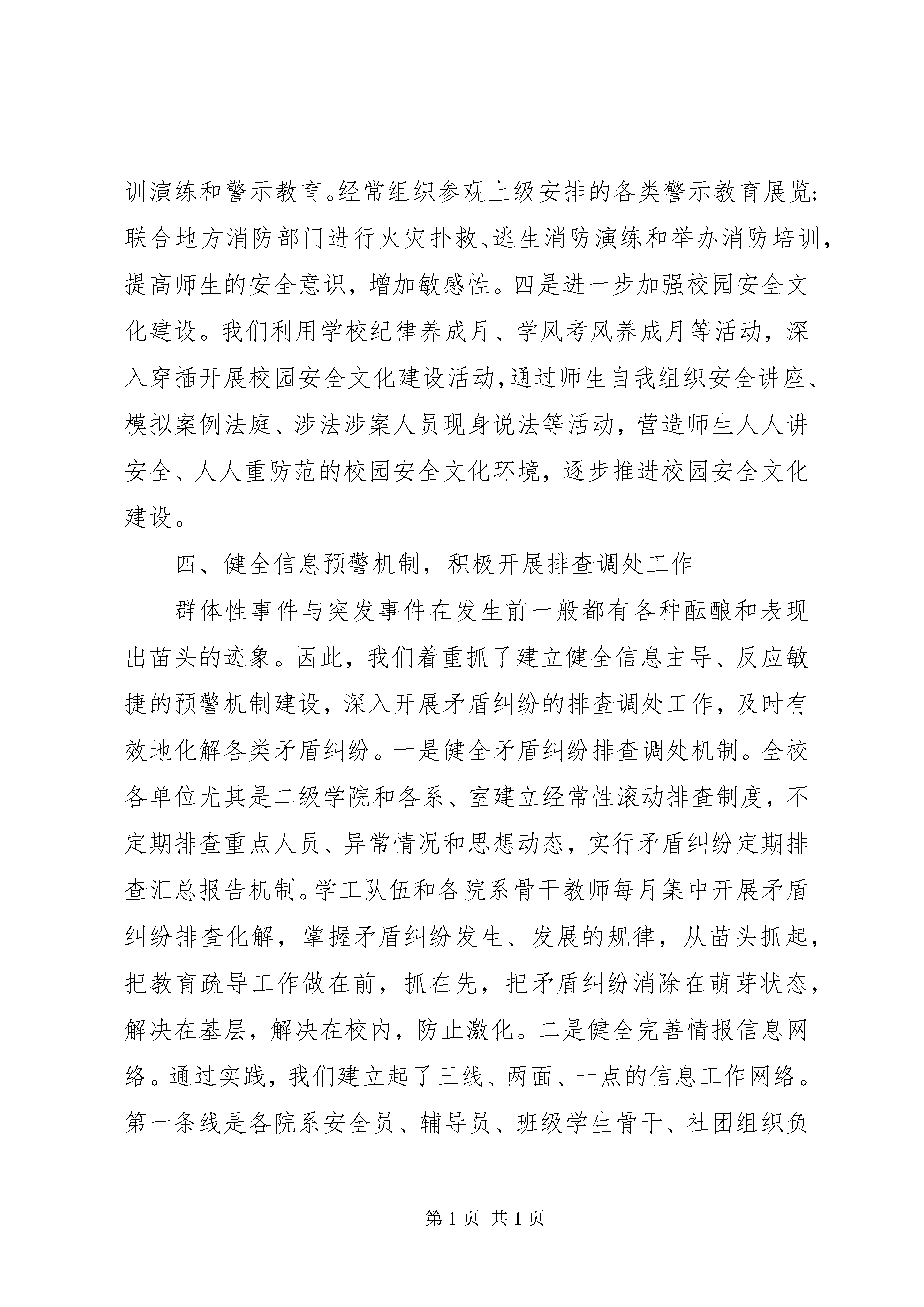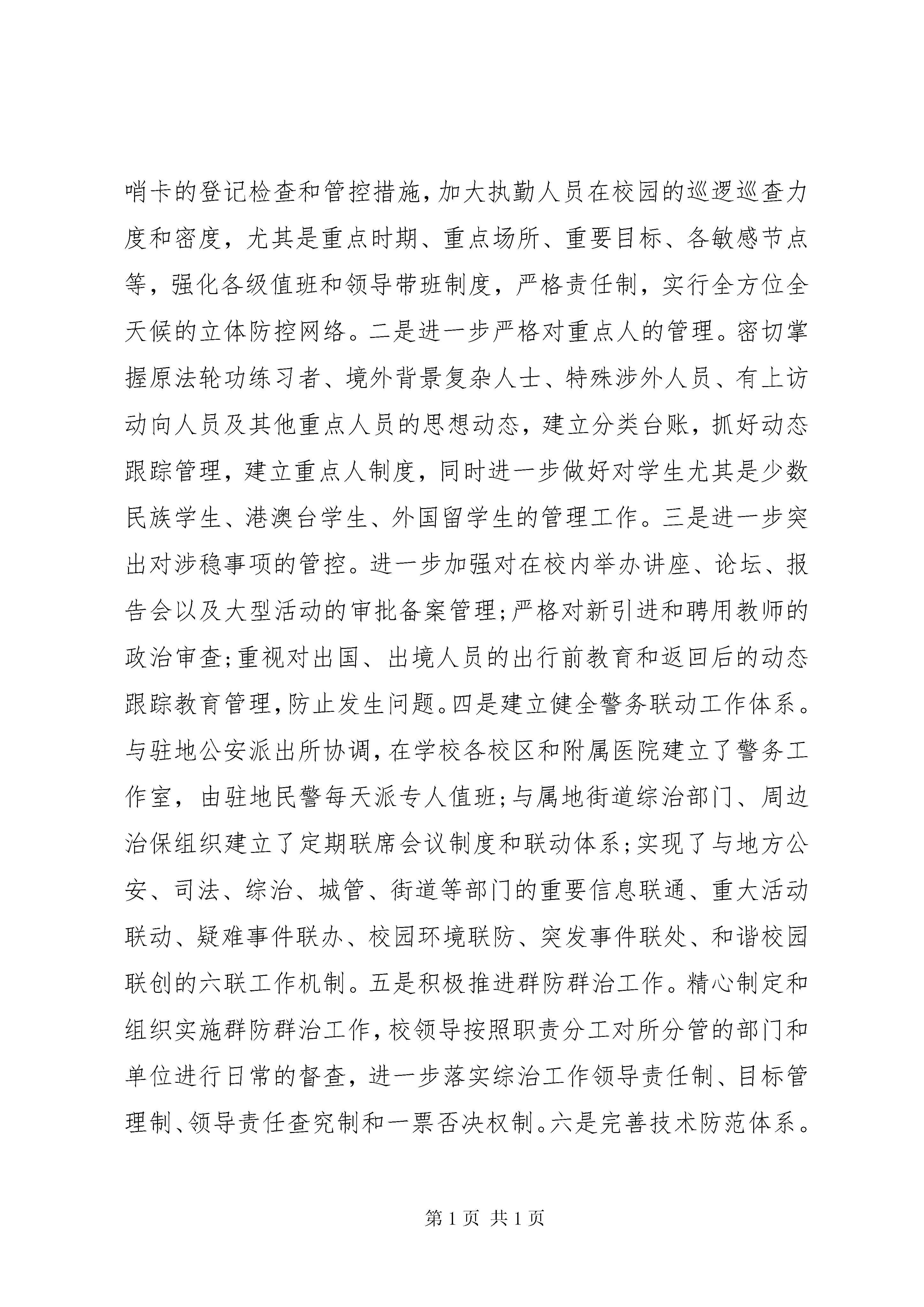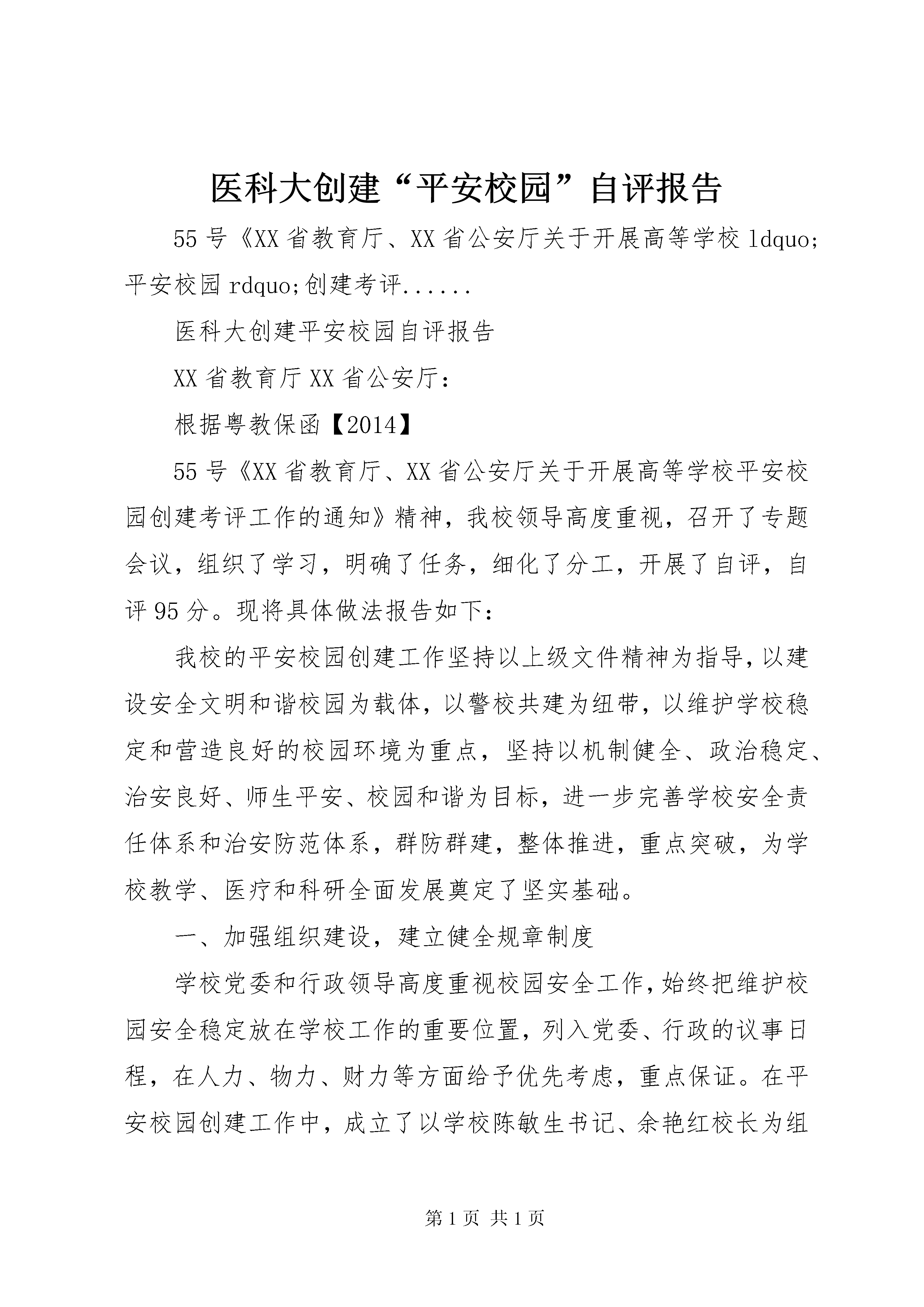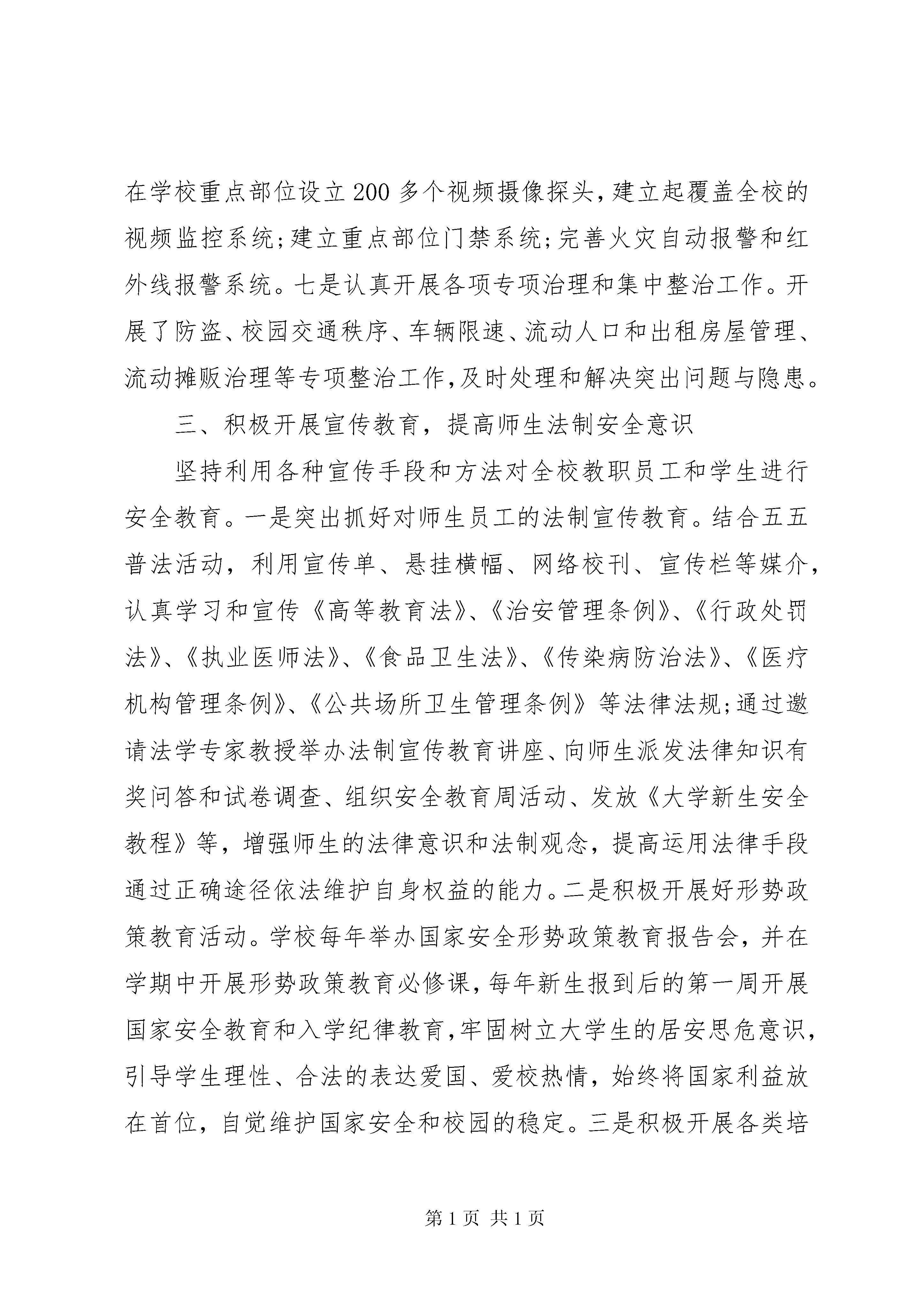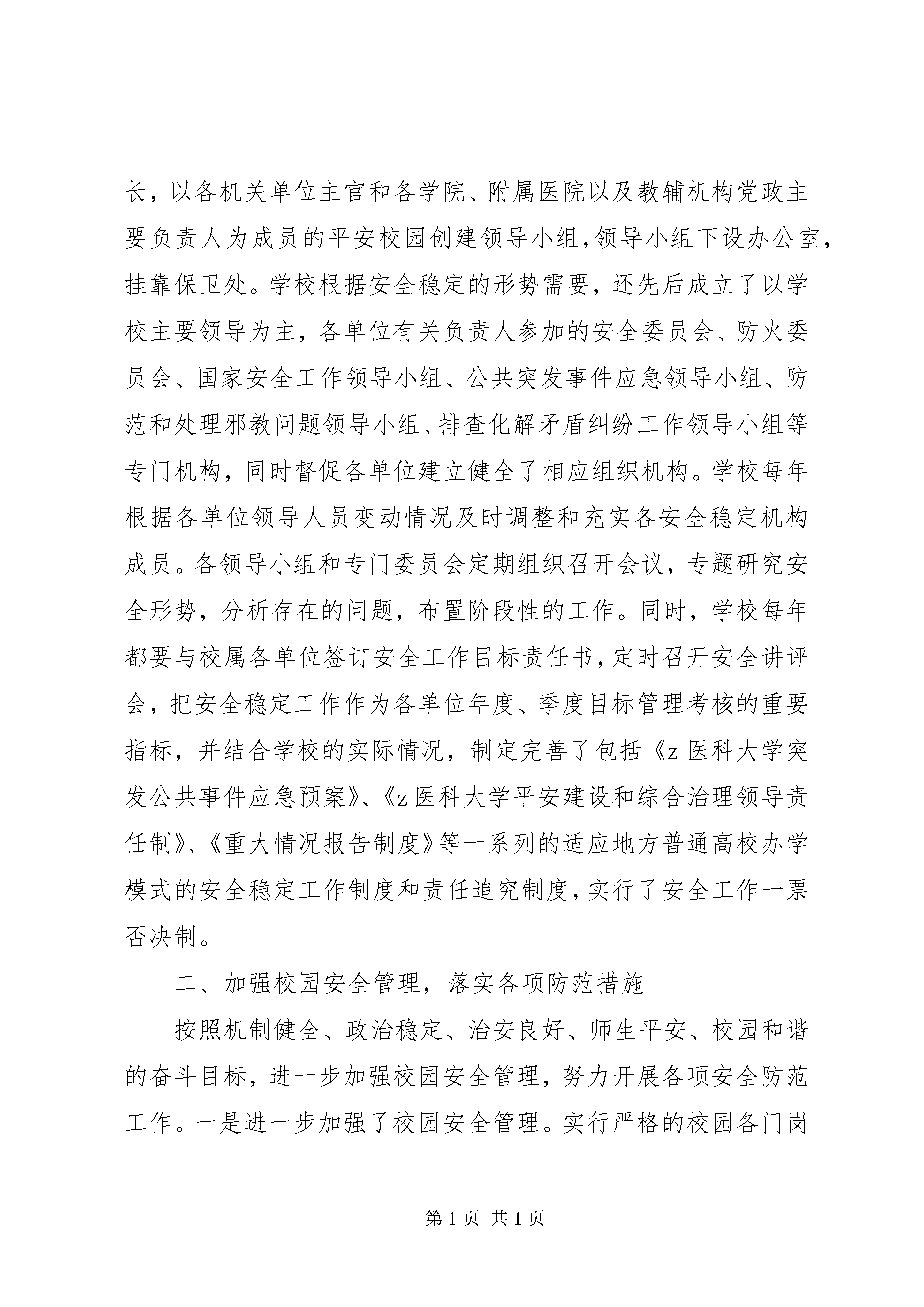 医科大创建“平安校园”自评报告55号《XX省教育厅、XX省公安厅关于开展高等学校ldquo;平安校园rdquo;创建考评......医科大创建平安校园自评报告XX省教育厅XX省公安厅:根据粤教保函【2014】55号《XX省教育厅、XX省公安厅关于开展高等学校平安校园创建考评工作的通知》精神,我校领导高度重视,召开了专题会议,组织了学习,明确了任务,细化了分工,开展了自评,自评95分。现将具体做法报告如下:我校的平安校园创建工作坚持以上级文件精神为指导,以建设安全文明和谐校园为载体,以警校共建为纽带,以维护学校稳定和营造良好的校园环境为重点,坚持以机制健全、政治稳定、治安良好、师生平安、校园和谐为目标,进一步完善学校安全责任体系和治安防范体系,群防群建,整体推进,重点突破,为学校教学、医疗和科研全面发展奠定了坚实基础。一、加强组织建设,建立健全规章制度学校党委和行政领导高度重视校园安全工作,始终把维护校园安全稳定放在学校工作的重要位置,列入党委、行政的议事日程,在人力、物力、财力等方面给予优先考虑,重点保证。在平安校园创建工作中,成立了以学校陈敏生书记、余艳红校长为组长,以各机关单位主官和各学院、附属医院以及教辅机构党政主要负责人为成员的平安校园创建领导小组,领导小组下设办公室,挂靠保卫处。学校根据安全稳定的形势需要,还先后成立了以学校主要领导为主,各单位有关负责人参加的安全委员会、防火委员会、国家安全工作领导小组、公共突发事件应急领导小组、防范和处理邪教问题领导小组、排查化解矛盾纠纷工作领导小组等专门机构,同时督促各单位建立健全了相应组织机构。学校每年根据各单位领导人员变动情况及时调整和充实各安全稳定机构成员。各领导小组和专门委员会定期组织召开会议,专题研究安全形势,分析存在的问题,布置阶段性的工作。同时,学校每年都要与校属各单位签订安全工作目标责任书,定时召开安全讲评会,把安全稳定工作作为各单位年度、季度目标管理考核的重要指标,并结合学校的实际情况,制定完善了包括《z医科大学突发公共事件应急预案》、《z医科大学平安建设和综合治理领导责任制》、《重大情况报告制度》等一系列的适应地方普通高校办学模式的安全稳定工作制度和责任追究制度,实行了安全工作一票否决制。二、加强校园安全管理,落实各项防范措施按照机制健全、政治稳定、治安良好、师生平安、校园和谐的奋斗目标,进一步加强校园安全管理,努力开展各项安全防范工作。一是进一步加强了校园安全管理。实行严格的校园各门岗哨卡的登记检查和管控措施,加大执勤人员在校园的巡逻巡查力度和密度,尤其是重点时期、重点场所、重要目标、各敏感节点等,强化各级值班和领导带班制度,严格责任制,实行全方位全天候的立体防控网络。二是进一步严格对重点人的管理。密切掌握原法轮功练习者、境外背景复杂人士、特殊涉外人员、有上访动向人员及其他重点人员的思想动态,建立分类台账,抓好动态跟踪管理,建立重点人制度,同时进一步做好对学生尤其是少数民族学生、港澳台学生、外国留学生的管理工作。三是进一步突出对涉稳事项的管控。进一步加强对在校内举办讲座、论坛、报告会以及大型活动的审批备案管理;严格对新引进和聘用教师的政治审查;重视对出国、出境人员的出行前教育和返回后的动态跟踪教育管理,防止发生问题。四是建立健全警务联动工作体系。与驻地公安派出所协调,在学校各校区和附属医院建立了警务工作室,由驻地民警每天派专人值班;与属地街道综治部门、周边治保组织建立了定期联席会议制度和联动体系;实现了与地方公安、司法、综治、城管、街道等部门的重要信息联通、重大活动联动、疑难事件联办、校园环境联防、突发事件联处、和谐校园联创的六联工作机制。五是积极推进群防群治工作。精心制定和组织实施群防群治工作,校领导按照职责分工对所分管的部门和单位进行日常的督查,进一步落实综治工作领导责任制、目标管理制、领导责任查究制和一票否决权制。六是完善技术防范体系。在学校重点部位设立200多个视频摄像探头,建立起覆盖全校的视频监控系统;建立重点部位门禁系统;完善火灾自动报警和红外线报警系统。七是认真开展各项专项治理和集中整治工作。开展了防盗、校园交通秩序、车辆限速、流动人口和出租房屋管理、流动摊贩治理等专项整治工作,及时处理和解决突出问题与隐患。三、积极开展宣传教育,提高师生法制安全意识坚持利用各种宣传手段和方法对全校教职员工和学生进行安全教育。一是突出抓好对师生员工的法制宣传教育。结合五五普法活动,利用宣传单、悬挂横幅、网络校刊、宣传栏等媒介,认真学习和宣传《高等教育法》、《治安管理条例》、《行政处罚法》、《执业医师法》、《食品卫生法》、《传染病防治法》、《医疗机构管理条例》、《公共场所卫生管理条例》等法律法规;通过邀请法学专家教授举办法制宣传教育讲座、