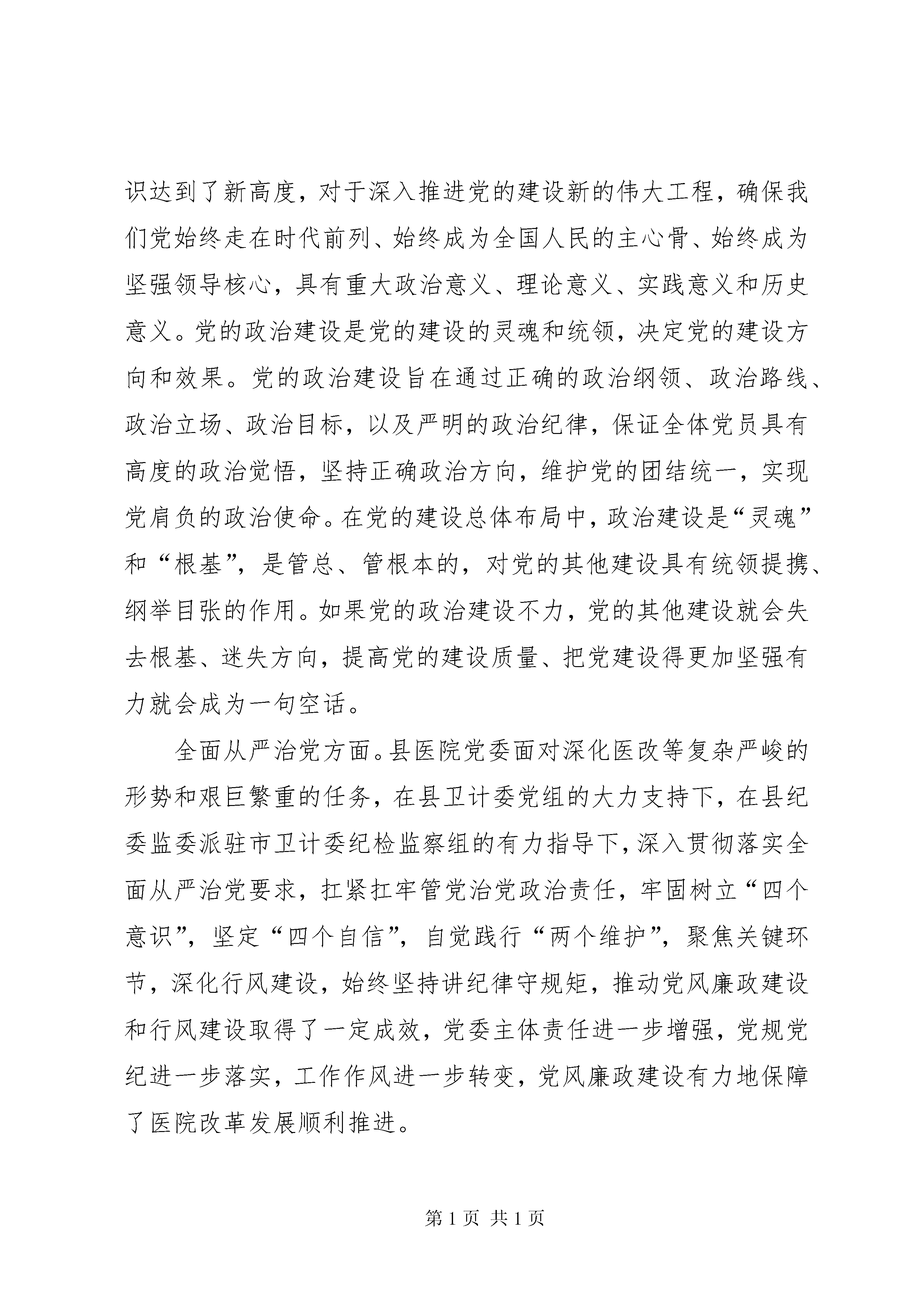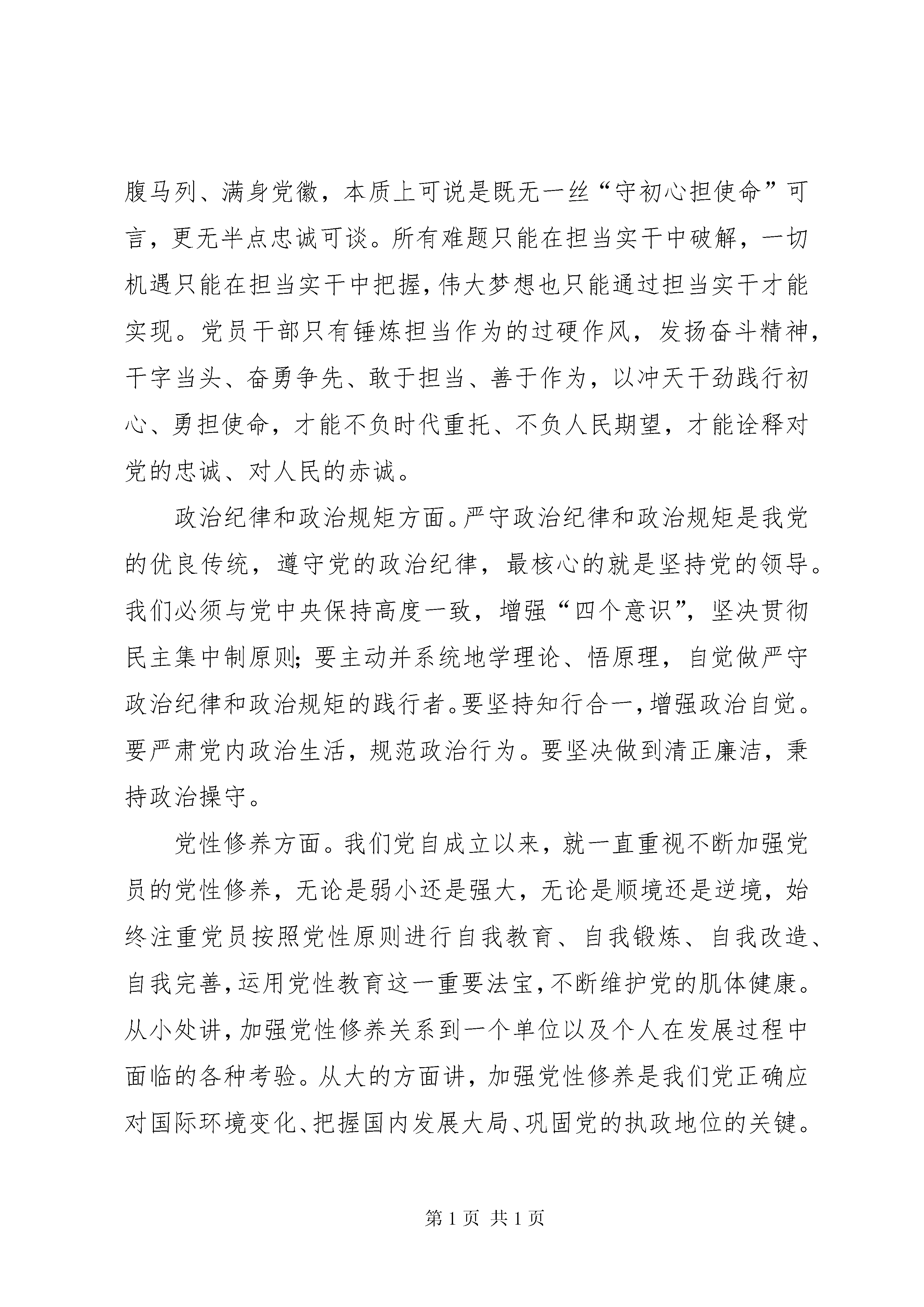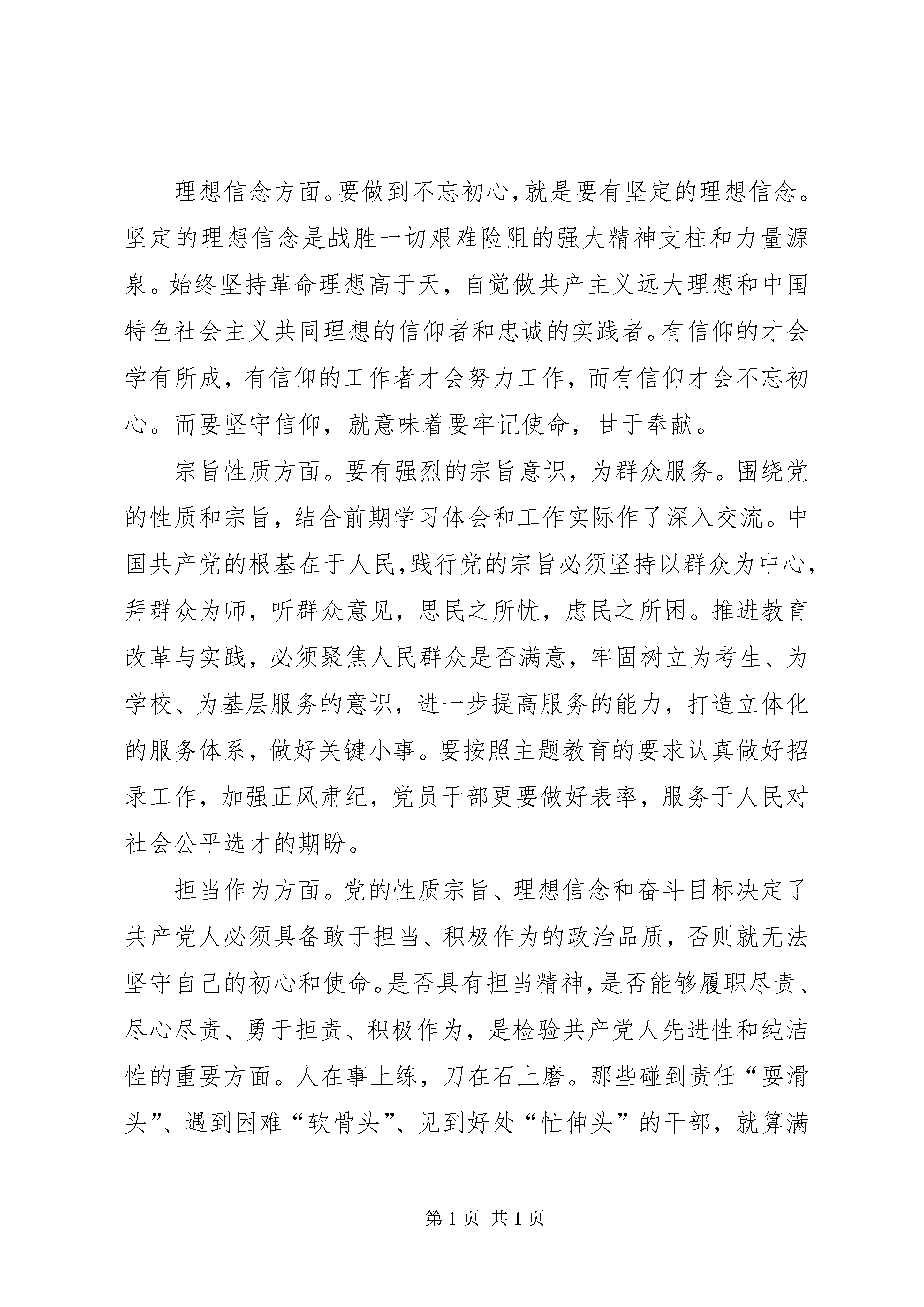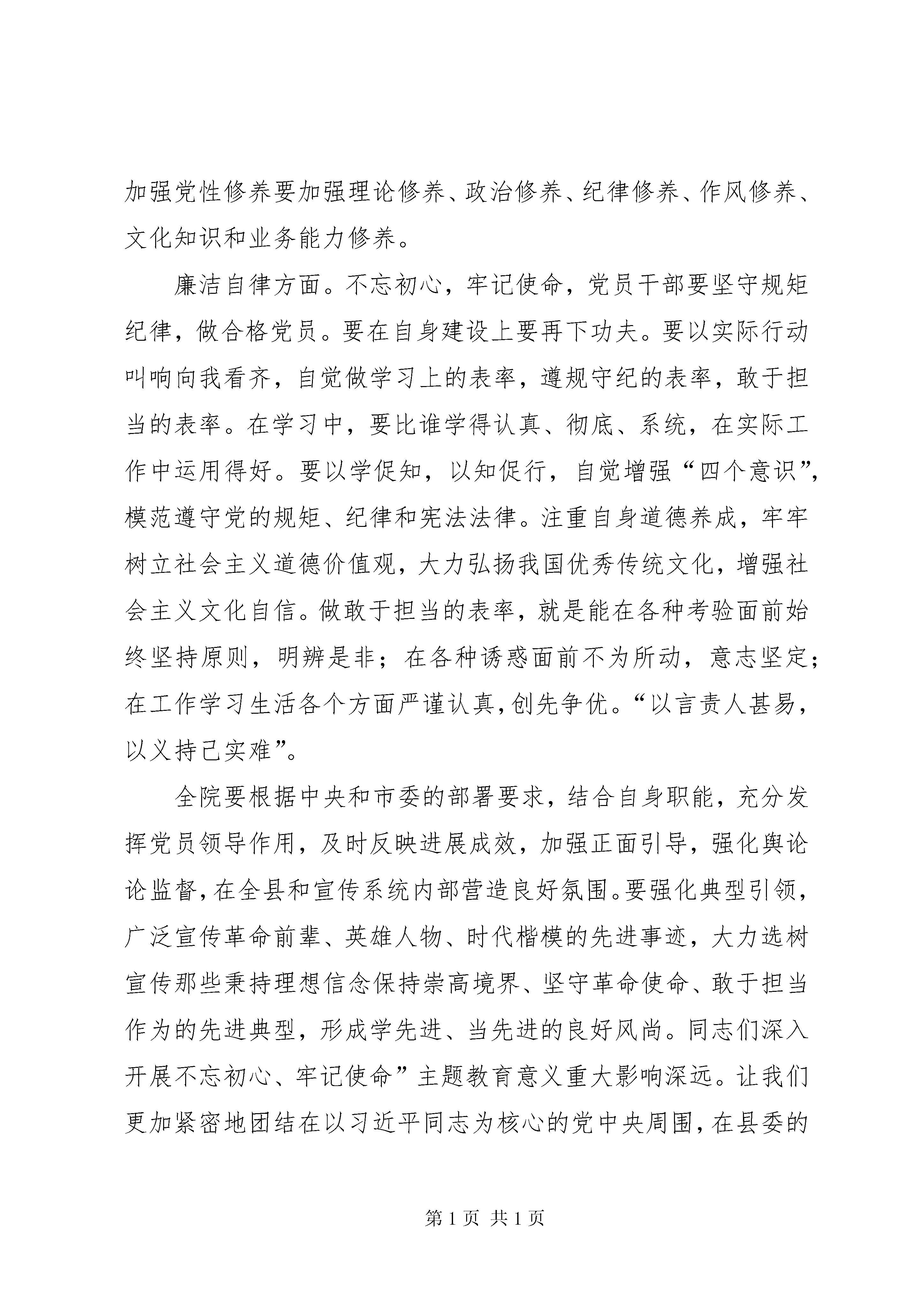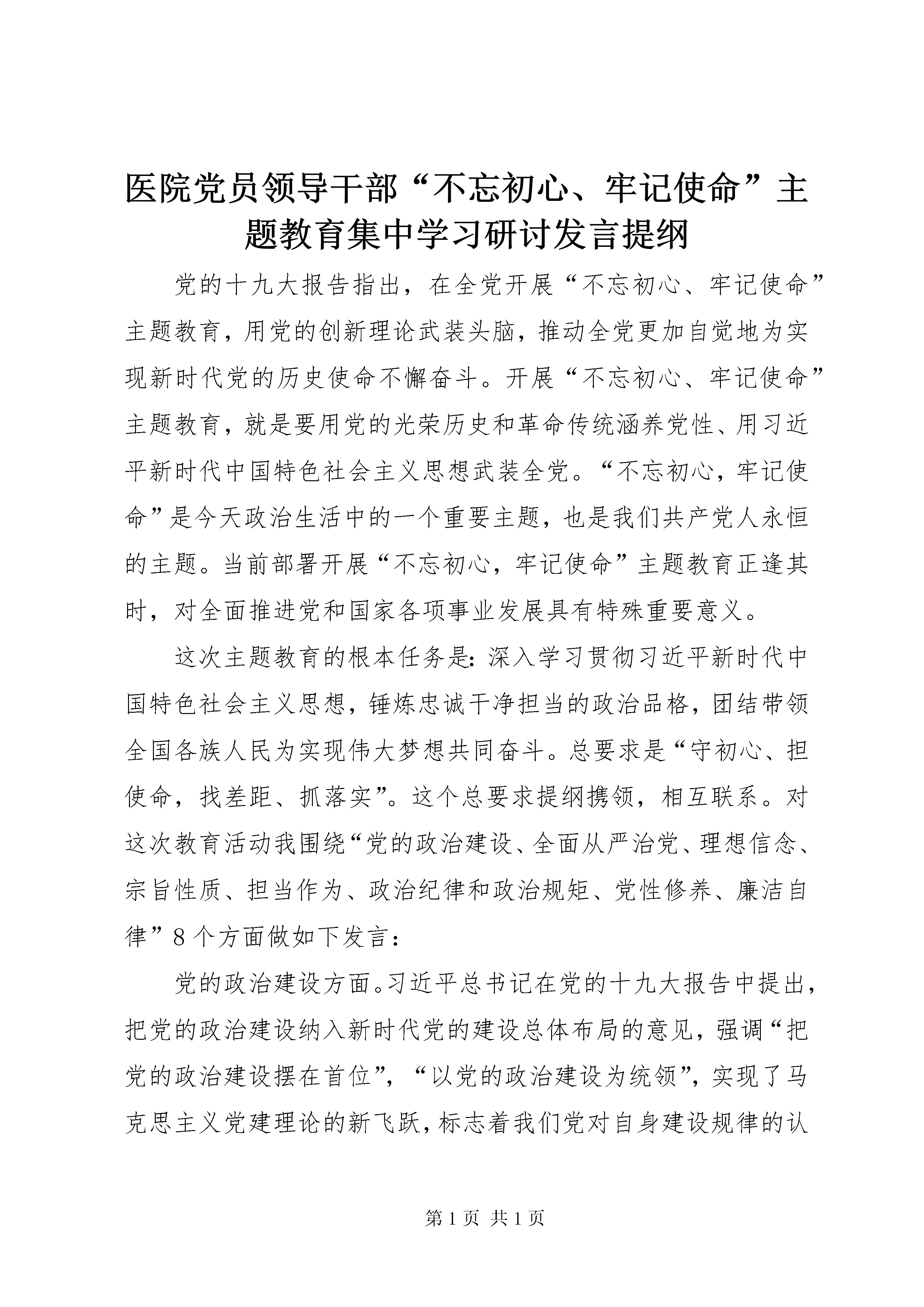 医院党员领导干部“不忘初心、牢记使命”主题教育集中学习研讨发言提纲党的十九大报告指出,在全党开展“不忘初心、牢记使命”主题教育,用党的创新理论武装头脑,推动全党更加自觉地为实现新时代党的历史使命不懈奋斗。开展“不忘初心、牢记使命”主题教育,就是要用党的光荣历史和革命传统涵养党性、用习近平新时代中国特色社会主义思想武装全党。“不忘初心,牢记使命”是今天政治生活中的一个重要主题,也是我们共产党人永恒的主题。当前部署开展“不忘初心,牢记使命”主题教育正逢其时,对全面推进党和国家各项事业发展具有特殊重要意义。这次主题教育的根本任务是:深入学习贯彻习近平新时代中国特色社会主义思想,锤炼忠诚干净担当的政治品格,团结带领全国各族人民为实现伟大梦想共同奋斗。总要求是“守初心、担使命,找差距、抓落实”。这个总要求提纲携领,相互联系。对这次教育活动我围绕“党的政治建设、全面从严治党、理想信念、宗旨性质、担当作为、政治纪律和政治规矩、党性修养、廉洁自律”8个方面做如下发言:党的政治建设方面。习近平总书记在党的十九大报告中提出,把党的政治建设纳入新时代党的建设总体布局的意见,强调“把党的政治建设摆在首位”,“以党的政治建设为统领”,实现了马克思主义党建理论的新飞跃,标志着我们党对自身建设规律的认识达到了新高度,对于深入推进党的建设新的伟大工程,确保我们党始终走在时代前列、始终成为全国人民的主心骨、始终成为坚强领导核心,具有重大政治意义、理论意义、实践意义和历史意义。党的政治建设是党的建设的灵魂和统领,决定党的建设方向和效果。党的政治建设旨在通过正确的政治纲领、政治路线、政治立场、政治目标,以及严明的政治纪律,保证全体党员具有高度的政治觉悟,坚持正确政治方向,维护党的团结统一,实现党肩负的政治使命。在党的建设总体布局中,政治建设是“灵魂”和“根基”,是管总、管根本的,对党的其他建设具有统领提携、纲举目张的作用。如果党的政治建设不力,党的其他建设就会失去根基、迷失方向,提高党的建设质量、把党建设得更加坚强有力就会成为一句空话。全面从严治党方面。县医院党委面对深化医改等复杂严峻的形势和艰巨繁重的任务,在县卫计委党组的大力支持下,在县纪委监委派驻市卫计委纪检监察组的有力指导下,深入贯彻落实全面从严治党要求,扛紧扛牢管党治党政治责任,牢固树立“四个意识”,坚定“四个自信”,自觉践行“两个维护”,聚焦关键环节,深化行风建设,始终坚持讲纪律守规矩,推动党风廉政建设和行风建设取得了一定成效,党委主体责任进一步增强,党规党纪进一步落实,工作作风进一步转变,党风廉政建设有力地保障了医院改革发展顺利推进。理想信念方面。要做到不忘初心,就是要有坚定的理想信念。坚定的理想信念是战胜一切艰难险阻的强大精神支柱和力量源泉。始终坚持革命理想高于天,自觉做共产主义远大理想和中国特色社会主义共同理想的信仰者和忠诚的实践者。有信仰的才会学有所成,有信仰的工作者才会努力工作,而有信仰才会不忘初心。而要坚守信仰,就意味着要牢记使命,甘于奉献。宗旨性质方面。要有强烈的宗旨意识,为群众服务。围绕党的性质和宗旨,结合前期学习体会和工作实际作了深入交流。中国共产党的根基在于人民,践行党的宗旨必须坚持以群众为中心,拜群众为师,听群众意见,思民之所忧,虑民之所困。推进教育改革与实践,必须聚焦人民群众是否满意,牢固树立为考生、为学校、为基层服务的意识,进一步提高服务的能力,打造立体化的服务体系,做好关键小事。要按照主题教育的要求认真做好招录工作,加强正风肃纪,党员干部更要做好表率,服务于人民对社会公平选才的期盼。担当作为方面。党的性质宗旨、理想信念和奋斗目标决定了共产党人必须具备敢于担当、积极作为的政治品质,否则就无法坚守自己的初心和使命。是否具有担当精神,是否能够履职尽责、尽心尽责、勇于担责、积极作为,是检验共产党人先进性和纯洁性的重要方面。人在事上练,刀在石上磨。那些碰到责任“耍滑头”、遇到困难“软骨头”、见到好处“忙伸头”的干部,就算满腹马列、满身党徽,本质上可说是既无一丝“守初心担使命”可言,更无半点忠诚可谈。所有难题只能在担当实干中破解,一切机遇只能在担当实干中把握,伟大梦想也只能通过担当实干才能实现。党员干部只有锤炼担当作为的过硬作风,发扬奋斗精神,干字当头、奋勇争先、敢于担当、善于作为,以冲天干劲践行初心、勇担使命,才能不负时代重托、不负人民期望,才能诠释对党的忠诚、对人民的赤诚。政治纪律和政治规矩方面。严守政治纪律和政治规矩是我党的优良传统,遵守党的政治纪律,最核心的就是坚持党的领导。我们必须与党中央保持高度一致,增强“四个意识”,坚决贯彻民主集中制原则;要主动并系统地学理论、悟原理,自觉做严守政治纪律和政治规矩的践行者。要坚持知行合一,增强政治自觉。要严肃党内政
