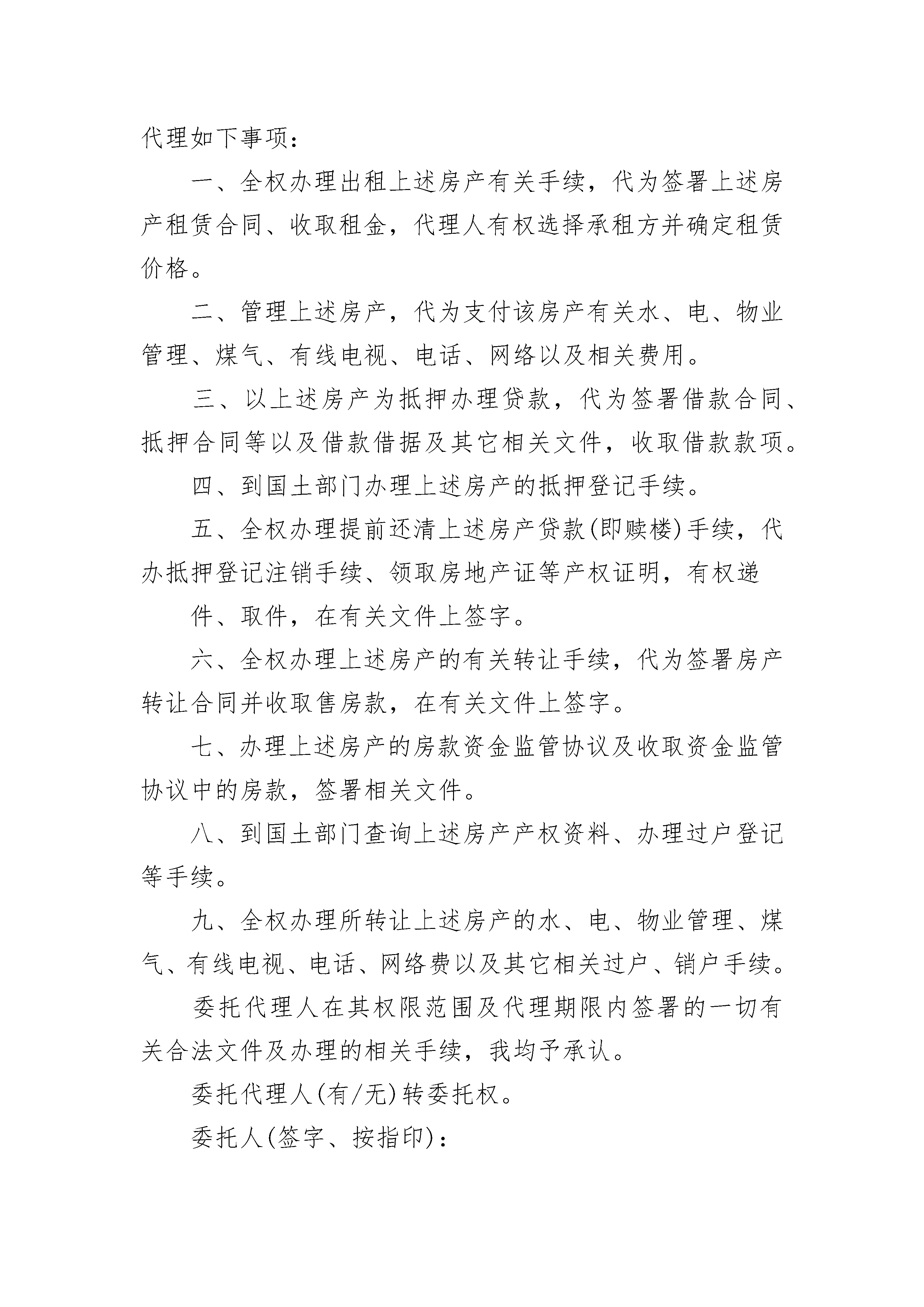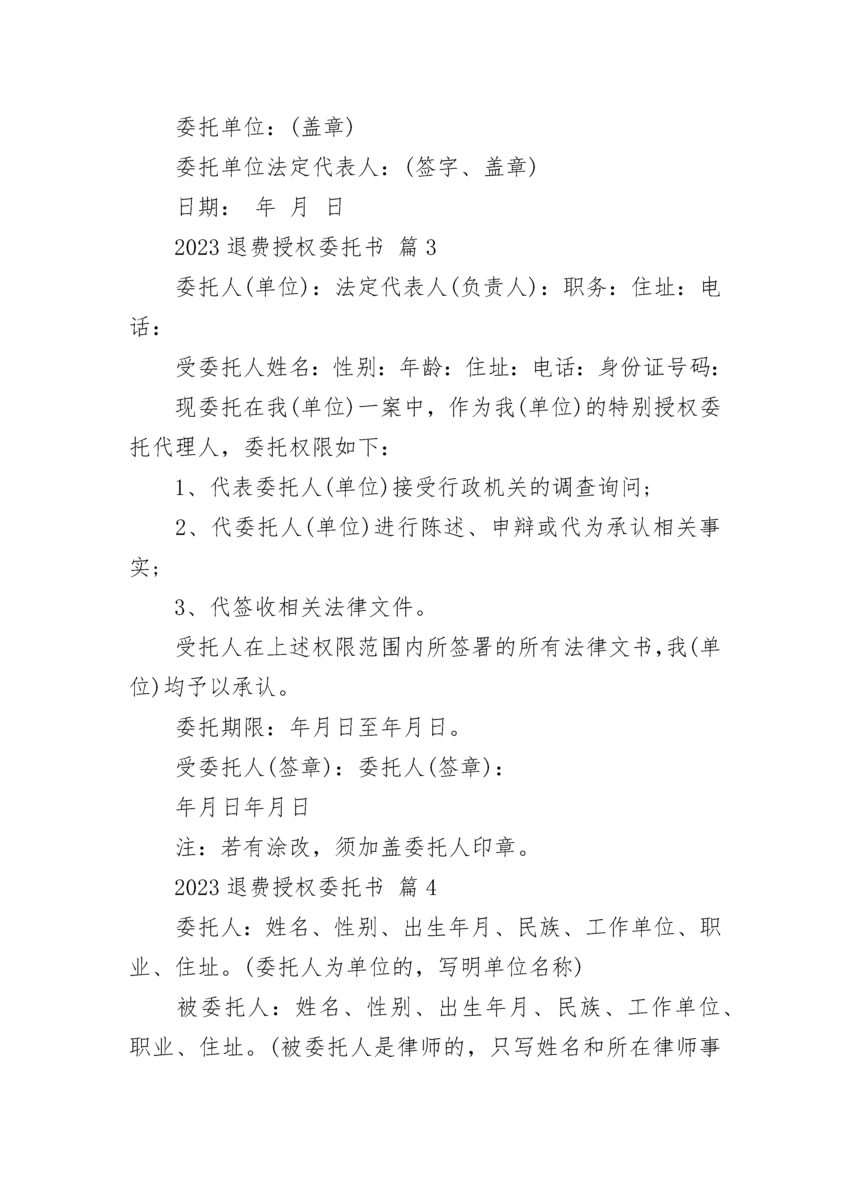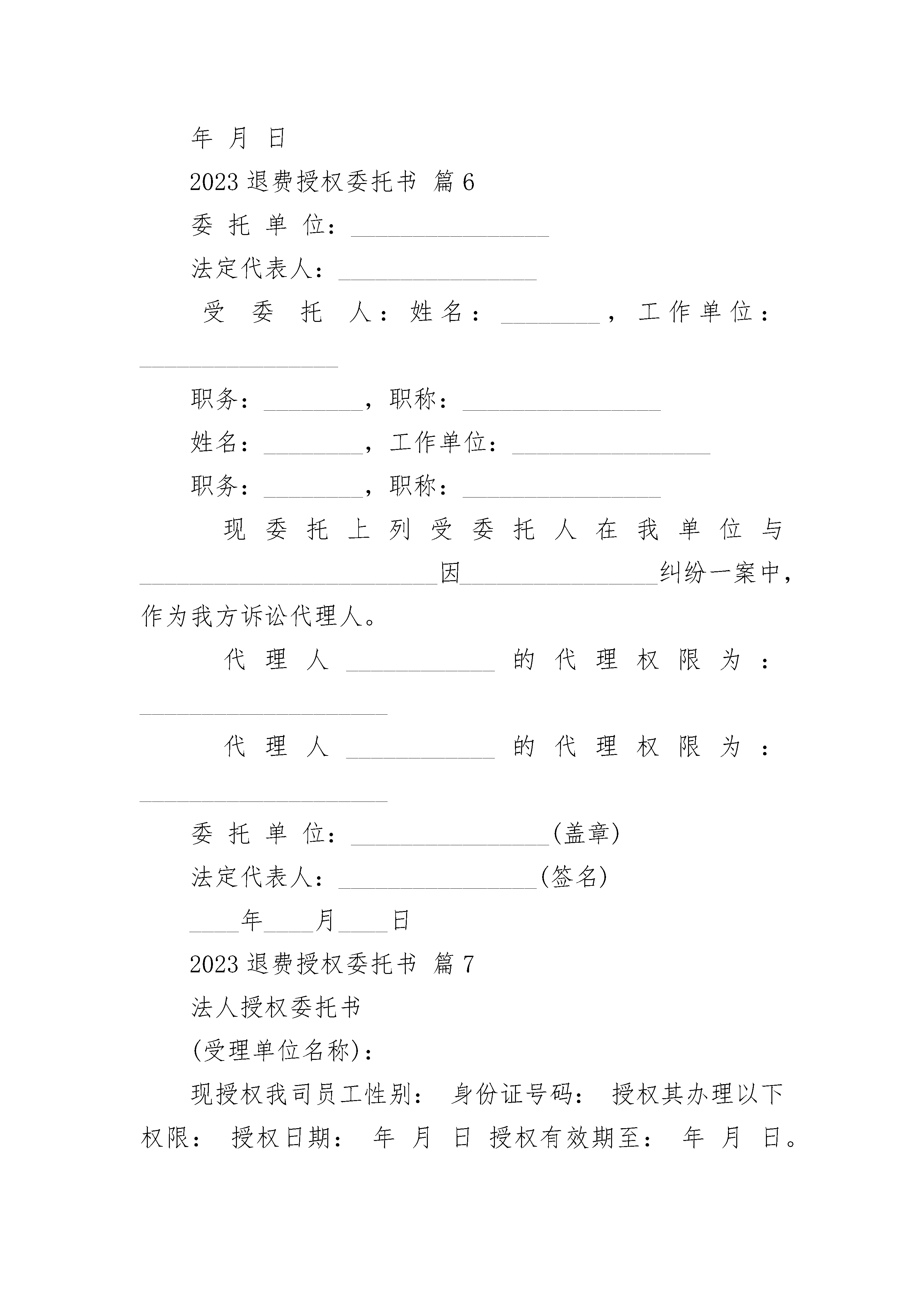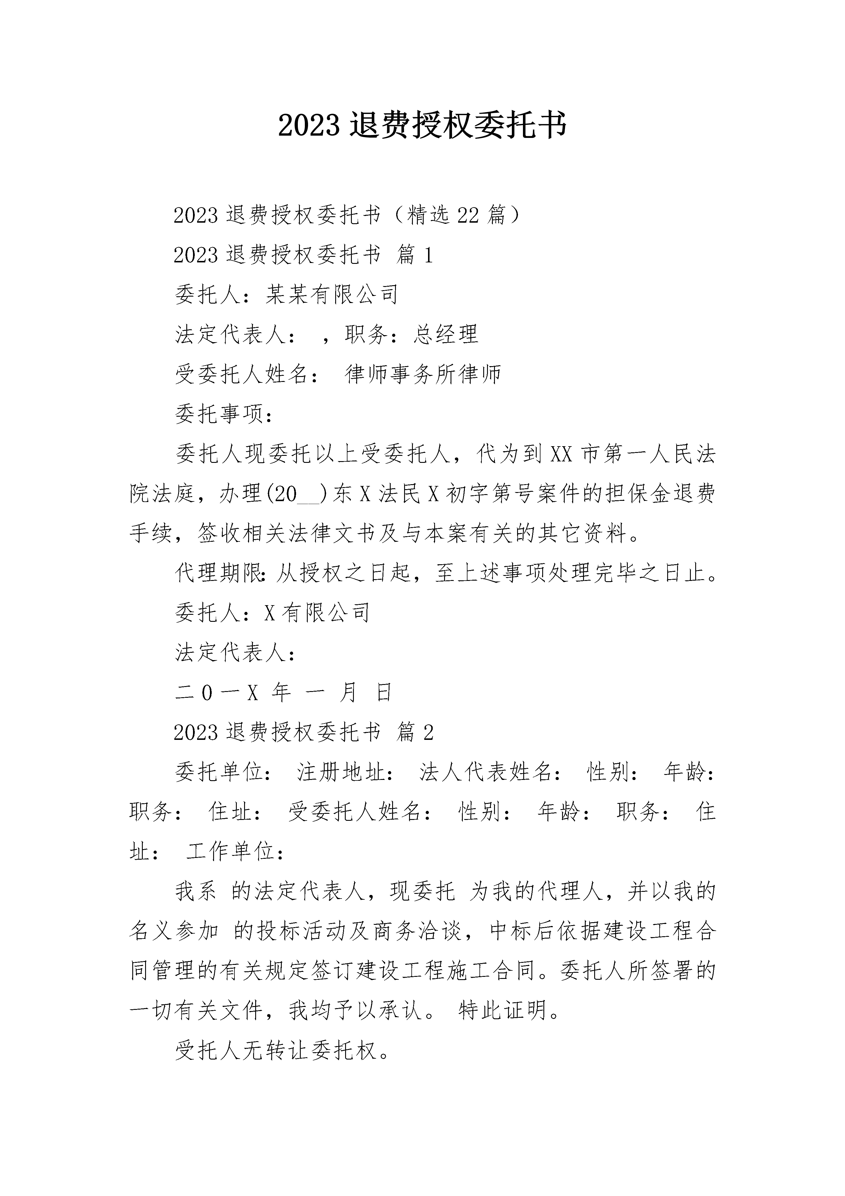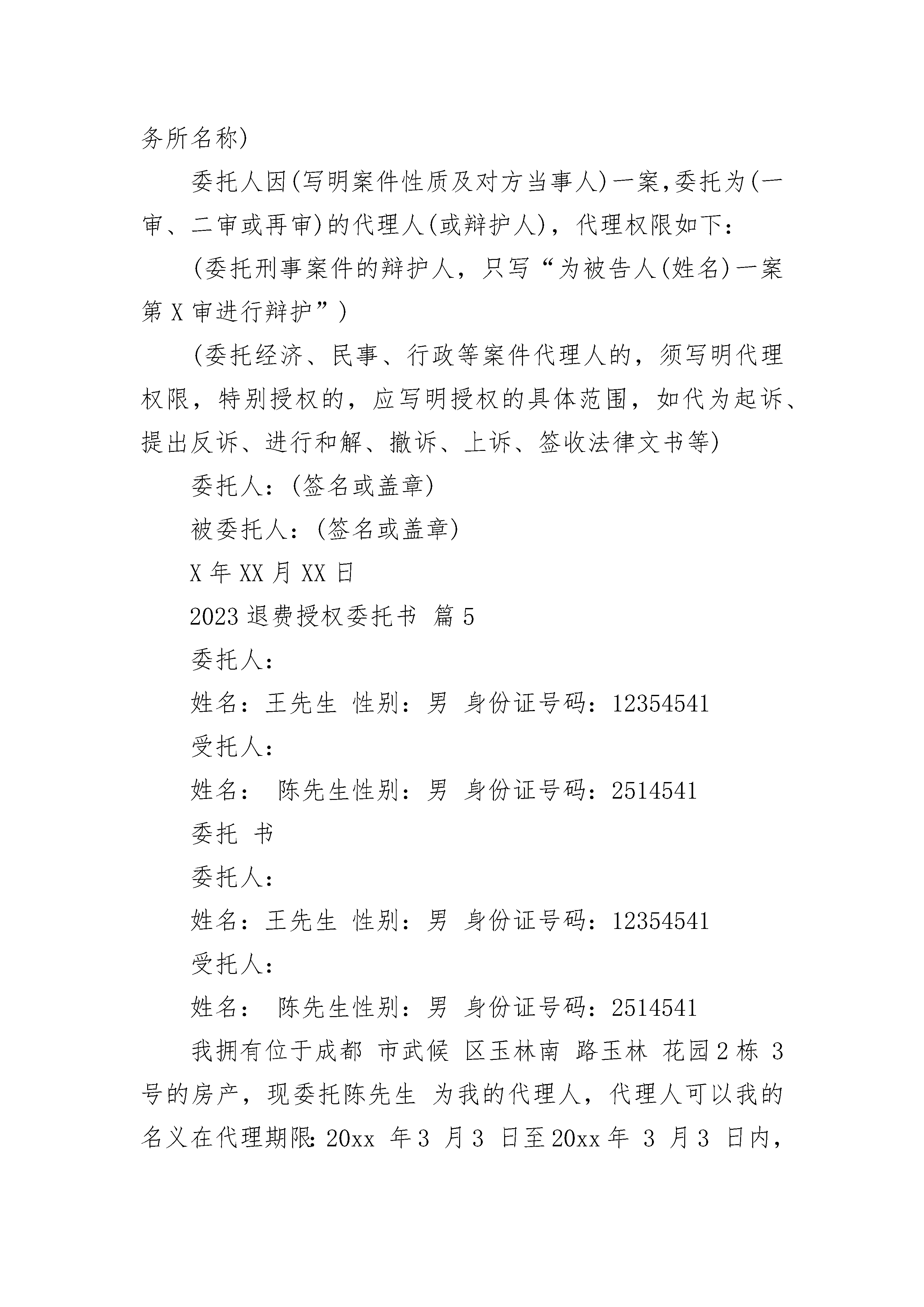 2023退费授权委托书2023退费授权委托书(精选22篇)2023退费授权委托书篇1委托人:某某有限公司法定代表人:,职务:总经理受委托人姓名:律师事务所律师委托事项:委托人现委托以上受委托人,代为到XX市第一人民法院法庭,办理(20__)东X法民X初字第号案件的担保金退费手续,签收相关法律文书及与本案有关的其它资料。代理期限:从授权之日起,至上述事项处理完毕之日止。委托人:X有限公司法定代表人:二0一X年一月日2023退费授权委托书篇2委托单位:注册地址:法人代表姓名:性别:年龄:职务:住址:受委托人姓名:性别:年龄:职务:住址:工作单位:我系的法定代表人,现委托为我的代理人,并以我的名义参加的投标活动及商务洽谈,中标后依据建设工程合同管理的有关规定签订建设工程施工合同。委托人所签署的一切有关文件,我均予以承认。特此证明。受托人无转让委托权。委托单位:(盖章)委托单位法定代表人:(签字、盖章)日期:年月日2023退费授权委托书篇3委托人(单位):法定代表人(负责人):职务:住址:电话:受委托人姓名:性别:年龄:住址:电话:身份证号码:现委托在我(单位)一案中,作为我(单位)的特别授权委托代理人,委托权限如下:1、代表委托人(单位)接受行政机关的调查询问;2、代委托人(单位)进行陈述、申辩或代为承认相关事实;3、代签收相关法律文件。受托人在上述权限范围内所签署的所有法律文书,我(单位)均予以承认。委托期限:年月日至年月日。受委托人(签章):委托人(签章):年月日年月日注:若有涂改,须加盖委托人印章。2023退费授权委托书篇4委托人:姓名、性别、出生年月、民族、工作单位、职业、住址。(委托人为单位的,写明单位名称)被委托人:姓名、性别、出生年月、民族、工作单位、职业、住址。(被委托人是律师的,只写姓名和所在律师事务所名称)委托人因(写明案件性质及对方当事人)一案,委托为(一审、二审或再审)的代理人(或辩护人),代理权限如下:(委托刑事案件的辩护人,只写“为被告人(姓名)一案第X审进行辩护”)(委托经济、民事、行政等案件代理人的,须写明代理权限,特别授权的,应写明授权的具体范围,如代为起诉、提出反诉、进行和解、撤诉、上诉、签收法律文书等)委托人:(签名或盖章)被委托人:(签名或盖章)X年XX月XX日2023退费授权委托书篇5委托人:姓名:王先生性别:男身份证号码:12354541受托人:姓名:陈先生性别:男身份证号码:2514541委托书委托人:姓名:王先生性别:男身份证号码:12354541受托人:姓名:陈先生性别:男身份证号码:2514541我拥有位于成都市武候区玉林南路玉林花园2栋3号的房产,现委托陈先生为我的代理人,代理人可以我的名义在代理期限:20xx年3月3日至20xx年3月3日内,代理如下事项:一、全权办理出租上述房产有关手续,代为签署上述房产租赁合同、收取租金,代理人有权选择承租方并确定租赁价格。二、管理上述房产,代为支付该房产有关水、电、物业管理、煤气、有线电视、电话、网络以及相关费用。三、以上述房产为抵押办理贷款,代为签署借款合同、抵押合同等以及借款借据及其它相关文件,收取借款款项。四、到国土部门办理上述房产的抵押登记手续。五、全权办理提前还清上述房产贷款(即赎楼)手续,代办抵押登记注销手续、领取房地产证等产权证明,有权递件、取件,在有关文件上签字。六、全权办理上述房产的有关转让手续,代为签署房产转让合同并收取售房款,在有关文件上签字。七、办理上述房产的房款资金监管协议及收取资金监管协议中的房款,签署相关文件。八、到国土部门查询上述房产产权资料、办理过户登记等手续。九、全权办理所转让上述房产的水、电、物业管理、煤气、有线电视、电话、网络费以及其它相关过户、销户手续。委托代理人在其权限范围及代理期限内签署的一切有关合法文件及办理的相关手续,我均予承认。委托代理人(有/无)转委托权。委托人(签字、按指印):年月日2023退费授权委托书篇6委托单位:________________法定代表人:________________受委托人:姓名:________,工作单位:________________职务:________,职称:________________姓名:________,工作单位:________________职务:________,职称:________________现委托上列受委托人在我单位与________________________因________________纠纷一案中,作为我方诉讼代理人。代理人____________的代理权限为:____________________代理人____________的代理权限为:____________________委托单位:_______