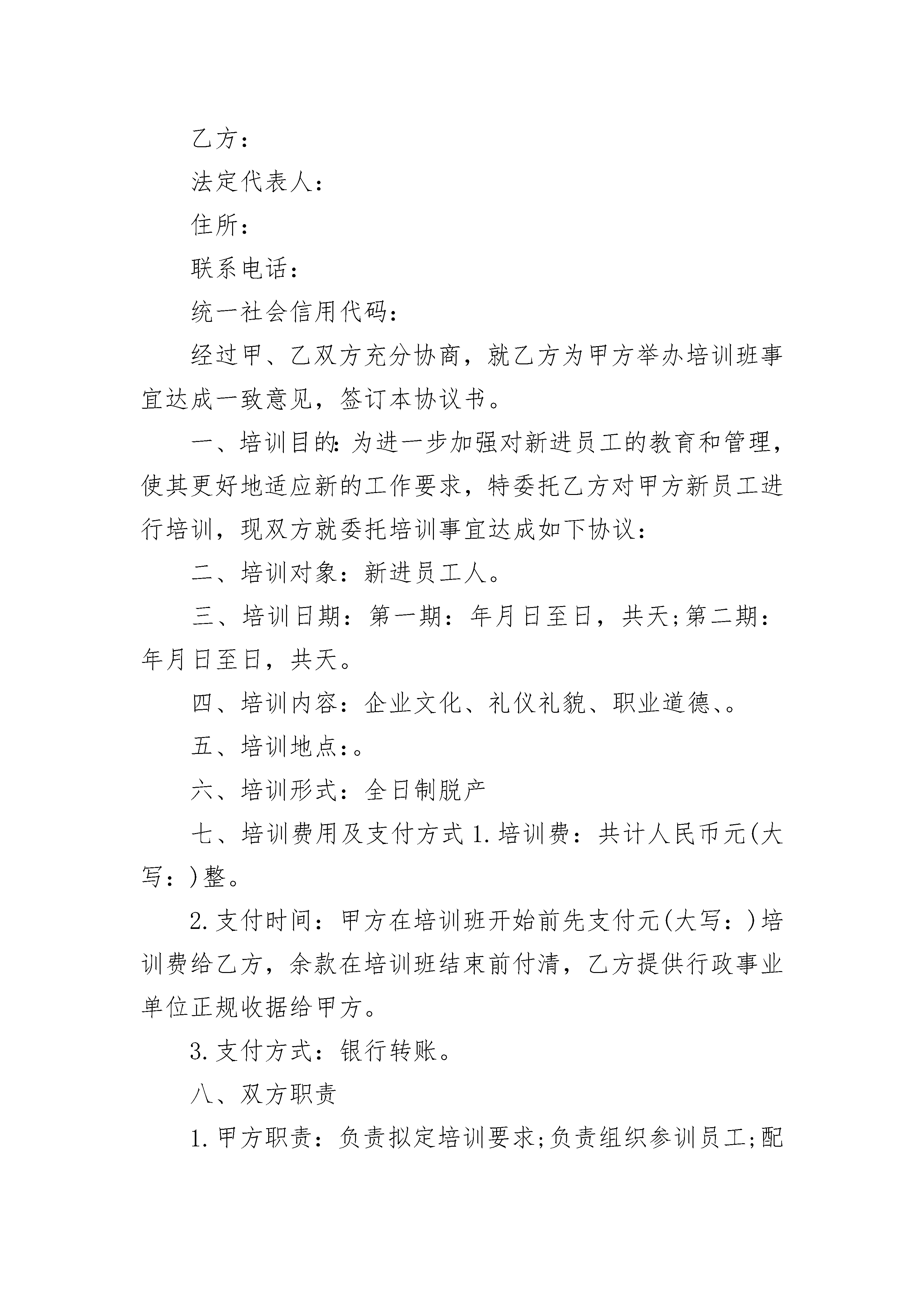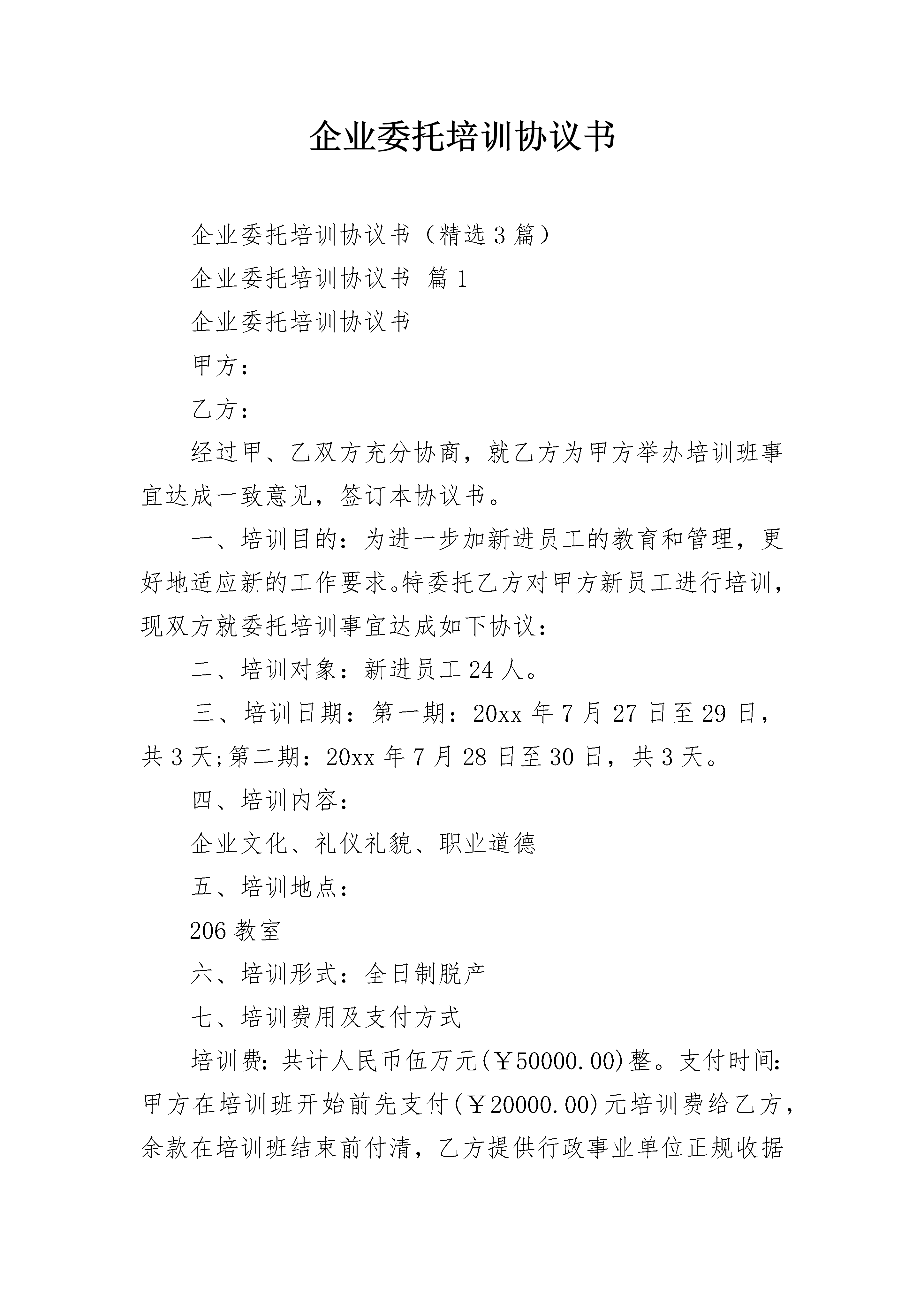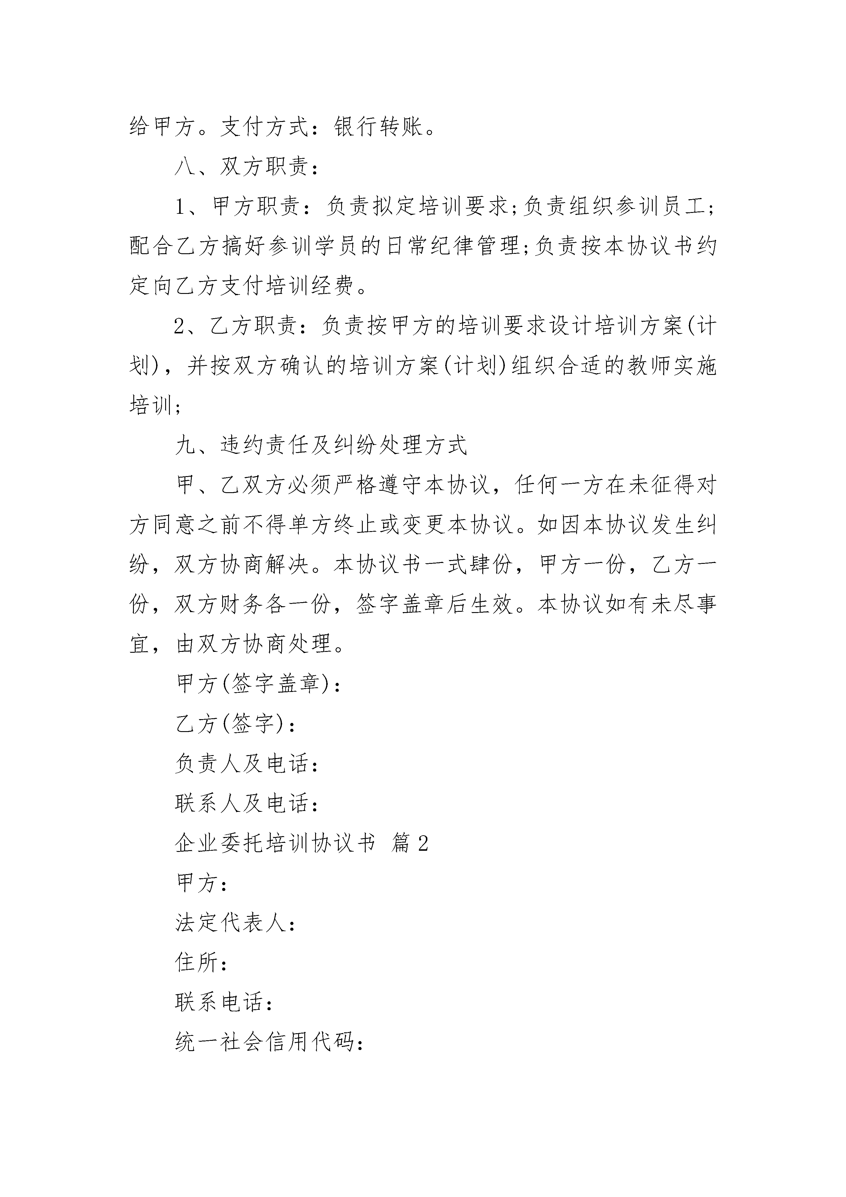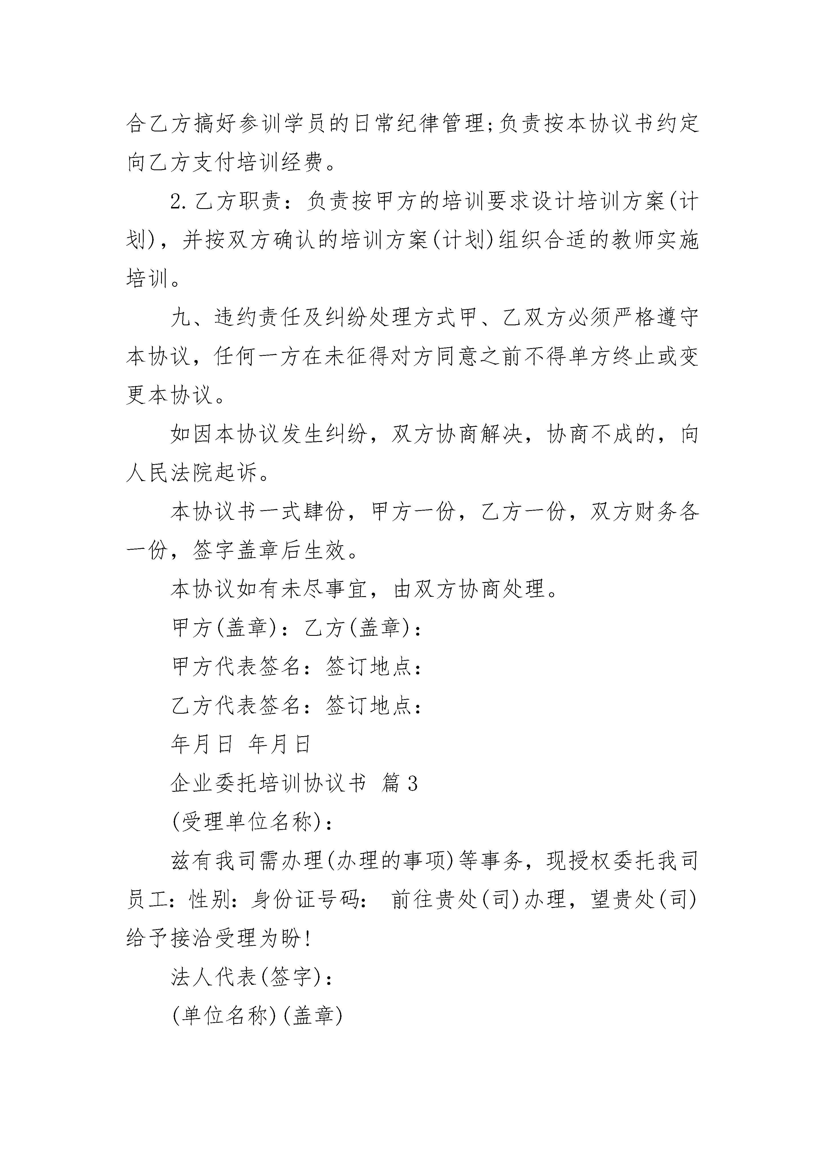 企业委托培训协议书企业委托培训协议书(精选3篇)企业委托培训协议书篇1企业委托培训协议书甲方:乙方:经过甲、乙双方充分协商,就乙方为甲方举办培训班事宜达成一致意见,签订本协议书。一、培训目的:为进一步加新进员工的教育和管理,更好地适应新的工作要求。特委托乙方对甲方新员工进行培训,现双方就委托培训事宜达成如下协议:二、培训对象:新进员工24人。三、培训日期:第一期:20xx年7月27日至29日,共3天;第二期:20xx年7月28日至30日,共3天。四、培训内容:企业文化、礼仪礼貌、职业道德五、培训地点:206教室六、培训形式:全日制脱产七、培训费用及支付方式培训费:共计人民币伍万元(¥50000.00)整。支付时间:甲方在培训班开始前先支付(¥20000.00)元培训费给乙方,余款在培训班结束前付清,乙方提供行政事业单位正规收据给甲方。支付方式:银行转账。八、双方职责:1、甲方职责:负责拟定培训要求;负责组织参训员工;配合乙方搞好参训学员的日常纪律管理;负责按本协议书约定向乙方支付培训经费。2、乙方职责:负责按甲方的培训要求设计培训方案(计划),并按双方确认的培训方案(计划)组织合适的教师实施培训;九、违约责任及纠纷处理方式甲、乙双方必须严格遵守本协议,任何一方在未征得对方同意之前不得单方终止或变更本协议。如因本协议发生纠纷,双方协商解决。本协议书一式肆份,甲方一份,乙方一份,双方财务各一份,签字盖章后生效。本协议如有未尽事宜,由双方协商处理。甲方(签字盖章):乙方(签字):负责人及电话:联系人及电话:企业委托培训协议书篇2甲方:法定代表人:住所:联系电话:统一社会信用代码:乙方:法定代表人:住所:联系电话:统一社会信用代码:经过甲、乙双方充分协商,就乙方为甲方举办培训班事宜达成一致意见,签订本协议书。一、培训目的:为进一步加强对新进员工的教育和管理,使其更好地适应新的工作要求,特委托乙方对甲方新员工进行培训,现双方就委托培训事宜达成如下协议:二、培训对象:新进员工人。三、培训日期:第一期:年月日至日,共天;第二期:年月日至日,共天。四、培训内容:企业文化、礼仪礼貌、职业道德、。五、培训地点:。六、培训形式:全日制脱产七、培训费用及支付方式1.培训费:共计人民币元(大写:)整。2.支付时间:甲方在培训班开始前先支付元(大写:)培训费给乙方,余款在培训班结束前付清,乙方提供行政事业单位正规收据给甲方。3.支付方式:银行转账。八、双方职责1.甲方职责:负责拟定培训要求;负责组织参训员工;配合乙方搞好参训学员的日常纪律管理;负责按本协议书约定向乙方支付培训经费。2.乙方职责:负责按甲方的培训要求设计培训方案(计划),并按双方确认的培训方案(计划)组织合适的教师实施培训。九、违约责任及纠纷处理方式甲、乙双方必须严格遵守本协议,任何一方在未征得对方同意之前不得单方终止或变更本协议。如因本协议发生纠纷,双方协商解决,协商不成的,向人民法院起诉。本协议书一式肆份,甲方一份,乙方一份,双方财务各一份,签字盖章后生效。本协议如有未尽事宜,由双方协商处理。甲方(盖章):乙方(盖章):甲方代表签名:签订地点:乙方代表签名:签订地点:年月日年月日企业委托培训协议书篇3(受理单位名称):兹有我司需办理(办理的事项)等事务,现授权委托我司员工:性别:身份证号码:前往贵处(司)办理,望贵处(司)给予接洽受理为盼!法人代表(签字):(单位名称)(盖章)年月日