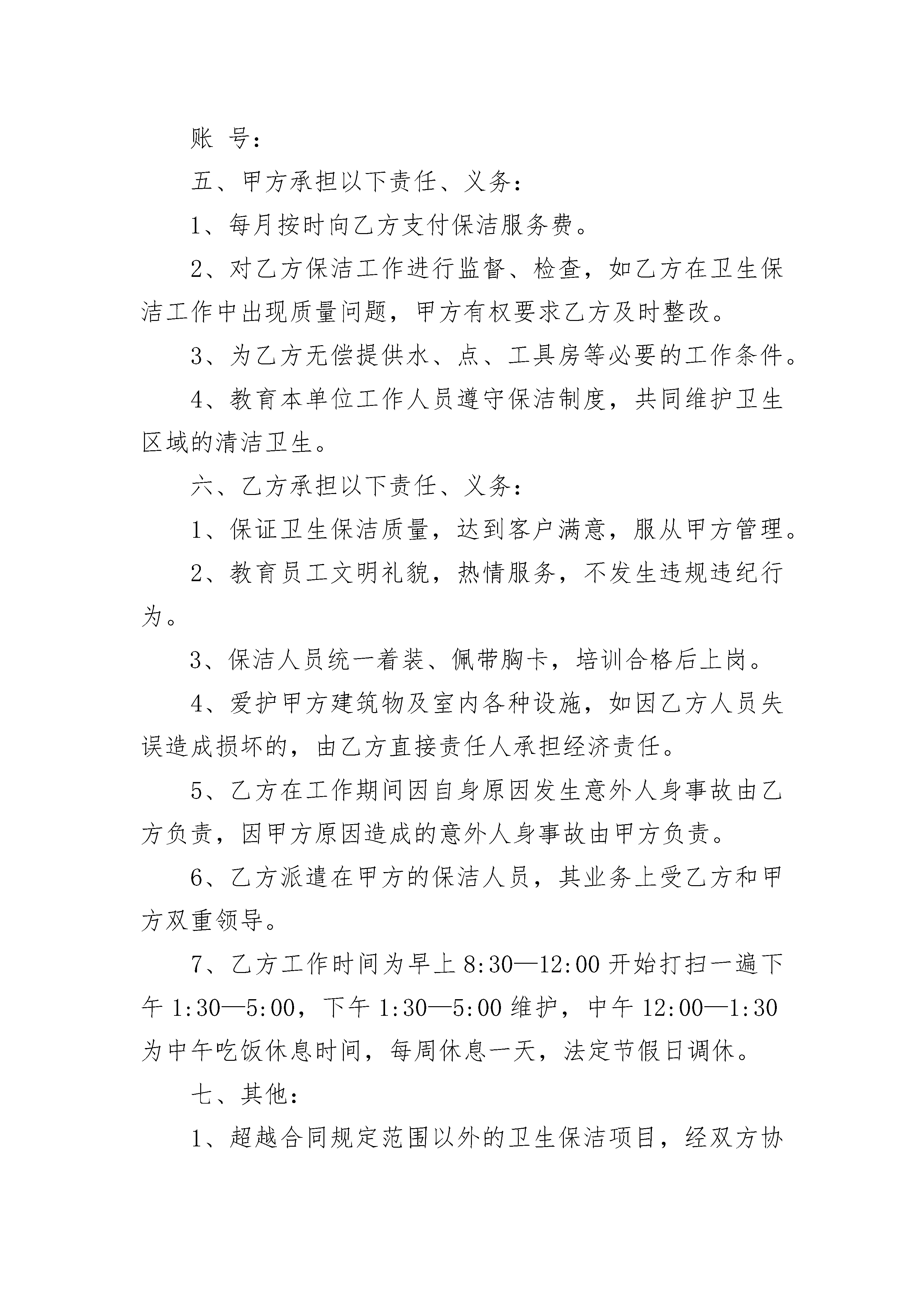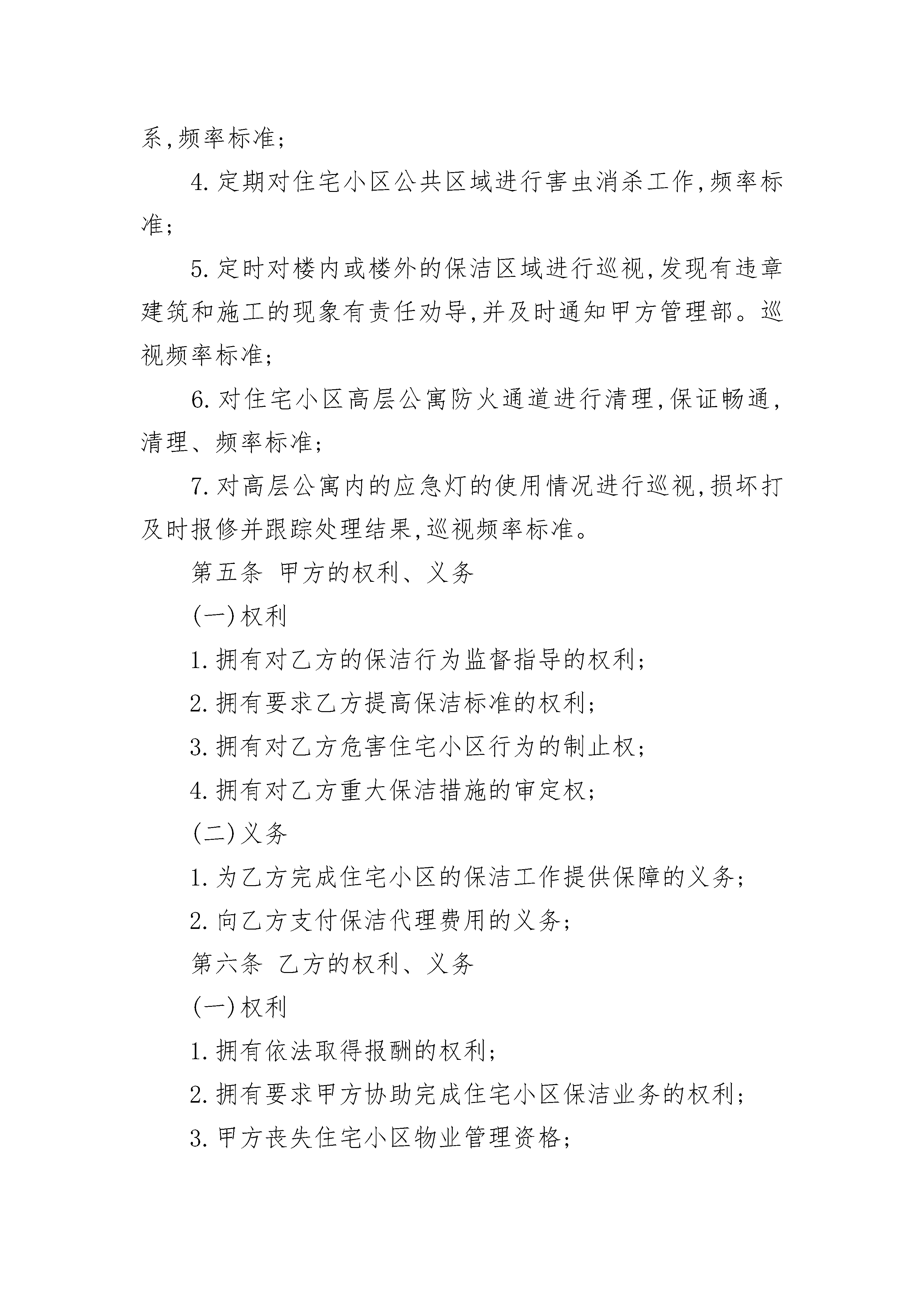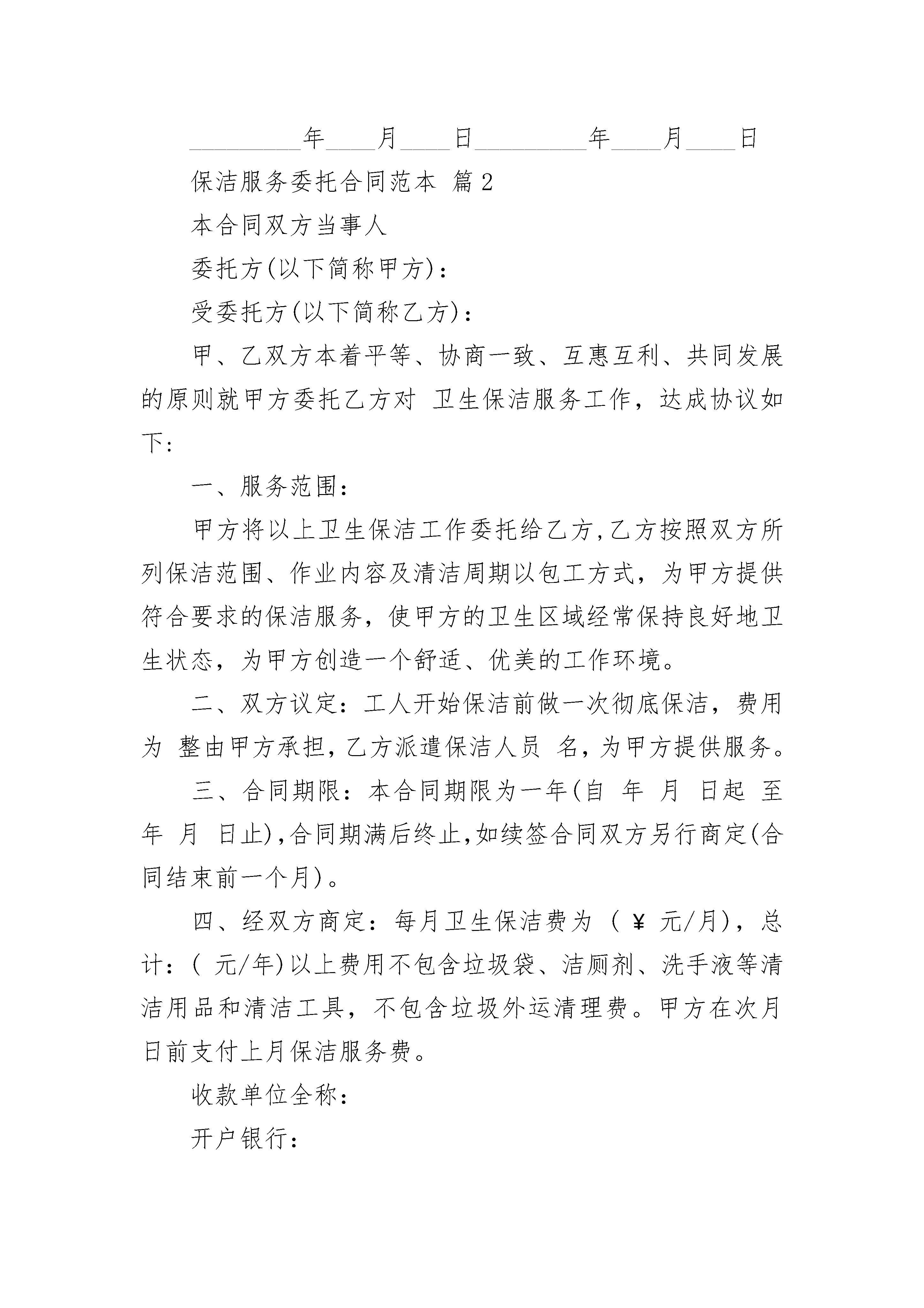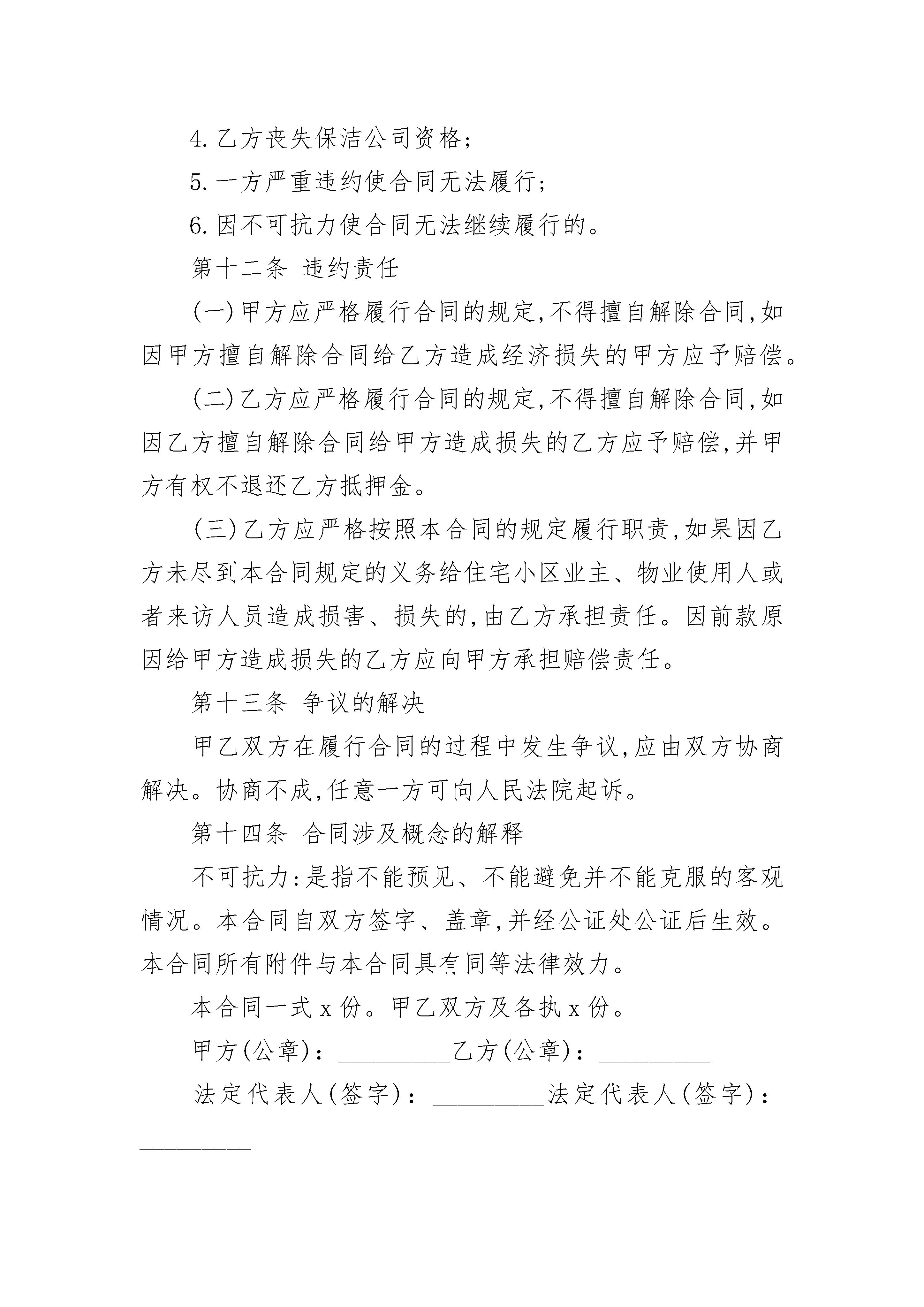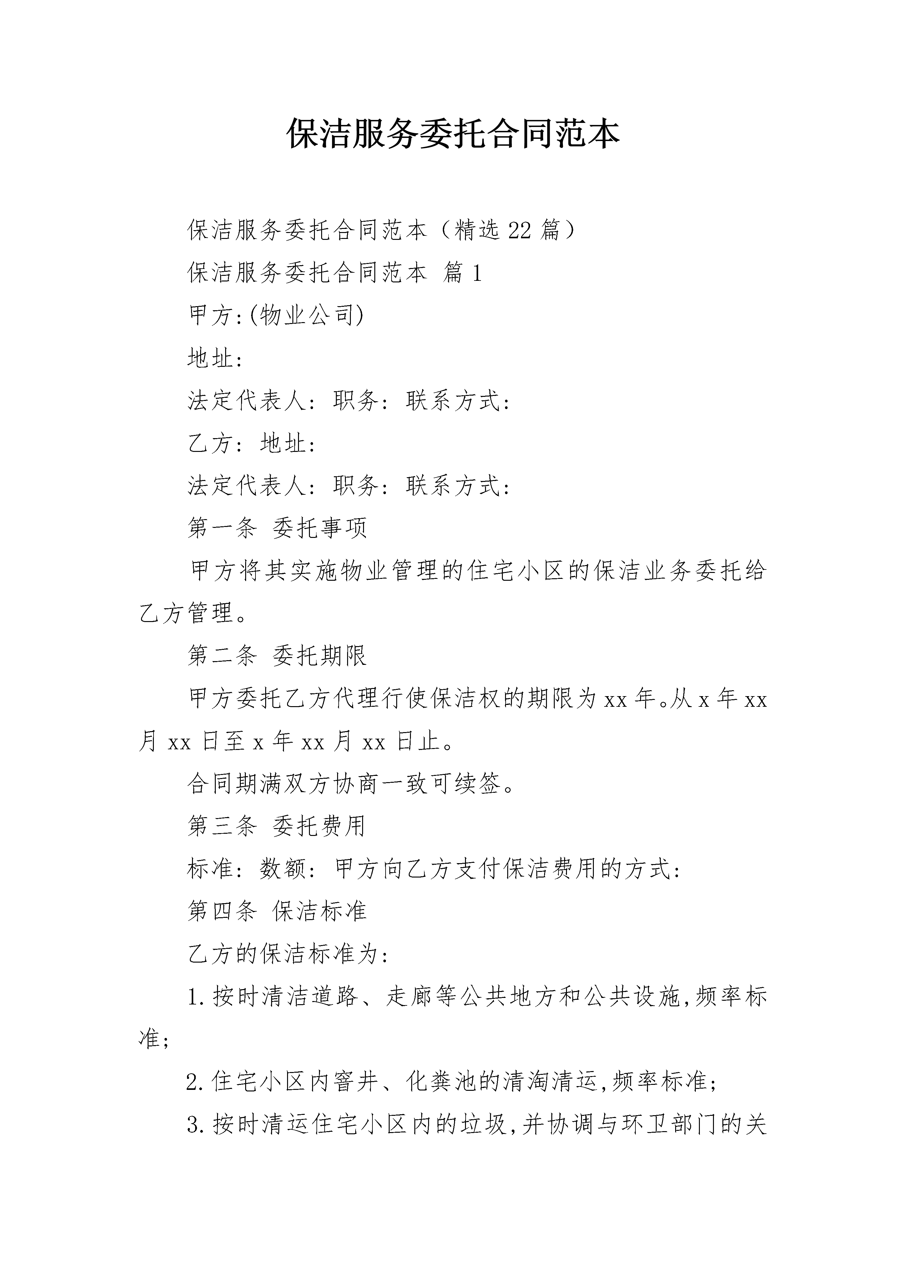保洁服务委托合同范本保洁服务委托合同范本(精选22篇)保洁服务委托合同范本篇1甲方:(物业公司)地址:法定代表人:职务:联系方式:乙方:地址:法定代表人:职务:联系方式:第一条委托事项甲方将其实施物业管理的住宅小区的保洁业务委托给乙方管理。第二条委托期限甲方委托乙方代理行使保洁权的期限为xx年。从x年xx月xx日至x年xx月xx日止。合同期满双方协商一致可续签。第三条委托费用标准:数额:甲方向乙方支付保洁费用的方式:第四条保洁标准乙方的保洁标准为:1.按时清洁道路、走廊等公共地方和公共设施,频率标准;2.住宅小区内窨井、化粪池的清淘清运,频率标准;3.按时清运住宅小区内的垃圾,并协调与环卫部门的关系,频率标准;4.定期对住宅小区公共区域进行害虫消杀工作,频率标准;5.定时对楼内或楼外的保洁区域进行巡视,发现有违章建筑和施工的现象有责任劝导,并及时通知甲方管理部。巡视频率标准;6.对住宅小区高层公寓防火通道进行清理,保证畅通,清理、频率标准;7.对高层公寓内的应急灯的使用情况进行巡视,损坏打及时报修并跟踪处理结果,巡视频率标准。第五条甲方的权利、义务(一)权利1.拥有对乙方的保洁行为监督指导的权利;2.拥有要求乙方提高保洁标准的权利;3.拥有对乙方危害住宅小区行为的制止权;4.拥有对乙方重大保洁措施的审定权;(二)义务1.为乙方完成住宅小区的保洁工作提供保障的义务;2.向乙方支付保洁代理费用的义务;第六条乙方的权利、义务(一)权利1.拥有依法取得报酬的权利;2.拥有要求甲方协助完成住宅小区保洁业务的权利;3.甲方丧失住宅小区物业管理资格;4.乙方丧失保洁公司资格;5.一方严重违约使合同无法履行;6.因不可抗力使合同无法继续履行的。第十二条违约责任(一)甲方应严格履行合同的规定,不得擅自解除合同,如因甲方擅自解除合同给乙方造成经济损失的甲方应予赔偿。(二)乙方应严格履行合同的规定,不得擅自解除合同,如因乙方擅自解除合同给甲方造成损失的乙方应予赔偿,并甲方有权不退还乙方抵押金。(三)乙方应严格按照本合同的规定履行职责,如果因乙方未尽到本合同规定的义务给住宅小区业主、物业使用人或者来访人员造成损害、损失的,由乙方承担责任。因前款原因给甲方造成损失的乙方应向甲方承担赔偿责任。第十三条争议的解决甲乙双方在履行合同的过程中发生争议,应由双方协商解决。协商不成,任意一方可向人民法院起诉。第十四条合同涉及概念的解释不可抗力:是指不能预见、不能避免并不能克服的客观情况。本合同自双方签字、盖章,并经公证处公证后生效。本合同所有附件与本合同具有同等法律效力。本合同一式x份。甲乙双方及各执x份。甲方(公章):_________乙方(公章):_________法定代表人(签字):_________法定代表人(签字):__________________年____月____日_________年____月____日保洁服务委托合同范本篇2本合同双方当事人委托方(以下简称甲方):受委托方(以下简称乙方):甲、乙双方本着平等、协商一致、互惠互利、共同发展的原则就甲方委托乙方对卫生保洁服务工作,达成协议如下:一、服务范围:甲方将以上卫生保洁工作委托给乙方,乙方按照双方所列保洁范围、作业内容及清洁周期以包工方式,为甲方提供符合要求的保洁服务,使甲方的卫生区域经常保持良好地卫生状态,为甲方创造一个舒适、优美的工作环境。二、双方议定:工人开始保洁前做一次彻底保洁,费用为整由甲方承担,乙方派遣保洁人员名,为甲方提供服务。三、合同期限:本合同期限为一年(自年月日起至年月日止),合同期满后终止,如续签合同双方另行商定(合同结束前一个月)。四、经双方商定:每月卫生保洁费为(¥元/月),总计:(元/年)以上费用不包含垃圾袋、洁厕剂、洗手液等清洁用品和清洁工具,不包含垃圾外运清理费。甲方在次月日前支付上月保洁服务费。收款单位全称:开户银行:账号:五、甲方承担以下责任、义务:1、每月按时向乙方支付保洁服务费。2、对乙方保洁工作进行监督、检查,如乙方在卫生保洁工作中出现质量问题,甲方有权要求乙方及时整改。3、为乙方无偿提供水、点、工具房等必要的工作条件。4、教育本单位工作人员遵守保洁制度,共同维护卫生区域的清洁卫生。六、乙方承担以下责任、义务:1、保证卫生保洁质量,达到客户满意,服从甲方管理。2、教育员工文明礼貌,热情服务,不发生违规违纪行为。3、保洁人员统一着装、佩带胸卡,培训合格后上岗。4、爱护甲方建筑物及室内各种设施,如因乙方人员失误造成损坏的,由乙方直接责任人承担经济责任。5、乙方在工作期间因自身原因发生意外人身事故由乙方负责,因甲方原因造成的意外人身事故由甲方负责。6、乙方派遣在甲方的保洁人员,其业务上受乙方和甲方双重领导。7、乙方工作时间为早上8:30—12:00开始