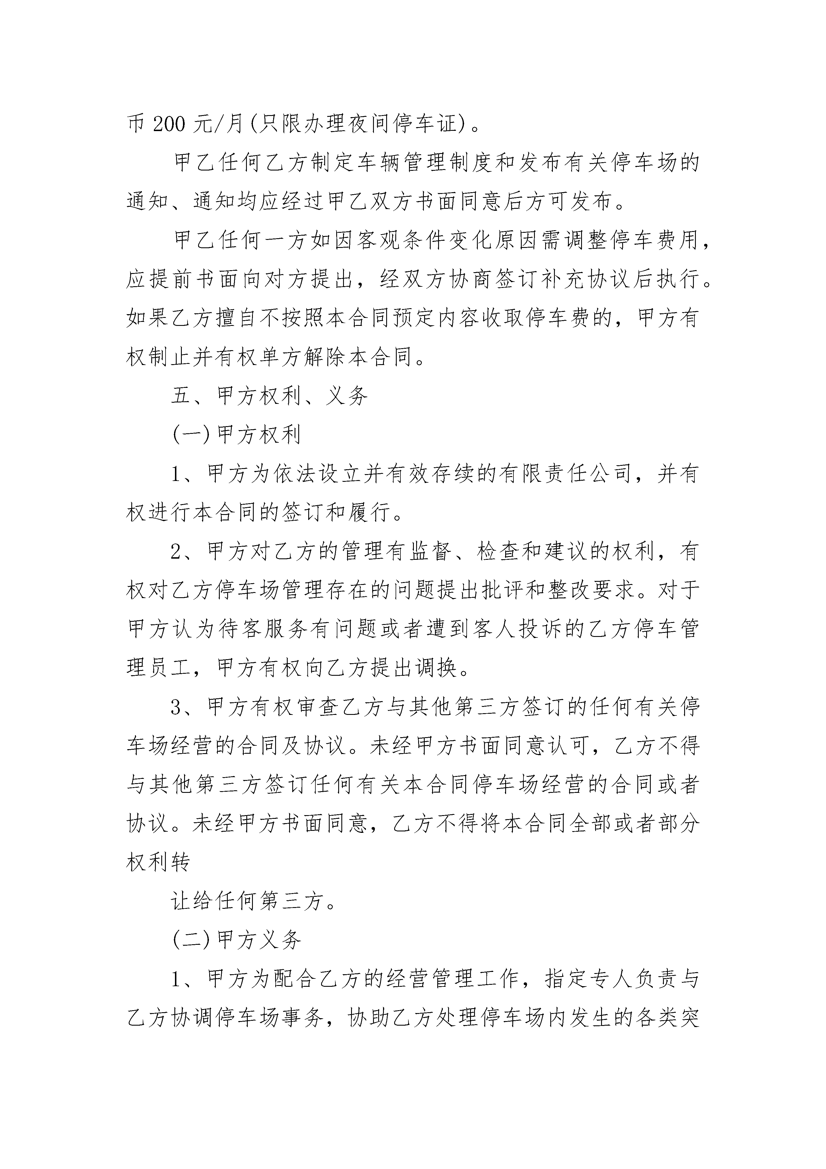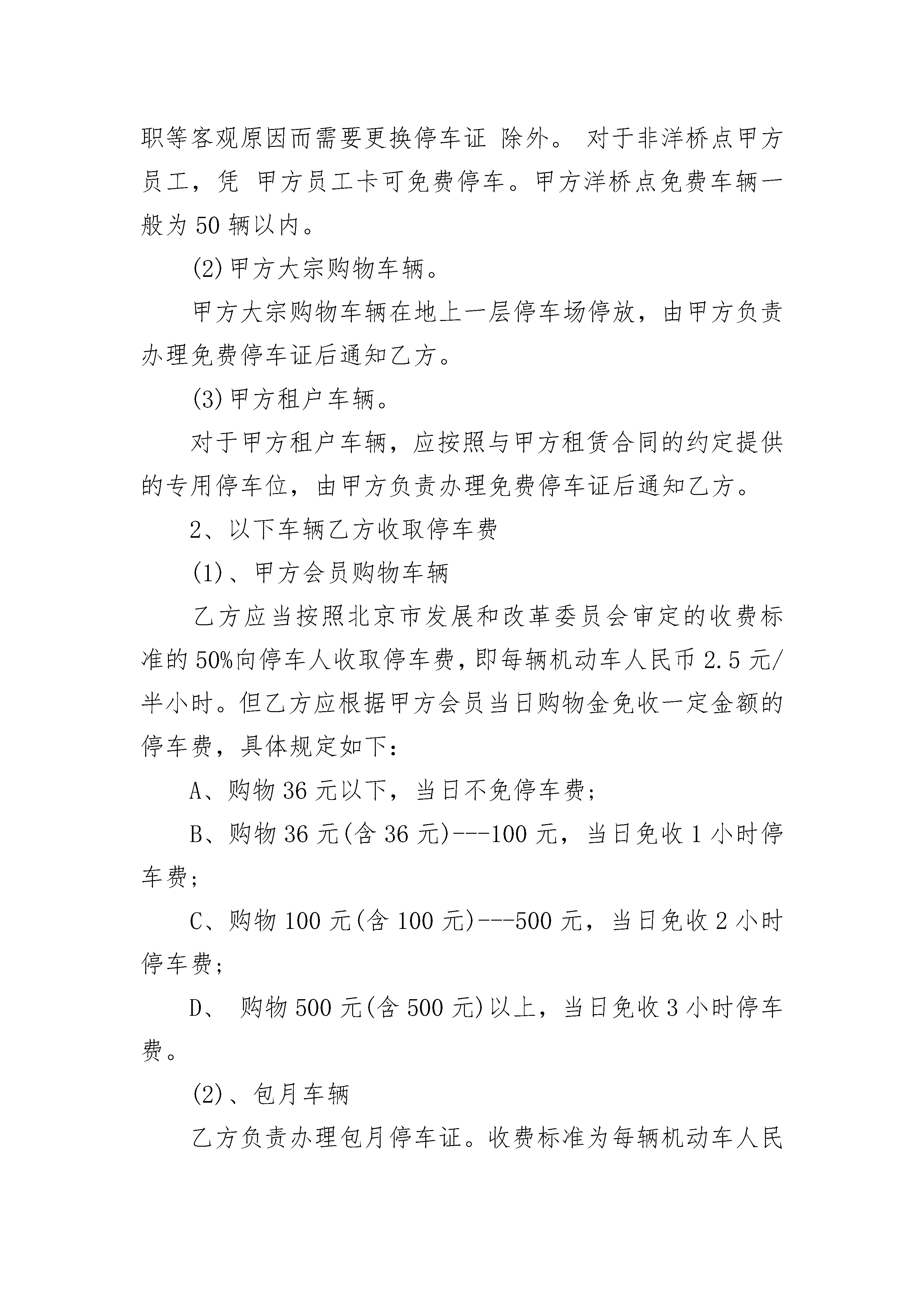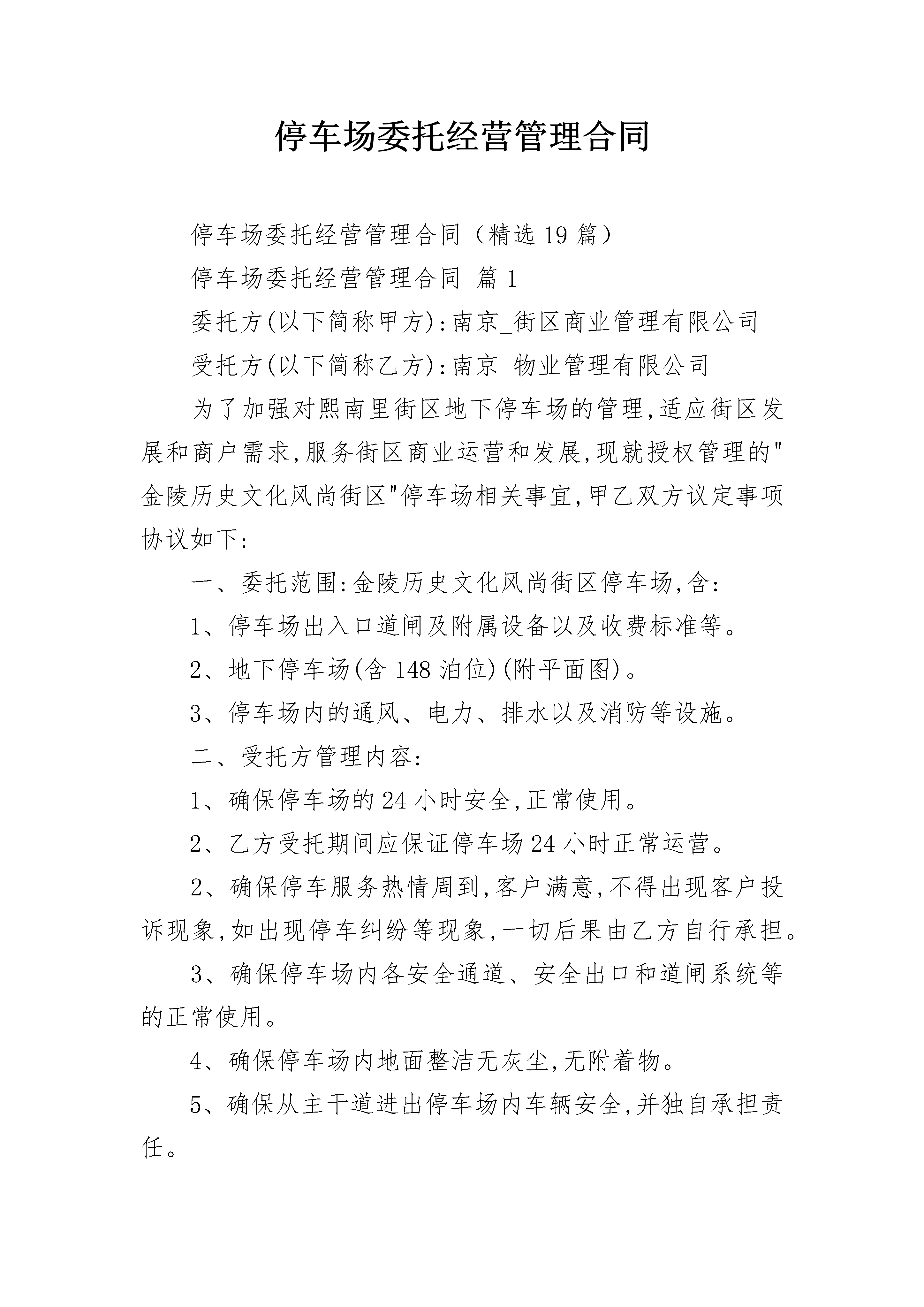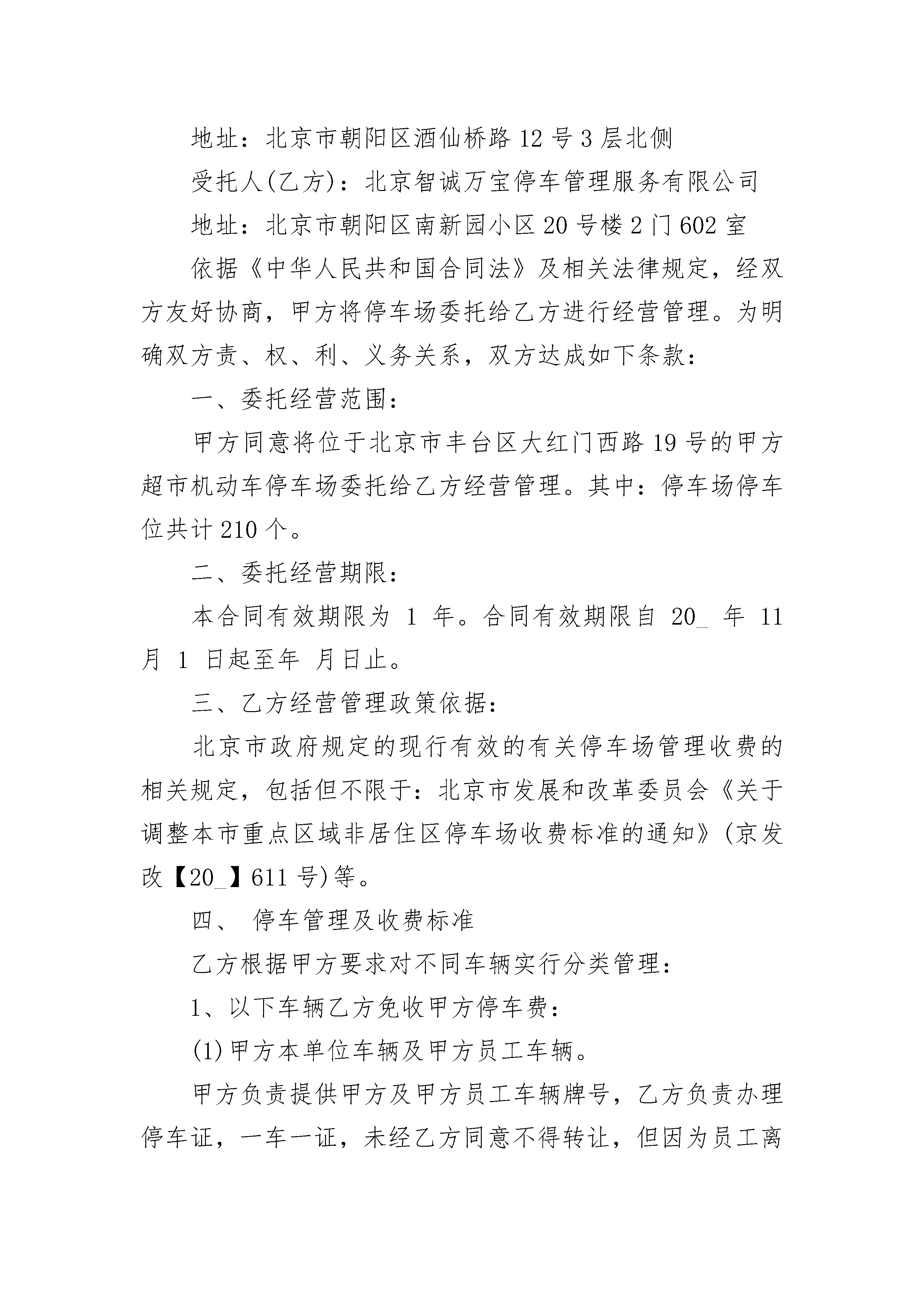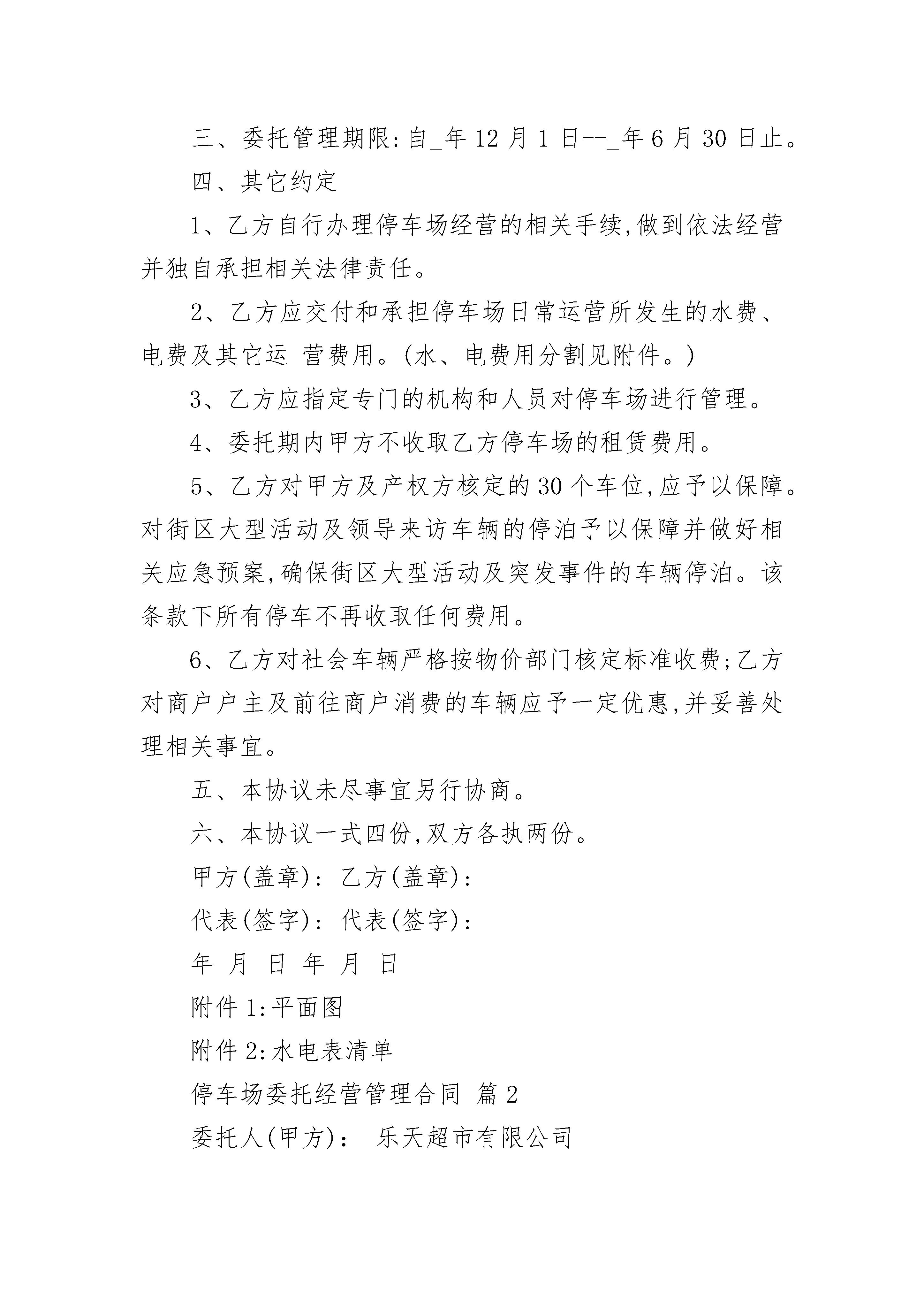 停车场委托经营管理合同停车场委托经营管理合同(精选19篇)停车场委托经营管理合同篇1委托方(以下简称甲方):南京_街区商业管理有限公司受托方(以下简称乙方):南京_物业管理有限公司为了加强对熙南里街区地下停车场的管理,适应街区发展和商户需求,服务街区商业运营和发展,现就授权管理的"金陵历史文化风尚街区"停车场相关事宜,甲乙双方议定事项协议如下:一、委托范围:金陵历史文化风尚街区停车场,含:1、停车场出入口道闸及附属设备以及收费标准等。2、地下停车场(含148泊位)(附平面图)。3、停车场内的通风、电力、排水以及消防等设施。二、受托方管理内容:1、确保停车场的24小时安全,正常使用。2、乙方受托期间应保证停车场24小时正常运营。2、确保停车服务热情周到,客户满意,不得出现客户投诉现象,如出现停车纠纷等现象,一切后果由乙方自行承担。3、确保停车场内各安全通道、安全出口和道闸系统等的正常使用。4、确保停车场内地面整洁无灰尘,无附着物。5、确保从主干道进出停车场内车辆安全,并独自承担责任。三、委托管理期限:自_年12月1日--_年6月30日止。四、其它约定1、乙方自行办理停车场经营的相关手续,做到依法经营并独自承担相关法律责任。2、乙方应交付和承担停车场日常运营所发生的水费、电费及其它运营费用。(水、电费用分割见附件。)3、乙方应指定专门的机构和人员对停车场进行管理。4、委托期内甲方不收取乙方停车场的租赁费用。5、乙方对甲方及产权方核定的30个车位,应予以保障。对街区大型活动及领导来访车辆的停泊予以保障并做好相关应急预案,确保街区大型活动及突发事件的车辆停泊。该条款下所有停车不再收取任何费用。6、乙方对社会车辆严格按物价部门核定标准收费;乙方对商户户主及前往商户消费的车辆应予一定优惠,并妥善处理相关事宜。五、本协议未尽事宜另行协商。六、本协议一式四份,双方各执两份。甲方(盖章):乙方(盖章):代表(签字):代表(签字):年月日年月日附件1:平面图附件2:水电表清单停车场委托经营管理合同篇2委托人(甲方):乐天超市有限公司地址:北京市朝阳区酒仙桥路12号3层北侧受托人(乙方):北京智诚万宝停车管理服务有限公司地址:北京市朝阳区南新园小区20号楼2门602室依据《中华人民共和国合同法》及相关法律规定,经双方友好协商,甲方将停车场委托给乙方进行经营管理。为明确双方责、权、利、义务关系,双方达成如下条款:一、委托经营范围:甲方同意将位于北京市丰台区大红门西路19号的甲方超市机动车停车场委托给乙方经营管理。其中:停车场停车位共计210个。二、委托经营期限:本合同有效期限为1年。合同有效期限自20_年11月1日起至年月日止。三、乙方经营管理政策依据:北京市政府规定的现行有效的有关停车场管理收费的相关规定,包括但不限于:北京市发展和改革委员会《关于调整本市重点区域非居住区停车场收费标准的通知》(京发改【20_】611号)等。四、停车管理及收费标准乙方根据甲方要求对不同车辆实行分类管理:1、以下车辆乙方免收甲方停车费:(1)甲方本单位车辆及甲方员工车辆。甲方负责提供甲方及甲方员工车辆牌号,乙方负责办理停车证,一车一证,未经乙方同意不得转让,但因为员工离职等客观原因而需要更换停车证除外。对于非洋桥点甲方员工,凭甲方员工卡可免费停车。甲方洋桥点免费车辆一般为50辆以内。(2)甲方大宗购物车辆。甲方大宗购物车辆在地上一层停车场停放,由甲方负责办理免费停车证后通知乙方。(3)甲方租户车辆。对于甲方租户车辆,应按照与甲方租赁合同的约定提供的专用停车位,由甲方负责办理免费停车证后通知乙方。2、以下车辆乙方收取停车费(1)、甲方会员购物车辆乙方应当按照北京市发展和改革委员会审定的收费标准的50%向停车人收取停车费,即每辆机动车人民币2.5元/半小时。但乙方应根据甲方会员当日购物金免收一定金额的停车费,具体规定如下:A、购物36元以下,当日不免停车费;B、购物36元(含36元)---100元,当日免收1小时停车费;C、购物100元(含100元)---500元,当日免收2小时停车费;D、购物500元(含500元)以上,当日免收3小时停车费。(2)、包月车辆乙方负责办理包月停车证。收费标准为每辆机动车人民币200元/月(只限办理夜间停车证)。甲乙任何乙方制定车辆管理制度和发布有关停车场的通知、通知均应经过甲乙双方书面同意后方可发布。甲乙任何一方如因客观条件变化原因需调整停车费用,应提前书面向对方提出,经双方协商签订补充协议后执行。如果乙方擅自不按照本合同预定内容收取停车费的,甲方有权制止并有权单方解除本合同。五、甲方权利、义务(一)甲方权利1、甲方为依法设立并有效存续的有限责任公司,并有权进行本合同的签订和履行。2、甲方对乙方的管理有监督、检查和建议的权利,有权对乙