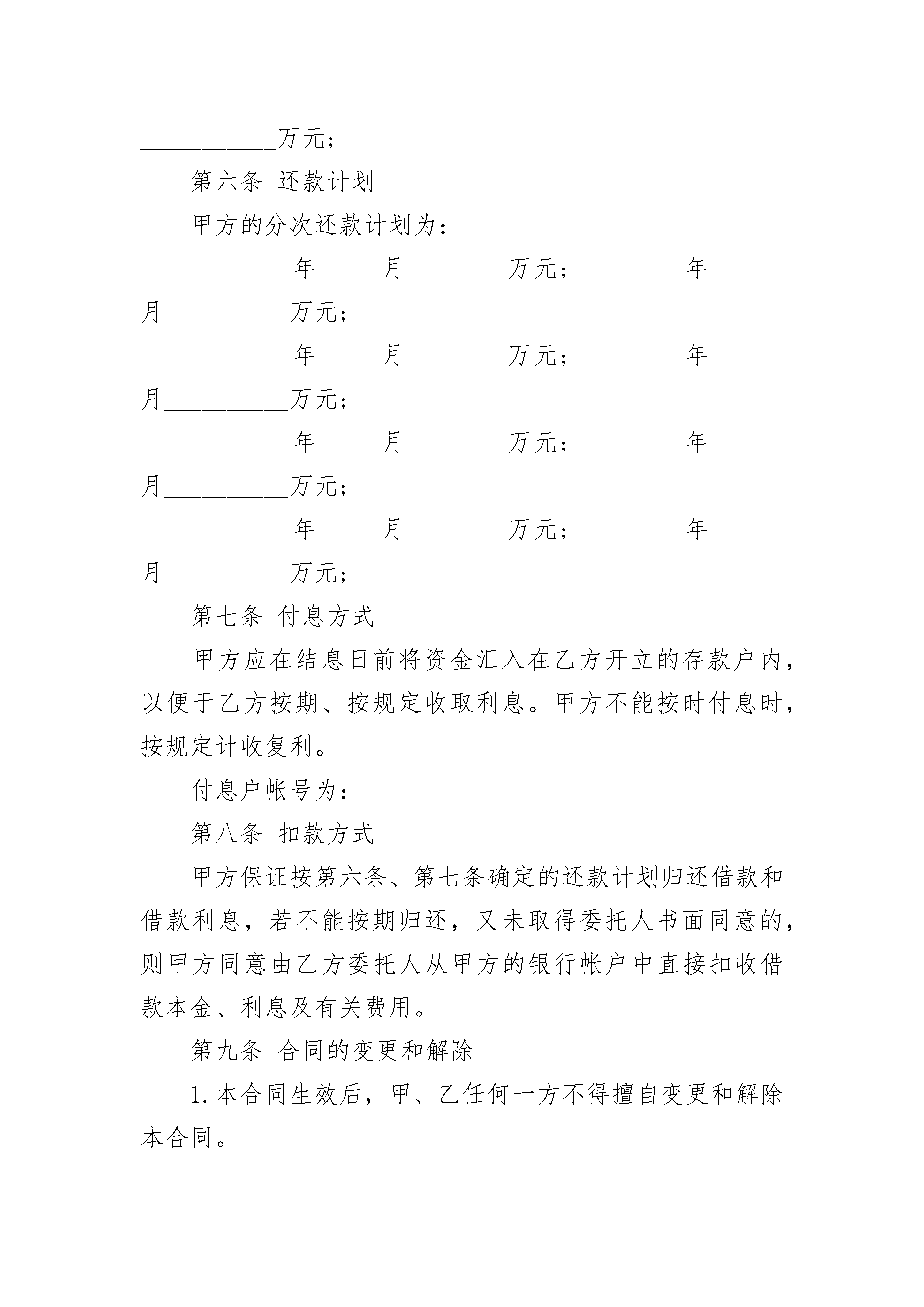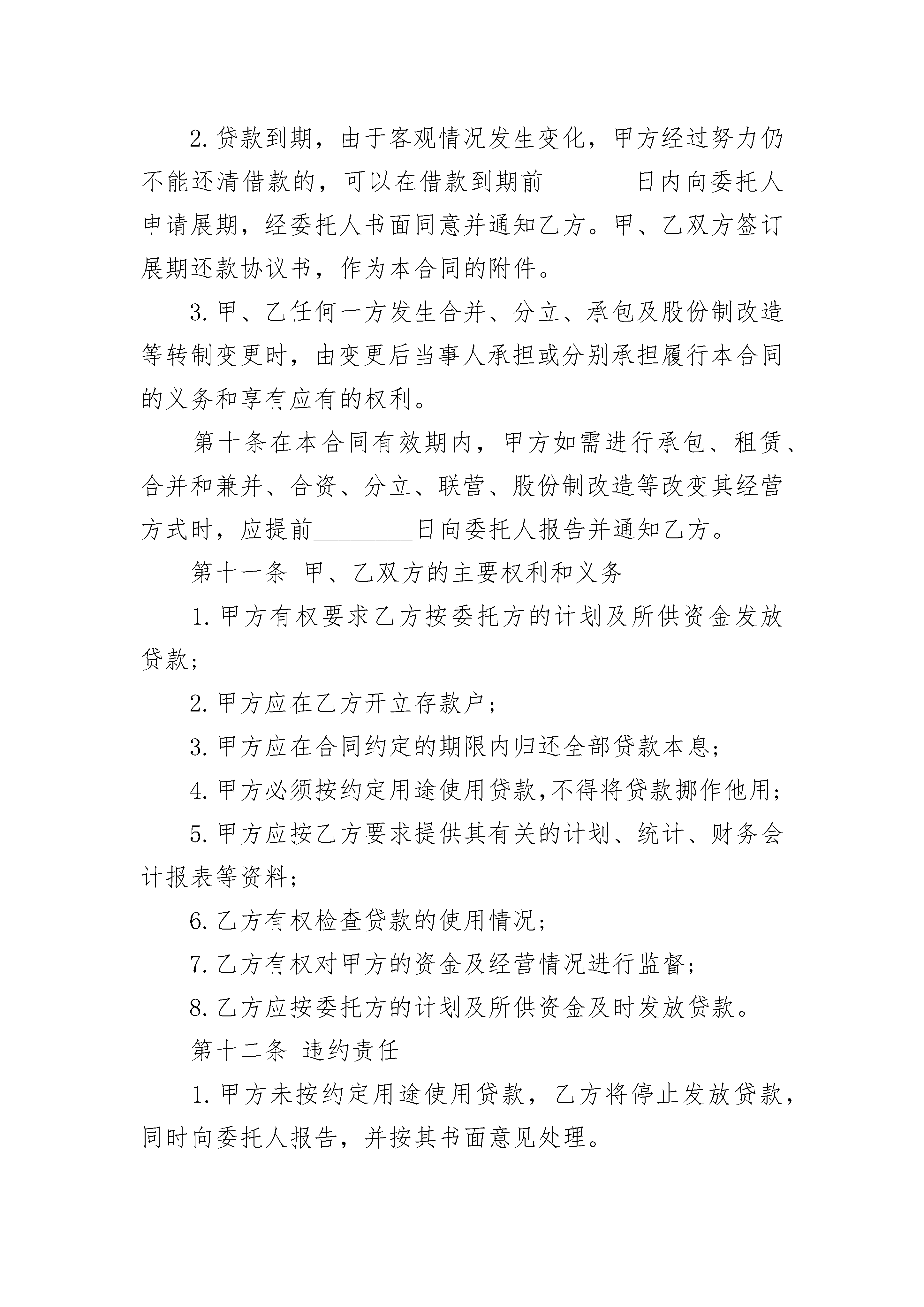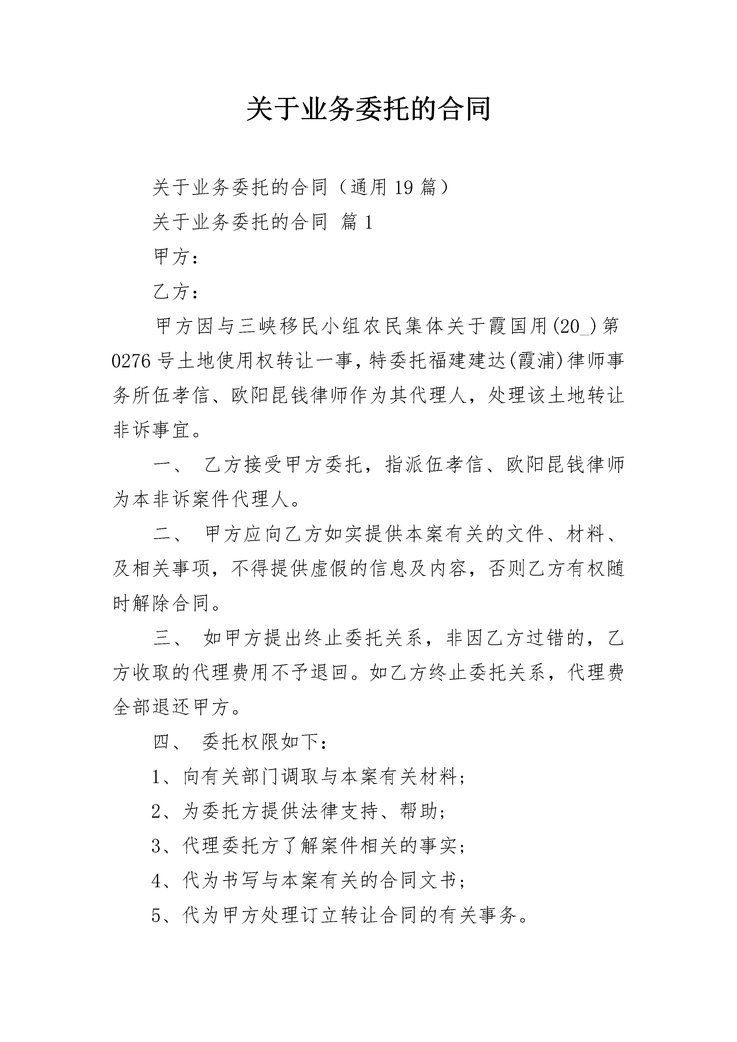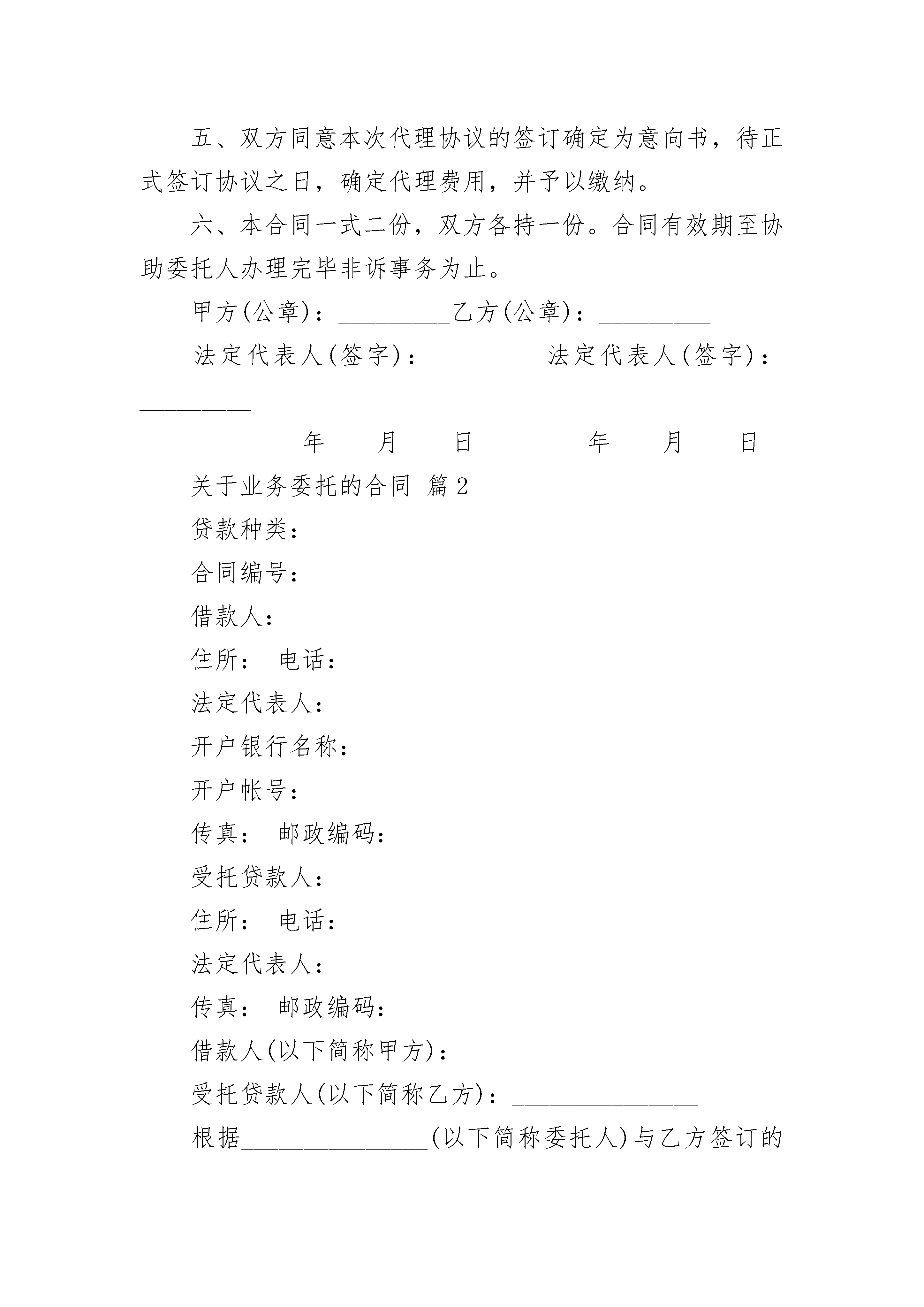 关于业务委托的合同关于业务委托的合同(通用19篇)关于业务委托的合同篇1甲方:乙方:甲方因与三峡移民小组农民集体关于霞国用(20_)第0276号土地使用权转让一事,特委托福建建达(霞浦)律师事务所伍孝信、欧阳昆钱律师作为其代理人,处理该土地转让非诉事宜。一、乙方接受甲方委托,指派伍孝信、欧阳昆钱律师为本非诉案件代理人。二、甲方应向乙方如实提供本案有关的文件、材料、及相关事项,不得提供虚假的信息及内容,否则乙方有权随时解除合同。三、如甲方提出终止委托关系,非因乙方过错的,乙方收取的代理费用不予退回。如乙方终止委托关系,代理费全部退还甲方。四、委托权限如下:1、向有关部门调取与本案有关材料;2、为委托方提供法律支持、帮助;3、代理委托方了解案件相关的事实;4、代为书写与本案有关的合同文书;5、代为甲方处理订立转让合同的有关事务。五、双方同意本次代理协议的签订确定为意向书,待正式签订协议之日,确定代理费用,并予以缴纳。六、本合同一式二份,双方各持一份。合同有效期至协助委托人办理完毕非诉事务为止。甲方(公章):_________乙方(公章):_________法定代表人(签字):_________法定代表人(签字):__________________年____月____日_________年____月____日关于业务委托的合同篇2贷款种类:合同编号:借款人:住所:电话:法定代表人:开户银行名称:开户帐号:传真:邮政编码:受托贷款人:住所:电话:法定代表人:传真:邮政编码:借款人(以下简称甲方):受托贷款人(以下简称乙方):_______________根据_______________(以下简称委托人)与乙方签订的_______________委托代理协议,由乙方代委托人向甲方发放__________贷款,并在受托范围与甲方协商后订立本合同。第一条借款金额甲方借款金额为人民币(大写)____________________。第二条借款用途甲方借款将用于____________________。第三条借款期限甲方借款期限自________年_____月_____日至________年______月_______日。第四条贷款利率和利息贷款利率按__________息__________计算,按__________结息。贷款利息自贷款转存到甲方帐户之日起计算。在合同有效期内,如委托人调整贷款利率,自利率调整之日起按调整后的利率执行。第五条用款计划甲方的分次用款计划为:________年_____月________万元;_________年_____月___________万元;________年_____月________万元;_________年_____月___________万元;________年_____月________万元;_________年_____月___________万元;________年_____月________万元;_________年_____月___________万元;第六条还款计划甲方的分次还款计划为:________年_____月________万元;_________年______月__________万元;________年_____月________万元;_________年______月__________万元;________年_____月________万元;_________年______月__________万元;________年_____月________万元;_________年______月__________万元;第七条付息方式甲方应在结息日前将资金汇入在乙方开立的存款户内,以便于乙方按期、按规定收取利息。甲方不能按时付息时,按规定计收复利。付息户帐号为:第八条扣款方式甲方保证按第六条、第七条确定的还款计划归还借款和借款利息,若不能按期归还,又未取得委托人书面同意的,则甲方同意由乙方委托人从甲方的银行帐户中直接扣收借款本金、利息及有关费用。第九条合同的变更和解除1.本合同生效后,甲、乙任何一方不得擅自变更和解除本合同。2.贷款到期,由于客观情况发生变化,甲方经过努力仍不能还清借款的,可以在借款到期前_______日内向委托人申请展期,经委托人书面同意并通知乙方。甲、乙双方签订展期还款协议书,作为本合同的附件。3.甲、乙任何一方发生合并、分立、承包及股份制改造等转制变更时,由变更后当事人承担或分别承担履行本合同的义务和享有应有的权利。第十条在本合同有效期内,甲方如需进行承包、租赁、合并和兼并、合资、分立、联营、股份制改造等改变其经营方式时,应提前________日向委托人报告并通知乙方。第十一条甲、乙双方的主要权利和义务1.甲方有权要求乙方按委托方的计划及所供资金发