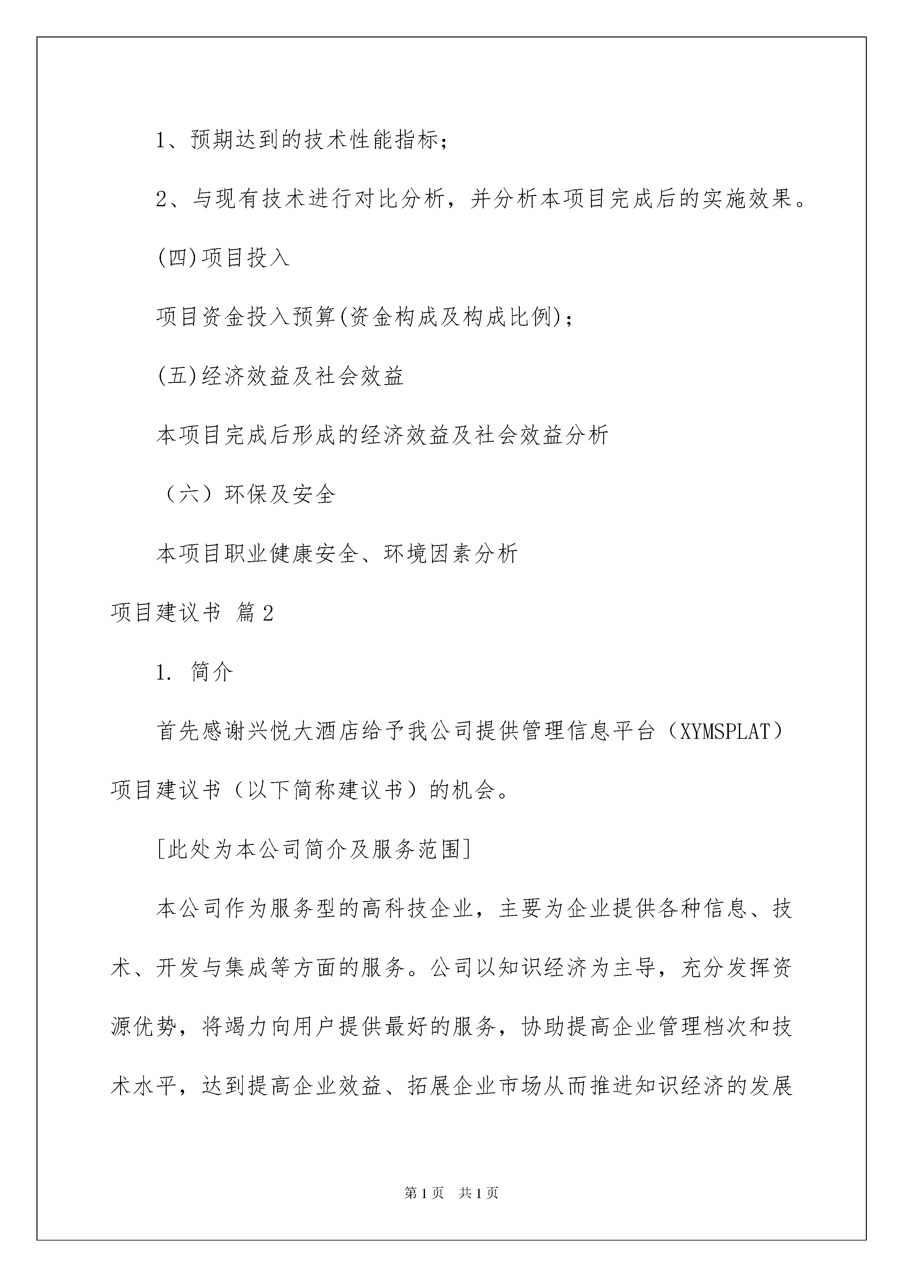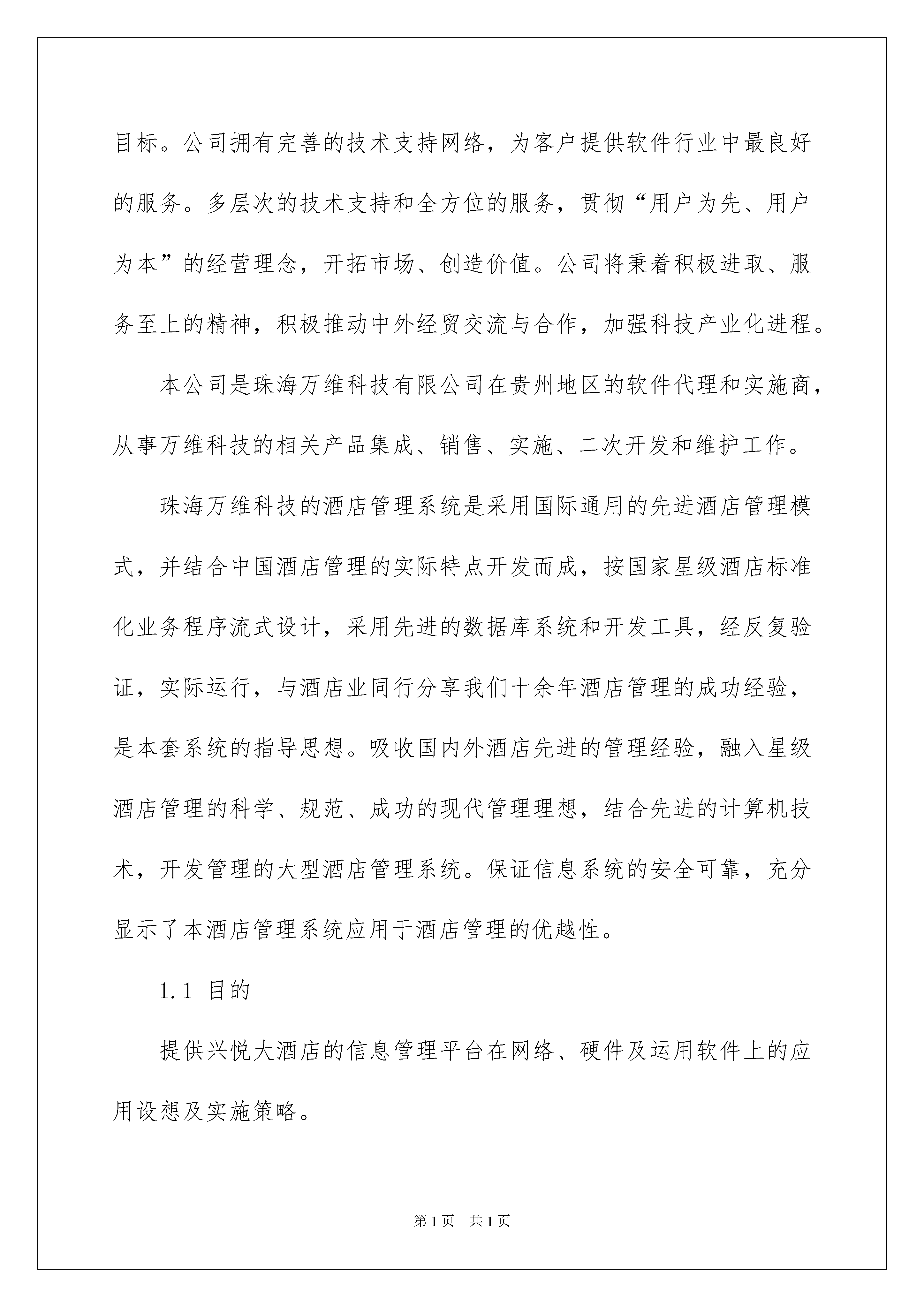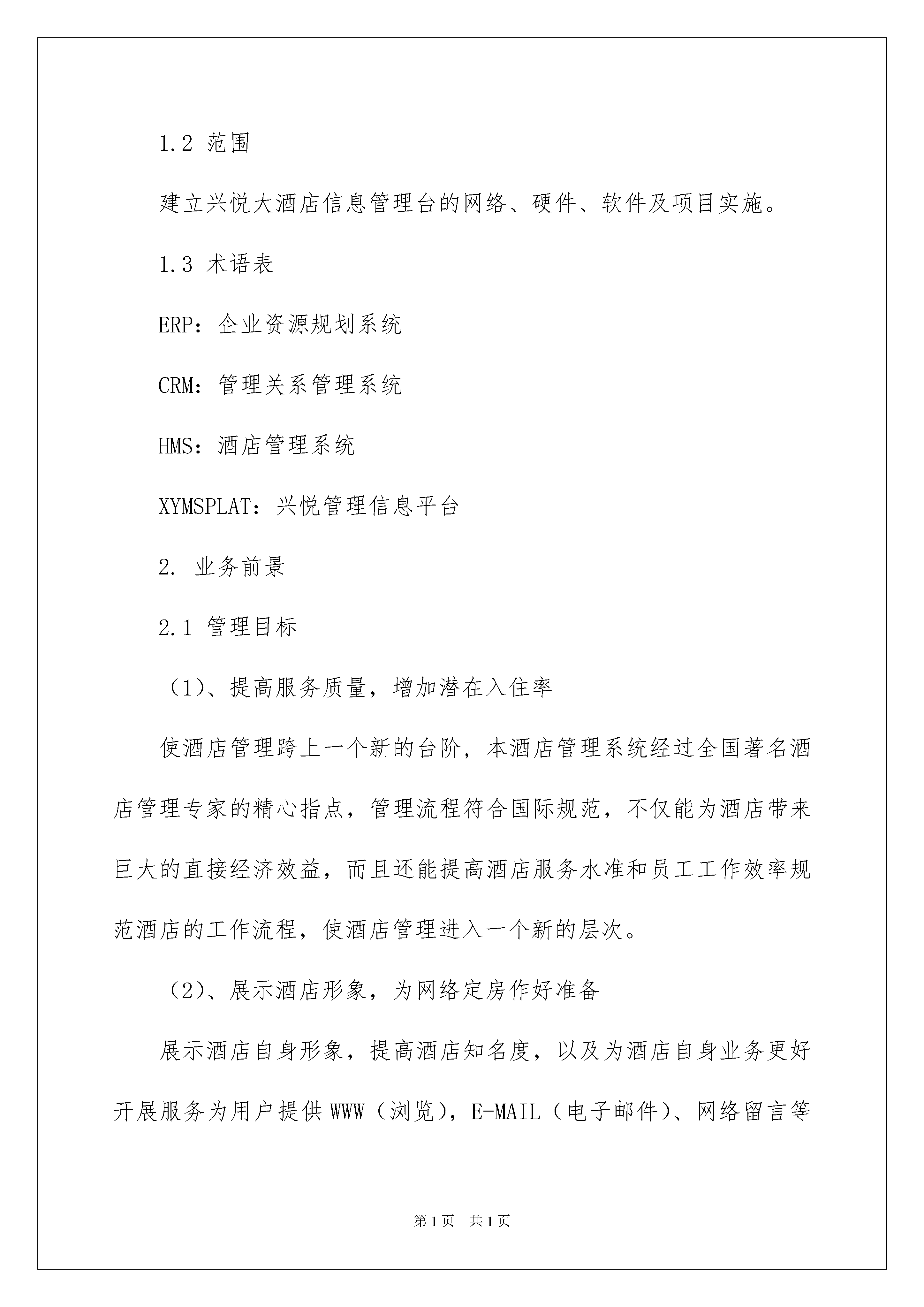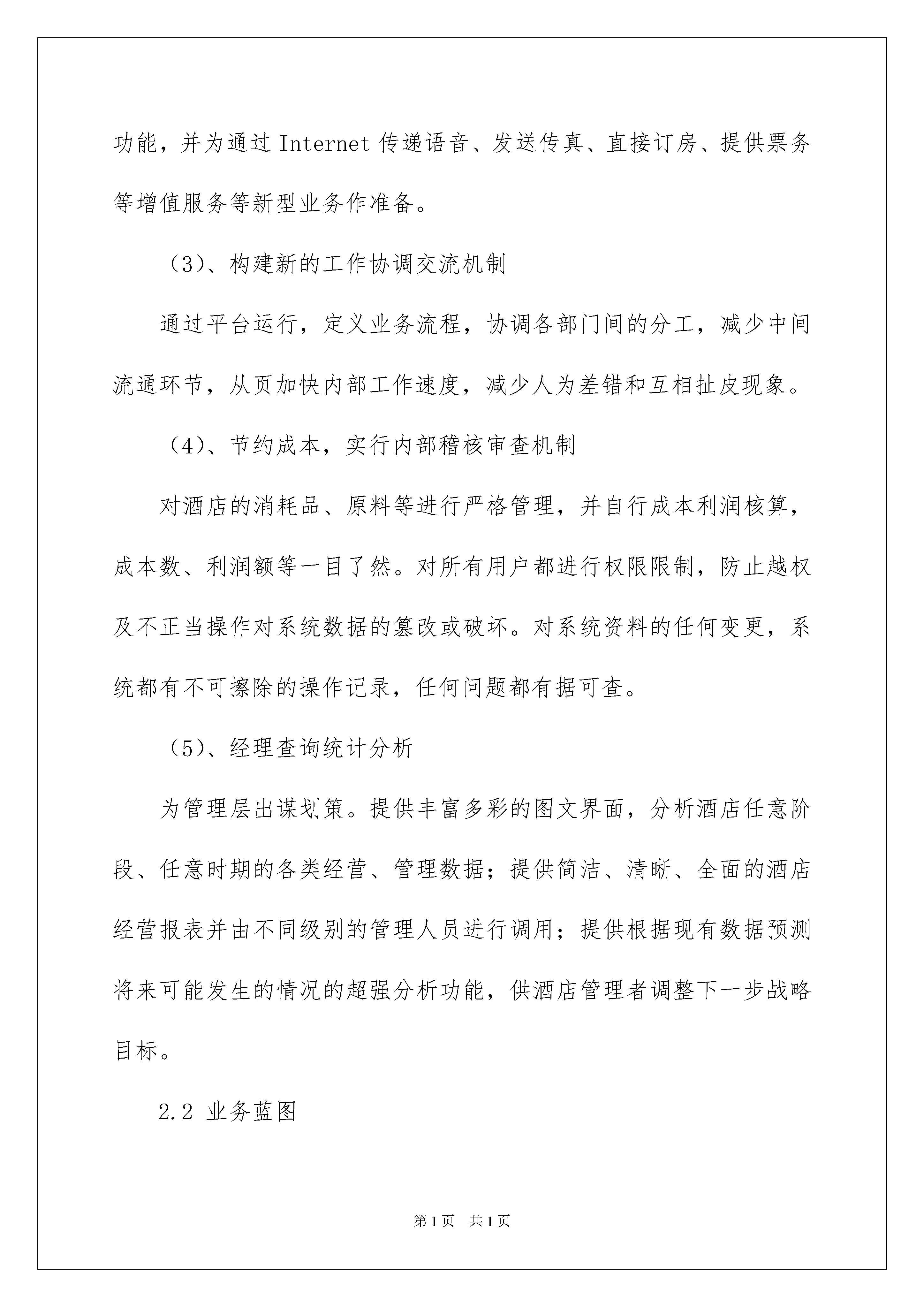 2022有关项目建议书范文集锦6篇有关项目建议书范文集锦6篇在日常生活和工作中,建议书应用范围愈来愈广泛,当建议书是面对领导和有关部门时,可以中肯地提出自己对对方工作的意见和自己的建议。来参考自己需要的建议书吧!下面是我帮大家整理的项目建议书6篇,仅供参考,大家一起来看看吧。项目建议书篇1申报单位要严格按照申报要求编写《项目立项建议书》,主要包括:(一)立项理由本项目相关技术与产品的现状、问题和本项目立项的意义(二)实施方案1、项目组成人员;2、本项目的具体内容、技术与装备特点、关键技术和关键工艺;3、实施方式(自主创新、引进消化吸收、联合创新)和技术路线;4、项目进度安排、实施期限。(三)项目考核目标和技术指标1、预期达到的技术性能指标;2、与现有技术进行对比分析,并分析本项目完成后的实施效果。(四)项目投入项目资金投入预算(资金构成及构成比例);(五)经济效益及社会效益本项目完成后形成的经济效益及社会效益分析(六)环保及安全本项目职业健康安全、环境因素分析项目建议书篇21.简介首先感谢兴悦大酒店给予我公司提供管理信息平台(XYMSPLAT)项目建议书(以下简称建议书)的机会。[此处为本公司简介及服务范围]本公司作为服务型的高科技企业,主要为企业提供各种信息、技术、开发与集成等方面的服务。公司以知识经济为主导,充分发挥资源优势,将竭力向用户提供最好的服务,协助提高企业管理档次和技术水平,达到提高企业效益、拓展企业市场从而推进知识经济的发展目标。公司拥有完善的技术支持网络,为客户提供软件行业中最良好的服务。多层次的技术支持和全方位的服务,贯彻“用户为先、用户为本”的经营理念,开拓市场、创造价值。公司将秉着积极进取、服务至上的精神,积极推动中外经贸交流与合作,加强科技产业化进程。本公司是珠海万维科技有限公司在贵州地区的软件代理和实施商,从事万维科技的相关产品集成、销售、实施、二次开发和维护工作。珠海万维科技的酒店管理系统是采用国际通用的先进酒店管理模式,并结合中国酒店管理的实际特点开发而成,按国家星级酒店标准化业务程序流式设计,采用先进的数据库系统和开发工具,经反复验证,实际运行,与酒店业同行分享我们十余年酒店管理的成功经验,是本套系统的指导思想。吸收国内外酒店先进的管理经验,融入星级酒店管理的科学、规范、成功的现代管理理想,结合先进的计算机技术,开发管理的大型酒店管理系统。保证信息系统的安全可靠,充分显示了本酒店管理系统应用于酒店管理的优越性。1.1目的提供兴悦大酒店的信息管理平台在网络、硬件及运用软件上的应用设想及实施策略。1.2范围建立兴悦大酒店信息管理台的网络、硬件、软件及项目实施。1.3术语表ERP:企业资源规划系统CRM:管理关系管理系统HMS:酒店管理系统XYMSPLAT:兴悦管理信息平台2.业务前景2.1管理目标(1)、提高服务质量,增加潜在入住率使酒店管理跨上一个新的台阶,本酒店管理系统经过全国著名酒店管理专家的精心指点,管理流程符合国际规范,不仅能为酒店带来巨大的直接经济效益,而且还能提高酒店服务水准和员工工作效率规范酒店的工作流程,使酒店管理进入一个新的层次。(2)、展示酒店形象,为网络定房作好准备展示酒店自身形象,提高酒店知名度,以及为酒店自身业务更好开展服务为用户提供WWW(浏览),E-MAIL(电子邮件)、网络留言等功能,并为通过Internet传递语音、发送传真、直接订房、提供票务等增值服务等新型业务作准备。(3)、构建新的工作协调交流机制通过平台运行,定义业务流程,协调各部门间的分工,减少中间流通环节,从页加快内部工作速度,减少人为差错和互相扯皮现象。(4)、节约成本,实行内部稽核审查机制对酒店的消耗品、原料等进行严格管理,并自行成本利润核算,成本数、利润额等一目了然。对所有用户都进行权限限制,防止越权及不正当操作对系统数据的篡改或破坏。对系统资料的任何变更,系统都有不可擦除的操作记录,任何问题都有据可查。(5)、经理查询统计分析为管理层出谋划策。提供丰富多彩的图文界面,分析酒店任意阶段、任意时期的各类经营、管理数据;提供简洁、清晰、全面的酒店经营报表并由不同级别的管理人员进行调用;提供根据现有数据预测将来可能发生的情况的超强分析功能,供酒店管理者调整下一步战略目标。2.2业务蓝图(1)、分层次服务系统按企业管理的不同层次,进行不同的管理功能,分为决策层、管理层、业务操作层和自动化模式。A、业务操作层本系统的数据采集处,做好实际工作,并按工作流程进行录入、修改数据资料。急时反馈问题,回答客户疑问,服务好客户。B、管理层各中心经理,查询、统计所