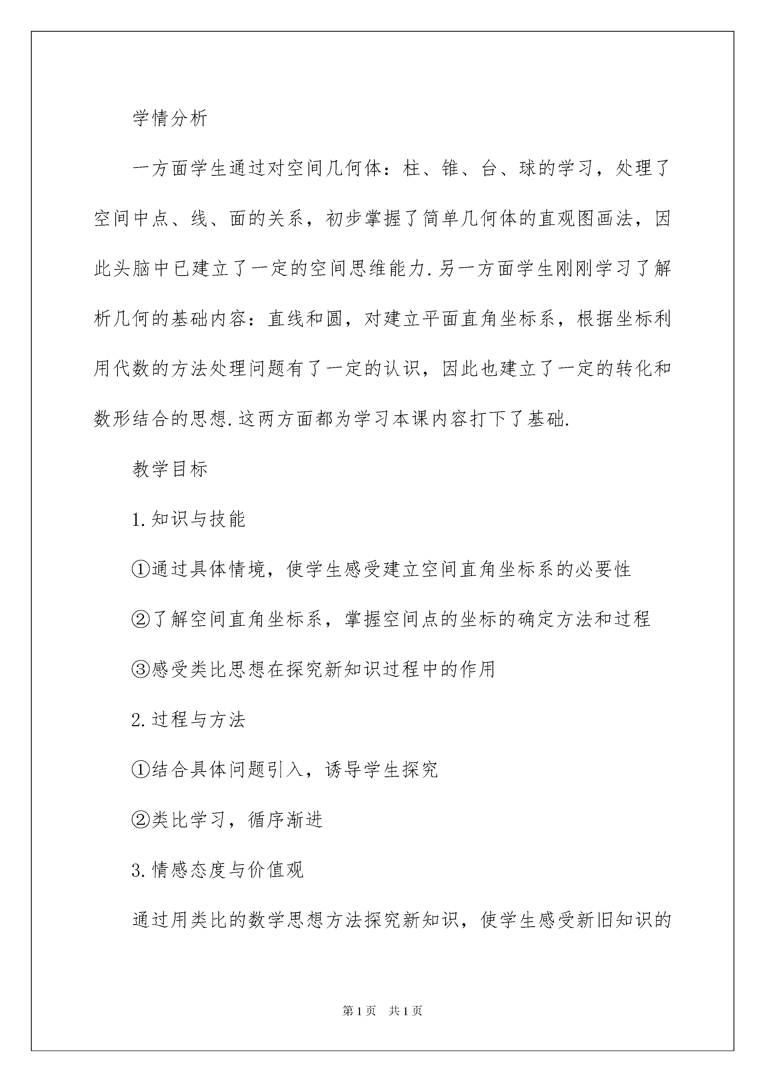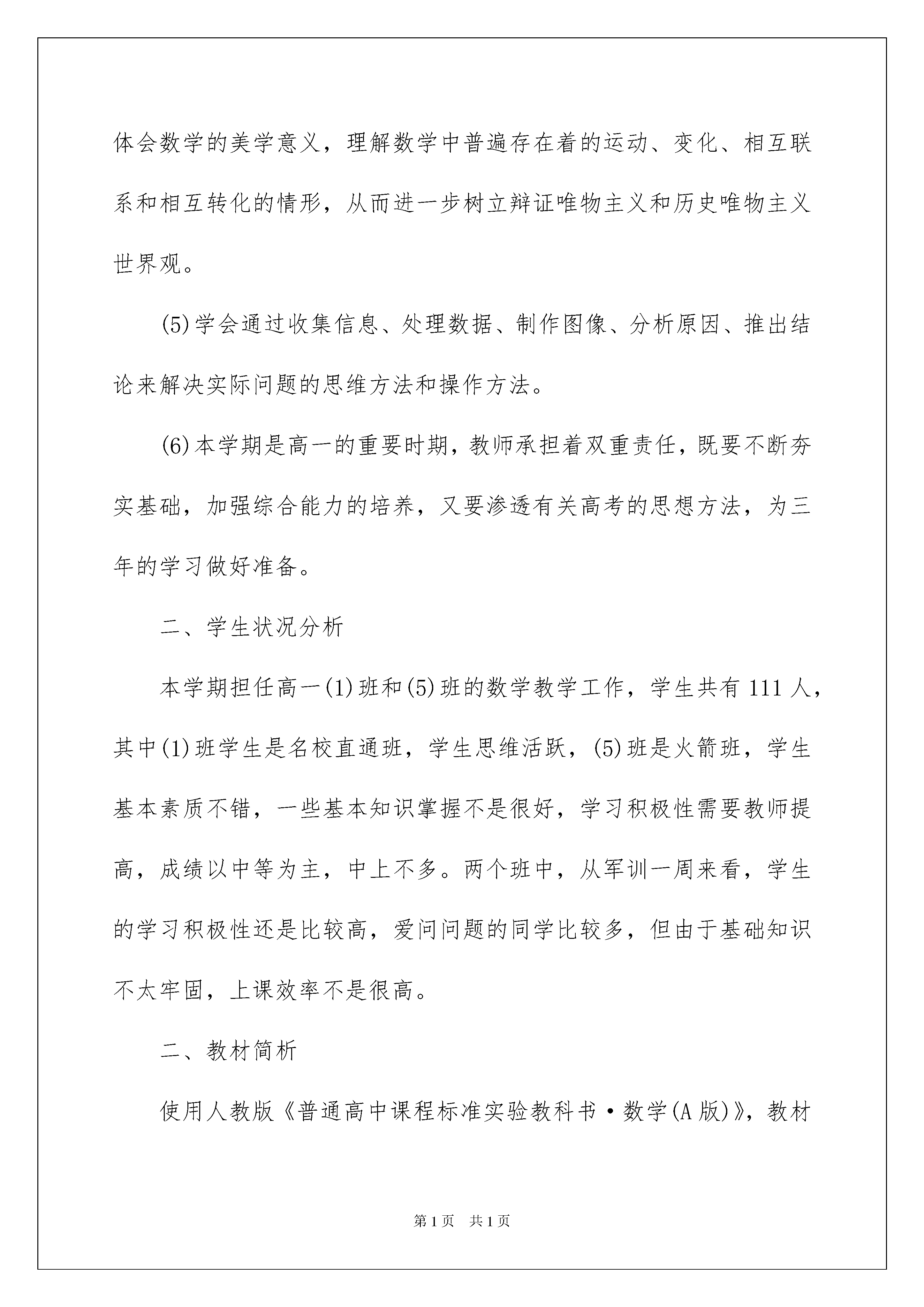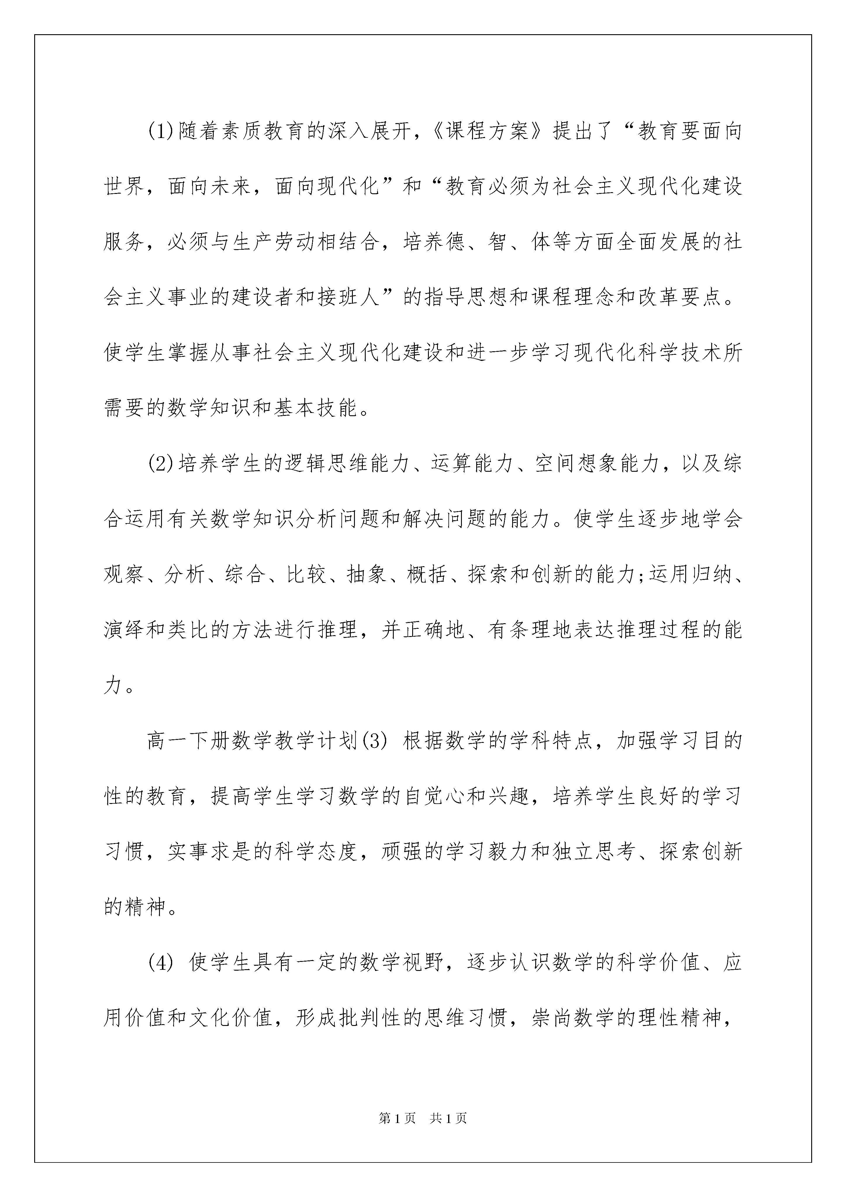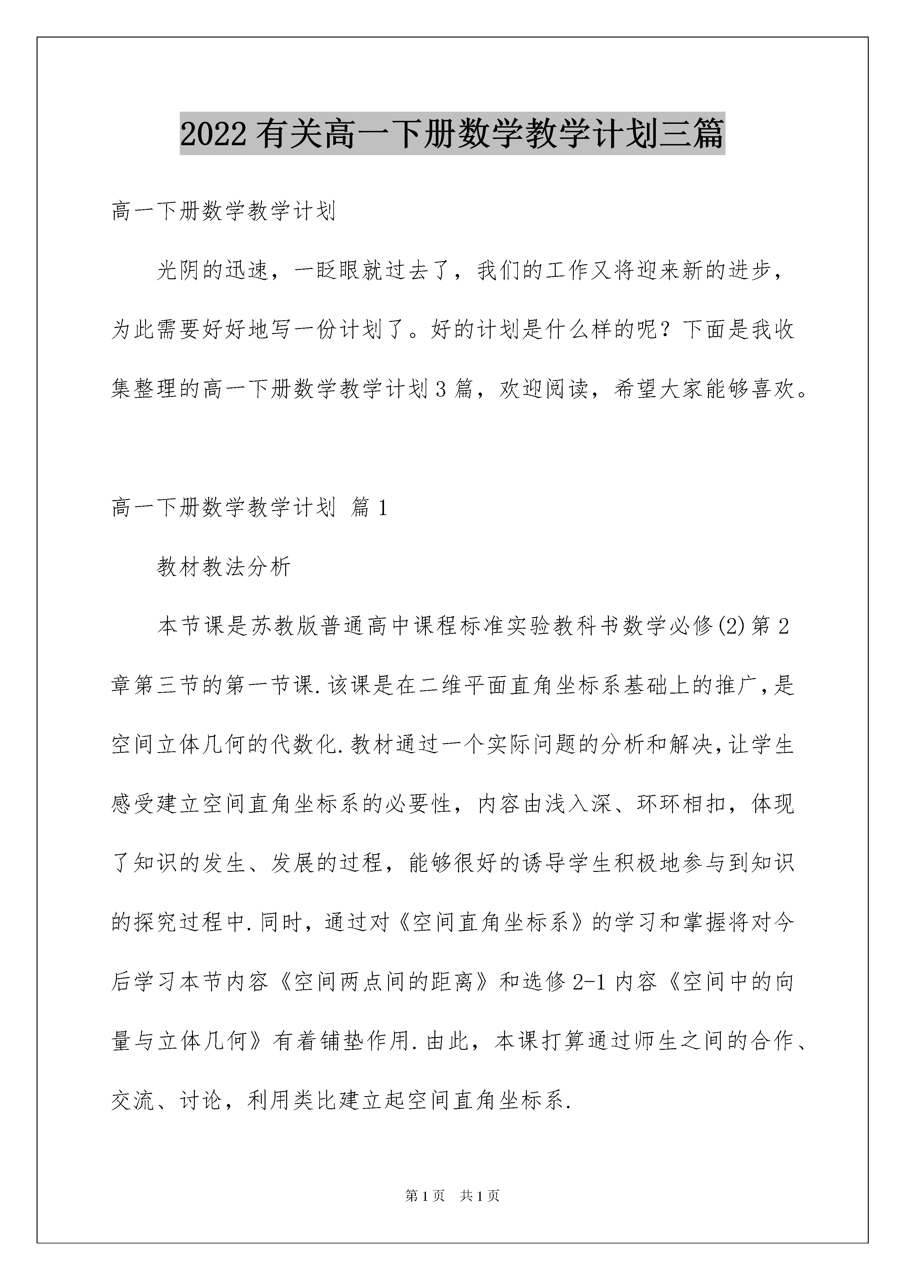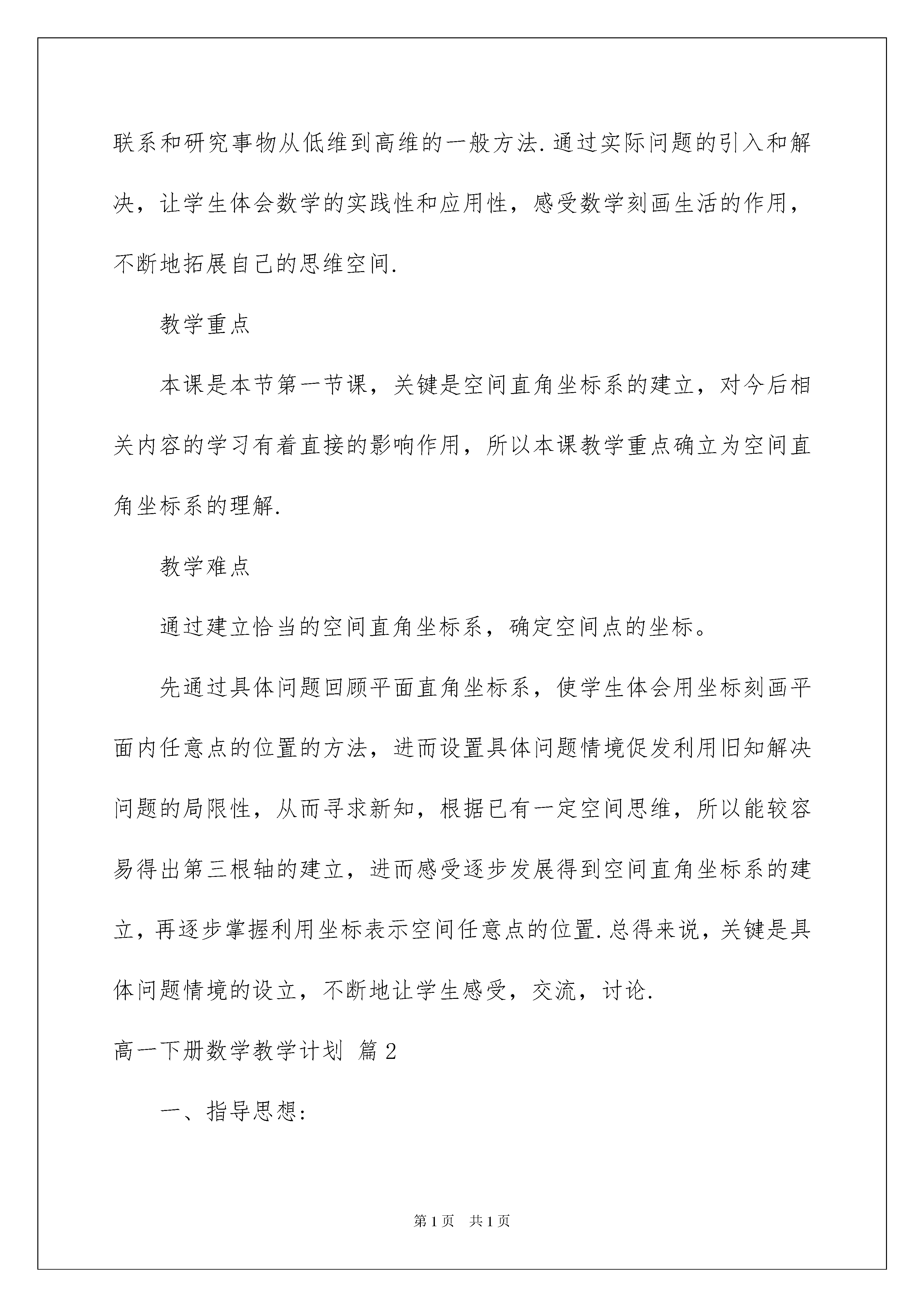 2022有关高一下册数学教学计划三篇高一下册数学教学计划光阴的迅速,一眨眼就过去了,我们的工作又将迎来新的进步,为此需要好好地写一份计划了。好的计划是什么样的呢?下面是我收集整理的高一下册数学教学计划3篇,欢迎阅读,希望大家能够喜欢。高一下册数学教学计划篇1教材教法分析本节课是苏教版普通高中课程标准实验教科书数学必修(2)第2章第三节的第一节课.该课是在二维平面直角坐标系基础上的推广,是空间立体几何的代数化.教材通过一个实际问题的分析和解决,让学生感受建立空间直角坐标系的必要性,内容由浅入深、环环相扣,体现了知识的发生、发展的过程,能够很好的诱导学生积极地参与到知识的探究过程中.同时,通过对《空间直角坐标系》的学习和掌握将对今后学习本节内容《空间两点间的距离》和选修2-1内容《空间中的向量与立体几何》有着铺垫作用.由此,本课打算通过师生之间的合作、交流、讨论,利用类比建立起空间直角坐标系.学情分析一方面学生通过对空间几何体:柱、锥、台、球的学习,处理了空间中点、线、面的关系,初步掌握了简单几何体的直观图画法,因此头脑中已建立了一定的空间思维能力.另一方面学生刚刚学习了解析几何的基础内容:直线和圆,对建立平面直角坐标系,根据坐标利用代数的方法处理问题有了一定的认识,因此也建立了一定的转化和数形结合的思想.这两方面都为学习本课内容打下了基础.教学目标1.知识与技能①通过具体情境,使学生感受建立空间直角坐标系的必要性②了解空间直角坐标系,掌握空间点的坐标的确定方法和过程③感受类比思想在探究新知识过程中的作用2.过程与方法①结合具体问题引入,诱导学生探究②类比学习,循序渐进3.情感态度与价值观通过用类比的数学思想方法探究新知识,使学生感受新旧知识的联系和研究事物从低维到高维的一般方法.通过实际问题的引入和解决,让学生体会数学的实践性和应用性,感受数学刻画生活的作用,不断地拓展自己的思维空间.教学重点本课是本节第一节课,关键是空间直角坐标系的建立,对今后相关内容的学习有着直接的影响作用,所以本课教学重点确立为空间直角坐标系的理解.教学难点通过建立恰当的空间直角坐标系,确定空间点的坐标。先通过具体问题回顾平面直角坐标系,使学生体会用坐标刻画平面内任意点的位置的方法,进而设置具体问题情境促发利用旧知解决问题的局限性,从而寻求新知,根据已有一定空间思维,所以能较容易得出第三根轴的建立,进而感受逐步发展得到空间直角坐标系的建立,再逐步掌握利用坐标表示空间任意点的位置.总得来说,关键是具体问题情境的设立,不断地让学生感受,交流,讨论.高一下册数学教学计划篇2一、指导思想:(1)随着素质教育的深入展开,《课程方案》提出了“教育要面向世界,面向未来,面向现代化”和“教育必须为社会主义现代化建设服务,必须与生产劳动相结合,培养德、智、体等方面全面发展的社会主义事业的建设者和接班人”的指导思想和课程理念和改革要点。使学生掌握从事社会主义现代化建设和进一步学习现代化科学技术所需要的数学知识和基本技能。(2)培养学生的逻辑思维能力、运算能力、空间想象能力,以及综合运用有关数学知识分析问题和解决问题的能力。使学生逐步地学会观察、分析、综合、比较、抽象、概括、探索和创新的能力;运用归纳、演绎和类比的方法进行推理,并正确地、有条理地表达推理过程的能力。高一下册数学教学计划(3)根据数学的学科特点,加强学习目的性的教育,提高学生学习数学的自觉心和兴趣,培养学生良好的学习习惯,实事求是的科学态度,顽强的学习毅力和独立思考、探索创新的精神。(4)使学生具有一定的数学视野,逐步认识数学的科学价值、应用价值和文化价值,形成批判性的思维习惯,崇尚数学的理性精神,体会数学的美学意义,理解数学中普遍存在着的运动、变化、相互联系和相互转化的情形,从而进一步树立辩证唯物主义和历史唯物主义世界观。(5)学会通过收集信息、处理数据、制作图像、分析原因、推出结论来解决实际问题的思维方法和操作方法。(6)本学期是高一的重要时期,教师承担着双重责任,既要不断夯实基础,加强综合能力的培养,又要渗透有关高考的思想方法,为三年的学习做好准备。二、学生状况分析本学期担任高一(1)班和(5)班的数学教学工作,学生共有111人,其中(1)班学生是名校直通班,学生思维活跃,(5)班是火箭班,学生基本素质不错,一些基本知识掌握不是很好,学习积极性需要教师提高,成绩以中等为主,中上不多。两个班中,从军训一周来看,学生的学习积极性还是比较高,爱问问题的同学比较多,但由于基础知识不太牢固,上课效率不是很高。二、教材简析使用人教版《普通高中课程标准实验教科书·数