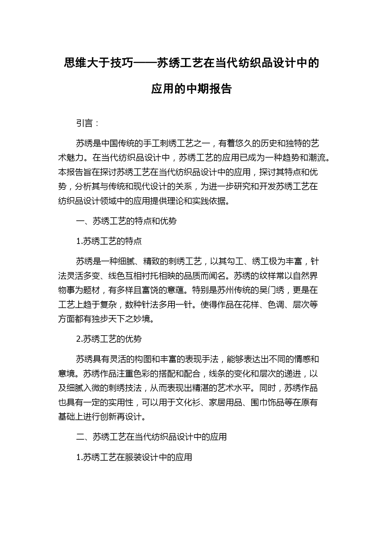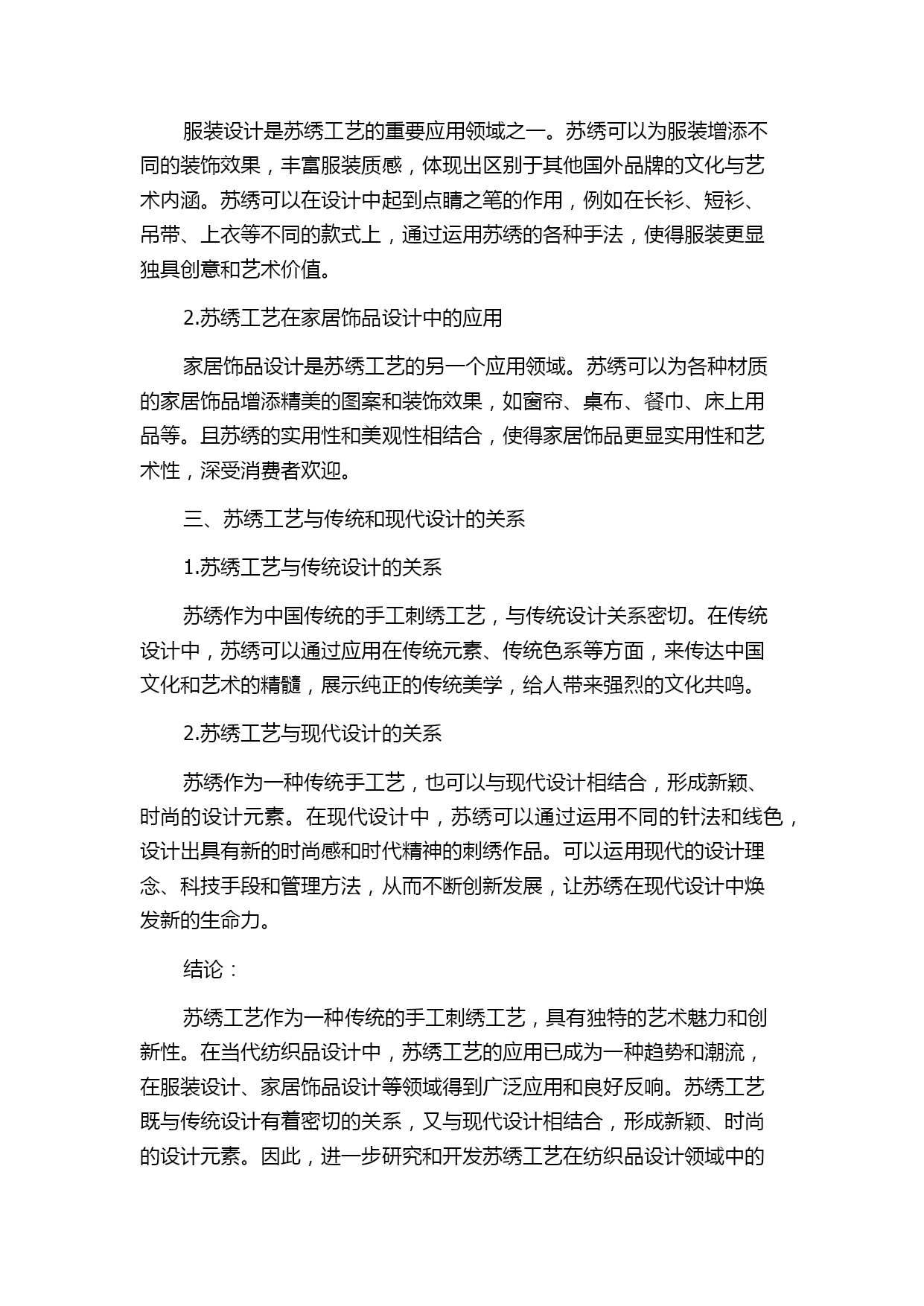 思维大于技巧——苏绣工艺在当代纺织品设计中的应用的中期报告 引言: 苏绣是中国传统的手工刺绣工艺之一,有着悠久的历史和独特的艺术魅力。在当代纺织品设计中,苏绣工艺的应用已成为一种趋势和潮流。本报告旨在探讨苏绣工艺在当代纺织品设计中的应用,探讨其特点和优势,分析其与传统和现代设计的关系,为进一步研究和开发苏绣工艺在纺织品设计领域中的应用提供理论和实践依据。 一、苏绣工艺的特点和优势 1.苏绣工艺的特点 苏绣是一种细腻、精致的刺绣工艺,以其勾工、绣工极为丰富,针法灵活多变、线色互相衬托相映的品质而闻名。苏绣的纹样常以自然界物事为题材,有多样且富饶的意蕴。特别是苏州传统的吴门绣,更是在工艺上趋于复杂,数种针法多用一针。使得作品在花样、色调、层次等方面都有独步天下之妙境。 2.苏绣工艺的优势 苏绣具有灵活的构图和丰富的表现手法,能够表达出不同的情感和意境。苏绣作品注重色彩的搭配和配合,线条的变化和层次的递进,以及细腻入微的刺绣技法,从而表现出精湛的艺术水平。同时,苏绣作品也具有一定的实用性,可以用于文化衫、家居用品、围巾饰品等在原有基础上进行创新再设计。 二、苏绣工艺在当代纺织品设计中的应用 1.苏绣工艺在服装设计中的应用 服装设计是苏绣工艺的重要应用领域之一。苏绣可以为服装增添不同的装饰效果,丰富服装质感,体现出区别于其他国外品牌的文化与艺术内涵。苏绣可以在设计中起到点睛之笔的作用,例如在长衫、短衫、吊带、上衣等不同的款式上,通过运用苏绣的各种手法,使得服装更显独具创意和艺术价值。 2.苏绣工艺在家居饰品设计中的应用 家居饰品设计是苏绣工艺的另一个应用领域。苏绣可以为各种材质的家居饰品增添精美的图案和装饰效果,如窗帘、桌布、餐巾、床上用品等。且苏绣的实用性和美观性相结合,使得家居饰品更显实用性和艺术性,深受消费者欢迎。 三、苏绣工艺与传统和现代设计的关系 1.苏绣工艺与传统设计的关系 苏绣作为中国传统的手工刺绣工艺,与传统设计关系密切。在传统设计中,苏绣可以通过应用在传统元素、传统色系等方面,来传达中国文化和艺术的精髓,展示纯正的传统美学,给人带来强烈的文化共鸣。 2.苏绣工艺与现代设计的关系 苏绣作为一种传统手工艺,也可以与现代设计相结合,形成新颖、时尚的设计元素。在现代设计中,苏绣可以通过运用不同的针法和线色,设计出具有新的时尚感和时代精神的刺绣作品。可以运用现代的设计理念、科技手段和管理方法,从而不断创新发展,让苏绣在现代设计中焕发新的生命力。 结论: 苏绣工艺作为一种传统的手工刺绣工艺,具有独特的艺术魅力和创新性。在当代纺织品设计中,苏绣工艺的应用已成为一种趋势和潮流,在服装设计、家居饰品设计等领域得到广泛应用和良好反响。苏绣工艺既与传统设计有着密切的关系,又与现代设计相结合,形成新颖、时尚的设计元素。因此,进一步研究和开发苏绣工艺在纺织品设计领域中的应用,具有重要的理论和实践价值,有助于推动中国传统手工艺的创新转型,并提升中国纺织品设计水平。