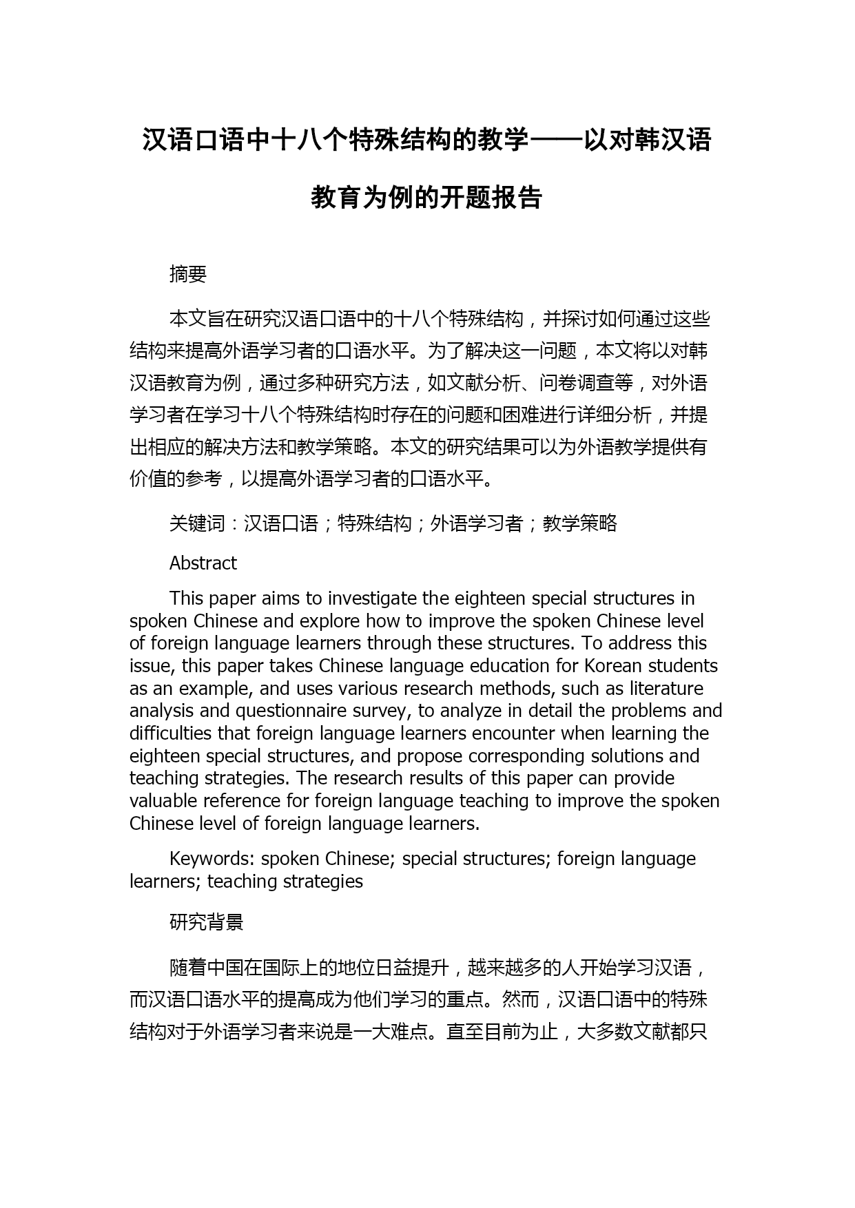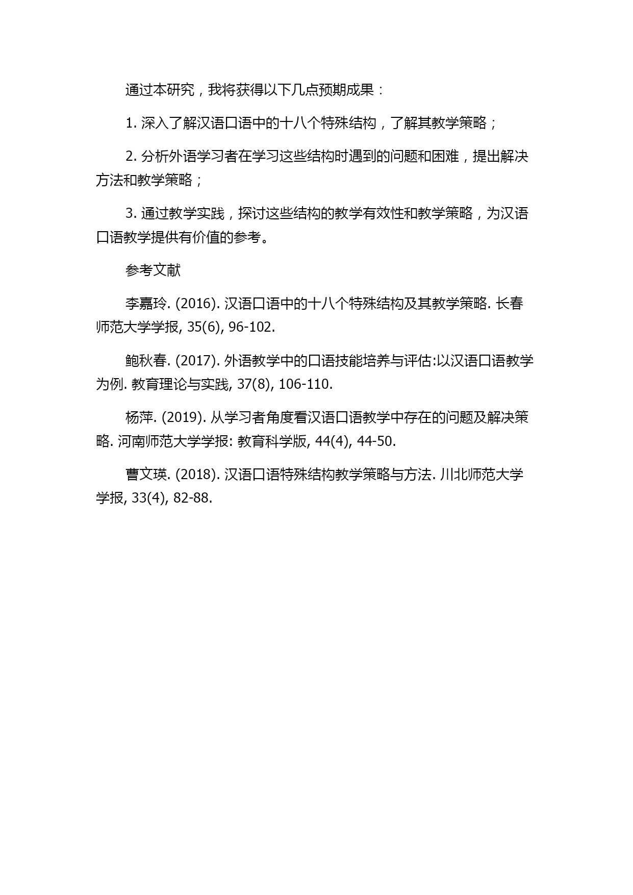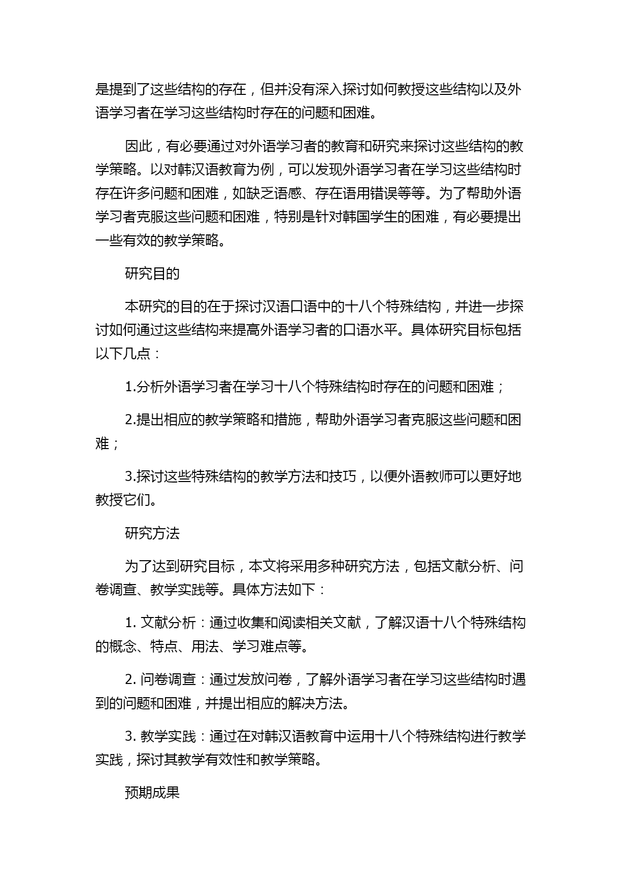 汉语口语中十八个特殊结构的教学——以对韩汉语教育为例的开题报告 摘要 本文旨在研究汉语口语中的十八个特殊结构,并探讨如何通过这些结构来提高外语学习者的口语水平。为了解决这一问题,本文将以对韩汉语教育为例,通过多种研究方法,如文献分析、问卷调查等,对外语学习者在学习十八个特殊结构时存在的问题和困难进行详细分析,并提出相应的解决方法和教学策略。本文的研究结果可以为外语教学提供有价值的参考,以提高外语学习者的口语水平。 关键词:汉语口语;特殊结构;外语学习者;教学策略 Abstract ThispaperaimstoinvestigatetheeighteenspecialstructuresinspokenChineseandexplorehowtoimprovethespokenChineselevelofforeignlanguagelearnersthroughthesestructures.Toaddressthisissue,thispapertakesChineselanguageeducationforKoreanstudentsasanexample,andusesvariousresearchmethods,suchasliteratureanalysisandquestionnairesurvey,toanalyzeindetailtheproblemsanddifficultiesthatforeignlanguagelearnersencounterwhenlearningtheeighteenspecialstructures,andproposecorrespondingsolutionsandteachingstrategies.TheresearchresultsofthispapercanprovidevaluablereferenceforforeignlanguageteachingtoimprovethespokenChineselevelofforeignlanguagelearners. Keywords:spokenChinese;specialstructures;foreignlanguagelearners;teachingstrategies 研究背景 随着中国在国际上的地位日益提升,越来越多的人开始学习汉语,而汉语口语水平的提高成为他们学习的重点。然而,汉语口语中的特殊结构对于外语学习者来说是一大难点。直至目前为止,大多数文献都只是提到了这些结构的存在,但并没有深入探讨如何教授这些结构以及外语学习者在学习这些结构时存在的问题和困难。 因此,有必要通过对外语学习者的教育和研究来探讨这些结构的教学策略。以对韩汉语教育为例,可以发现外语学习者在学习这些结构时存在许多问题和困难,如缺乏语感、存在语用错误等等。为了帮助外语学习者克服这些问题和困难,特别是针对韩国学生的困难,有必要提出一些有效的教学策略。 研究目的 本研究的目的在于探讨汉语口语中的十八个特殊结构,并进一步探讨如何通过这些结构来提高外语学习者的口语水平。具体研究目标包括以下几点: 1.分析外语学习者在学习十八个特殊结构时存在的问题和困难; 2.提出相应的教学策略和措施,帮助外语学习者克服这些问题和困难; 3.探讨这些特殊结构的教学方法和技巧,以便外语教师可以更好地教授它们。 研究方法 为了达到研究目标,本文将采用多种研究方法,包括文献分析、问卷调查、教学实践等。具体方法如下: 1.文献分析:通过收集和阅读相关文献,了解汉语十八个特殊结构的概念、特点、用法、学习难点等。 2.问卷调查:通过发放问卷,了解外语学习者在学习这些结构时遇到的问题和困难,并提出相应的解决方法。 3.教学实践:通过在对韩汉语教育中运用十八个特殊结构进行教学实践,探讨其教学有效性和教学策略。 预期成果 通过本研究,我将获得以下几点预期成果: 1.深入了解汉语口语中的十八个特殊结构,了解其教学策略; 2.分析外语学习者在学习这些结构时遇到的问题和困难,提出解决方法和教学策略; 3.通过教学实践,探讨这些结构的教学有效性和教学策略,为汉语口语教学提供有价值的参考。 参考文献 李嘉玲.(2016).汉语口语中的十八个特殊结构及其教学策略.长春师范大学学报,35(6),96-102. 鲍秋春.(2017).外语教学中的口语技能培养与评估:以汉语口语教学为例.教育理论与实践,37(8),106-110. 杨萍.(2019).从学习者角度看汉语口语教学中存在的问题及解决策略.河南师范大学学报:教育科学版,44(4),44-50. 曹文瑛.(2018).汉语口语特殊结构教学策略与方法.川北师范大学学报,33(4),82-88.