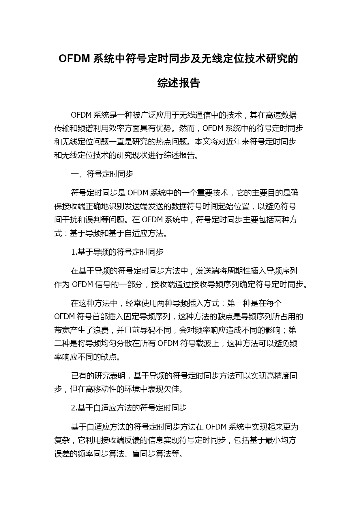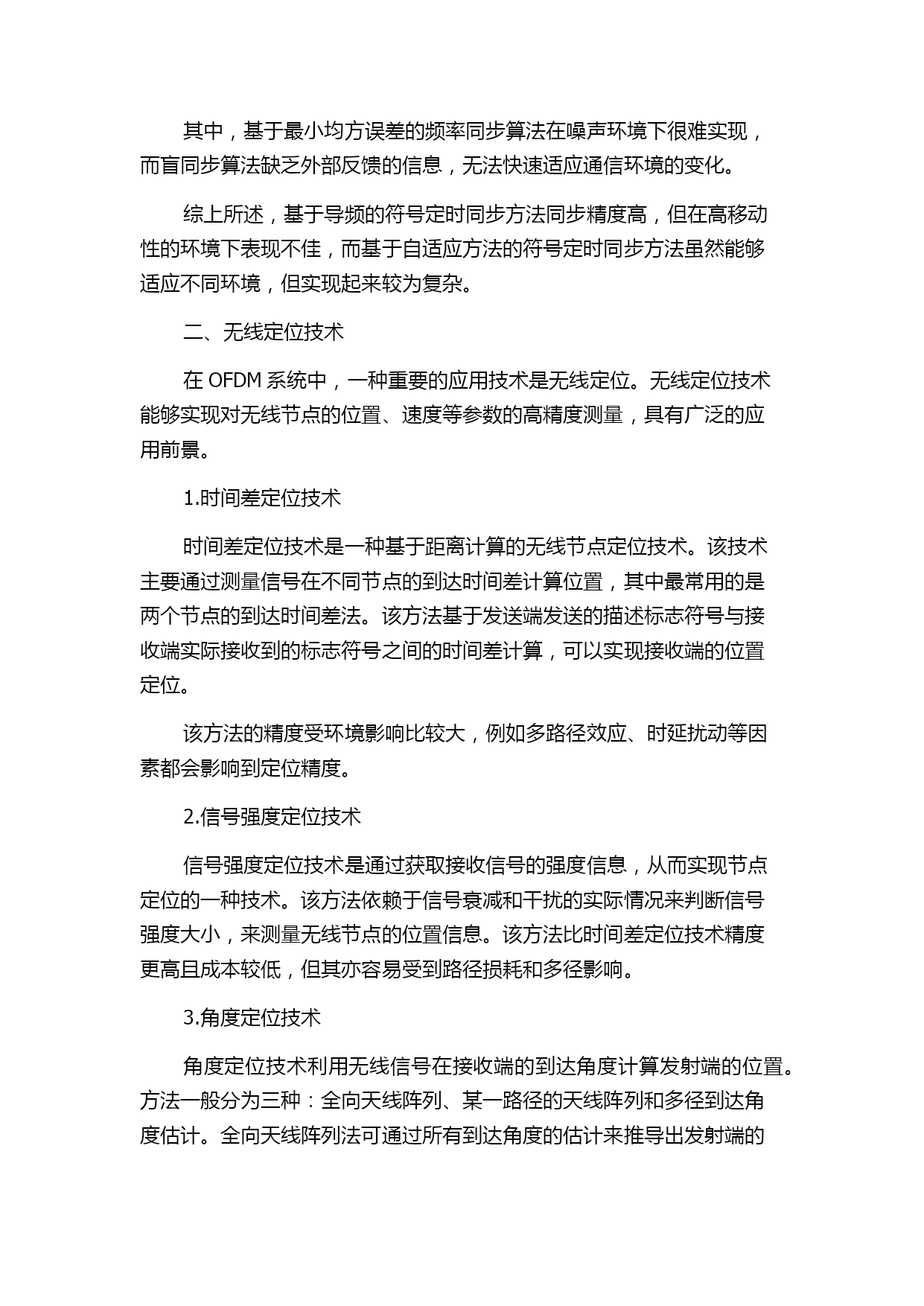 OFDM系统中符号定时同步及无线定位技术研究的综述报告 OFDM系统是一种被广泛应用于无线通信中的技术,其在高速数据传输和频谱利用效率方面具有优势。然而,OFDM系统中的符号定时同步和无线定位问题一直是研究的热点问题。本文将对近年来符号定时同步和无线定位技术的研究现状进行综述报告。 一、符号定时同步 符号定时同步是OFDM系统中的一个重要技术,它的主要目的是确保接收端正确地识别发送端发送的数据符号时间起始位置,以避免符号间干扰和误判等问题。在OFDM系统中,符号定时同步主要包括两种方式:基于导频和基于自适应方法。 1.基于导频的符号定时同步 在基于导频的符号定时同步方法中,发送端将周期性插入导频序列作为OFDM信号的一部分,接收端通过接收导频序列确定符号定时同步。 在这种方法中,经常使用两种导频插入方式:第一种是在每个OFDM符号首部插入固定导频序列,这种方法的缺点是导频序列所占用的带宽产生了浪费,并且前导码不同,会对频率响应造成不同的影响;第二种是将导频均匀分散在所有OFDM符号载波上,这种方法可以避免频率响应不同的缺点。 已有的研究表明,基于导频的符号定时同步方法可以实现高精度同步,但在高移动性的环境中表现欠佳。 2.基于自适应方法的符号定时同步 基于自适应方法的符号定时同步方法在OFDM系统中实现起来更为复杂,它利用接收端反馈的信息实现符号定时同步,包括基于最小均方误差的频率同步算法、盲同步算法等。 其中,基于最小均方误差的频率同步算法在噪声环境下很难实现,而盲同步算法缺乏外部反馈的信息,无法快速适应通信环境的变化。 综上所述,基于导频的符号定时同步方法同步精度高,但在高移动性的环境下表现不佳,而基于自适应方法的符号定时同步方法虽然能够适应不同环境,但实现起来较为复杂。 二、无线定位技术 在OFDM系统中,一种重要的应用技术是无线定位。无线定位技术能够实现对无线节点的位置、速度等参数的高精度测量,具有广泛的应用前景。 1.时间差定位技术 时间差定位技术是一种基于距离计算的无线节点定位技术。该技术主要通过测量信号在不同节点的到达时间差计算位置,其中最常用的是两个节点的到达时间差法。该方法基于发送端发送的描述标志符号与接收端实际接收到的标志符号之间的时间差计算,可以实现接收端的位置定位。 该方法的精度受环境影响比较大,例如多路径效应、时延扰动等因素都会影响到定位精度。 2.信号强度定位技术 信号强度定位技术是通过获取接收信号的强度信息,从而实现节点定位的一种技术。该方法依赖于信号衰减和干扰的实际情况来判断信号强度大小,来测量无线节点的位置信息。该方法比时间差定位技术精度更高且成本较低,但其亦容易受到路径损耗和多径影响。 3.角度定位技术 角度定位技术利用无线信号在接收端的到达角度计算发射端的位置。方法一般分为三种:全向天线阵列、某一路径的天线阵列和多径到达角度估计。全向天线阵列法可通过所有到达角度的估计来推导出发射端的坐标。多径到达角度估计法考虑到信号在多个传输路径上到达的情况,以提高定位精度。 结论 总体来看,符号定时同步和无线定位技术在OFDM系统中的实现都具有很大的难度。不同的方法和算法也都有各自的缺点。因此,未来的研究方向应在提高算法优化和技术革新方面持续努力,以实现更高精度和更可靠的OFDM系统数据传输。