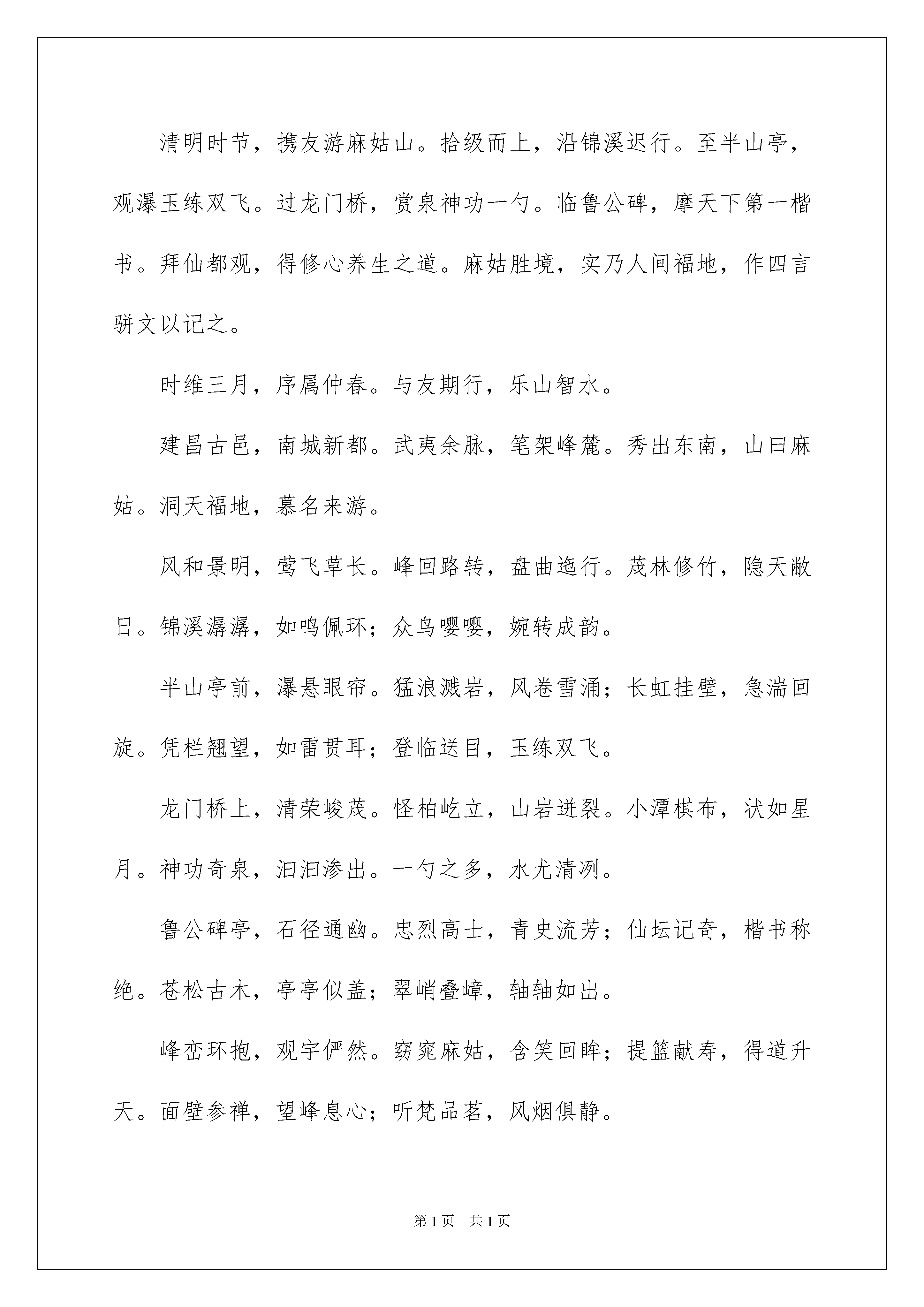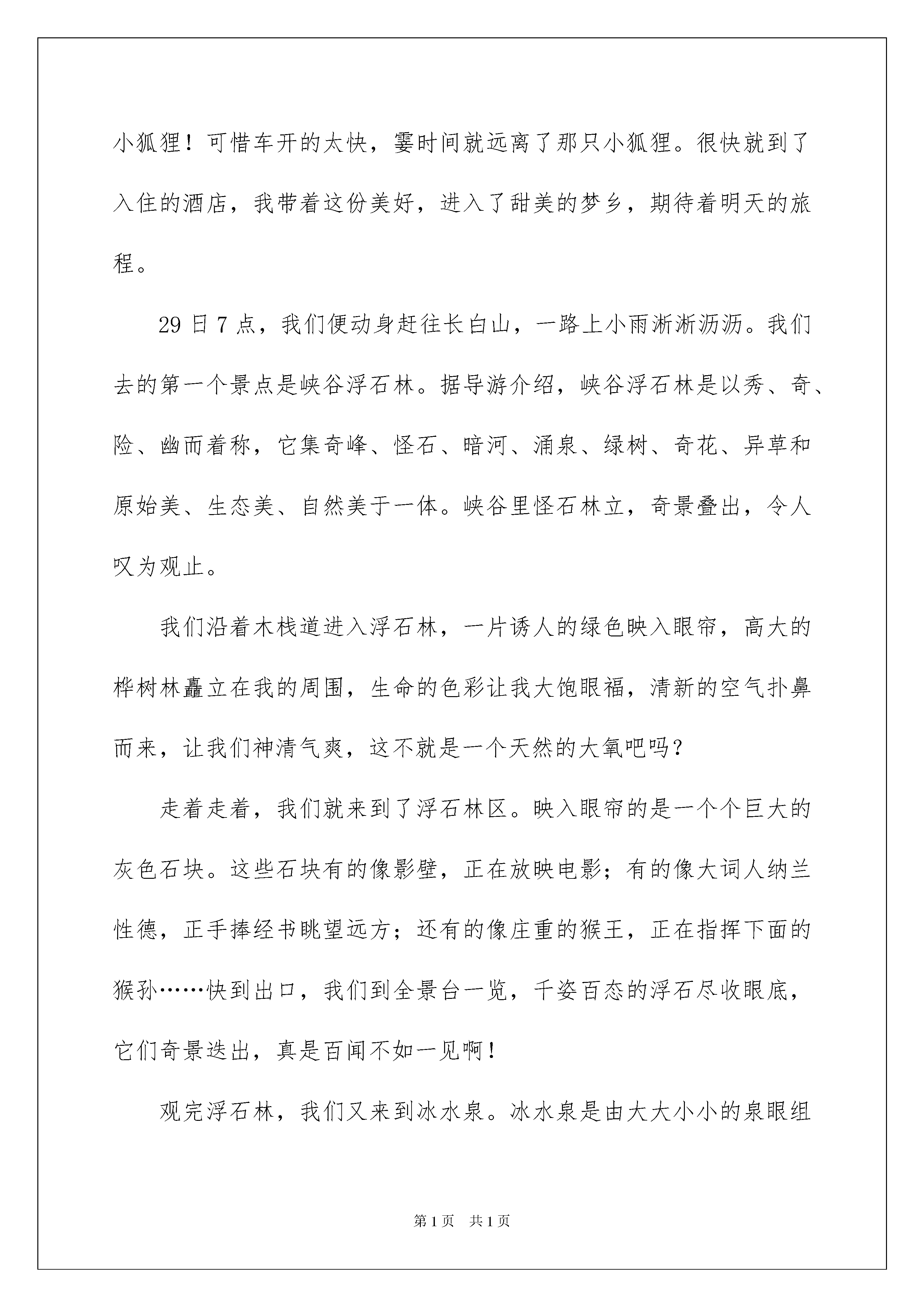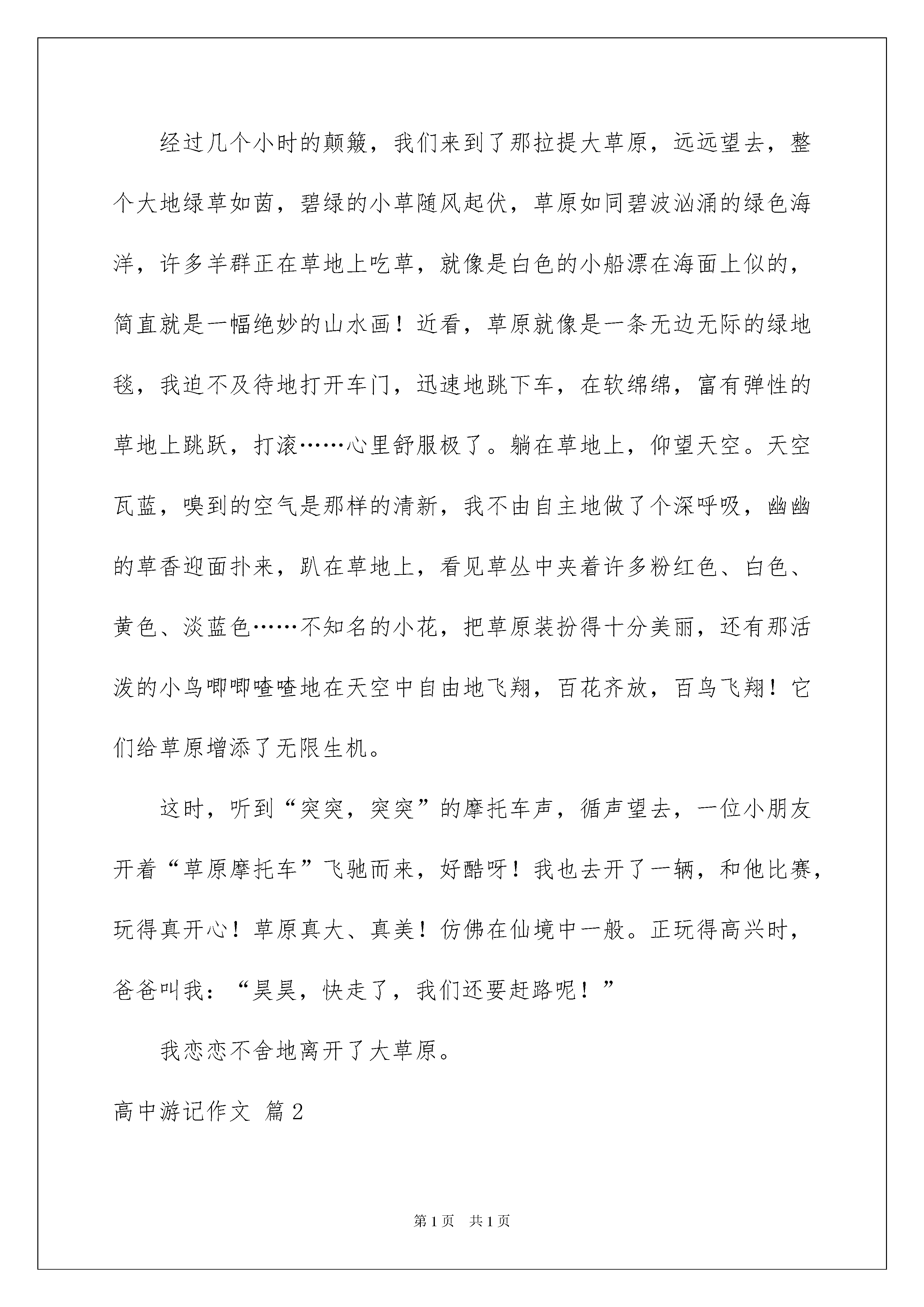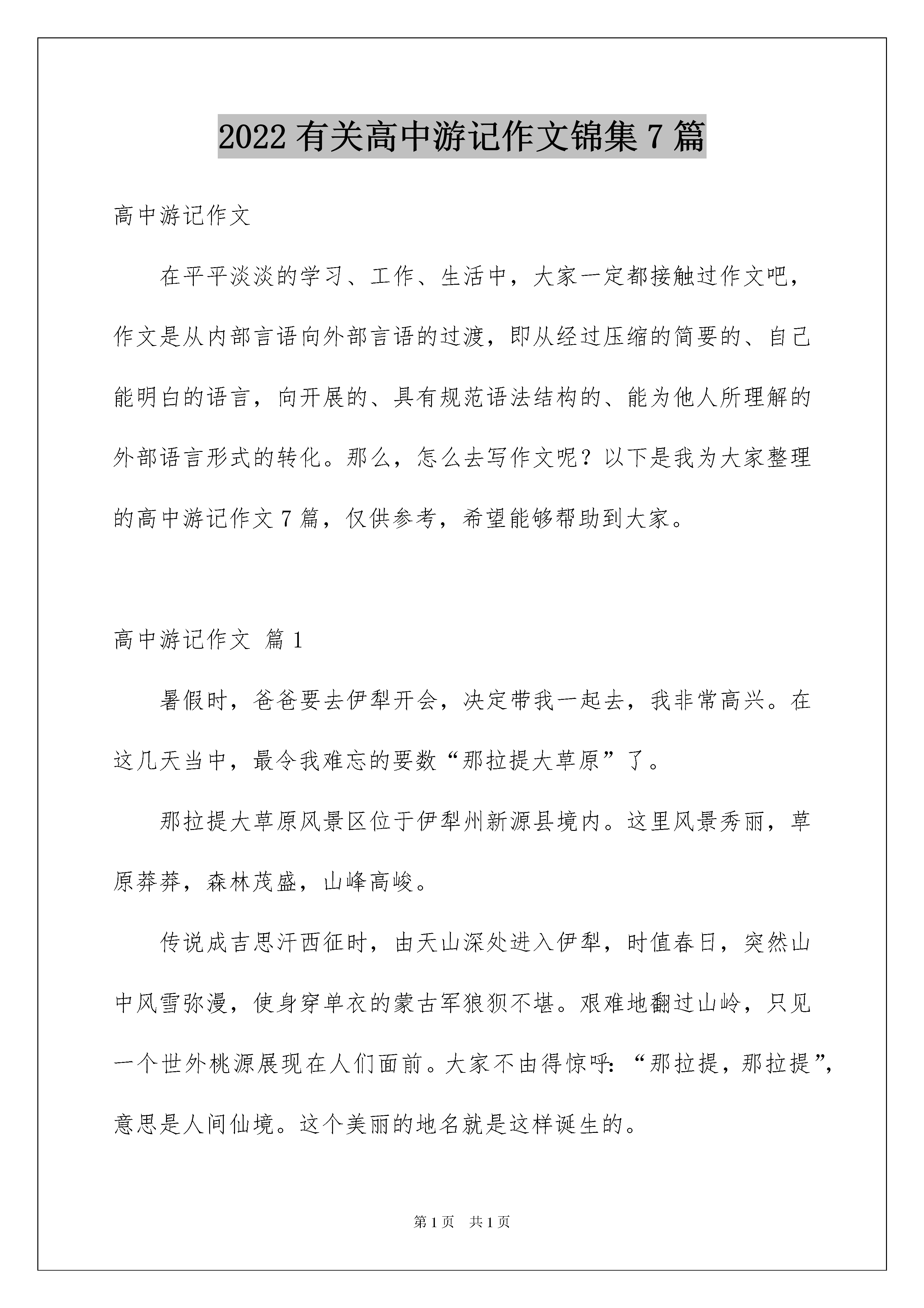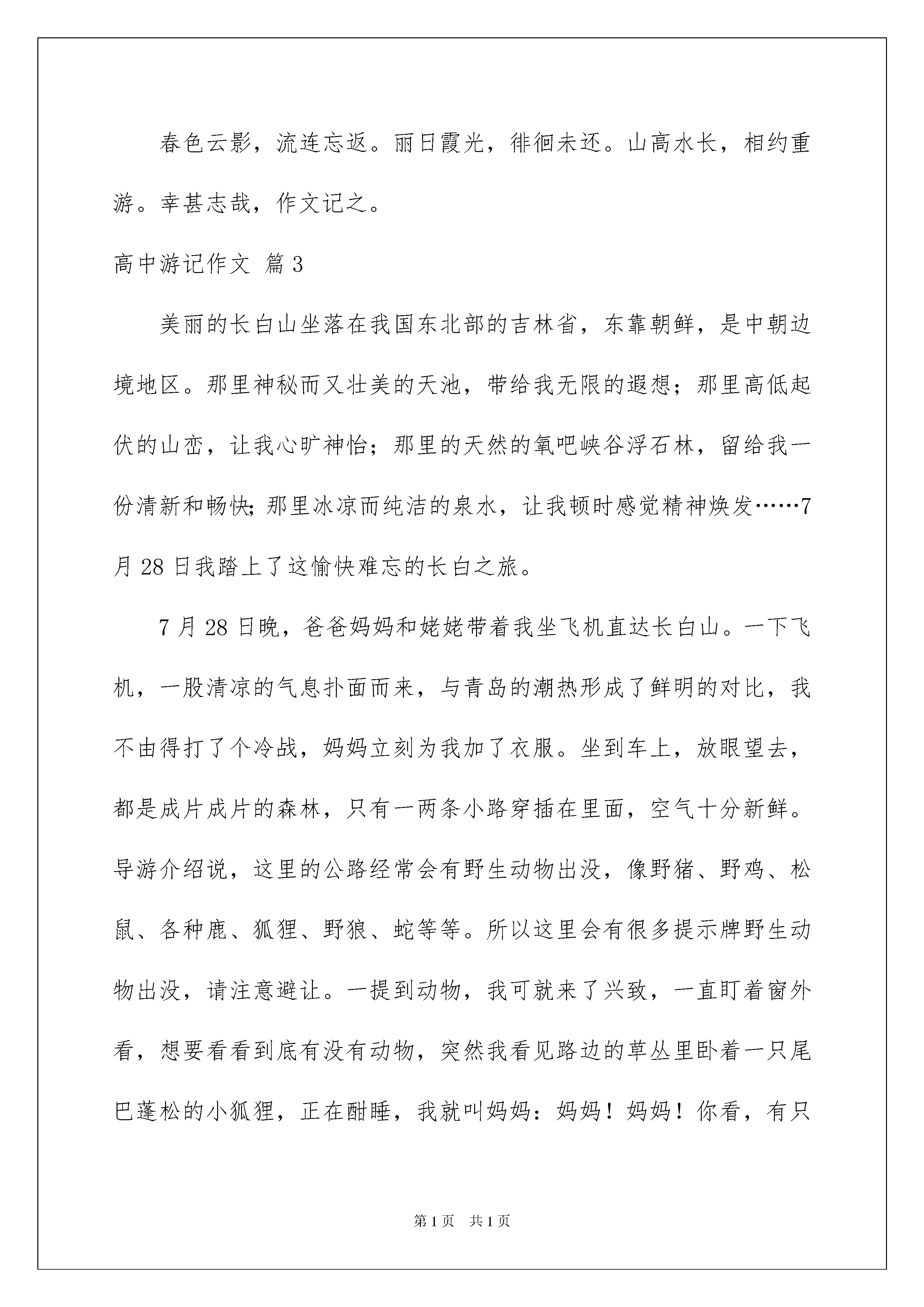 2022有关高中游记作文锦集7篇高中游记作文在平平淡淡的学习、工作、生活中,大家一定都接触过作文吧,作文是从内部言语向外部言语的过渡,即从经过压缩的简要的、自己能明白的语言,向开展的、具有规范语法结构的、能为他人所理解的外部语言形式的转化。那么,怎么去写作文呢?以下是我为大家整理的高中游记作文7篇,仅供参考,希望能够帮助到大家。高中游记作文篇1暑假时,爸爸要去伊犁开会,决定带我一起去,我非常高兴。在这几天当中,最令我难忘的要数“那拉提大草原”了。那拉提大草原风景区位于伊犁州新源县境内。这里风景秀丽,草原莽莽,森林茂盛,山峰高峻。传说成吉思汗西征时,由天山深处进入伊犁,时值春日,突然山中风雪弥漫,使身穿单衣的蒙古军狼狈不堪。艰难地翻过山岭,只见一个世外桃源展现在人们面前。大家不由得惊呼:“那拉提,那拉提”,意思是人间仙境。这个美丽的地名就是这样诞生的。经过几个小时的颠簸,我们来到了那拉提大草原,远远望去,整个大地绿草如茵,碧绿的小草随风起伏,草原如同碧波汹涌的绿色海洋,许多羊群正在草地上吃草,就像是白色的小船漂在海面上似的,简直就是一幅绝妙的山水画!近看,草原就像是一条无边无际的绿地毯,我迫不及待地打开车门,迅速地跳下车,在软绵绵,富有弹性的草地上跳跃,打滚……心里舒服极了。躺在草地上,仰望天空。天空瓦蓝,嗅到的空气是那样的清新,我不由自主地做了个深呼吸,幽幽的草香迎面扑来,趴在草地上,看见草丛中夹着许多粉红色、白色、黄色、淡蓝色……不知名的小花,把草原装扮得十分美丽,还有那活泼的小鸟唧唧喳喳地在天空中自由地飞翔,百花齐放,百鸟飞翔!它们给草原增添了无限生机。这时,听到“突突,突突”的摩托车声,循声望去,一位小朋友开着“草原摩托车”飞驰而来,好酷呀!我也去开了一辆,和他比赛,玩得真开心!草原真大、真美!仿佛在仙境中一般。正玩得高兴时,爸爸叫我:“昊昊,快走了,我们还要赶路呢!”我恋恋不舍地离开了大草原。高中游记作文篇2清明时节,携友游麻姑山。拾级而上,沿锦溪迟行。至半山亭,观瀑玉练双飞。过龙门桥,赏泉神功一勺。临鲁公碑,摩天下第一楷书。拜仙都观,得修心养生之道。麻姑胜境,实乃人间福地,作四言骈文以记之。时维三月,序属仲春。与友期行,乐山智水。建昌古邑,南城新都。武夷余脉,笔架峰麓。秀出东南,山曰麻姑。洞天福地,慕名来游。风和景明,莺飞草长。峰回路转,盘曲迤行。荗林修竹,隐天敝日。锦溪潺潺,如鸣佩环;众鸟嘤嘤,婉转成韵。半山亭前,瀑悬眼帘。猛浪溅岩,风卷雪涌;长虹挂壁,急湍回旋。凭栏翘望,如雷贯耳;登临送目,玉练双飞。龙门桥上,清荣峻荗。怪柏屹立,山岩迸裂。小潭棋布,状如星月。神功奇泉,汩汩渗出。一勺之多,水尤清冽。鲁公碑亭,石径通幽。忠烈高士,青史流芳;仙坛记奇,楷书称绝。苍松古木,亭亭似盖;翠峭叠嶂,轴轴如出。峰峦环抱,观宇俨然。窈窕麻姑,含笑回眸;提篮献寿,得道升天。面壁参禅,望峰息心;听梵品茗,风烟俱静。春色云影,流连忘返。丽日霞光,徘徊未还。山高水长,相约重游。幸甚志哉,作文记之。高中游记作文篇3美丽的长白山坐落在我国东北部的吉林省,东靠朝鲜,是中朝边境地区。那里神秘而又壮美的天池,带给我无限的遐想;那里高低起伏的山峦,让我心旷神怡;那里的天然的氧吧峡谷浮石林,留给我一份清新和畅快;那里冰凉而纯洁的泉水,让我顿时感觉精神焕发……7月28日我踏上了这愉快难忘的长白之旅。7月28日晚,爸爸妈妈和姥姥带着我坐飞机直达长白山。一下飞机,一股清凉的气息扑面而来,与青岛的潮热形成了鲜明的对比,我不由得打了个冷战,妈妈立刻为我加了衣服。坐到车上,放眼望去,都是成片成片的森林,只有一两条小路穿插在里面,空气十分新鲜。导游介绍说,这里的公路经常会有野生动物出没,像野猪、野鸡、松鼠、各种鹿、狐狸、野狼、蛇等等。所以这里会有很多提示牌野生动物出没,请注意避让。一提到动物,我可就来了兴致,一直盯着窗外看,想要看看到底有没有动物,突然我看见路边的草丛里卧着一只尾巴蓬松的小狐狸,正在酣睡,我就叫妈妈:妈妈!妈妈!你看,有只小狐狸!可惜车开的太快,霎时间就远离了那只小狐狸。很快就到了入住的酒店,我带着这份美好,进入了甜美的梦乡,期待着明天的旅程。29日7点,我们便动身赶往长白山,一路上小雨淅淅沥沥。我们去的第一个景点是峡谷浮石林。据导游介绍,峡谷浮石林是以秀、奇、险、幽而着称,它集奇峰、怪石、暗河、涌泉、绿树、奇花、异草和原始美、生态美、自然美于一体。峡谷里怪石林立,奇景叠出,令人叹为观止。我们沿着木栈道进入浮石林,一片诱人的绿色映入眼帘,高大的桦树林矗立在我的周围,生命的色彩让我大饱眼福,清新