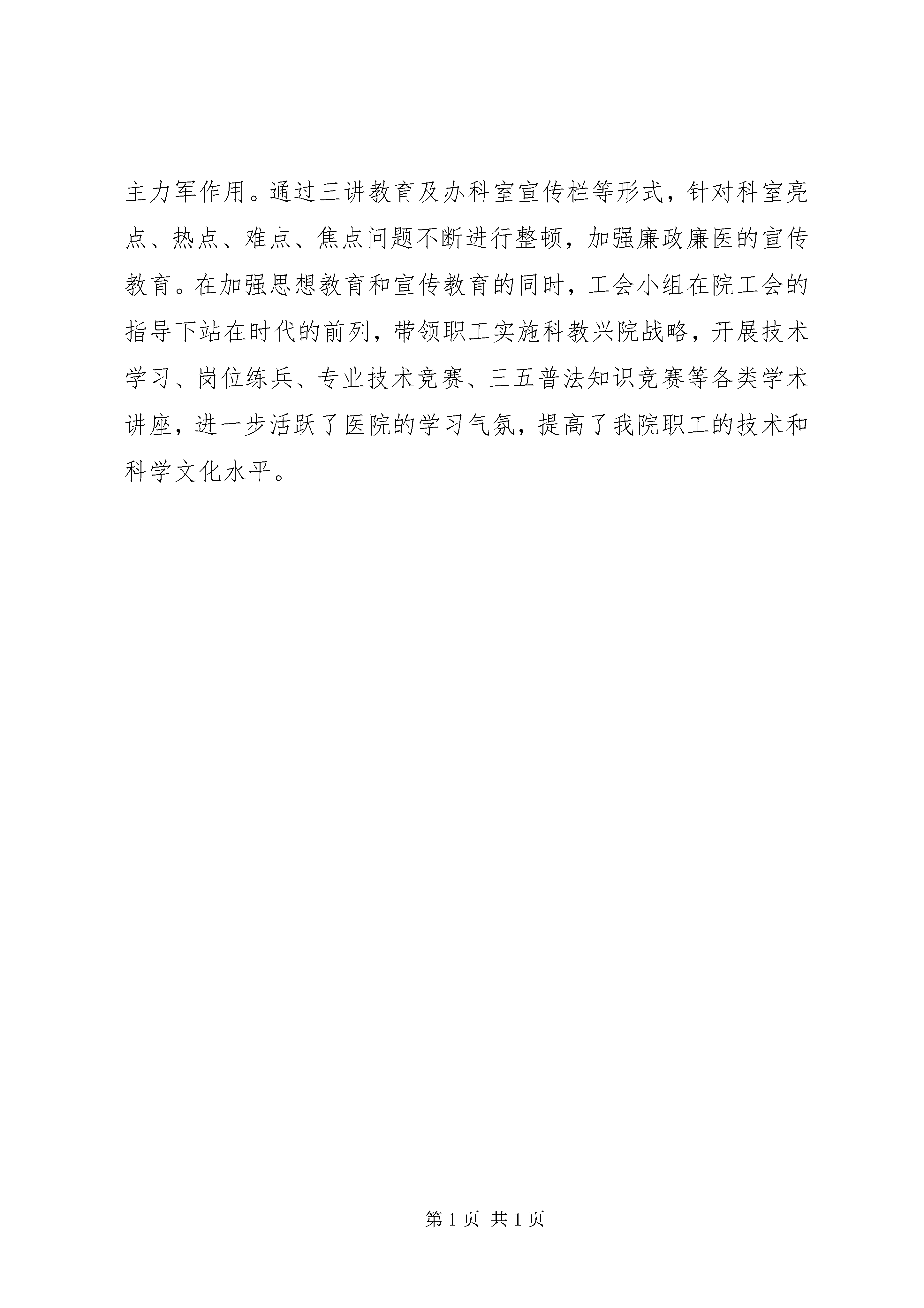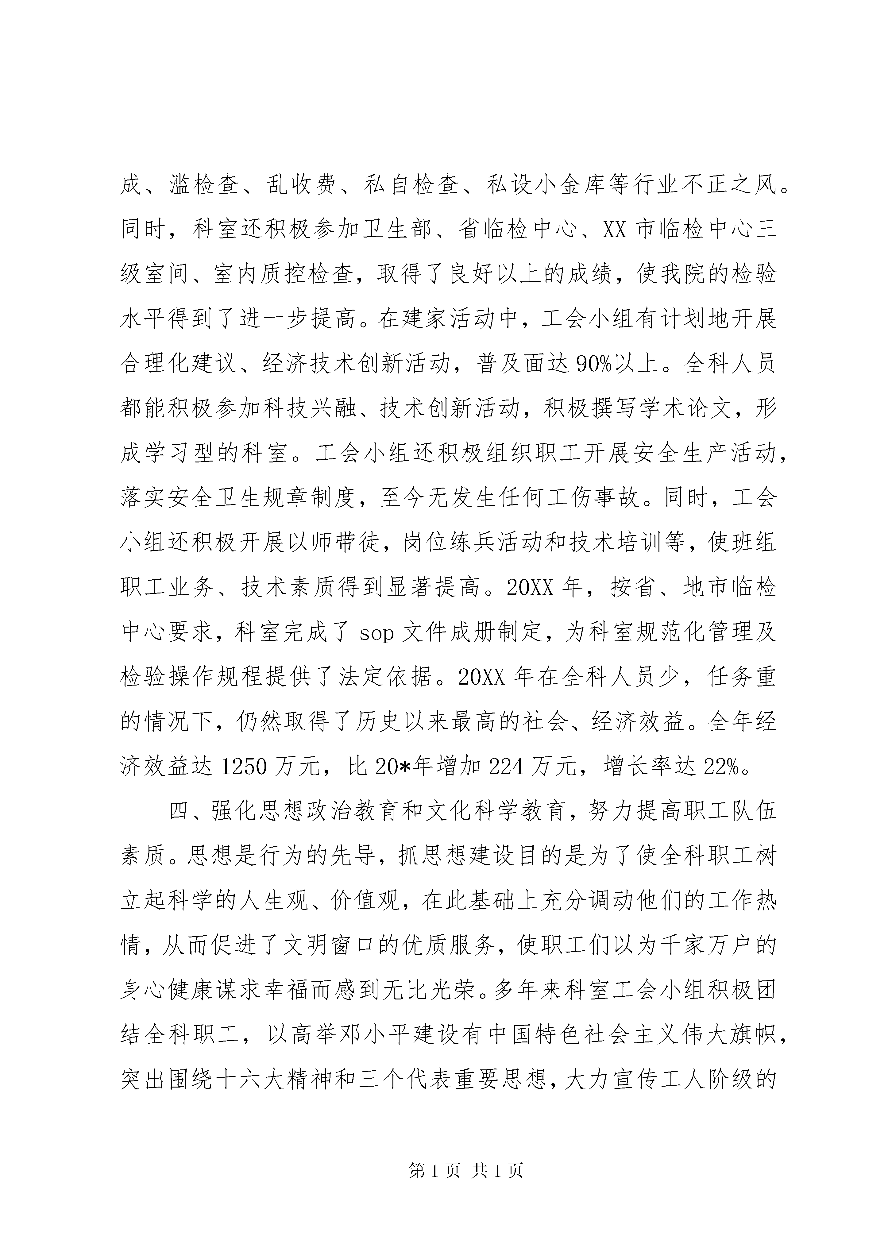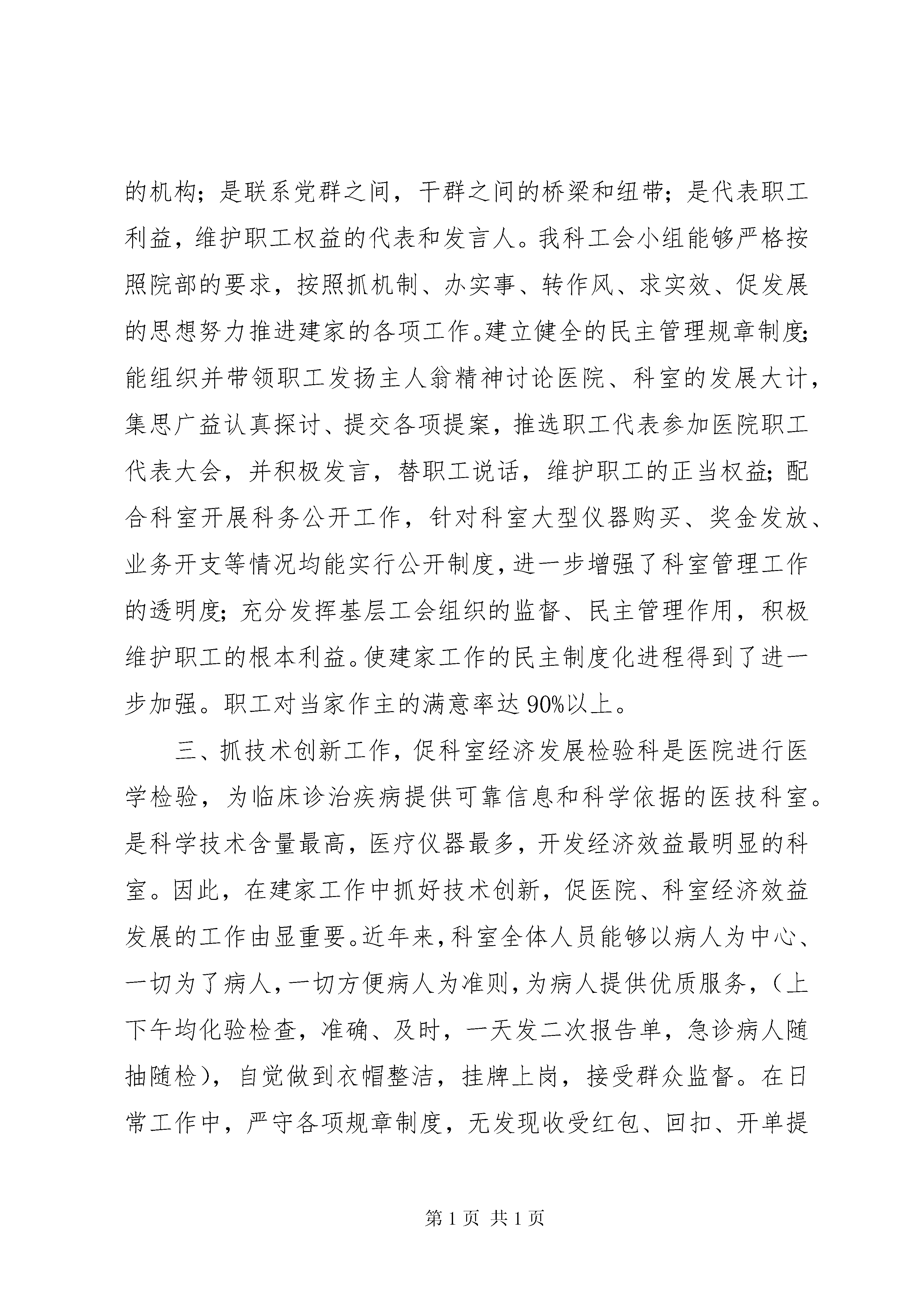 医院先进职工之家先进个人汇报材料医院检验科先进职工之家事迹汇报XX县区医院检验科现有职工28名,是医院和我市的重要实验诊断中心。其设备先进,学科齐全,检验工作量大,规章制度完善,在省市属中上水平。作为基层的职工小家,近年来,在院工会和党委的正确领导下,根据全国总工会十7大精神以及在上级的指导下,能够立足本职工作,严格贯彻《工会法》内容,认真完成好上级交付的各项工作任务,并积极地配合院工会开展系列活动,取得了一定成绩。通过学习新工会法、学习党的十7大精神,在全面建设小康社会的奋斗目标鼓舞下,使我科建家工作更上一层楼,现将近年来的建家工作主要情况汇报如下:一、抓组织建设,保证建家工作落实到实处我工会小组自20XX年建家以来,科室领导高度重视建家工作,通过召开科室职工(会员)大会,选举成立了以科主任余家族同志为组长,副主任、医院工会副主席陈武同志为副组长,卢克友、吴茂春等同志为组员的共建小组,形成了以科主任、组长负总责,副主任、副组长具体抓,组员抓落实的齐抓共管的共建职工小家领导格局。使建家工作做到年初有计划,半年有检查,年终有总结。建家工作逐步走向制度化,规范化。二、加强民主化建设,促进科室制度化管理工会是在党的统一领导下,实行民主管理的群众组织,是职工行使民主监督权力的机构;是联系党群之间,干群之间的桥梁和纽带;是代表职工利益,维护职工权益的代表和发言人。我科工会小组能够严格按照院部的要求,按照抓机制、办实事、转作风、求实效、促发展的思想努力推进建家的各项工作。建立健全的民主管理规章制度;能组织并带领职工发扬主人翁精神讨论医院、科室的发展大计,集思广益认真探讨、提交各项提案,推选职工代表参加医院职工代表大会,并积极发言,替职工说话,维护职工的正当权益;配合科室开展科务公开工作,针对科室大型仪器购买、奖金发放、业务开支等情况均能实行公开制度,进一步增强了科室管理工作的透明度;充分发挥基层工会组织的监督、民主管理作用,积极维护职工的根本利益。使建家工作的民主制度化进程得到了进一步加强。职工对当家作主的满意率达90%以上。三、抓技术创新工作,促科室经济发展检验科是医院进行医学检验,为临床诊治疾病提供可靠信息和科学依据的医技科室。是科学技术含量最高,医疗仪器最多,开发经济效益最明显的科室。因此,在建家工作中抓好技术创新,促医院、科室经济效益发展的工作由显重要。近年来,科室全体人员能够以病人为中心、一切为了病人,一切方便病人为准则,为病人提供优质服务,(上下午均化验检查,准确、及时,一天发二次报告单,急诊病人随抽随检),自觉做到衣帽整洁,挂牌上岗,接受群众监督。在日常工作中,严守各项规章制度,无发现收受红包、回扣、开单提成、滥检查、乱收费、私自检查、私设小金库等行业不正之风。同时,科室还积极参加卫生部、省临检中心、XX市临检中心三级室间、室内质控检查,取得了良好以上的成绩,使我院的检验水平得到了进一步提高。在建家活动中,工会小组有计划地开展合理化建议、经济技术创新活动,普及面达90%以上。全科人员都能积极参加科技兴融、技术创新活动,积极撰写学术论文,形成学习型的科室。工会小组还积极组织职工开展安全生产活动,落实安全卫生规章制度,至今无发生任何工伤事故。同时,工会小组还积极开展以师带徒,岗位练兵活动和技术培训等,使班组职工业务、技术素质得到显著提高。20XX年,按省、地市临检中心要求,科室完成了sop文件成册制定,为科室规范化管理及检验操作规程提供了法定依据。20XX年在全科人员少,任务重的情况下,仍然取得了历史以来最高的社会、经济效益。全年经济效益达1250万元,比20*年增加224万元,增长率达22%。四、强化思想政治教育和文化科学教育,努力提高职工队伍素质。思想是行为的先导,抓思想建设目的是为了使全科职工树立起科学的人生观、价值观,在此基础上充分调动他们的工作热情,从而促进了文明窗口的优质服务,使职工们以为千家万户的身心健康谋求幸福而感到无比光荣。多年来科室工会小组积极团结全科职工,以高举邓小平建设有中国特色社会主义伟大旗帜,突出围绕十六大精神和三个代表重要思想,大力宣传工人阶级的主力军作用。通过三讲教育及办科室宣传栏等形式,针对科室亮点、热点、难点、焦点问题不断进行整顿,加强廉政廉医的宣传教育。在加强思想教育和宣传教育的同时,工会小组在院工会的指导下站在时代的前列,带领职工实施科教兴院战略,开展技术学习、岗位练兵、专业技术竞赛、三五普法知识竞赛等各类学术讲座,进一步活跃了医院的学习气氛,提高了我院职工的技术和科学文化水平。