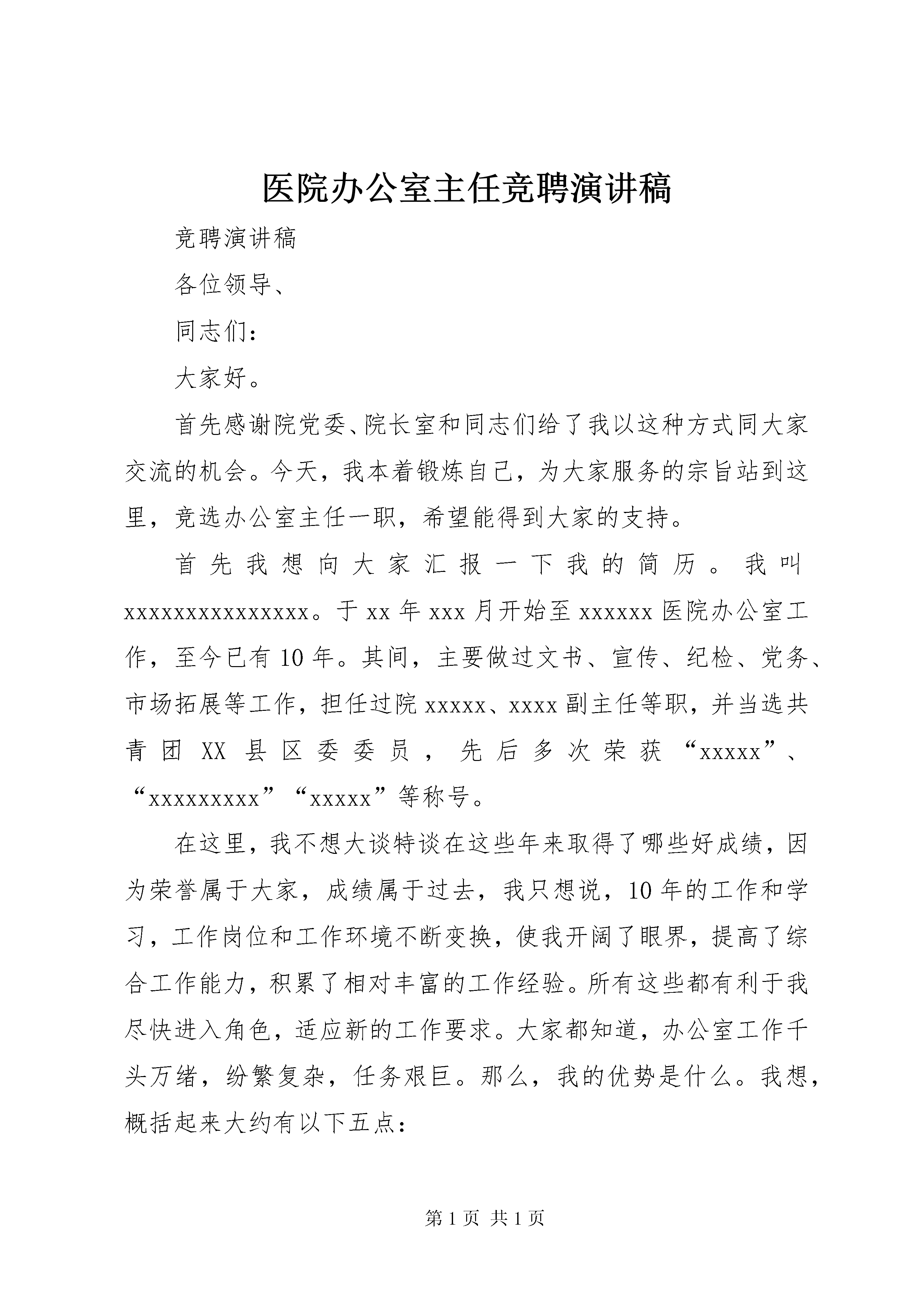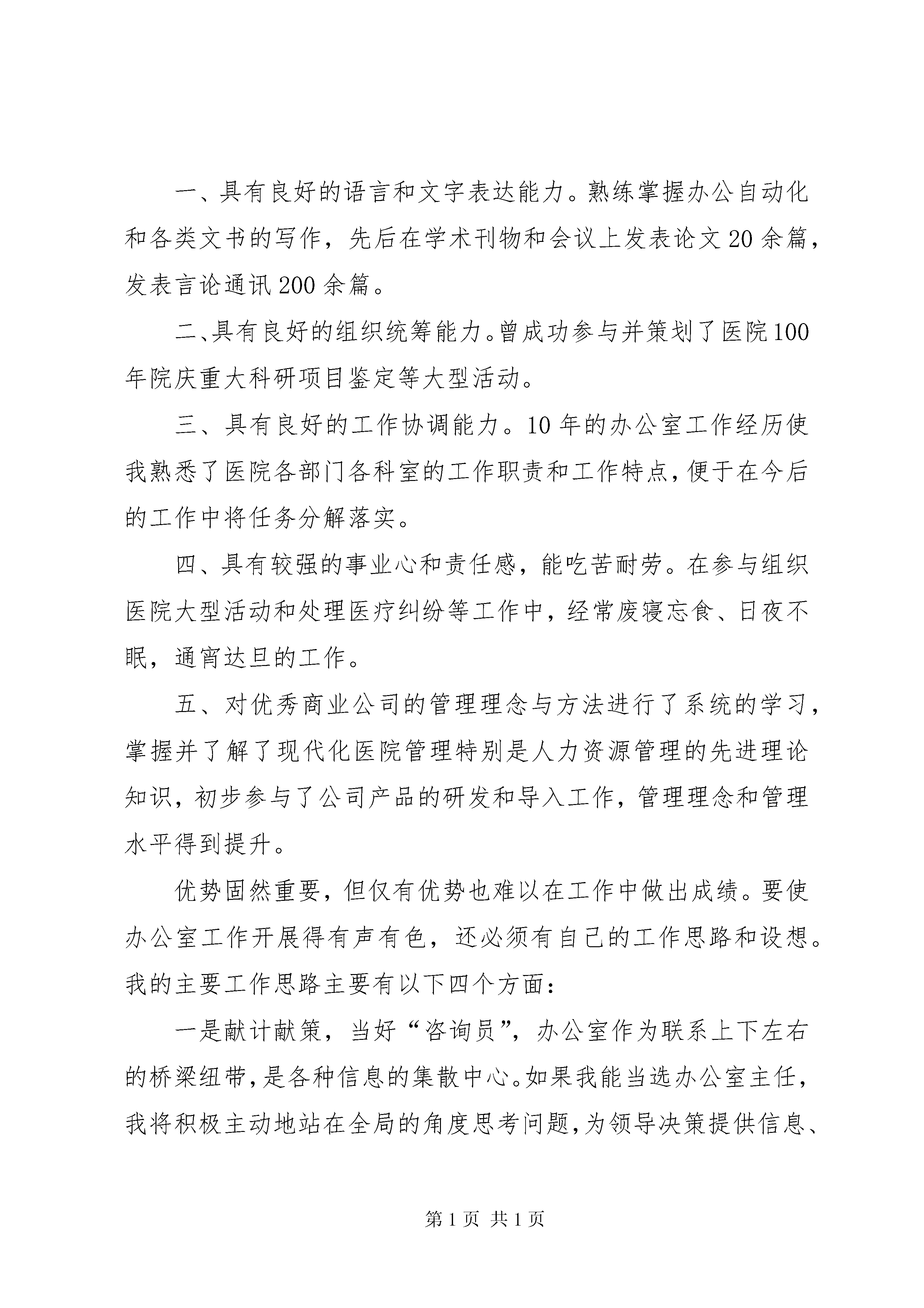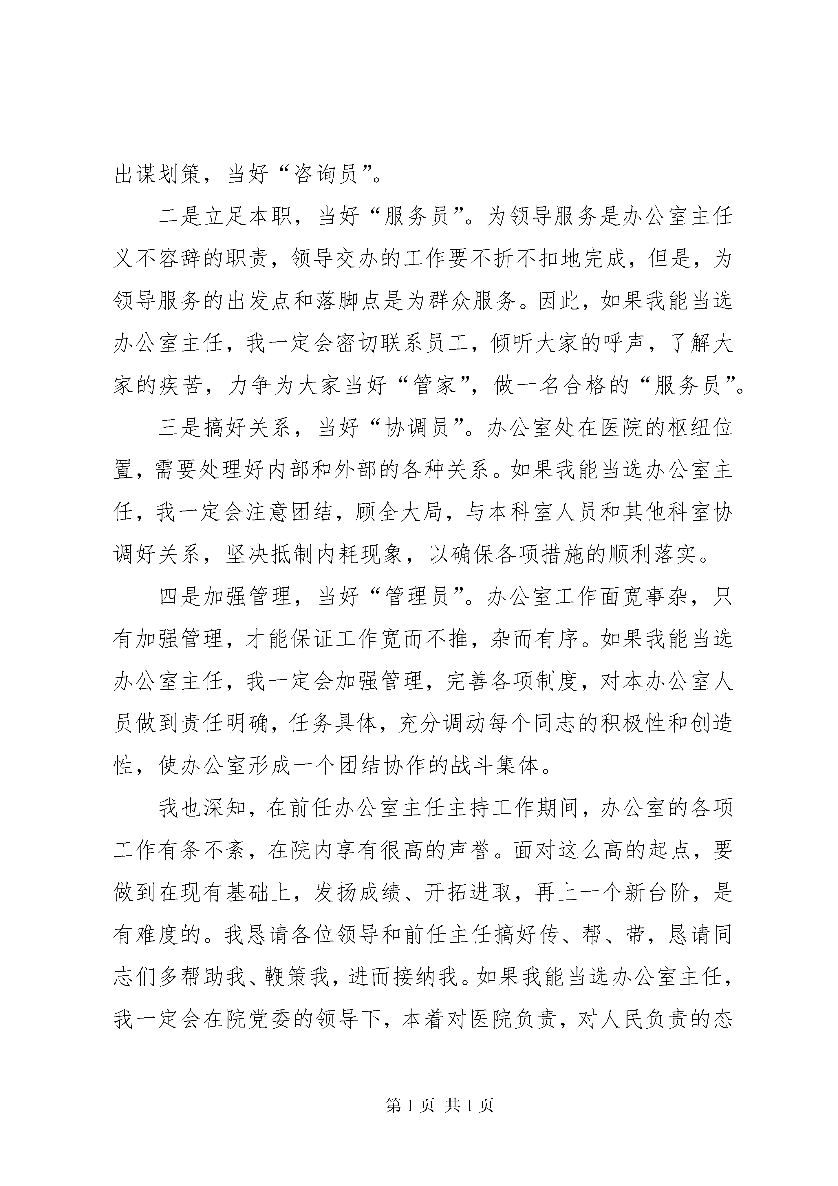 医院办公室主任竞聘演讲稿竞聘演讲稿各位领导、同志们:大家好。首先感谢院党委、院长室和同志们给了我以这种方式同大家交流的机会。今天,我本着锻炼自己,为大家服务的宗旨站到这里,竞选办公室主任一职,希望能得到大家的支持。首先我想向大家汇报一下我的简历。我叫xxxxxxxxxxxxxxx。于xx年xxx月开始至xxxxxx医院办公室工作,至今已有10年。其间,主要做过文书、宣传、纪检、党务、市场拓展等工作,担任过院xxxxx、xxxx副主任等职,并当选共青团XX县区委委员,先后多次荣获“xxxxx”、“xxxxxxxxx”“xxxxx”等称号。在这里,我不想大谈特谈在这些年来取得了哪些好成绩,因为荣誉属于大家,成绩属于过去,我只想说,10年的工作和学习,工作岗位和工作环境不断变换,使我开阔了眼界,提高了综合工作能力,积累了相对丰富的工作经验。所有这些都有利于我尽快进入角色,适应新的工作要求。大家都知道,办公室工作千头万绪,纷繁复杂,任务艰巨。那么,我的优势是什么。我想,概括起来大约有以下五点:一、具有良好的语言和文字表达能力。熟练掌握办公自动化和各类文书的写作,先后在学术刊物和会议上发表论文20余篇,发表言论通讯200余篇。二、具有良好的组织统筹能力。曾成功参与并策划了医院100年院庆重大科研项目鉴定等大型活动。三、具有良好的工作协调能力。10年的办公室工作经历使我熟悉了医院各部门各科室的工作职责和工作特点,便于在今后的工作中将任务分解落实。四、具有较强的事业心和责任感,能吃苦耐劳。在参与组织医院大型活动和处理医疗纠纷等工作中,经常废寝忘食、日夜不眠,通宵达旦的工作。五、对优秀商业公司的管理理念与方法进行了系统的学习,掌握并了解了现代化医院管理特别是人力资源管理的先进理论知识,初步参与了公司产品的研发和导入工作,管理理念和管理水平得到提升。优势固然重要,但仅有优势也难以在工作中做出成绩。要使办公室工作开展得有声有色,还必须有自己的工作思路和设想。我的主要工作思路主要有以下四个方面:一是献计献策,当好“咨询员”,办公室作为联系上下左右的桥梁纽带,是各种信息的集散中心。如果我能当选办公室主任,我将积极主动地站在全局的角度思考问题,为领导决策提供信息、出谋划策,当好“咨询员”。二是立足本职,当好“服务员”。为领导服务是办公室主任义不容辞的职责,领导交办的工作要不折不扣地完成,但是,为领导服务的出发点和落脚点是为群众服务。因此,如果我能当选办公室主任,我一定会密切联系员工,倾听大家的呼声,了解大家的疾苦,力争为大家当好“管家”,做一名合格的“服务员”。三是搞好关系,当好“协调员”。办公室处在医院的枢纽位置,需要处理好内部和外部的各种关系。如果我能当选办公室主任,我一定会注意团结,顾全大局,与本科室人员和其他科室协调好关系,坚决抵制内耗现象,以确保各项措施的顺利落实。四是加强管理,当好“管理员”。办公室工作面宽事杂,只有加强管理,才能保证工作宽而不推,杂而有序。如果我能当选办公室主任,我一定会加强管理,完善各项制度,对本办公室人员做到责任明确,任务具体,充分调动每个同志的积极性和创造性,使办公室形成一个团结协作的战斗集体。我也深知,在前任办公室主任主持工作期间,办公室的各项工作有条不紊,在院内享有很高的声誉。面对这么高的起点,要做到在现有基础上,发扬成绩、开拓进取,再上一个新台阶,是有难度的。我恳请各位领导和前任主任搞好传、帮、带,恳请同志们多帮助我、鞭策我,进而接纳我。如果我能当选办公室主任,我一定会在院党委的领导下,本着对医院负责,对人民负责的态度,发扬吃苦耐劳的精神,兢兢业业,努力工作,决不辜负大家对我的期望和厚爱。医院办公室主任竞聘演讲稿一文由搜集整理,版权归作者所有,转载请注明出处。