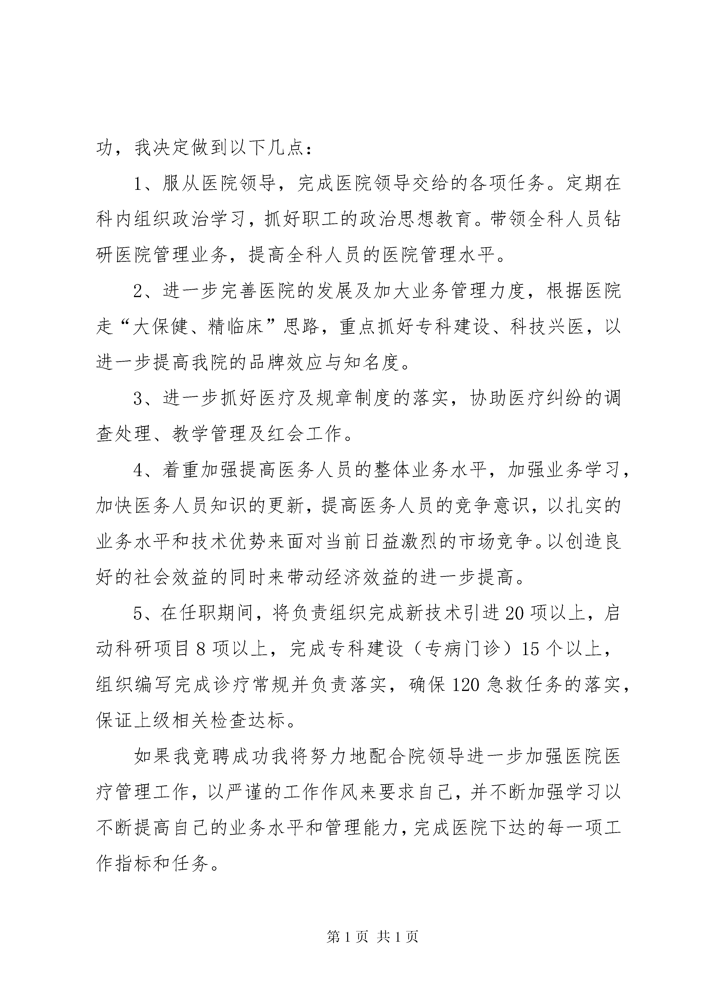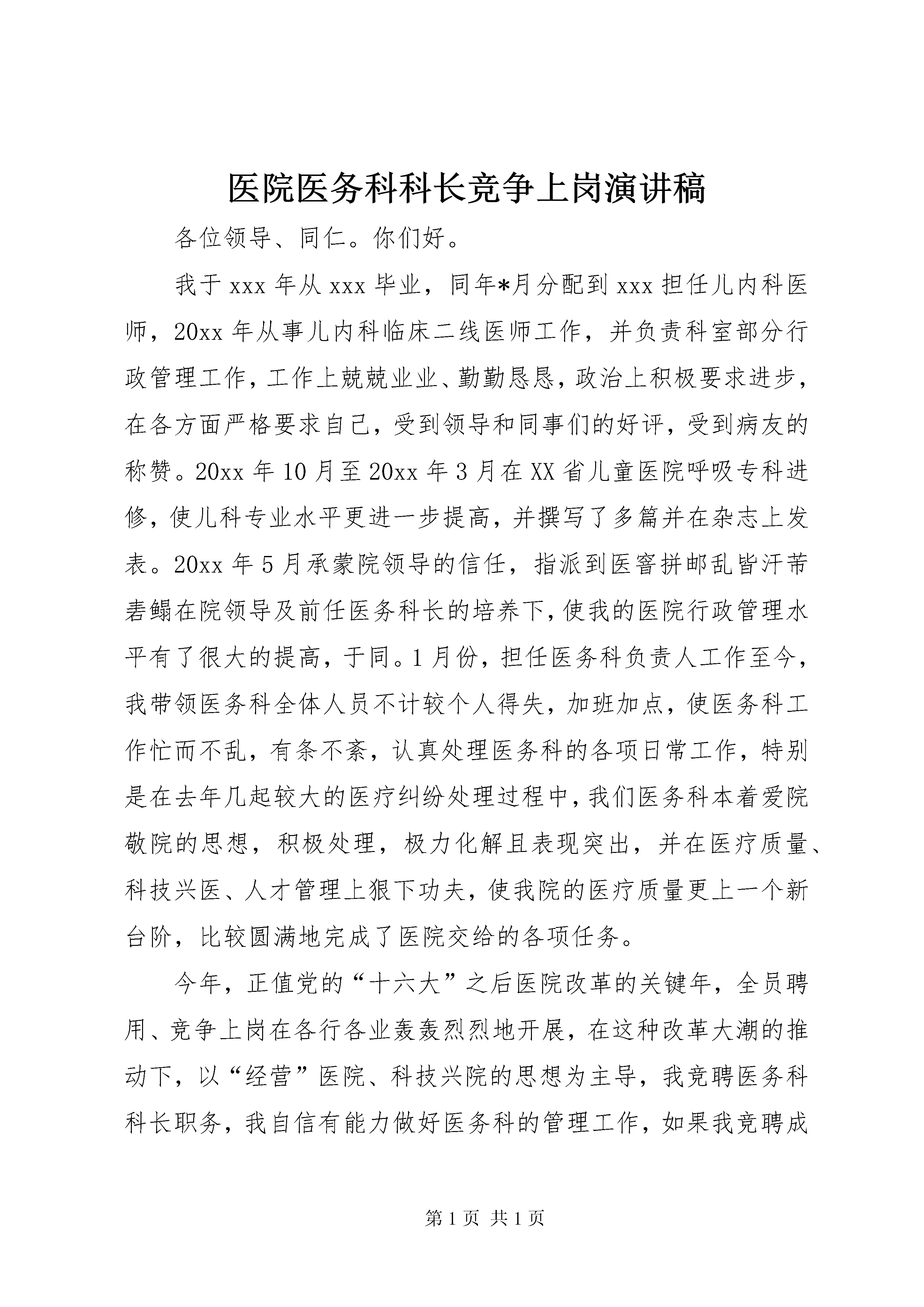 医院医务科科长竞争上岗演讲稿各位领导、同仁。你们好。我于xxx年从xxx毕业,同年*月分配到xxx担任儿内科医师,20xx年从事儿内科临床二线医师工作,并负责科室部分行政管理工作,工作上兢兢业业、勤勤恳恳,政治上积极要求进步,在各方面严格要求自己,受到领导和同事们的好评,受到病友的称赞。20xx年10月至20xx年3月在XX省儿童医院呼吸专科进修,使儿科专业水平更进一步提高,并撰写了多篇并在杂志上发表。20xx年5月承蒙院领导的信任,指派到医窨拼邮乱皆汗芾砉鳎在院领导及前任医务科长的培养下,使我的医院行政管理水平有了很大的提高,于同。1月份,担任医务科负责人工作至今,我带领医务科全体人员不计较个人得失,加班加点,使医务科工作忙而不乱,有条不紊,认真处理医务科的各项日常工作,特别是在去年几起较大的医疗纠纷处理过程中,我们医务科本着爱院敬院的思想,积极处理,极力化解且表现突出,并在医疗质量、科技兴医、人才管理上狠下功夫,使我院的医疗质量更上一个新台阶,比较圆满地完成了医院交给的各项任务。今年,正值党的“十六大”之后医院改革的关键年,全员聘用、竞争上岗在各行各业轰轰烈烈地开展,在这种改革大潮的推动下,以“经营”医院、科技兴院的思想为主导,我竞聘医务科科长职务,我自信有能力做好医务科的管理工作,如果我竞聘成功,我决定做到以下几点:1、服从医院领导,完成医院领导交给的各项任务。定期在科内组织政治学习,抓好职工的政治思想教育。带领全科人员钻研医院管理业务,提高全科人员的医院管理水平。2、进一步完善医院的发展及加大业务管理力度,根据医院走“大保健、精临床”思路,重点抓好专科建设、科技兴医,以进一步提高我院的品牌效应与知名度。3、进一步抓好医疗及规章制度的落实,协助医疗纠纷的调查处理、教学管理及红会工作。4、着重加强提高医务人员的整体业务水平,加强业务学习,加快医务人员知识的更新,提高医务人员的竞争意识,以扎实的业务水平和技术优势来面对当前日益激烈的市场竞争。以创造良好的社会效益的同时来带动经济效益的进一步提高。5、在任职期间,将负责组织完成新技术引进20项以上,启动科研项目8项以上,完成专科建设(专病门诊)15个以上,组织编写完成诊疗常规并负责落实,确保120急救任务的落实,保证上级相关检查达标。如果我竞聘成功我将努力地配合院领导进一步加强医院医疗管理工作,以严谨的工作作风来要求自己,并不断加强学习以不断提高自己的业务水平和管理能力,完成医院下达的每一项工作指标和任务。以上是我的竞聘条件和思路,希望领导及同事给与支持,无论是否当选,我将都会以更严格的要求来完善自己,为医院出尽每一分力。谢谢大家。