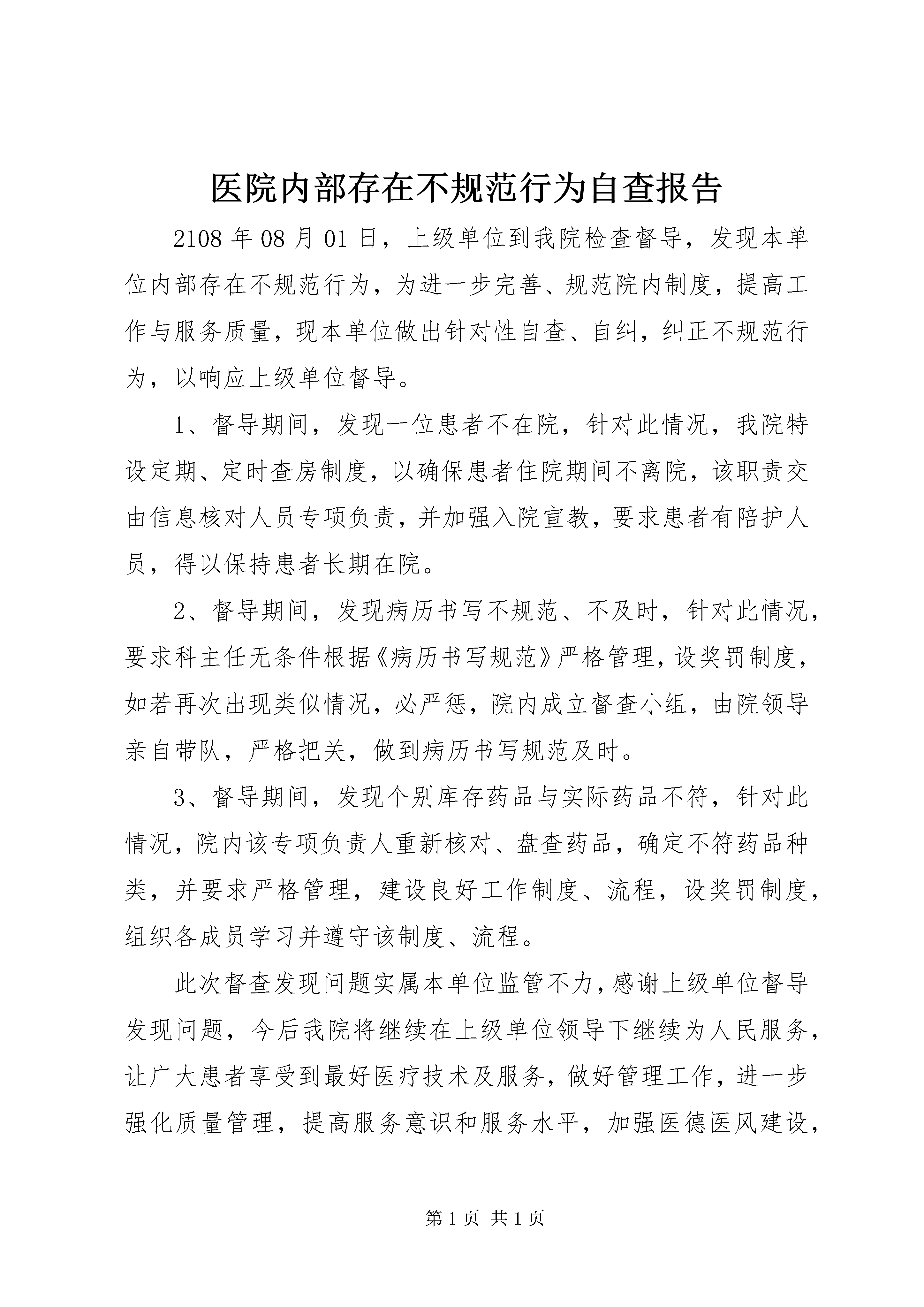 医院内部存在不规范行为自查报告2108年08月01日,上级单位到我院检查督导,发现本单位内部存在不规范行为,为进一步完善、规范院内制度,提高工作与服务质量,现本单位做出针对性自查、自纠,纠正不规范行为,以响应上级单位督导。1、督导期间,发现一位患者不在院,针对此情况,我院特设定期、定时查房制度,以确保患者住院期间不离院,该职责交由信息核对人员专项负责,并加强入院宣教,要求患者有陪护人员,得以保持患者长期在院。2、督导期间,发现病历书写不规范、不及时,针对此情况,要求科主任无条件根据《病历书写规范》严格管理,设奖罚制度,如若再次出现类似情况,必严惩,院内成立督查小组,由院领导亲自带队,严格把关,做到病历书写规范及时。3、督导期间,发现个别库存药品与实际药品不符,针对此情况,院内该专项负责人重新核对、盘查药品,确定不符药品种类,并要求严格管理,建设良好工作制度、流程,设奖罚制度,组织各成员学习并遵守该制度、流程。此次督查发现问题实属本单位监管不力,感谢上级单位督导发现问题,今后我院将继续在上级单位领导下继续为人民服务,让广大患者享受到最好医疗技术及服务,做好管理工作,进一步强化质量管理,提高服务意识和服务水平,加强医德医风建设,真正做到“以病人为中心,以质量为核心”的基本宗旨。