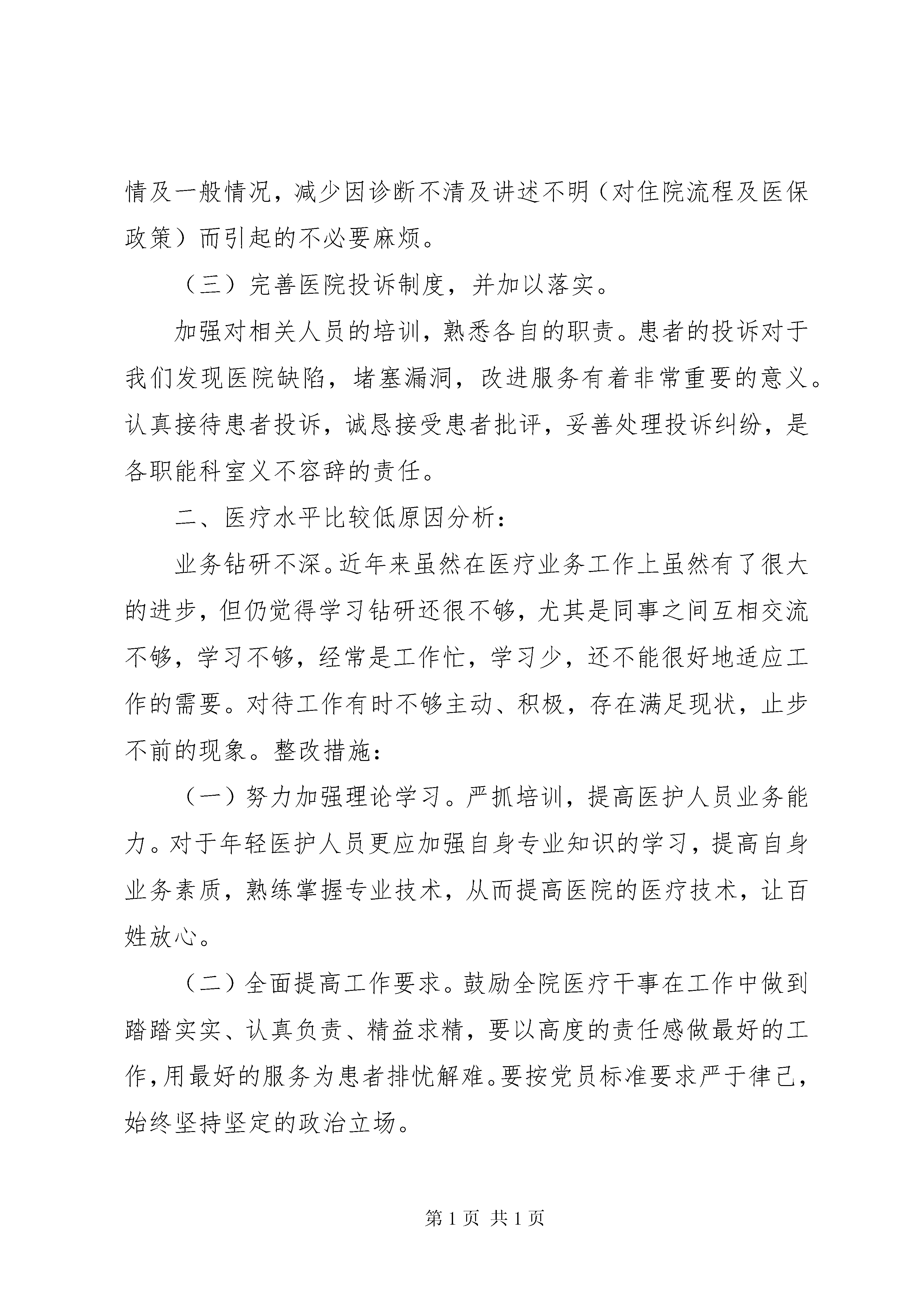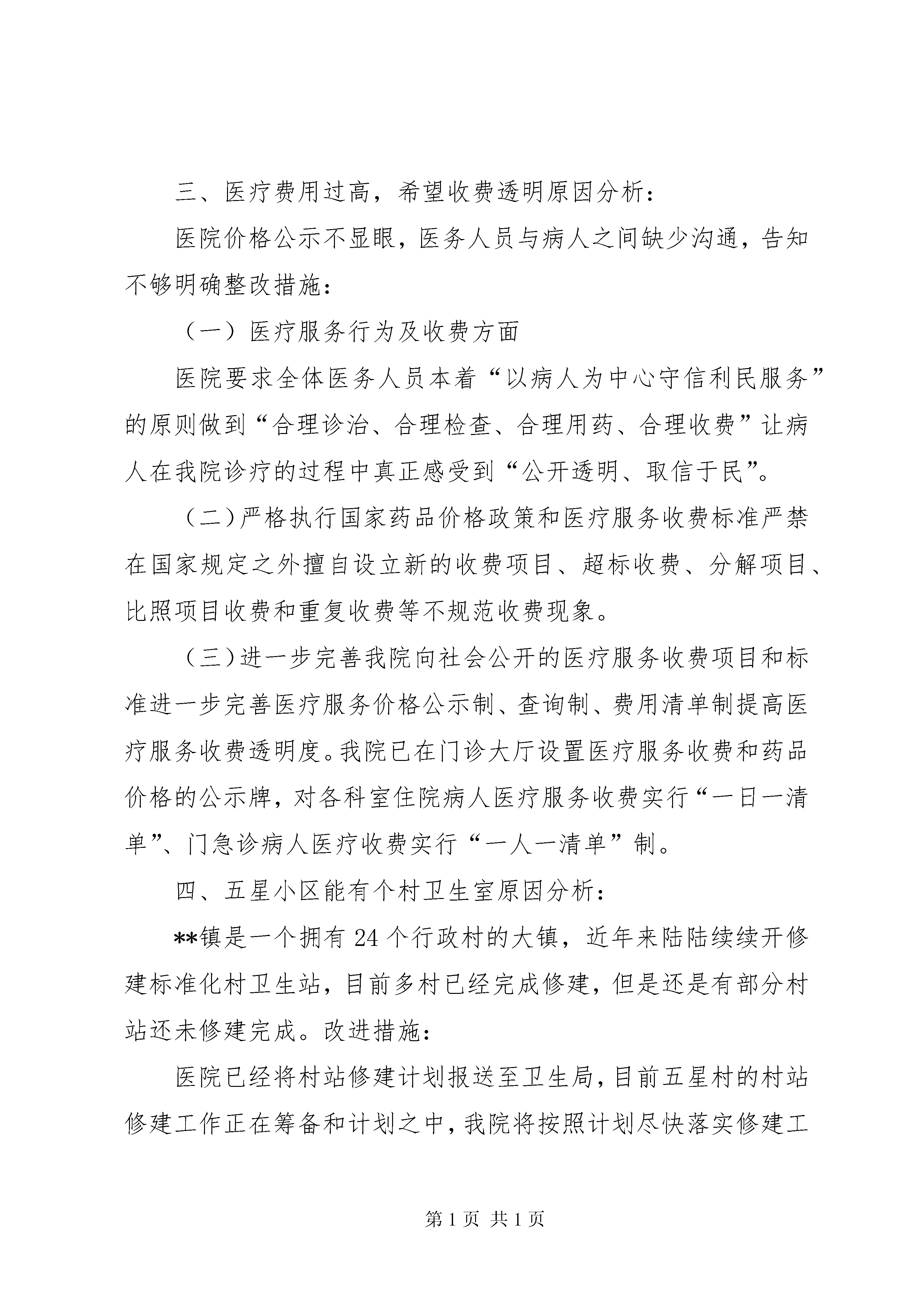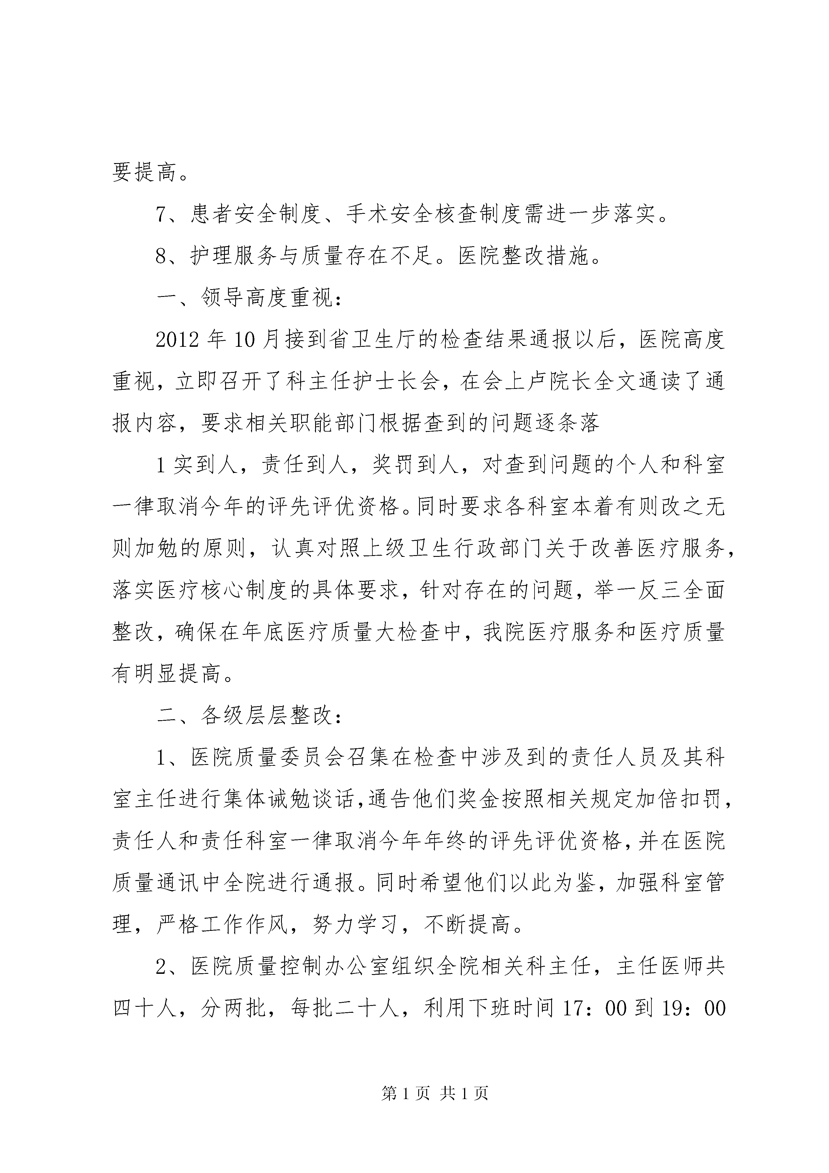 医院医疗卫生存在问题的整改报告结合2016年公共服务满意度测评,根据调查结果和单位实际,总结分析了存在问题,并提出如下改进措施。一、医院医务人员服务态度不好原因分析:(一)、部分医生问诊不细致。根据患者反映及调查发现,部分门诊医生问诊不够细致,致使患者有不受重视的感觉(二)、医患之间沟通不到位病人到医院就诊,个别医护人员对待患者比较生硬,缺乏沟通,不了解病人所需所想,导致患者对医务人员不满意(三)、投诉管理不完善。个别情况患者投诉时对投诉途径不明确,投诉患者问题得不到有效解决。整改措施:(一)应加强对医师工作责任心的培养,医院还应加大对门诊工作的督导作用,加强对各个坐诊科室的巡查。为提高患者对我们医院的满意度,还可以在患者候诊的过程中,对患者进行基本的医疗知识普及,发放科普手册,从微小的地方让患者感受到我们医院对患者的重视。(二)、重视服务态度,提高医患沟通技巧。根据患者的需要不断拓展服务范围,尽可能满足患者不同形式和不同程度的需要。反复、耐心得做好与患者及家属的沟通,尽量了解患者的病情及一般情况,减少因诊断不清及讲述不明(对住院流程及医保政策)而引起的不必要麻烦。(三)完善医院投诉制度,并加以落实。加强对相关人员的培训,熟悉各自的职责。患者的投诉对于我们发现医院缺陷,堵塞漏洞,改进服务有着非常重要的意义。认真接待患者投诉,诚恳接受患者批评,妥善处理投诉纠纷,是各职能科室义不容辞的责任。二、医疗水平比较低原因分析:业务钻研不深。近年来虽然在医疗业务工作上虽然有了很大的进步,但仍觉得学习钻研还很不够,尤其是同事之间互相交流不够,学习不够,经常是工作忙,学习少,还不能很好地适应工作的需要。对待工作有时不够主动、积极,存在满足现状,止步不前的现象。整改措施:(一)努力加强理论学习。严抓培训,提高医护人员业务能力。对于年轻医护人员更应加强自身专业知识的学习,提高自身业务素质,熟练掌握专业技术,从而提高医院的医疗技术,让百姓放心。(二)全面提高工作要求。鼓励全院医疗干事在工作中做到踏踏实实、认真负责、精益求精,要以高度的责任感做最好的工作,用最好的服务为患者排忧解难。要按党员标准要求严于律己,始终坚持坚定的政治立场。三、医疗费用过高,希望收费透明原因分析:医院价格公示不显眼,医务人员与病人之间缺少沟通,告知不够明确整改措施:(一)医疗服务行为及收费方面医院要求全体医务人员本着“以病人为中心守信利民服务”的原则做到“合理诊治、合理检查、合理用药、合理收费”让病人在我院诊疗的过程中真正感受到“公开透明、取信于民”。(二)严格执行国家药品价格政策和医疗服务收费标准严禁在国家规定之外擅自设立新的收费项目、超标收费、分解项目、比照项目收费和重复收费等不规范收费现象。(三)进一步完善我院向社会公开的医疗服务收费项目和标准进一步完善医疗服务价格公示制、查询制、费用清单制提高医疗服务收费透明度。我院已在门诊大厅设置医疗服务收费和药品价格的公示牌,对各科室住院病人医疗服务收费实行“一日一清单”、门急诊病人医疗收费实行“一人一清单”制。四、五星小区能有个村卫生室原因分析:**镇是一个拥有24个行政村的大镇,近年来陆陆续续开修建标准化村卫生站,目前多村已经完成修建,但是还是有部分村站还未修建完成。改进措施:医院已经将村站修建计划报送至卫生局,目前五星村的村站修建工作正在筹备和计划之中,我院将按照计划尽快落实修建工作。我院希望通过这一系列的举措,以改进促满度提高、以满意度调查促改进的良性循环管理,使医患纠纷比以往减少,满意率提高。XX县区**镇公立卫生院2017年2月22日第二篇:XX县区人民医院关于对医疗服务和医疗核心制度存在问题的整改报告XX县区人民医院关于对省厅医疗服务和医疗核心制度检查存在问题的整改报告2012年9月20日至9月21日省卫生厅对我院医疗服务和医疗核心落实制度情况进行了明查暗访检查,我院针对通报认真反思,及时分析总结反馈并整改,汇报如下:医疗核心制度存在问题整改:医疗核心制度落实存在问题主要有:1、值班交接班制度落实不到位。2、三级医师查房制度仍存在不足。3、疑难危重病例讨论制度落实不够。4、知情同意制度还需完善。5、会诊制度落实有待改善。6、三基本知识培训有待进一步加强,危重病人抢救能力需要提高。7、患者安全制度、手术安全核查制度需进一步落实。8、护理服务与质量存在不足。医院整改措施。一、领导高度重视:2012年10月接到省卫生厅的检查结果通报以后,医院高度重视,立即召开了科主任护士长会,在会上卢院长全文通读了通报内容,要求相关职能部门根据查到的问题逐条落1实到人,责任到人,奖罚到人,对查到问题的个人和科室一律取消今年的评先评优资格。同时要求各科室本着有则改之无则加勉的原则,认真对照上级卫生行政部门关于改善医疗