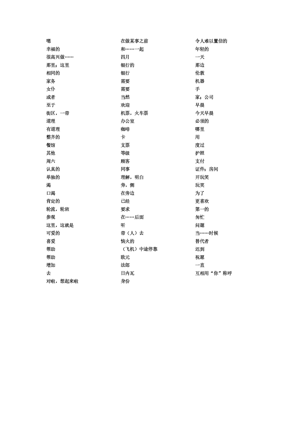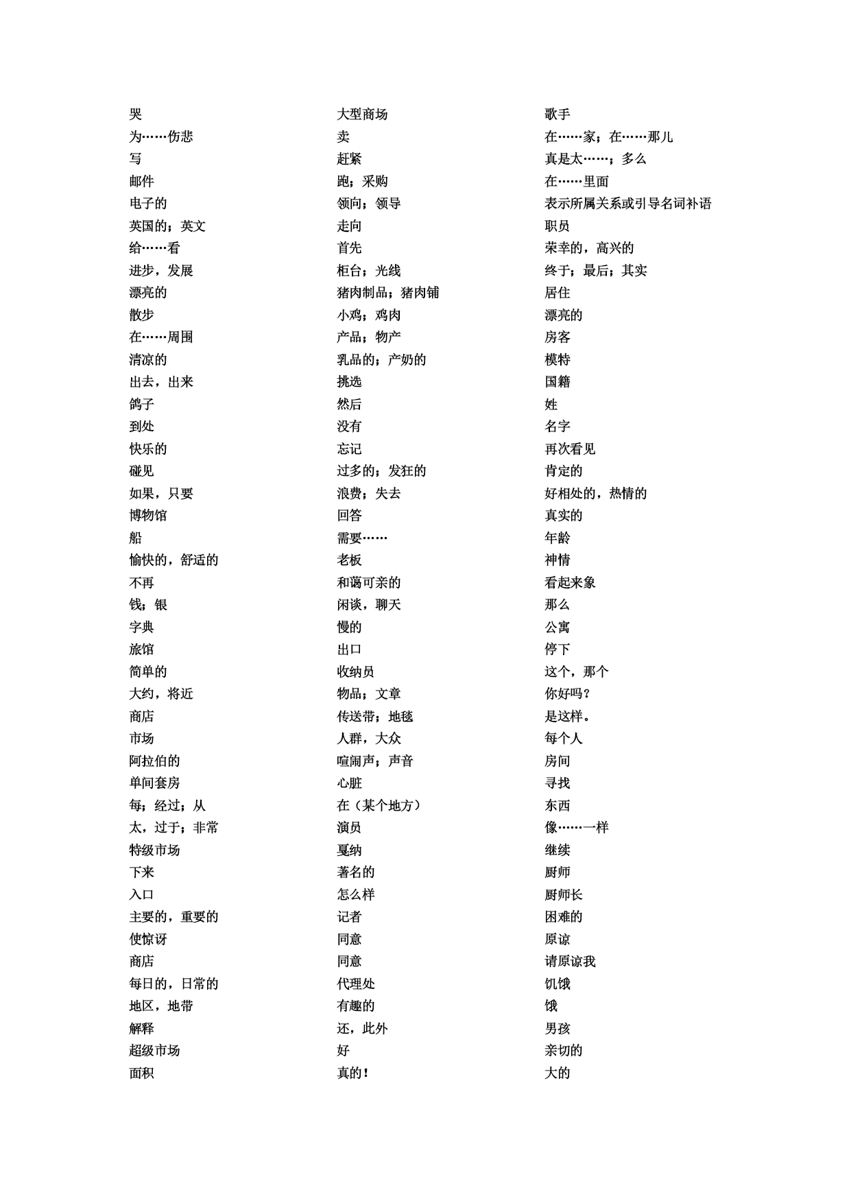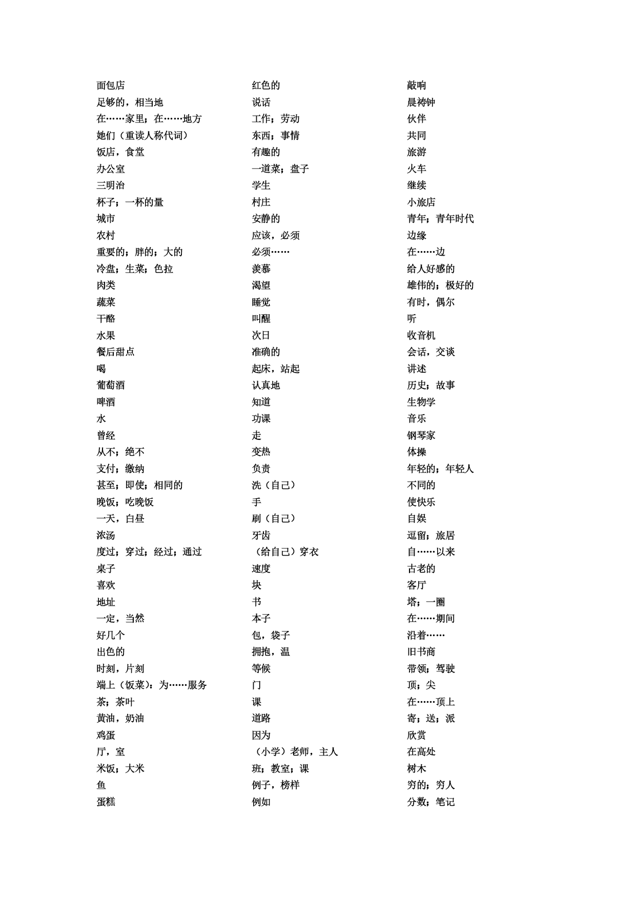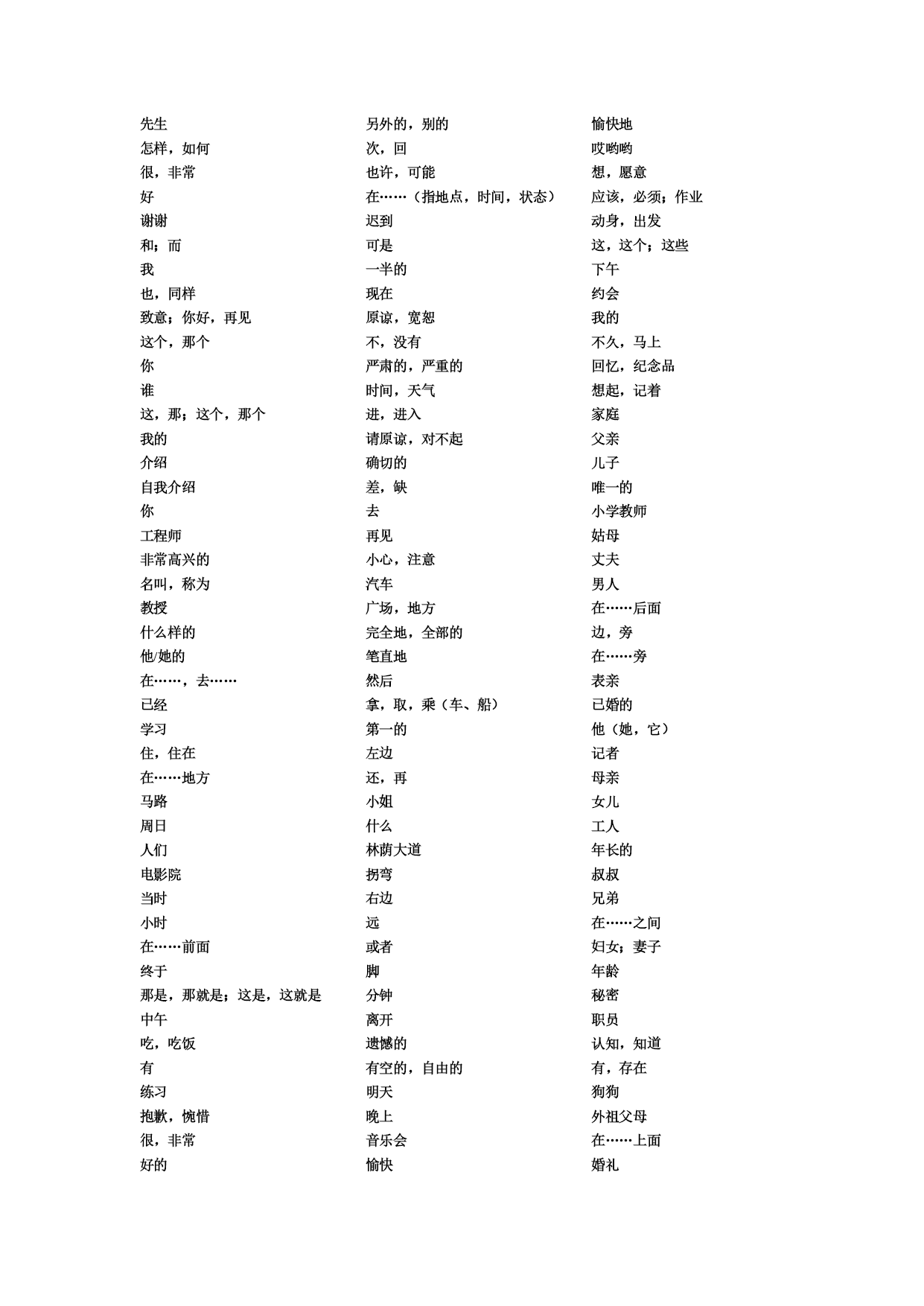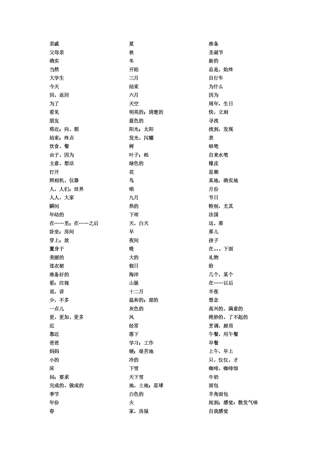 先生 怎样,如何 很,非常 好 谢谢 和;而 我 也,同样 致意;你好,再见 这个,那个 你 谁 这,那;这个,那个 我的 介绍 自我介绍 你 工程师 非常高兴的 名叫,称为 教授 什么样的 他/她的 在……,去…… 已经 学习 住,住在 在……地方 马路 周日 人们 电影院 当时 小时 在……前面 终于 那是,那就是;这是,这就是 中午 吃,吃饭 有 练习 抱歉,惋惜 很,非常 好的 另外的,别的 次,回 也许,可能 在……(指地点,时间,状态) 迟到 可是 一半的 现在 原谅,宽恕 不,没有 严肃的,严重的 时间,天气 进,进入 请原谅,对不起 确切的 差,缺 去 再见 小心,注意 汽车 广场,地方 完全地,全部的 笔直地 然后 拿,取,乘(车、船) 第一的 左边 还,再 小姐 什么 林荫大道 拐弯 右边 远 或者 脚 分钟 离开 遗憾的 有空的,自由的 明天 晚上 音乐会 愉快 愉快地 哎哟哟 想,愿意 应该,必须;作业 动身,出发 这,这个;这些 下午 约会 我的 不久,马上 回忆,纪念品 想起,记着 家庭 父亲 儿子 唯一的 小学教师 姑母 丈夫 男人 在……后面 边,旁 在……旁 表亲 已婚的 他(她,它) 记者 母亲 女儿 工人 年长的 叔叔 兄弟 在……之间 妇女;妻子 年龄 秘密 职员 认知,知道 有,存在 狗狗 外祖父母 在……上面 婚礼 亲戚 父母亲 确实 当然 大学生 今天 回,返回 为了 看见 朋友 将近;向,朝 结束;终点 饮食,餐 由于,因为 主意,想法 打开 照相机,仪器 人,人们;世界 人人,大家 瞬间 年幼的 在……里;在……之后 卧室;房间 穿上;放 置身于 美丽的 连衣裙 准备好的 看;注视 说,讲 少,不多 一点儿 更,更加,更多 近 靠近 爸爸 妈妈 小的 床 问;要求 完成的,做成的 季节 年份 春 夏 秋 冬 开始 三月 结束 六月 天空 明亮的;清楚的 蓝色的 阳光;太阳 发光,闪耀 树 叶子;纸 绿色的 花 鸟 唱 九月 热的 下雨 天,白天 早 夜间 晚 大的 假日 海洋 山脉 十二月 温和的;甜的 灰色的 风 经常 落下 学习;工作 硬;艰苦地 冷的 下雪 天下雪 地,土地;星球 白色的 火 家,房屋 准备 圣诞节 新的 总是,始终 自行车 为什么 因为 周年,生日 快,立刻 寻找 找到,发现 表 铅笔 自来水笔 橡皮 星期 真地,确实地 月份 节日 特别,尤其 法国 这,那 那儿 孩子 在。。。下面 礼物 给 几个,某个 在……以后 半夜 想念 高兴的,满意的 绝妙的,了不起的 烹调,厨房 午餐,用午餐 早餐 上午,早上 只,仅仅,才 咖啡,咖啡馆 牛奶 面包 羊角面包 闻到;感觉:散发气味 自我感觉 面包店 足够的,相当地 在……家里;在……地方 她们(重读人称代词) 饭店,食堂 办公室 三明治 杯子;一杯的量 城市 农村 重要的;胖的;大的 冷盘;生菜;色拉 肉类 蔬菜 干酪 水果 餐后甜点 喝 葡萄酒 啤酒 水 曾经 从不;绝不 支付;缴纳 甚至;即使;相同的 晚饭;吃晚饭 一天,白昼 浓汤 度过;穿过;经过;通过 桌子 喜欢 地址 一定,当然 好几个 出色的 时刻,片刻 端上(饭菜):为……服务 茶;茶叶 黄油,奶油 鸡蛋 厅,室 米饭;大米 鱼 蛋糕 红色的 说话 工作;劳动 东西;事情 有趣的 一道菜;盘子 学生 村庄 安静的 应该,必须 必须…… 羡慕 渴望 睡觉 叫醒 次日 准确的 起床,站起 认真地 知道 功课 走 变热 负责 洗(自己) 手 刷(自己) 牙齿 (给自己)穿衣 速度 块 书 本子 包,袋子 拥抱,温 等候 门 课 道路 因为 (小学)老师,主人 班;教室;课 例子,榜样 例如 敲响 晨祷钟 伙伴 共同 旅游 火车 继续 小旅店 青年;青年时代 边缘 在……边 给人好感的 雄伟的;极好的 有时,偶尔 听 收音机 会话,交谈 讲述 历史;故事 生物学 音乐 钢琴家 体操 年轻的;年轻人 不同的 使快乐 自娱 逗留;旅居 自……以来 古老的 客厅 塔;一圈 在……期间 沿着…… 旧书商 带领;驾驶 顶;尖 在……顶上 寄;送;派 欣赏 在高处 树木 穷的;穷人 分数;笔记 哭 为……伤悲 写 邮件 电子的 英国的;英文 给……看 进步,发展 漂亮的 散步 在……周围 清凉的 出去,出来 鸽子 到处 快乐的 碰见 如果,只要 博物馆 船 愉快的,舒适的 不再 钱;银 字典 旅馆 简单的 大约,将近 商店 市场 阿拉伯的 单间套房 每;经过;从 太,过于;非常 特级市场 下来 入口 主要的,重要的 使惊讶 商店 每日的,日常的 地区,地带 解释 超级市场 面积 大型商场 卖 赶紧 跑;采购 领向;领导 走向 首先 柜台;光线 猪肉制品;猪肉铺 小