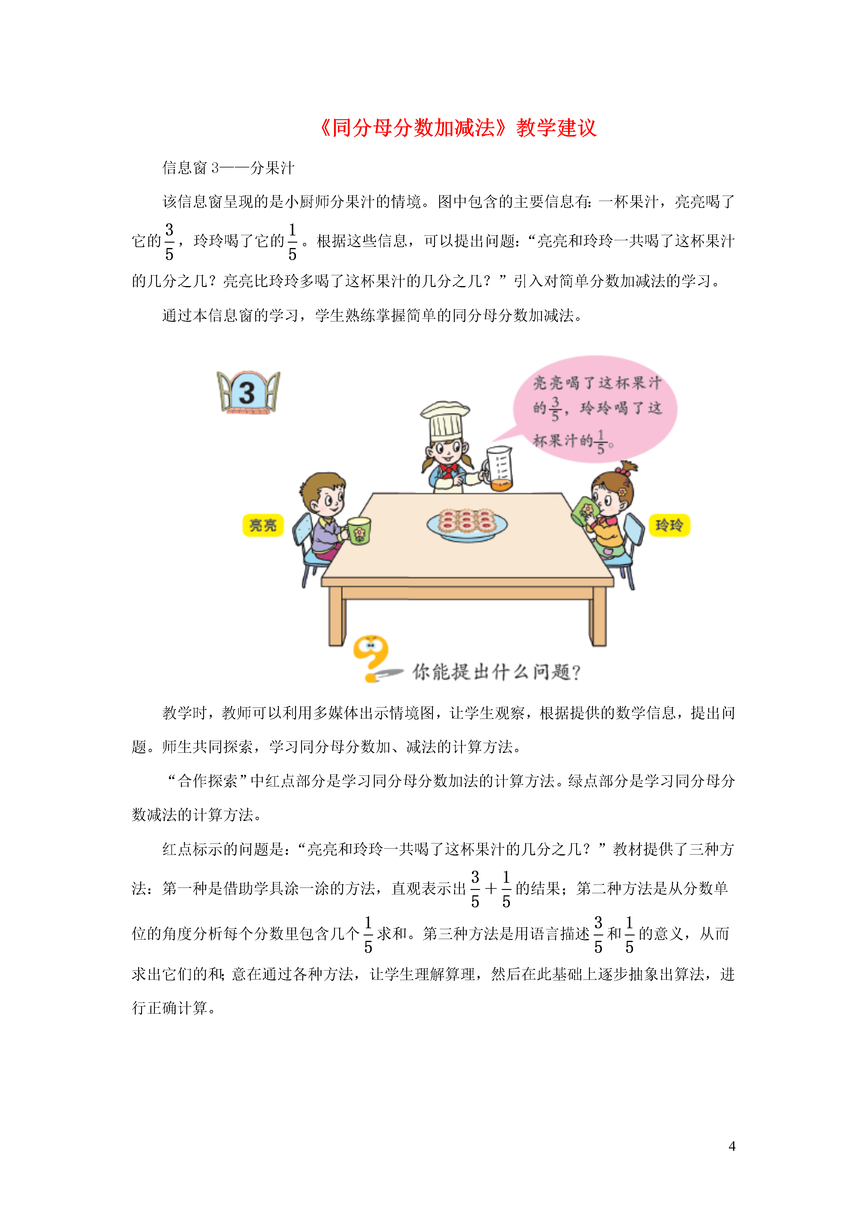 4《同分母分数加减法》教学建议信息窗3——分果汁该信息窗呈现的是小厨师分果汁的情境。图中包含的主要信息有:一杯果汁,亮亮喝了它的,玲玲喝了它的。根据这些信息,可以提出问题:“亮亮和玲玲一共喝了这杯果汁的几分之几?亮亮比玲玲多喝了这杯果汁的几分之几?”引入对简单分数加减法的学习。通过本信息窗的学习,学生熟练掌握简单的同分母分数加减法。教学时,教师可以利用多媒体出示情境图,让学生观察,根据提供的数学信息,提出问题。师生共同探索,学习同分母分数加、减法的计算方法。“合作探索”中红点部分是学习同分母分数加法的计算方法。绿点部分是学习同分母分数减法的计算方法。红点标示的问题是:“亮亮和玲玲一共喝了这杯果汁的几分之几?”教材提供了三种方法:第一种是借助学具涂一涂的方法,直观表示出+的结果;第二种方法是从分数单位的角度分析每个分数里包含几个求和。第三种方法是用语言描述和的意义,从而求出它们的和;意在通过各种方法,让学生理解算理,然后在此基础上逐步抽象出算法,进行正确计算。教学红点部分时,应先让学生根据加法的意义,列出加法算式,然后想办法求出结果。学生可能会出现多种方法,汇报时应让学生充分交流,发表自己的意见,只要说得有道理,教师都要予以肯定。对于分数加法的计算,学生应该在理解算理的基础上,学会计算方法。绿点标示的问题是:“亮亮比玲玲多喝了这杯果汁的几分之几?”教材只提供算式,意在放手让学生自己解决问题。教学中,可先让学生独立列式计算,然后通过交流与反思,明白算理,学会算法。“自主练习”第1题“算一算”,让学生借助图片,充分理解简单同分母分数加减法的算理。第2题是直接写得数,交流时,教师可以让学生进一步分析算理,说说算法。第3题是通过涂色、计算,知道分子、分母相等的分数就是10练习时,先让学生弄清两个孩子分别涂了长方形的几分之几,再让学生计算一共涂了几分之几,然后引导学生观察涂色部分是长方形的全部,即+=,也就是1。此外,教师还可以呈现其他分数的素材,引导学生利用充分感知、体验所有分子分母相同的分数都是1。第4题是一道算式与得数的连线题。练习时,可以先计算得数,然后连一连。第5题是一道简单分数加减法解决实际问题的题。练习时,可让学生独立解答,交流时让学生说说自己的想法。教师也可以利用多媒体课件演示的方法帮学生更好地理解题意。第6题是一道巩固分数意义和分数加、减法的综合性题目。练习时,可以先让学生仔细看图,弄清楚是把一个杯子平均分成了几份,再让学生根据杯子中水的变化情况写出分数,然后在小组内充分交流。第7题是一道利用分数的加减法解决实际问题的题目。练习时,可以让学生用画一画的方法,将红旗、五角星、小花所用的份数在红纸上表示出来。这样一目了然,能判断出这张红纸是否用完。这里再一次让学生理解体验分子、分母相等的分数就是1。第9题是一道分数比较大小的选择题。学生通过排除法,可以将答案锁定在③④之间,通过“多一些”的提示,最后确定答案为③。此题除了考察同分母分数的比较大小方法,还培养了学生的数感。我学会了吗?这幅图呈现了两个小朋友在拼摆一副美丽的图画的情境。教师先引导学生看明白图意,再让学生运用本单元所学的知识独立解决,然后进行自我评价。教师要对学生反馈的问题进行有针对性的指导。在此基础上,引导学生通过回顾与反思,总结自己学习本单元的主要收获。
