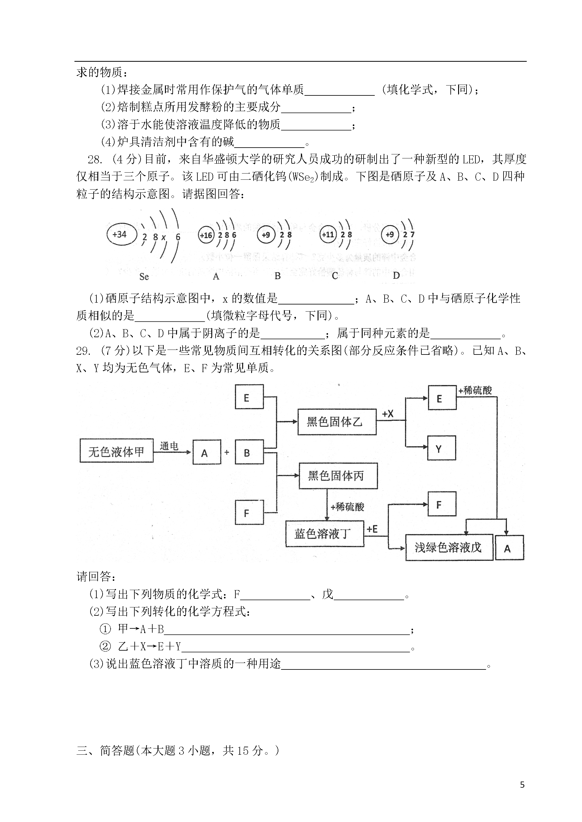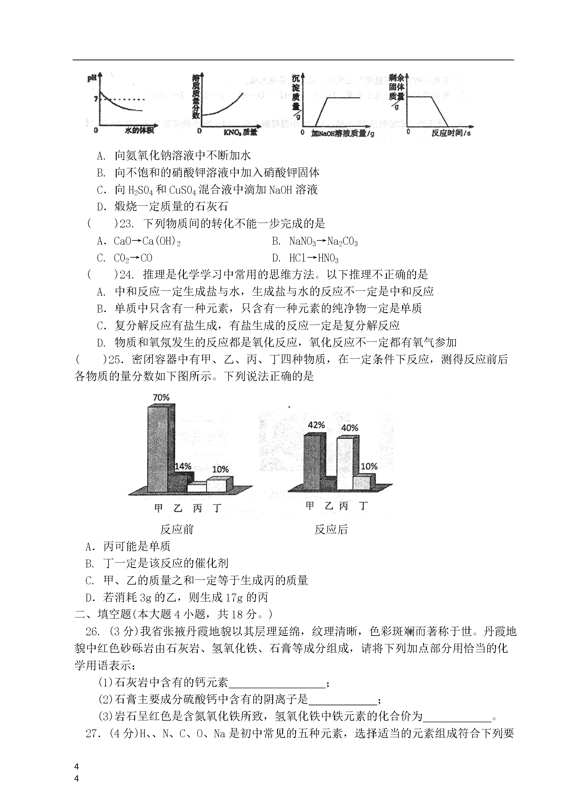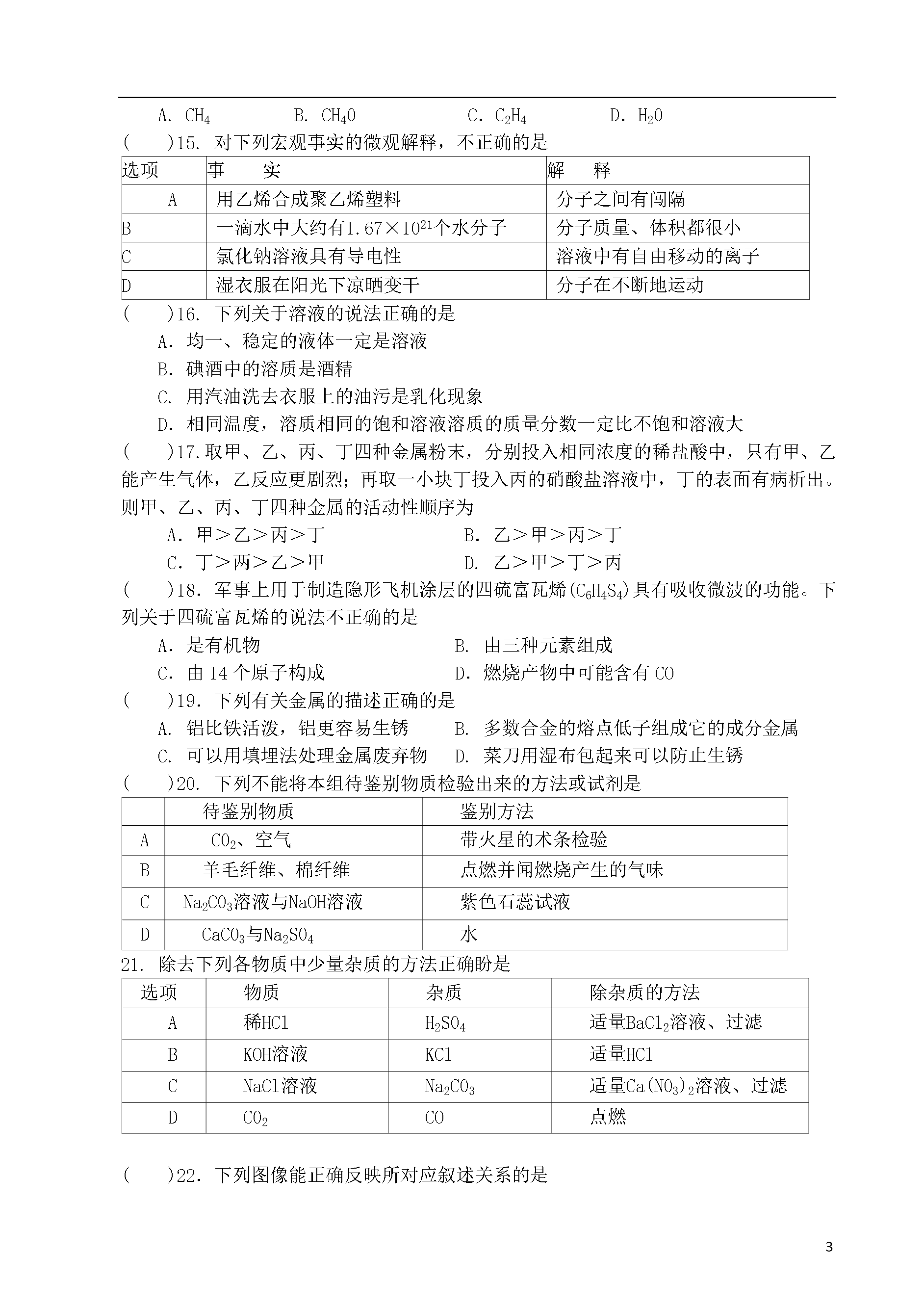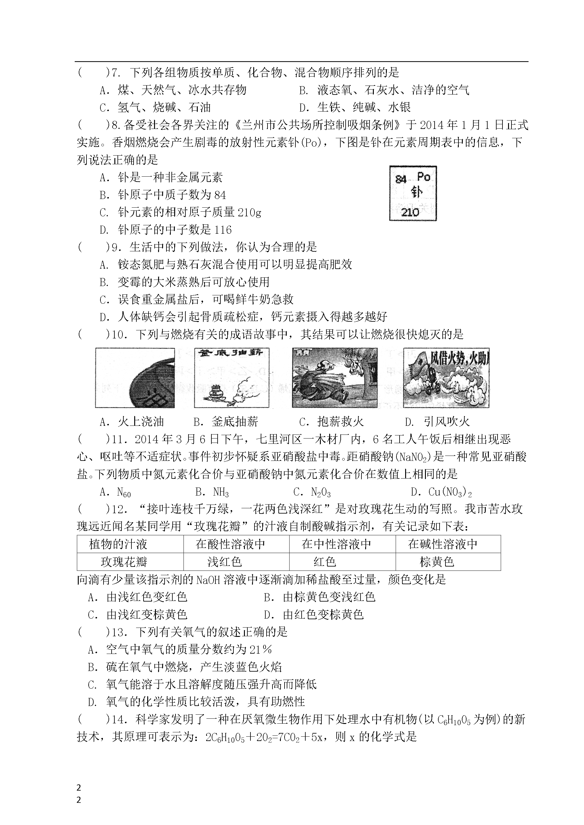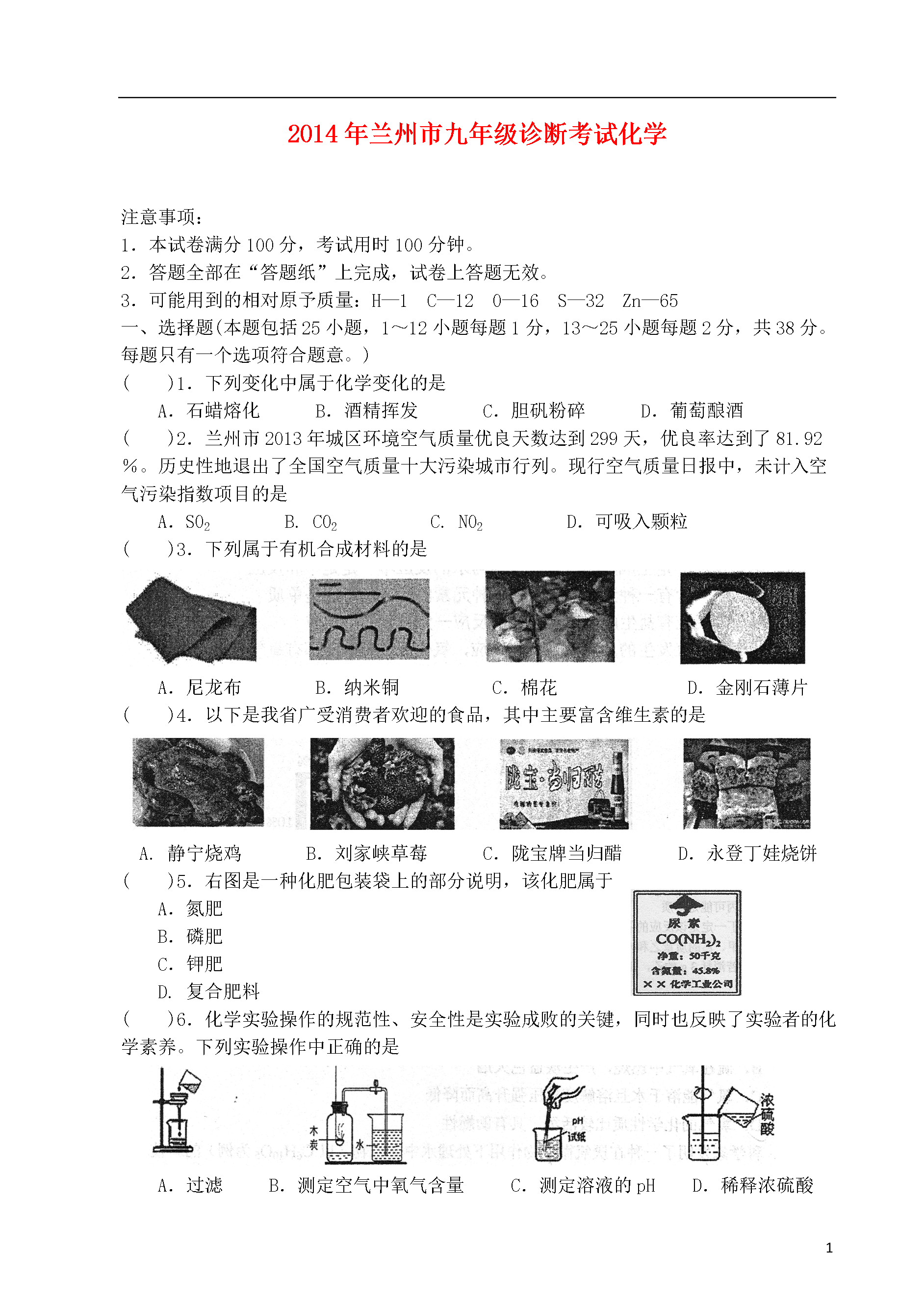 101092014年兰州市九年级诊断考试化学注意事项:1.本试卷满分100分,考试用时100分钟。2.答题全部在“答题纸”上完成,试卷上答题无效。3.可能用到的相对原予质量:H—1C—120—16S—32Zn—65一、选择题(本题包括25小题,1~12小题每题1分,13~25小题每题2分,共38分。每题只有一个选项符合题意。)()1.下列变化中属于化学变化的是A.石蜡熔化B.酒精挥发C.胆矾粉碎D.葡萄酿酒()2.兰州市2013年城区环境空气质量优良天数达到299天,优良率达到了81.92%。历史性地退出了全国空气质量十大污染城市行列。现行空气质量日报中,未计入空气污染指数项目的是A.S02B.C02C.N02D.可吸入颗粒()3.下列属于有机合成材料的是A.尼龙布B.纳米铜C.棉花D.金刚石薄片()4.以下是我省广受消费者欢迎的食品,其中主要富含维生素的是A.静宁烧鸡B.刘家峡草莓C.陇宝牌当归醋D.永登丁娃烧饼()5.右图是一种化肥包装袋上的部分说明,该化肥属于A.氮肥B.磷肥C.钾肥D.复合肥料()6.化学实验操作的规范性、安全性是实验成败的关键,同时也反映了实验者的化学素养。下列实验操作中正确的是A.过滤B.测定空气中氧气含量C.测定溶液的pHD.稀释浓硫酸()7.下列各组物质按单质、化合物、混合物顺序排列的是A.煤、天然气、冰水共存物B.液态氧、石灰水、洁净的空气C.氢气、烧碱、石油D.生铁、纯碱、水银()8.备受社会各界关注的《兰州市公共场所控制吸烟条例》于2014年1月1日正式实施。香烟燃烧会产生剧毒的放射性元素钋(Po),下图是钋在元素周期表中的信息,下列说法正确的是A.钋是一种非金属元素B.钋原子中质子数为84C.钋元素的相对原子质量210gD.钋原子的中子数是116()9.生活中的下列做法,你认为合理的是A.铵态氮肥与熟石灰混合使用可以明显提高肥效B.变霉的大米蒸熟后可放心使用C.误食重金属盐后,可喝鲜牛奶急救D.人体缺钙会引起骨质疏松症,钙元素摄入得越多越好()10.下列与燃烧有关的成语故事中,其结果可以让燃烧很快熄灭的是A.火上浇油B.釜底抽薪C.抱薪救火D.引风吹火()11.2014年3月6日下午,七里河区一木材厂内,6名工人午饭后相继出现恶心、呕吐等不适症状。事件初步怀疑系亚硝酸盐中毒。距硝酸钠(NaN02)是一种常见亚硝酸盐。下列物质中氮元素化合价与亚硝酸钠中氮元素化合价在数值上相同的是A.N60B.NH3C.N203D.Cu(N03)2()12.“接叶连枝千万绿,一花两色浅深红”是对玫瑰花生动的写照。我市苦水玫瑰远近闻名某同学用“玫瑰花瓣”的汁液自制酸碱指示剂,有关记录如下表:植物的汁液在酸性溶液中在中性溶液中在碱性溶液中玫瑰花瓣浅红色红色棕黄色向滴有少量该指示剂的NaOH溶液中逐渐滴加稀盐酸至过量,颜色变化是A.由浅红色变红色B.由棕黄色变浅红色C.由浅红变棕黄色D.由红色变棕黄色()13.下列有关氧气的叙述正确的是A.空气中氧气的质量分数约为21%B.硫在氧气中燃烧,产生淡蓝色火焰C.氧气能溶于水且溶解度随压强升高而降低D.氧气的化学性质比较活泼,具有助燃性()14.科学家发明了一种在厌氧微生物作用下处理水中有机物(以C6H1005为例)的新技术,其原理可表示为:2C6H1005+202=7C02+5x,则x的化学式是A.CH4B.CH40C.C2H4D.H20()15.对下列宏观事实的微观解释,不正确的是选项事实解释A用乙烯合成聚乙烯塑料分子之间有闯隔B一滴水中大约有1.67×1021个水分子分子质量、体积都很小C氯化钠溶液具有导电性溶液中有自由移动的离子D湿衣服在阳光下凉晒变干分子在不断地运动()16.下列关于溶液的说法正确的是A.均一、稳定的液体一定是溶液B.碘酒中的溶质是酒精C.用汽油洗去衣服上的油污是乳化现象D.相同温度,溶质相同的饱和溶液溶质的质量分数一定比不饱和溶液大()17.取甲、乙、丙、丁四种金属粉末,分别投入相同浓度的稀盐酸中,只有甲、乙能产生气体,乙反应更剧烈;再取一小块丁投入丙的硝酸盐溶液中,丁的表面有病析出。则甲、乙、丙、丁四种金属的活动性顺序为A.甲>乙>丙>丁B.乙>甲>丙>丁C.丁>两>乙>甲D.乙>甲>丁>丙()18.军事上用于制造隐形飞机涂层的四硫富瓦烯(C6H4S4)具有吸收微波的功能。下列关于四硫富瓦烯的说法不正确的是A.是有机物B.由三种元素组成C.由14个原子构成D.燃烧产物中可能含有CO()19.下列有关金属的描述正确的是A.铝比铁活泼,铝更容易生锈B.多数合金的熔点低子组成它的成分金属C.可以用填埋法处理金属废弃物D.菜刀用湿布包起来可以防止生锈()20.下列不能将本组待鉴别物质检验出来的方法或试剂是待鉴别物质鉴别方法AC02、空气带火星的术条