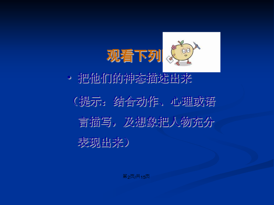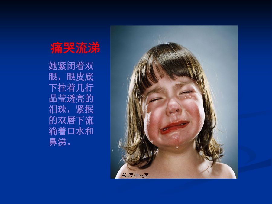 会计学观看下列图片哈哈大笑痛哭流涕怒发冲冠呆若木鸡目瞪口呆眉飞色舞挤眉弄眼脸色苍白心不在焉 咬紧牙关目不转睛瞥了一眼眉头一皱大惊失色屏息静气她眉头一皱,咬紧牙关,脸色青紫。看她那痛苦的样子,我实在不忍心,轻轻地说:“你如果受不了,就说一声,咱们不跑了!”“没事,我能挺住。”她眼眶中已经有泪水打转……最终我们跑完了全程。我看了看她说:“你的伤没事吧?”她脸色苍白,声音颤抖着说:“没事。”人物的神态能够非常强烈的表现人物当时的思想感情。神态描写给下列描写神态的句子配对。 紧张时嘴角上泛起一阵涟漪,眼睛笑成了一条缝。 愤怒时鼻子两翼一掀一掀,眼睛里充满了泪水。 伤心时不住地喘气,脸色灰白,双眉紧锁,一句话也说不出来。 高兴时竖起了眉毛,眼珠子瞪得像要弹出来似的。 发愣时两眼直呆呆向前望去,木头一般地站在那里。补充练习常见的神态描写 高兴时:眼睛弯成了两个月牙;眼睛眯成了一条缝,嘴角上翘;眉角含笑;…… 伤心时:鼻子两翼抽动;眼眶充满泪水;…… 紧张时:脸色灰白;鼻尖冒汗;…… 愤怒时:牙齿咬得“咯咯”响;竖起了眉毛;眼珠圆瞪;铁青着脸;眼睛射出两道寒光,咄咄逼人;…… 发愣时:两眼呆呆盯着前方;…… 害怕时:吓得面色如土;脸像蜡一样黄;嘴唇发白;……描写人物在某种情境中的神态。(二选一) 1、课堂上,某位同学意识回答不出老师的问题时…… 2、某某在他人的捉弄下,喝了一种极辣(或极酸)的调味品时……THANKS