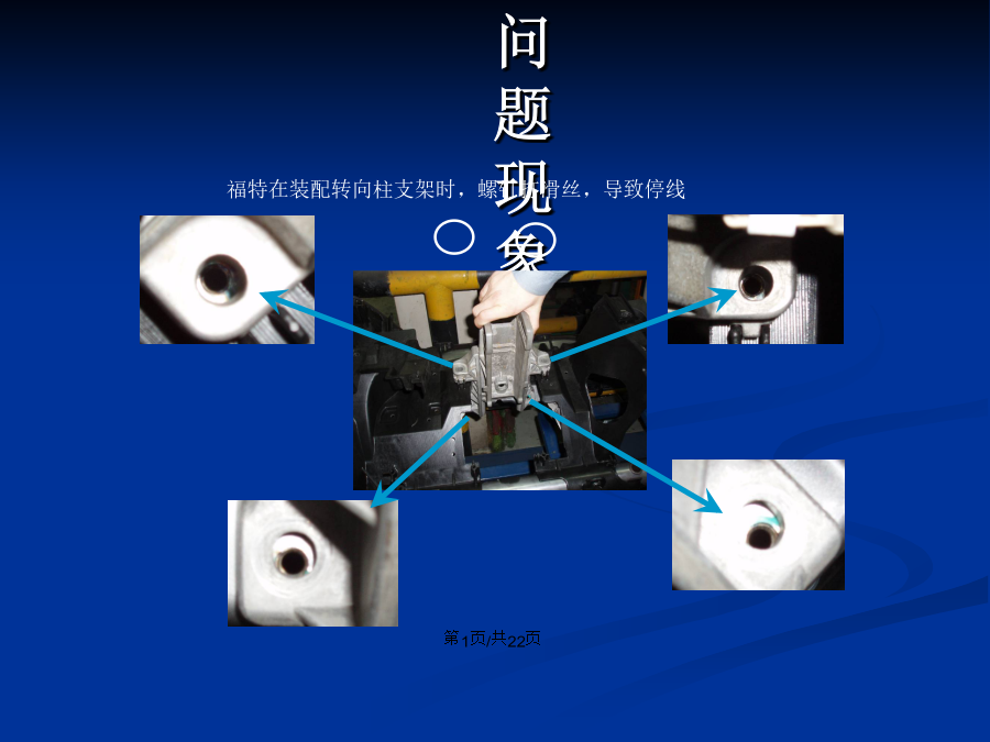 会计学问题现象为了方便大家能系统的了解该问题,我将整理后构成的流程如汇总如下,大家可以结合该流程图了解后续各项中的详细说明:Why1:为什么福特操作工在打螺钉时会出现打滑丝现象?Why2:为什么会出现孔位对不正现象?Why2:为什么会出现孔位对不正现象?Why3:为什么会出现装配位置不到位现象?如下图所示,除连接到CCB上的两颗螺栓以外的其它部分完全悬空,但有两个限位筋,可以限制转向柱支架在Y轴和Z轴方向位移,X轴方向没有限位设计。由于注塑拔模斜度的原因,导致X、Y轴两个限位销上、下尺寸不一致,其最上端尺寸7mm,而转向柱支架配合孔尺寸为:7.2mm,所以导致员工在装配时转向柱支架与数模状态有0.2mm的活动空间。Why3:为什么会出现装配位置不到位现象?Why3:为什么会出现装配位置不到位现象?Why4:为什么下体骨架上紧固转向柱支架的螺钉孔位置会出现变差?导致螺钉孔位置变差的原因: 2、下体骨架在注塑过程中CCB定位不准确;(从以下a、b、c三方面描述该因素) a、如下图所示,IP总成上与CCB配合的不仅仅是转向柱支架,同时也会装配风机,如果CCB整体定位不准确会导致风机无法装配,因此可以直接发现该现象。Why4:为什么下体骨架上紧固转向柱支架的螺钉孔位置会出现变差?Why4:为什么下体骨架上紧固转向柱支架的螺钉孔位置会出现变差?Why5:为什么CCB在模具上的定位系统会失效?长定位销Why5:为什么CCB在模具上的定位系统会失效?YFV需做改善措施汇总结束