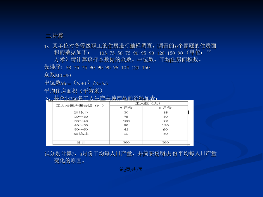 会计学8.某连续变量分组数列,为开口组,下限为500,邻组组中值为480,则末组的组中值为(A) 10.一般情况下,按成绩分组的学生人数表现为(A) A,钟形,形,形,D.其他 11.调查时间的含义是(A) A.调查资料所属的时间,B.进行调查的时间, C.调查工作期限,D.调查资料报送的时间 12.对全市工业企业职工的生活情况进行调查,调查对象是(B) A.该市全部工业企业,B.该市全部工业企业的所有职工, C.该市每一个工业企业,D.该市各工业企业的职工 13.计算平均指标最常用的方法和最基本的形式是(D) A.中位数,B.众数,C.调和平均数,D.算术平均数 14.抽样调查的主要目的是(B) A.计算和控制抽样误差,B.推断总体总量,C.对调查单位做深入研究,D.广泛运用数学方法 15.下列相对数中,属于不同时期对比的指标有(B) A.结构相对数B.动态相对数C.比较相对数D.强度相对数 16.统计分组的关键在于(A) A.正确选择分组标志,B.正确确定组限与组距, C.正确划分分组界限,D.正确选择分组数列的类型 二.计算7月份平均每人日产量=37件 8月份平均每人日产量=44件 根据计算结果得知8月份比7月份平均每人日产量多7件。其原因是不同日产量水平的工人所占比重发生变化所致。7月份工人日产量在40件以上的工人只占全部工人数的40%,而8月份这部分工人所占比重则为%。三、简答