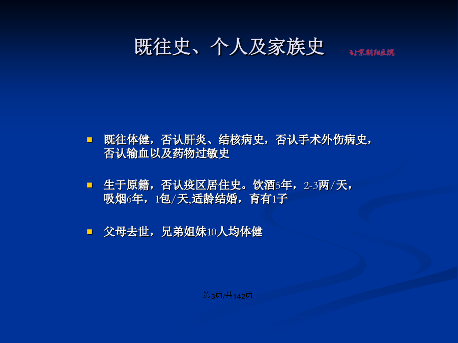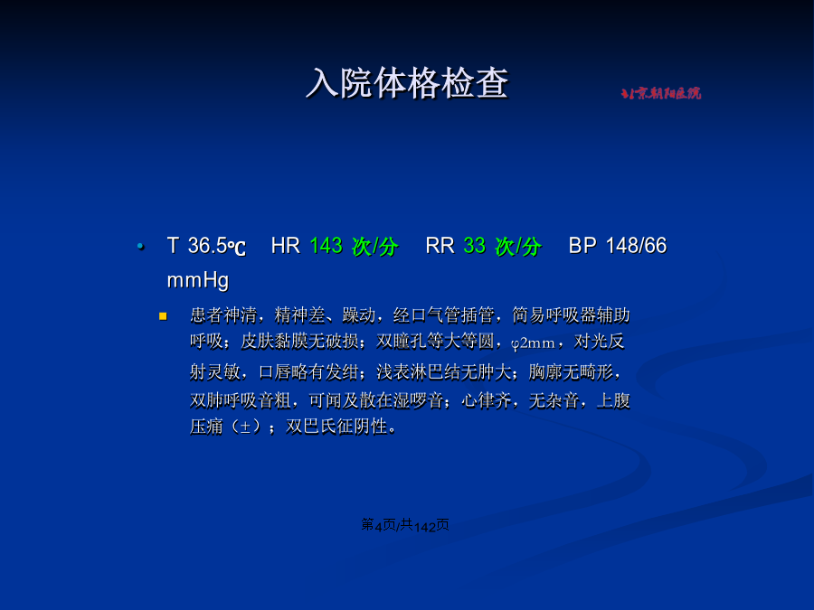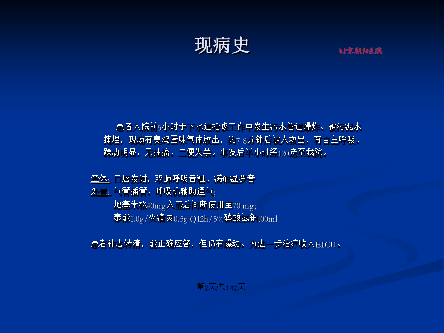 会计学病例1`现病史既往史、个人及家族史入院体格检查入院时辅助检查入院时胸片入院诊断诊疗经过(一)诊疗经过(一)诊疗经过(二)诊疗经过(二)出院诊断奇异变形杆菌(3月3日,痰,1次) 鲍曼不动杆菌(3月9日-4月9日,痰,10次) MRSA(3月10日-4月20日,痰,11次;6月4日,导管头,1次) 铜绿假单胞菌(3月12日-4月2日,痰,7次) 屎肠球菌、VRE(3月17日,直肠拭子,1次) 肺炎克雷(3月23-24日,痰,2次) 人葡萄球菌(4月22日,血,1次) 抗真菌药物使用剂量及时间住院期间肝酶变化情况尖端赛多胞菌对肺部的侵袭性感染及恢复情况患者照片病例2病史外院辅助检查外院辅助检查入院辅助检查胸片3.25诊疗经过诊疗经过辅助检查辅助检查血常规生化病原学检查诊疗经过---体温氧合指数影像学变化4.3双肺炎症 较3.29好转 右侧胸腔积液4.1胸部CT4.7胸部CT患者:XXX,男,21岁,汉族,未婚,北京怀柔区农民,于2009年5月12日凌晨01:30时收入EICU病房。 主诉:反复发热伴咳嗽4天,气促1天。患者入院前4天晚20:00左右出现发热,伴咳嗽,无寒战胸痛咯痰,无气促心悸等症,前往怀柔区第一人民医院急诊就诊,当时测体温为39.5℃,拍胸片提示右下肺炎,查血常规示白细胞20.4×109/L,当地医院给予“头孢呋辛”抗感染治疗3天,体温逐渐下降,但仍有咳嗽,并出现气促。入院当天晚22:00为进一步诊治来我院急诊抢救室,行胸片检查提示“右下肺阴影,双侧胸腔积液”,血常规示白细胞6.69×109/L,血气分析示PH7.368,PCO239.7mmHg,PO262.1mmHg,BE-1.6mmol/L,收入EICU治疗。患者自发病以来,食欲可,睡眠可,大小便正常,反复发热,体温波动在37.0-39.0℃,咳嗽,无痰。否认肝炎、结核病史。 银屑病病史7年,曾在北京中医院住院,行中药治疗(具体不详),此后病情时有反复,间断使用中药,治疗有效。 抑郁症病史2年,多次在北京中医院和安定医院治疗,现服用“倍他乐克、富马酸喹硫平片、劳拉西泮、氢溴酸西酞普兰片、丙戊酸钠”。 否认药物过敏史。未到过疫区及牧区,其密切接触人员无类似发热者。生于北京,久居本地,无传染病接触史。否认吸烟史、嗜酒史。 母亲有银屑病史,父亲体健。否认家族遗传病史。T37.1℃P80次/分R20次/分BP120/70mmHg 神清,精神差,半卧位,查体合作。全身皮肤可见散在红斑,表面脱屑,双肺呼吸音粗,可闻及散在哮鸣音。右下肺可闻及细湿啰音。心率87次/分,律齐,无杂音,腹软,无压痛,肝脾肋下未触及,肠鸣音3次/分。双下肢无水肿。生理反射正常存在,病理反射未引出。辅助检查辅助检查心电图(2009-5-12)胸片(2009-5-11)胸部CT(2009-5-11) 重症肺炎 急性呼吸窘迫综合征 双侧胸腔积液 肝功能损害 低蛋白血症 抑郁症 银屑病 文丘里面罩吸氧FIO250% 泰能0.5gQ6h+希舒美0.5gQd 地塞米松5mgQ8h 白蛋白20gQd+丙种球蛋白20gQd+胸腺五肽1mgQ12h 乌司他丁10万uQ4h 患者经上述治疗后仍呼吸窘迫,持续高热。2009-5-14复查胸部CT,见后图。5月14日复查胸部高分辨CT/病毒六项(2009-5-13)(-) 抗中性粒细胞胞浆抗体-ANCA(2009-5-14):(-) PPD试验(2009-5-14):(-) RF、ASO(2009-5-14):(-) 胃内容物OB(2009-5-14):(+) 降钙素原(2009-5-14):0.93ng/ml,提示可能有较严重感染 多次痰细菌培养+真菌培养(-)5月14日2pm 气管插管机械通气。 力月西和冬眠合剂(氯丙嗪50mg+异丙嗪50mg+杜冷丁100mg) 泰能0.5gQ6h+希舒美0.5gQd+斯沃0.6gQ12h+科赛斯70mgQd 停地米,改甲强龙40mgQd 丙种球蛋白20gQd+胸腺五肽1mgQ12h 5月15日8am 泰能0.5gQ6h美平1.0gQ8h+斯沃0.6gQ12h+科赛斯50mgQd 白蛋白20gQd+丙种球蛋白20gQd+日达仙1.6mgQ12h 甲强龙40mgQ12h 乌司他丁10万uQ4h5月15日3pm 行床旁纤维支气管镜检查:镜下可见较多黄脓性分泌物,粘膜充血明显,右肺中叶灌洗出30ml脓血性液体 送检细菌、真菌、PCP、结核杆菌等相关化验。 上述结果均阴性。白细胞手工分类5月19日1pm 拔除气管插管无创通气鼻导管吸氧 美平1.0gQ8h舒普深3gQ8h+斯沃0.6gQ12h+科赛斯50mgQd 日达仙1.6mgQ12h 5月25日 头孢米诺2.0gQ8h+去甲万古霉素0.8gQ12h 5月26日转入