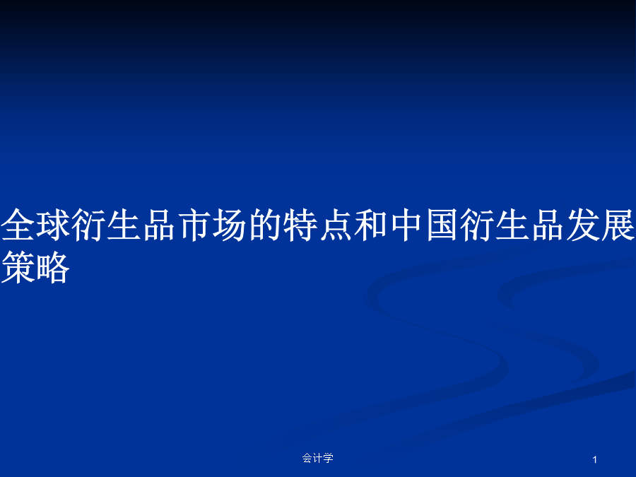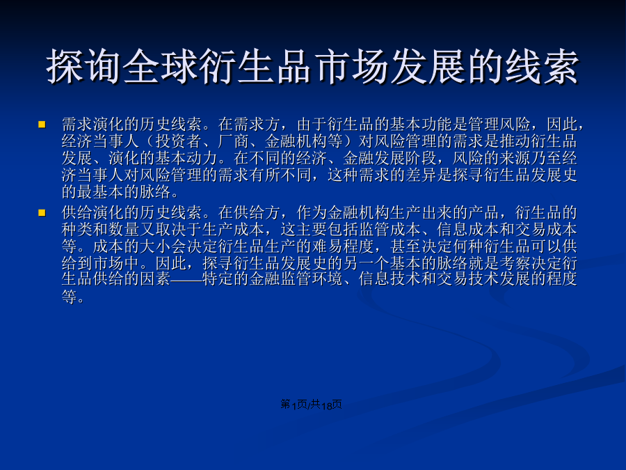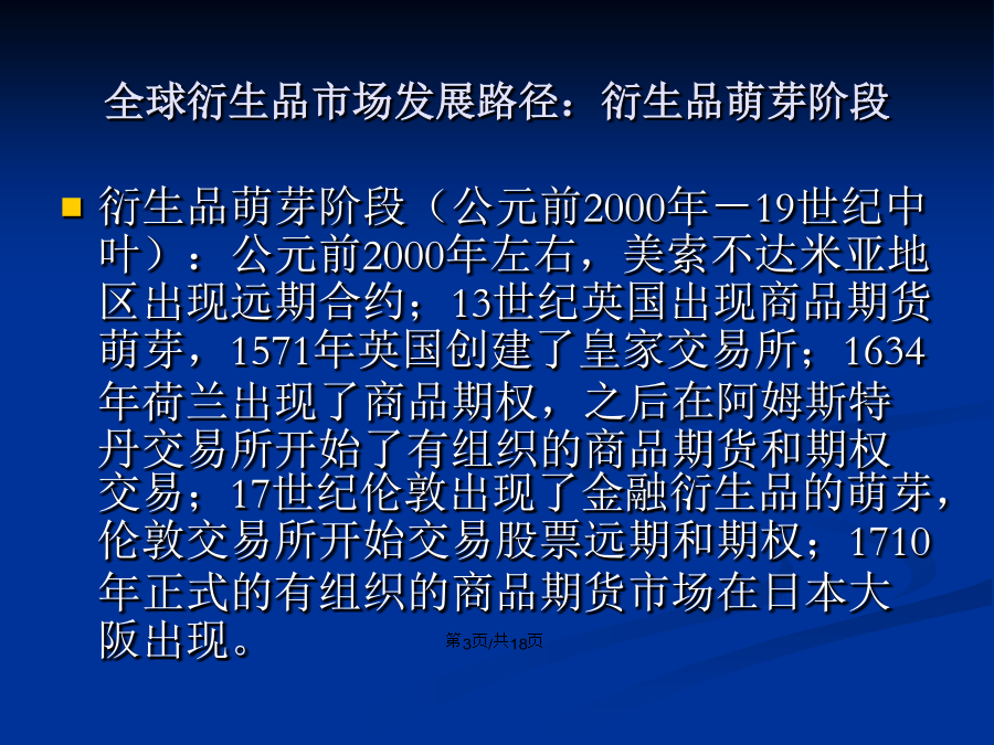 会计学探询全球衍生品市场发展的线索全球衍生品市场发展路径:衍生品萌芽阶段全球衍生品市场发展路径:商品衍生品阶段全球衍生品市场发展路径:金融衍生品阶段1-利率和汇率衍生品时代全球衍生品市场发展路径:金融衍生品阶段2-信用衍生品时代近十年全球衍生品市场特点:金融衍生品占主导近十年全球衍生品市场特点:场外金融衍生品占主导且占比呈上升态势近十年全球衍生品市场特点:信用衍生品市场的崛起和调整近十年全球衍生品市场特点:场内衍生品被美欧交易所垄断近十年全球衍生品市场特点:场外衍生品被美欧金融机构垄断中国衍生品市场尚处于商品衍生品阶段中国衍生品市场尚处于商品衍生品阶段扭转两个不平衡,从商品衍生品阶段到金融衍生品阶段扭转两个不平衡、直接进入信用衍生品时代:信用衍生品中国发展信用衍生品的优势中国发展信用衍生品的障碍