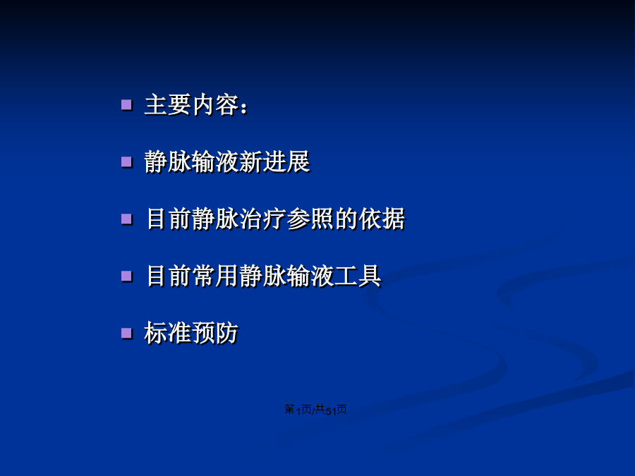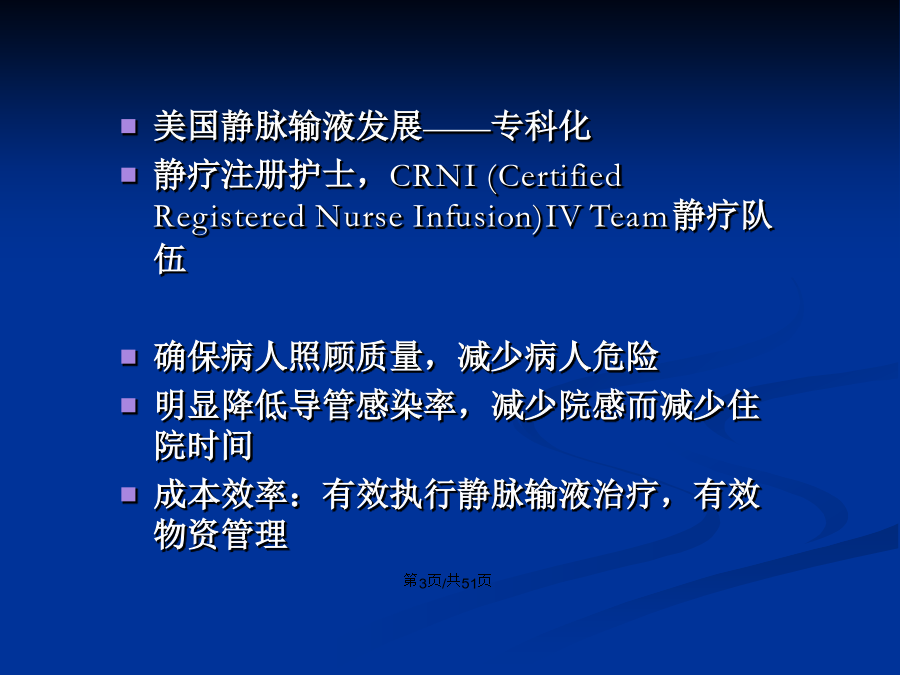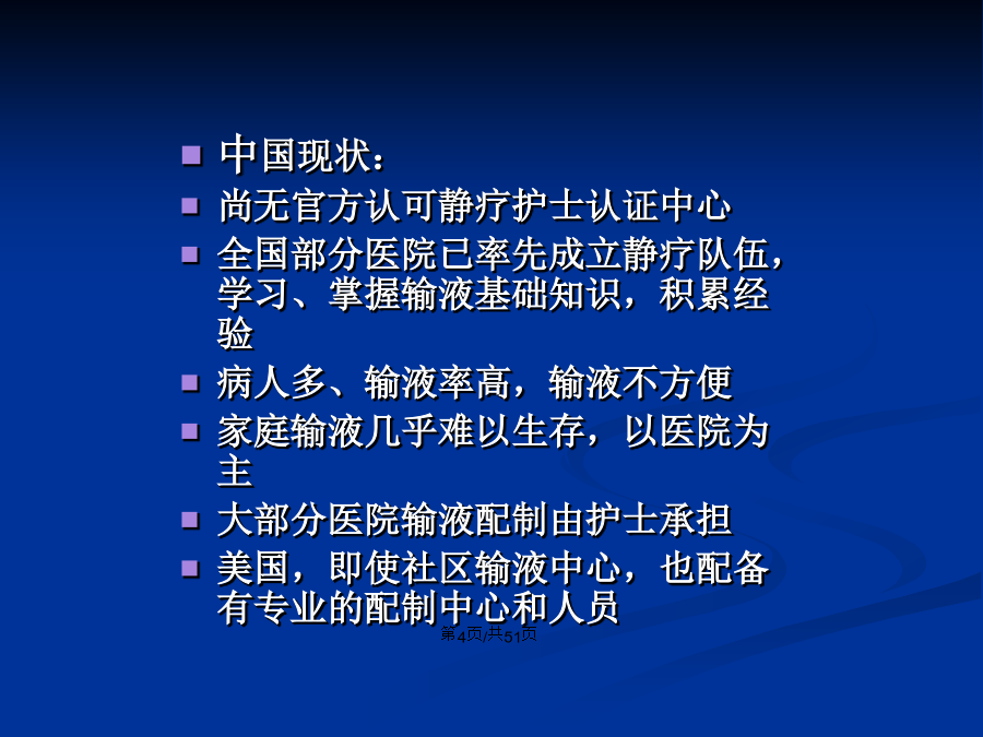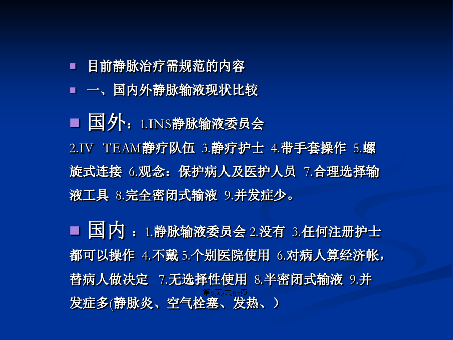 会计学主要内容: 静脉输液新进展 目前静脉治疗参照的依据 目前常用静脉输液工具 标准预防目前静脉治疗需规范的内容 一、国内外静脉输液现状比较 国外:1.INS静脉输液委员会2.IVTEAM静疗队伍3.静疗护士4.带手套操作5.螺旋式连接6.观念:保护病人及医护人员7.合理选择输液工具8.完全密闭式输液9.并发症少。 国内:1.静脉输液委员会2.没有3.任何注册护士都可以操作4.不戴5.个别医院使用6.对病人算经济帐,替病人做决定7.无选择性使用8.半密闭式输液9.并发症多(静脉炎、空气栓塞、发热、)美国静脉输液发展——专科化 静疗注册护士,CRNI(CertifiedRegisteredNurseInfusion)IVTeam静疗队伍 确保病人照顾质量,减少病人危险 明显降低导管感染率,减少院感而减少住院时间 成本效率:有效执行静脉输液治疗,有效物资管理中国现状: 尚无官方认可静疗护士认证中心 全国部分医院已率先成立静疗队伍,学习、掌握输液基础知识,积累经验 病人多、输液率高,输液不方便 家庭输液几乎难以生存,以医院为主 大部分医院输液配制由护士承担 美国,即使社区输液中心,也配备有专业的配制中心和人员静脉药物配制中心护士正在配药两名护士在核对护士正在配药护士集中配药我院护士正在配药目前我院输液配置环境二、目前我国静脉治疗参照的依据:2006版《输液治疗护理实践标准》 2005年4月由美国静脉输液护理学会INS制定 标准受到美国BD(医疗设备)公司美国总部在专业教育方面的大力支持 是当今美国静脉输液护理教育临床操作的标准指南 是权威性的指导书籍和具有法律效应的纲领性指南 标准可用于制定输液治疗护理的专业教育计划中国版本的诞生 2006版《输液治疗护理实践标准》的翻译得到美国输液护理学会(INS)的同意和支持,在美国BD公司中国地区的全力支持下,由中华护理学会静脉输液治疗护理专业委员会组织翻译,并于2006年12月出版。2007年4月,中华护理学会静脉输液护理专业委员会年会中向参会代表介绍了《标准》的内容,并将《标准》发放给每位参会代表。 2006版《输液治疗护理实践标准》内容: 患者的护理、文书记录、感染控制和安全操作、输液设备、穿刺部位的选择及输液工具的入置、护理实践 三、合理的输液治疗、合适的输液工具的应用成为我们工作的重点。静脉治疗新理念:规范静脉治疗标准,全疗程“一针治疗”“无钢针”病房 1、静脉输液主要并发症:静脉炎、渗出/组织坏死、堵塞 静脉炎的种类: 化学性静脉炎、 机械性静脉炎、 血栓性静脉炎、 细菌性静脉炎、 拔针后静脉炎补充的概念:外周静脉输液的最主要并发症 (1)化学性静脉炎 相关因素:1.药物PH(PH〈4.1或PH〉8)2.药物渗透压3.药物稀释程度4.外渗(腐蚀性) 5.静脉内血流量 相关因素(一):PH值 界限值:4.1<PH<8 注:超过、低于界限值,将严重破坏组织细胞,下面举例(临床常用药物) 5%GS、10%GS、50%GS的PH=3.2—5.5(可能) 0.9%NS、PH=4.5—7.0(不会发生) 5%NaHC03PH=7.5—8.5(可能) 20%甘露醇PH=4.5—6.5(不会发生) 低分子右旋糖苷GSPH=3.5—6.0(可能) 10%KCLPH=4(可能)相关因素(二):渗透压 正常值:280-320mosM/L 大于500mosM/L,会引起中度静脉炎 大于600mosM/L,则24小时后必定引起静脉炎 临床常用药物的渗透压 药物:渗透压(mosM/L): 5-FU650 长春新碱610 5%葡萄糖352 0.9%盐水308 3%氯化钠1030 TPN1400 甘露醇1098 5%碳酸氢钠1190 50%葡萄糖2526相关因素(三):外渗 化疗药物外渗的表现 输液部位疼痛→逐渐加重→局部肿胀→红斑水疱→硬结→溃疡 相关因素(四):血流量 手背及前臂静脉<95ml/分 肘部及上臂静脉100–300ml/分 锁骨下静脉1-1.5L/分 上腔静脉 2-2.5L/分 2、静脉输液常见并发症:堵管 堵管的原因:机械性、药物沉淀、血栓性堵管 机械性堵管(外周、中等长度导管):导管打折、静脉瓣、静脉痉挛、较冷液体(输血) 药物沉淀性堵管原因: 输注两种或两种以上不相容药物(药物pH值改变) 管腔内沉淀产生 输入脂肪乳等导致导管壁液体残留 血栓性堵管(管内回血原因) 胸腔压力的变化(气胸、胸腔积液等)输液压力的改变(输液袋滴空) 冲管技术不当 通过回血判断导管通畅是必须的! 每剂输液治疗前应检测导管的回血情况 无回血则说明导管功能丧失(不通畅了) 静脉导管的维护:无菌透明敷料7天更换一次 如有渗液、渗血及时更换 松动、污染立即更换规范中心静脉置管护理 颈内静脉置管、股静脉置管应