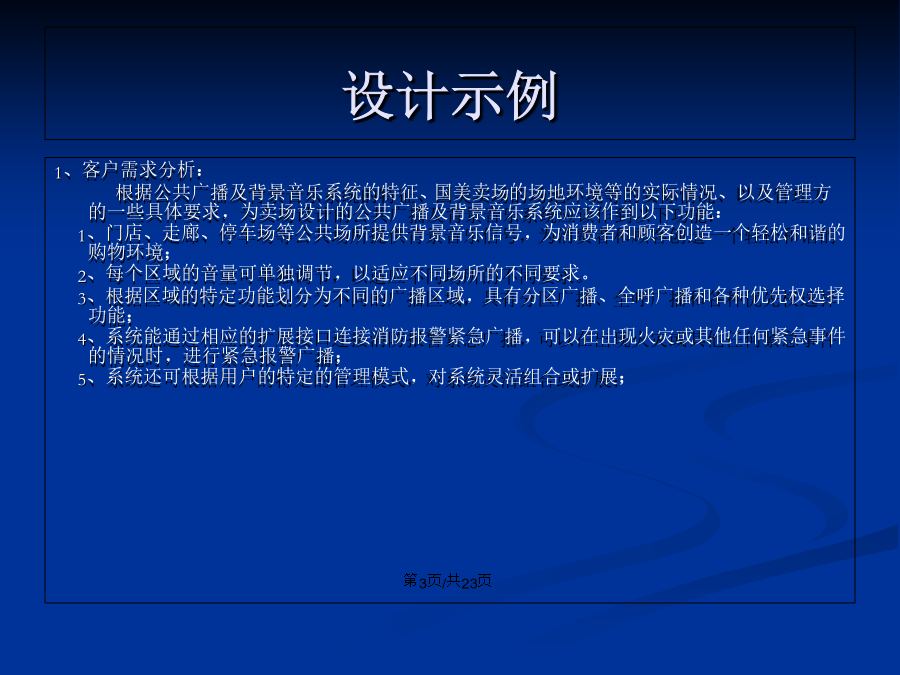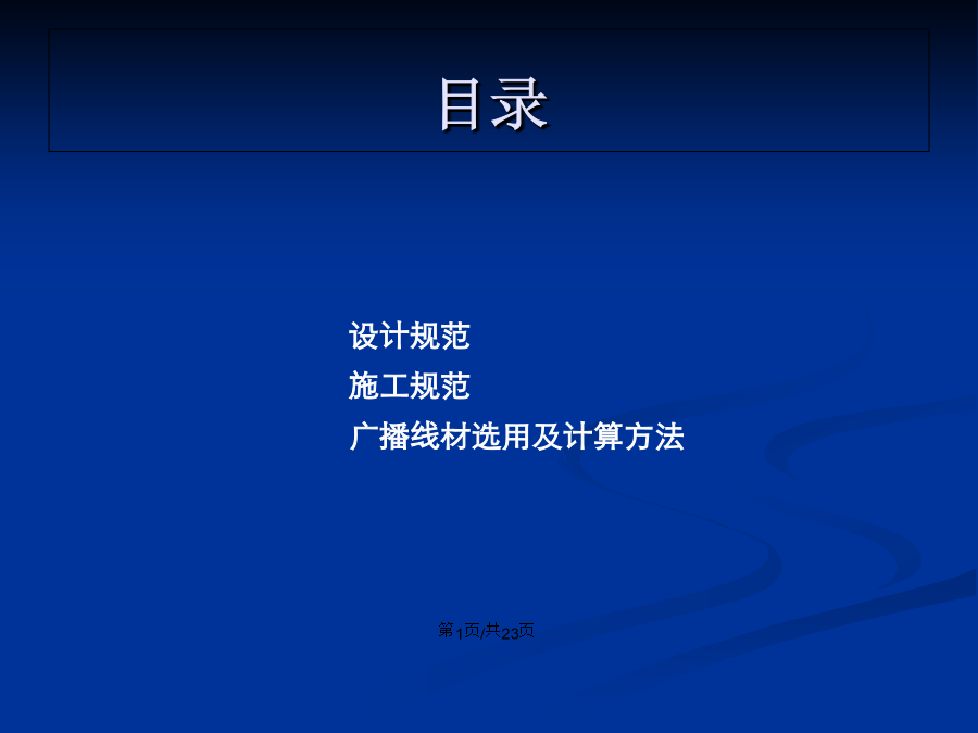 会计学目录设计规范设计示例设计示例国美设计示例(喇叭布局,线缆走向)国美设计示例(设备连接示意图)线缆施工规范广播线材选用及计算方法广播线材选用及计算方法线缆主要参数广播系统配线举例推算-综合参考表广播传输电缆参照施工规范施工规范施工规范施工规范施工规范扬声器选用及布置方式扬声器选用及布置方式案例图片(机柜)案例图片(吸顶音箱)案例图片(室外音柱)