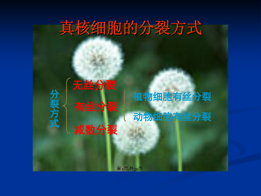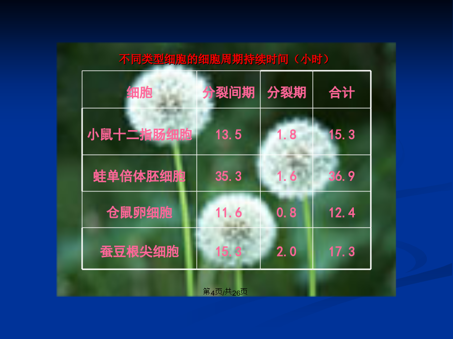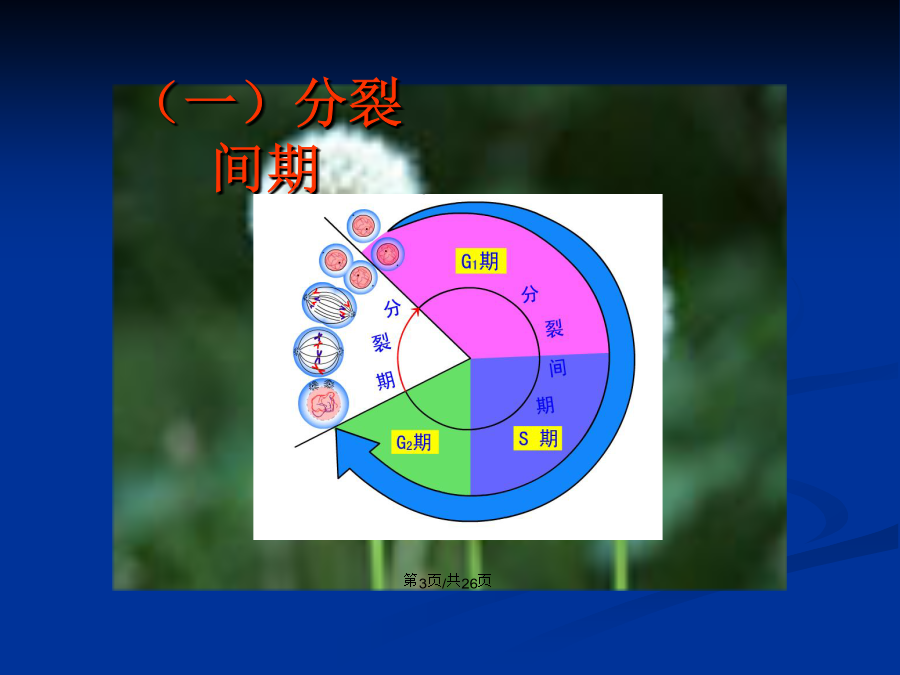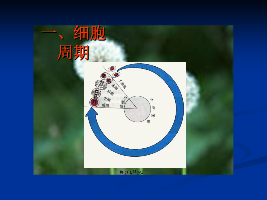 会计学真核细胞的分裂方式一、细胞周期(一)分裂间期不同类型细胞的细胞周期持续时间(小时)细胞分裂间期和分裂期的时间相差很大。分裂间期占的时间很长,约占细胞周期的90%~95%;分裂期占的时间短,约占细胞周期的5%~10%。(二)分裂期二、染色体数目及DNA数量变化表:(假定正常细胞的细胞核中DNA含量为2a,染色体数目为2N)DNA的变化曲线染色体的变化曲线染色单体的变化曲线DNA、染色体、染色单体的变化曲线光学显微镜下观察到的植物细胞分裂动物细胞有丝分裂/有丝分裂的意义无丝分裂1、若用化学物质强烈地抑制肿瘤细胞的DNA复制,这些细胞就停留在细胞周期的() A.间期B.前期C.中期D.后期 2、洋葱根尖生长点细胞有丝分裂末期,在细胞中央位置出现的结构,及其与此结构扩展为细胞壁有关的细胞器是() A.赤道板和高尔基体B.细胞板与中心体 C.细胞壁和高尔基体D.细胞板与高尔基体再见再见