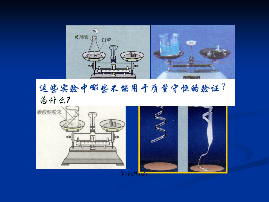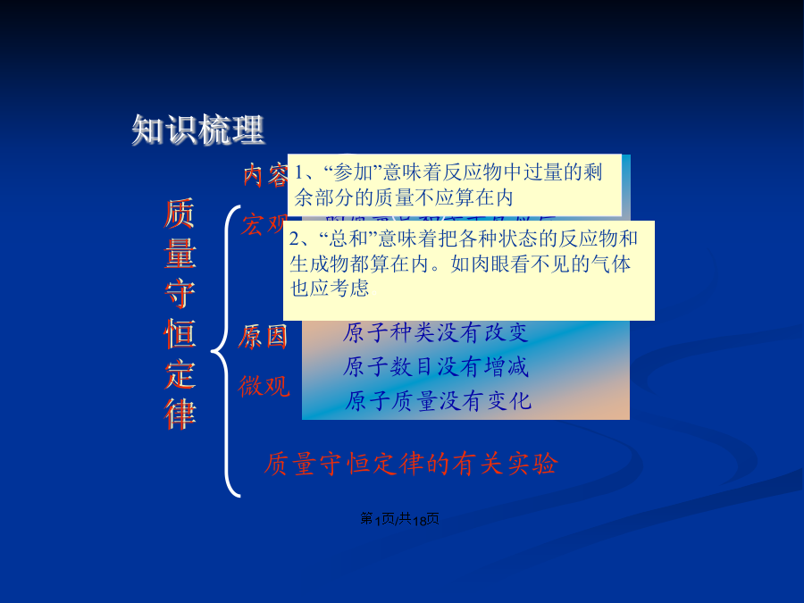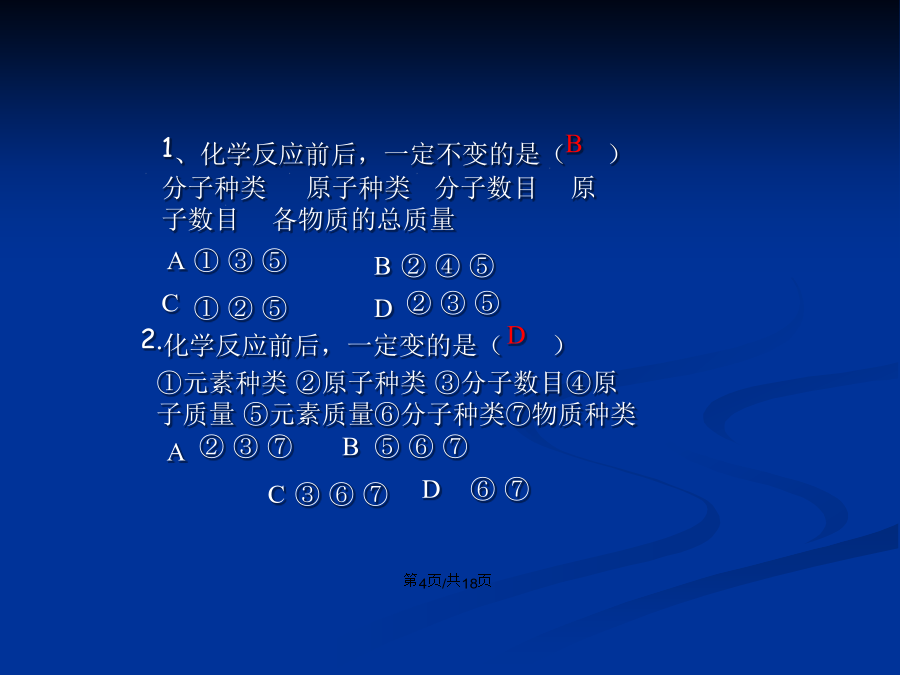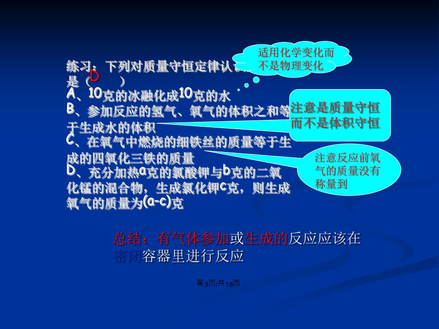 会计学质量守恒定律练习:下列对质量守恒定律认识正确的是() A、10克的冰融化成10克的水 B、参加反应的氢气、氧气的体积之和等于生成水的体积 C、在氧气中燃烧的细铁丝的质量等于生成的四氧化三铁的质量 D、充分加热a克的氯酸钾与b克的二氧化锰的混合物,生成氯化钾c克,则生成氧气的质量为(a-c)克1、化学反应前后,一定不变的是() 分子种类原子种类分子数目原子数目各物质的总质量 在A+B→C+D反应中,反应物中A、B质量比为5:2,若反应生成的C和D总质量为28g,则反应消耗反应物A的质量为( ) A.14gB.8gC.20gD.16g 1、在A+BC的反应中,5克A和4克B恰好完全反应,生成C的质量为______克将A、B、C各10g的混合物加热后,A全部参加反应,生成4gD,同时增加了8gC,则反应中A与B的质量比是() A.1:5B.l:4C.4:lD.5:l 分析:水+二氧化碳淀粉+氧气 学以致用例8(2006海南)把A、B、C、D四种纯净物放在一密闭容器内,在一定条件下充分反应,测得反应前后各物质的质量如下表:例1.成语“点石成金”,本意为古代术士的一 种法术,即能使石头变成黄金;现比喻能化 腐朽为神奇。有人说他能把石灰石(主要成分CaCO3)变成黄金,请你用化学知识说明石灰石不能变成黄金的道理。例2、镁条在空气中燃烧后,生成物的质量比原来镁条的质量大?1.汽油、煤油、柴油等燃料都是有机物(含有C、H、等元素),它们都是从石油中提炼出来的。一些骗子称,他们发明了一种试剂,只要在水中加入这种试剂,就可以使普通的水变成燃料油,从而解决世界性的难题。请驳斥这种谎言的荒谬之处。2、高锰酸钾受热分解后,剩余固体的质量比原反应物的质量小?ThankYou!