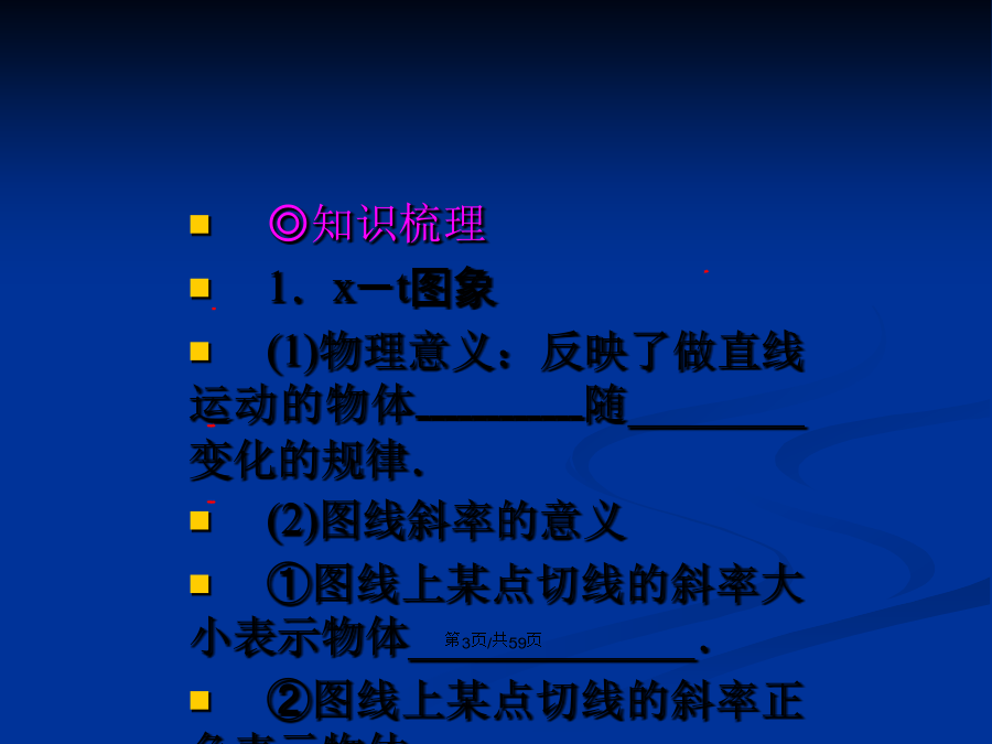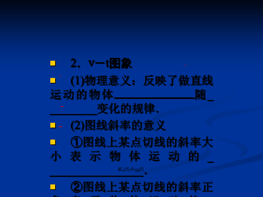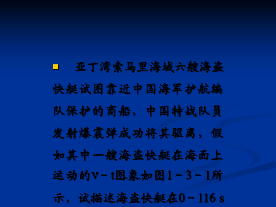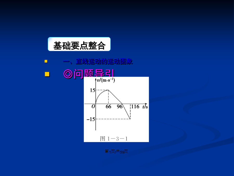会计学一、直线运动的运动图象 ◎问题导引亚丁湾索马里海域六艘海盗快艇试图靠近中国海军护航编队保护的商船,中国特战队员发射爆震弹成功将其驱离,假如其中一艘海盗快艇在海面上运动的v-t图象如图1-3-1所示,试描述海盗快艇在0~116s时间内的运动规律. [答案]0~66s时间内,海盗艇做加速度逐渐减小的加速运动,66s时开始做匀减速运动,96s末速度减为零,调头反向,96s~116s时间内做匀加速运动,加速逃离.◎知识梳理 1.x-t图象 (1)物理意义:反映了做直线运动的物体随________变化的规律. (2)图线斜率的意义 ①图线上某点切线的斜率大小表示物体_____________. ②图线上某点切线的斜率正负表示物体_____________.2.v-t图象 (1)物理意义:反映了做直线运动的物体随_________变化的规律. (2)图线斜率的意义 ①图线上某点切线的斜率大小表示物体运动的_________________. ②图线上某点切线的斜率正负表示物体运动的_________________.(3)图线与坐标轴围成的“面积”的意义 ①图象与横坐标轴围成的面积表示相应时间内的_______. ②若此面积在时间轴的上方,表示这段时间内的位移方向为;若此面积在时间轴的下方,表示这段时间内的位移方向为.◎自主检测 1.(2014·哈尔滨六中二模)设物体运动的加速度为a、速度为v、位移为x、所受合外力为F.现有四个不同物体的运动过程中某物理量与时间的关系图象,如图所示.已知t=0时刻物体的速度均为零,则其中表示物体做单向直线运动的图象是/解析由A、B项图象可直接看出,两图象中两物体均做往复运动,A、B均错误,画出C、D项的v-t图,分别如图甲、乙所示,可知C项正确,D项错误. 答案C二、追及相遇问题 ◎问题导引 某十字路口,当绿灯刚亮起时,汽车从静止开始加速运动,做匀加速运动,同时一辆电动自行车以速度v匀速越过汽车,问:当汽车追上电动自行车时,两者的位移有何关系?速度有何关系? [答案]两者位移相等,汽车的速度为电动自行车速度的2倍.◎知识梳理 1.追及与相遇问题的概述 当两个物体在同一直线上运动时,由于两物体的运动情况不同,所以两物体之间的会不断发生变化,两物体间距越来越大或越来越小,这时就会涉及追及、相遇和避免碰撞等问题. 2.追及问题的两类情况 (1)若后者能追上前者,则追上时,两者处于同一位置,后者的速度一定前者的速度. (2)若后者追不上前者,则当后者的速度与前者的速度时,两者相距最近.◎自主检测 2.解答下列问题: (1)甲、乙两物体同时同地出发,甲做速度为v0的匀速直线运动,乙做初速度为零、加速度为a的匀加速直线运动,二者相距最远时乙的速度为________,追上甲时乙的速度为________. (2)甲、乙相距x0,当甲开始以速度v0匀速追赶前方的乙时,乙以加速度a由静止开始运动,若甲刚好追上乙,则x0=________.(3)甲、乙相距x0,甲做速度为v0的匀速直线运动,乙在甲后做初速度为2v0、加速度为a的匀减速直线运动,若乙刚好追上甲,则x0=________.运动学图象主要有x-t图象和v-t图象,运用运动学图象解题可总结为六看:[典例1]质点在东西方向上做直线运动,选定向东的方向为正方向,其位移图象如图1-3-2所示,试根据图象, (1)描述质点运动情况; (2)求出质点在0~4s、0~8s、2~4s三段时间内的位移和路程; (3)求出质点在0~4s、4~8s内的平均速度.[解析](1)质点从t=0开始由原点出发向东做匀速直线运动,持续时间为4s,4s末开始反向向西做匀速直线运动,又经过2s即6s末回到原点,然后又继续向西运动,直到8s末. (2)在0~4s内位移为8m,路程也是8m; 在0~8s内位移为-8m,负号表明位移的方向向西,说明质点在8s末处在原点以西8m的位置上,此段时间内的路程为24m; 在2~4s内质点的位移为4m,路程也是4m.[答案]见解析[方法总结](1)分析图象问题时首先明确所给的图象是什么图象,即认清图象中横、纵轴所代表的物理量及它们的函数关系.特别是那些图形相似容易混淆的图象,更要注意区分. (2)速度图象向上倾斜时,物体不一定做加速运动,向下倾斜也不一定做减速运动,物体做加速还是减速运动,取决于v和a的符号,v、a同正或同负即同向则加速,v、a一正一负即反向则减速.1.(2013·四川理综)甲、乙两物体在t=0时刻经过同一位置沿x轴运动,其v-t图象如图1-3-3所示,则 图1-3-3 A.甲、乙在t=0到t=1s之间沿同一方向运动 B.乙在t=0到t=7s之间的位移为零 C.甲在t=0到t=4s之间做往复运动 D.甲、乙在t=6s时的加速度
