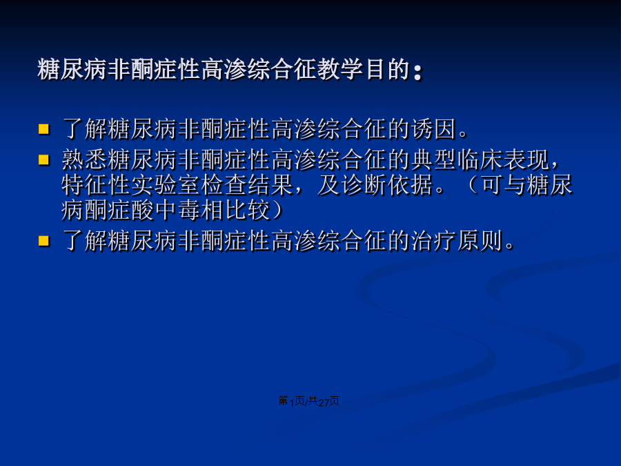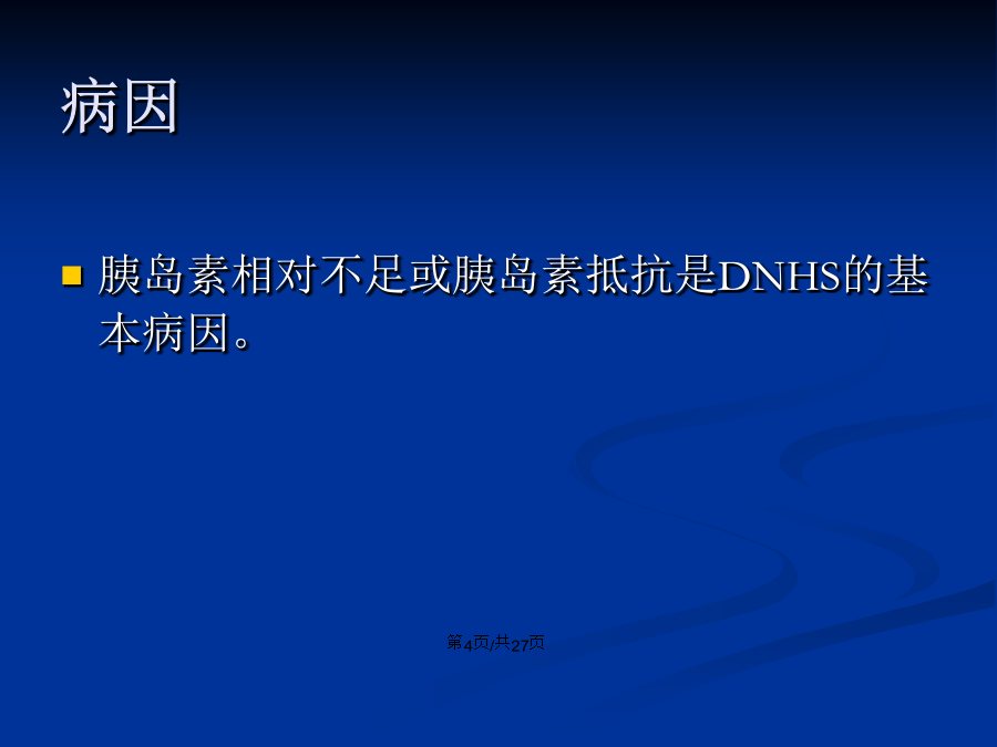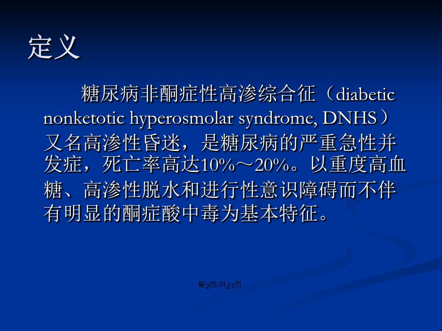 会计学糖尿病非酮症性高渗综合征教学目的:定义病因诱因本病的发生几乎均有诱发因素。常见的诱因分为三类:诱因诱因诱因发病机理发病机理临床表现临床表现临床表现临床表现辅助检查诊断实验室诊断依据是:鉴别诊断所有DNHS患者均为危重患者,但有下列情况时,表明预后不良:治疗治疗治疗治疗治疗治疗