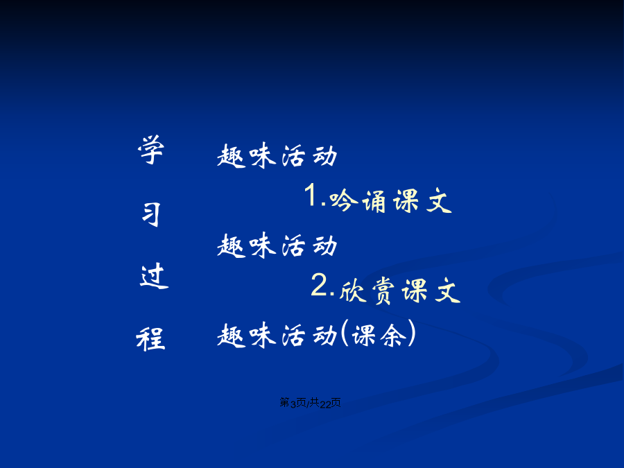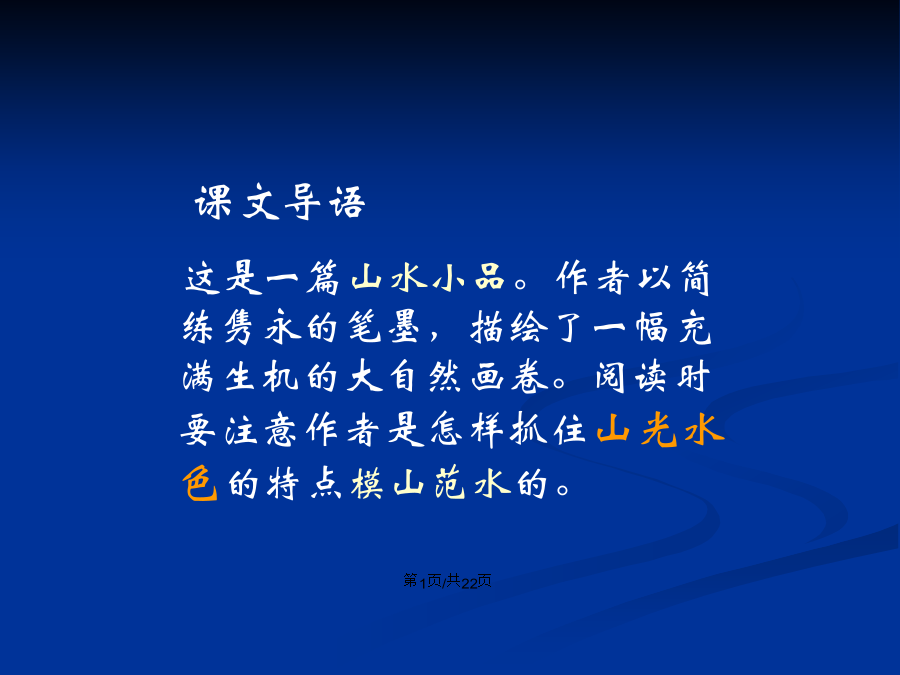 会计学课文导语 这是一篇山水小品。作者以简练隽永的笔墨,描绘了一幅充满生机的大自然画卷。阅读时要注意作者是怎样抓住山光水色的特点模山范水的。小品:小品文。散文的一种,以生动活泼的文笔写景、说理、抒情。趣味活动 1.吟诵课文 趣味活动 2.欣赏课文 趣味活动(课余)1.吟诵课文先做一个趣味活动先做一个趣味活动体味之一:读出层次感体味之二:读出陶醉感2.欣赏课文再做一个趣味活动再做一个趣味活动欣赏怎样来赏读写景状物的文章?欣赏欣赏欣赏欣赏欣赏欣赏还做一个趣味活动(课余)再见!