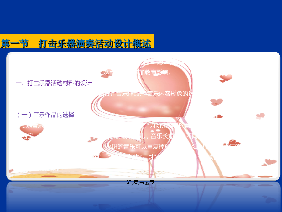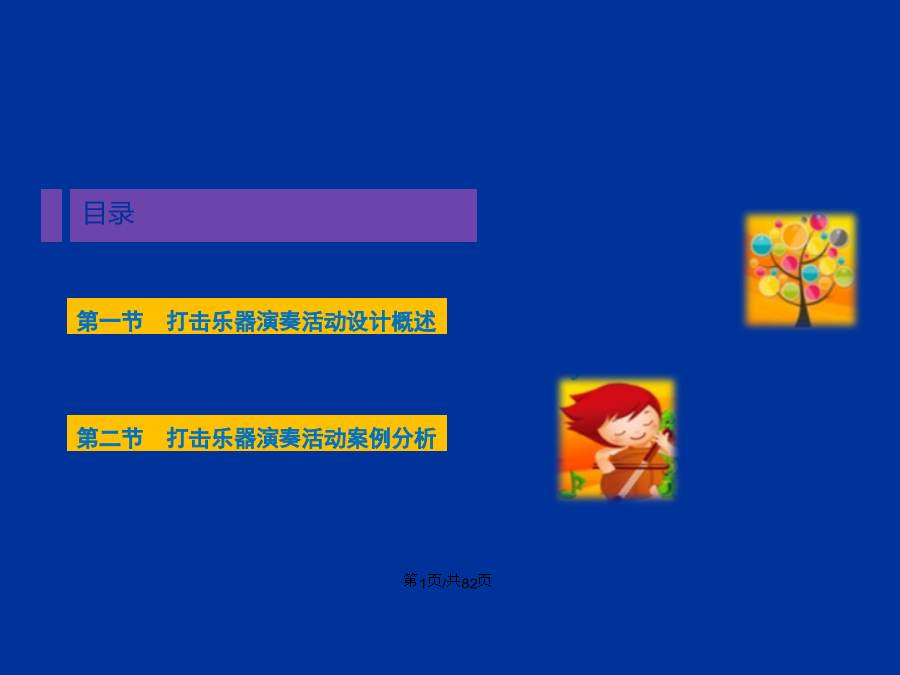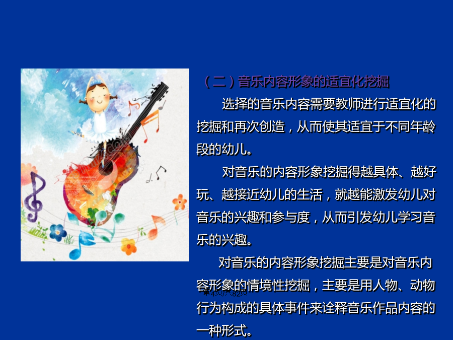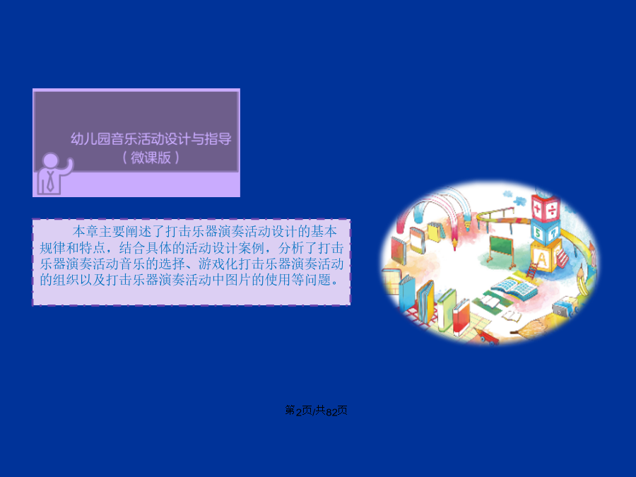 会计学本章主要阐述了打击乐器演奏活动设计的基本规律和特点,结合具体的活动设计案例,分析了打击乐器演奏活动音乐的选择、游戏化打击乐器演奏活动的组织以及打击乐器演奏活动中图片的使用等问题。第一节打击乐器演奏活动设计概述(二)音乐内容形象的适宜化挖掘选择的音乐内容需要教师进行适宜化的挖掘和再次创造,从而使其适宜于不同年龄段的幼儿。 对音乐的内容形象挖掘得越具体、越好玩、越接近幼儿的生活,就越能激发幼儿对音乐的兴趣和参与度,从而引发幼儿学习音乐的兴趣。对音乐的内容形象挖掘主要是对音乐内容形象的情境性挖掘,主要是用人物、动物行为构成的具体事件来诠释音乐作品内容的一种形式。(三)视觉媒介的设计打击乐器教学中的视觉媒介主要包括视频和图谱的设计。1.视频的设计视频的设计主要包括视频的选择和裁剪。教师需要根据作品的内容、幼儿的年龄特点等选择适宜的视频并进行相应的剪裁,从而满足幼儿的需要。视频的内容需要直观、形象,能激发幼儿参与音乐活动的兴趣,并与音乐的内容形象相匹配。2.图谱的设计打击乐器教学中,图谱的使用比较常见。不同的音乐使用不同的图谱,在具体的教学中有使用具体的图形表达情境化音乐内容的图谱,也有使用抽象化的符号表达音乐内容的图谱。 教师可以根据需要和幼儿的年龄特点进行适宜的设计和实践。(四)乐器的选择和演奏编制乐器的选择、打击乐器演奏方式的编排和设计需要与音乐的性质相匹配,同时还要适宜于幼儿的年龄特点。二、打击乐器教学活动的目标设计幼儿园中的打击乐器教学有的是一次活动的一个环节,如最后环节用来玩乐器感知音乐;有的打击乐器教学活动有两个课时,第一课时可以是欣赏活动或其他歌唱或韵律活动等,第二课时为打击乐器活动。打击乐器教学活动中的目标设计需要考虑欣赏的目标和乐器演奏的目标两个维度,第二课时打击乐器教学活动中的目标主要指演奏的目标。打击乐器演奏目标的表述需要考虑幼儿的主动探究目标,而不是成人规定好的演奏方式,如引导幼儿根据音乐选择适宜的乐器和演奏方式等。演奏目标的制定需要考虑演奏的关键经验,如在表述时需要根据具体音乐的结构、段落、节奏等设计具体的目标,具体如下例。大班打击乐器演奏活动《土耳其进行曲》的活动目标:(1)以集体讨论的方式为逗号、圆点、圆圈、波浪线等符号选择合适的乐器。(2)能用乐器表现乐曲的句子、段落及尾声的轻重。 (3)演奏过程中能看指挥、听音响,并努力与同伴的演奏保持一致。三、打击乐器教学活动的过程设计打击乐器教学活动一般包括欣赏、音乐与乐曲匹配、徒手合乐、乐器演奏四个环节。欣赏环节的主要任务是帮助幼儿感知音乐,并用情境化身体动作或声势动作表现音乐,也可以用图谱或舞蹈表演等形式欣赏音乐。 在音乐与乐曲的匹配环节,可以请幼儿发表自己的意见,可以小组讨论,也可以全班讨论。不管是哪种形式的乐器匹配,教师都需要尊重幼儿的主动性。第二节打击乐器演奏活动案例分析//(二)小班节奏活动:小罐的声音【设计意图】根据《纲要》中指出,幼儿园教育要与幼儿的兴趣相适应。偶然间听到《一百只老鼠》这首歌曲,它是一首旋律欢快、节奏鲜明、富有感染力、符合小班幼儿年龄特征的音乐。整个活动以游戏为主线,引导幼儿在玩中学、在学中玩,充分体验参与音乐活动的乐趣。【活动目标】(1)运用小罐子尝试打击节奏型XXXX|。(2)在游戏情境下,自由探索小罐子的不同演奏方法。(3)体验乐曲活泼、滑稽的风格,熟悉乐曲欢快的旋律。【活动准备】(1)知识经验:幼儿已有打击经验。(2)物质材料:红豆小罐、沙子小罐若干,三角铁一个,音乐《一百只老鼠》伴奏版,节奏图谱。 (3)环境创设:宽敞的活动室,幼儿坐成马蹄式。 【重点、难点】(1)重点:能在游戏情境下自由探索小罐子的不同演奏方法。(2)难点:能运用小罐子尝试打击节奏型XXXX|。/【总结与提升】节奏是音乐的脉搏和精髓,是音乐生命力的源泉。一切音乐活动都离不开节奏。节奏感是音乐能力的重要组成部分。 唱歌、跳舞、乐器都离不开节奏,培养幼儿对节奏活动的兴趣是十分必要的。 通过培养幼儿的音乐听觉能力,利用形象的图谱、生活中的小罐作为打击乐器,激发幼儿的兴趣,并将节奏有效地融入故事游戏中,让幼儿在敲敲打打中培养对节奏活动的兴趣,既提高了音乐素质和能力,又从中获得了快乐。(1)从听入手,感受节奏。整个活动始终以游戏化的方式进行,通过闯关游戏,让幼儿由浅入深地感知乐曲的节奏,体验在玩中学的乐趣。(2)教具简易,生活中随处可见,幼儿兴趣极大,既能充分展示音乐的形象,又便于教师和幼儿表演操作。【延伸活动】(1)将小罐子投入表演区,让幼儿进行节奏探索。(2)科学探索区投放半成品小罐及各种小材料,让幼儿对小罐进行探索。(三)小班打击乐器演奏活动:大狼喝粥【设计意图】小班幼儿喜欢听不同的声音,在任何时候都喜欢敲打出一些声音。敲敲打打成了小班幼儿在