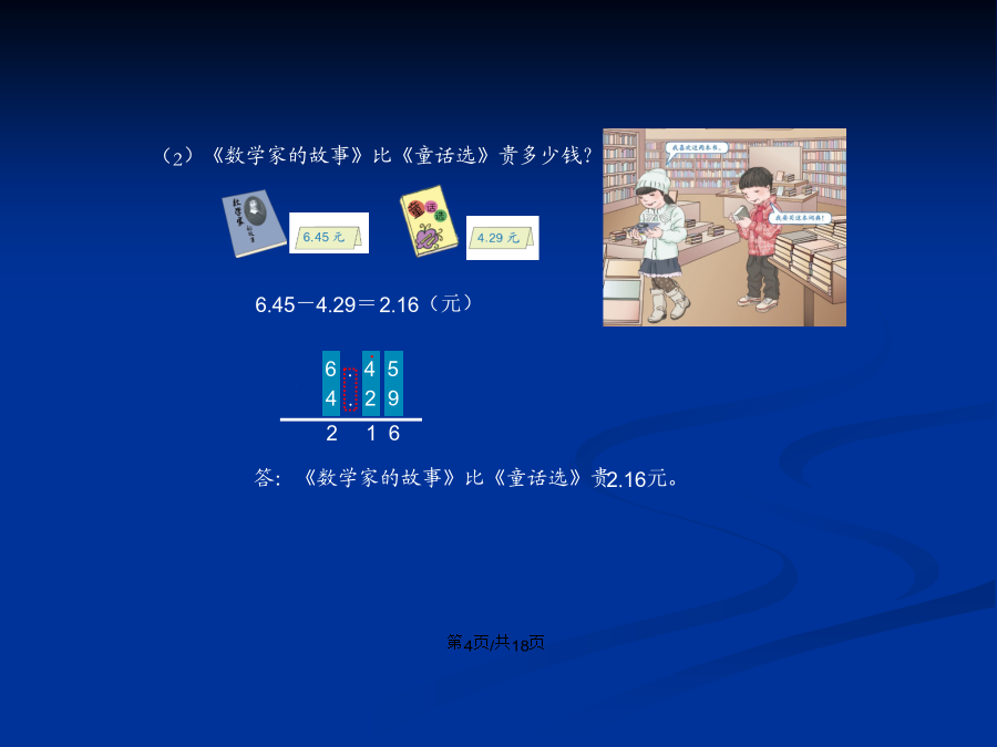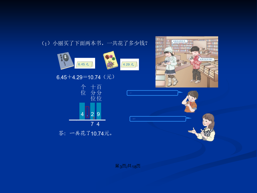会计学妈妈把一根绳子截成两段,一段长83厘米,另一段 长59厘米。妈妈把一根绳子截成两段,一段长83厘米,另一段 长59厘米。6.45+4.29=6.45-4.29=6.45+4.29=10.74(1)小明从7岁到10岁,体重增加 了多少千克?下面是小明的体重统计图。0.90.4百分位怎样加?+百分位怎样减?知识运用2.70知识运用