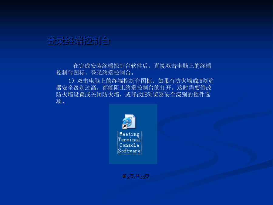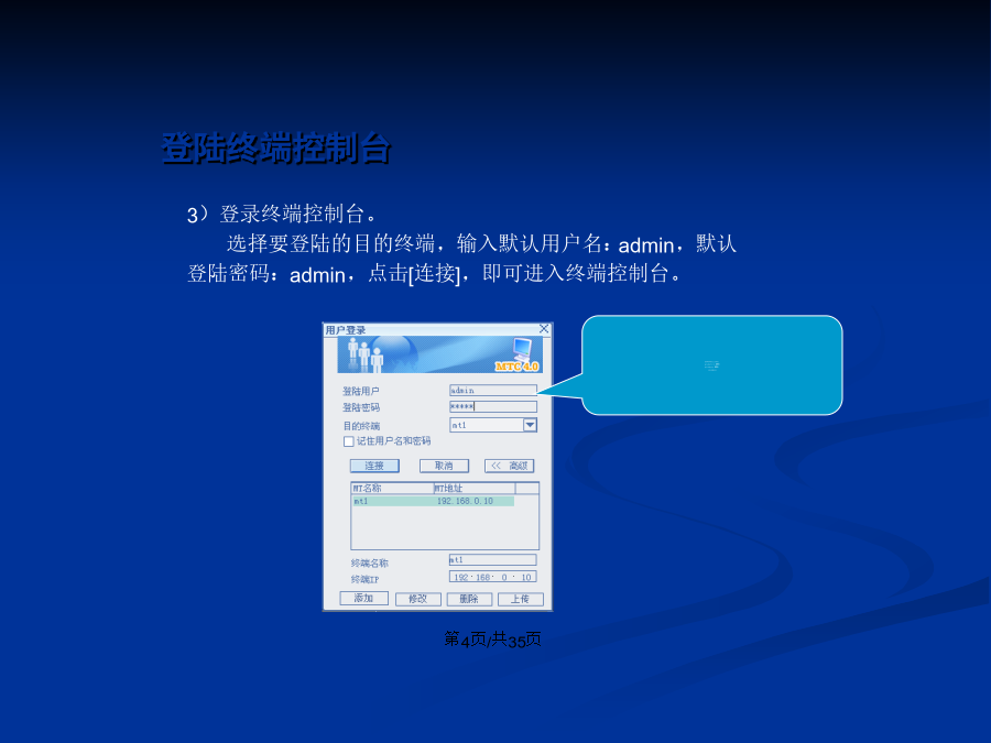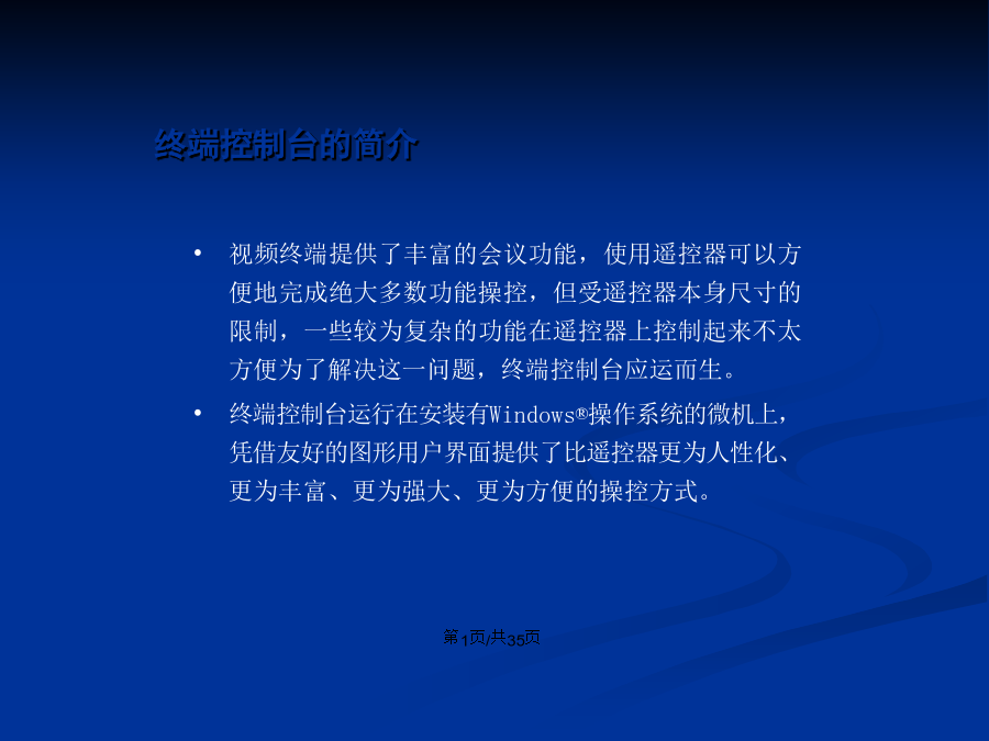 会计学终端控制台的简介登录终端控制台登陆终端控制台登陆终端控制台终端控制台:短消息、监控会议管理:点对点会议,多点会议会议管理:在MCU上创建会议设备控制设备控制:摄像头控制设备控制:视频矩阵HD基本功能-视频矩阵设备控制:模拟遥控器设备控制:视频点播设备设置设备设置:用户配置设备设置:横幅设置设备设置:呼叫配置设备设置:MC配置设备设置:网络配置设备设置:网络配置-码流重传设备设制:摄像头配置设备设置:音量调整设备设置:设频配置设备设置:图像参数系统管理:地址簿管理系统管理:用户管理终端诊断终端诊断:系统测试终端诊断:视音频自检终端版本升级发起双流停止双流其它功能谢 谢