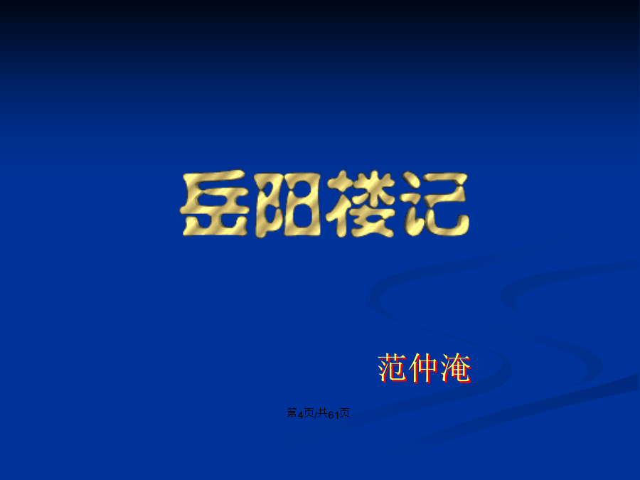 会计学黄鹤楼——湖北武汉滕王阁——江西南昌先天下之忧而忧,后天下之乐而乐。 ——范仲淹《岳阳楼记》范仲淹教学目的 ⒈朗读、背诵全文。 ⒉学习文章把叙事、写景、抒情和议论巧妙地结合在一起的写法。 ⒊理解作者所阐述的主要观点。 ⒋学习和积累文言词汇。解题岳阳楼位于今湖南岳阳市西北的巴丘山下,其前身是三国时期吴国都督鲁肃的阅兵台,唐玄宗开元四年(716),张说在阅兵台旧址建造楼阁,取名“岳阳楼”,常与文士们登楼赋诗。岳阳楼高三层,下临洞庭,遥望君山,建筑雄伟,气势磅礴。许多文人学士都曾在这里留下脍炙人口的诗文。自范仲淹《岳阳楼记》后,岳阳楼声名益著,与湖北黄鹤楼、江西滕王阁齐名,被誉为楚地三大名楼,成为游览胜地。范仲淹(989~1052),字希文,苏州吴县(今江苏吴县)人,北宋著名政治家、文学家。他出身贫寒,自幼苦学,对下层人民的痛苦感受较深。27岁中进士,为官敢于直谏,曾负责/给课文分段并归纳段意要点勾勒写文章,往往以一两个警句(关键性词句)领起全篇,第1段写重修岳阳楼的背景,这背景是什么?说明了什么?第2段写洞庭湖的全景,用“衔远山,吞长江”,如果把“衔”改为“连”,把“吞”改为“接”好不好?为什么?从岳阳楼上看到的雄伟景象有哪些?作者没有停留在写景上,而用“然则”从岳阳楼的地理形势,转入写什么?第3段描写的画面渲染了一种什么样的气氛,为什么会有这样的心情?分第4段描写的画面渲染了一种什么样的气氛,为什么会有这样的心情?/作者用哪些话概括说明了“迁客骚人”的“悲”和“喜”?这样写的目的是什么?“古仁人之心”是怎样的?“古仁人”的忧乐观是怎样的?“进”指什么?“退”指什么?“微斯人”的“斯人”指什么人?怎样理解“先天下之忧而忧,后天下之乐而乐”这句话?文章最后一段是怎样推出这个警句的?结构图示分析鉴赏2.本文在语言上骈散句交错使用小结小结初极狭,才通人 政通人和,百废具兴 鸣之而不能通其意 则有心旷神怡 土地平旷,屋舍严然⒉通假字。 百废具兴。 属予作文以记之。⒊虚词。 属予作文以记之 不以物喜 固国不以山溪之险 所以动心忍性 其必曰 其喜洋洋者矣 必先苦其心志4、成语: 政通人和浩浩汤汤 一碧万顷心旷神怡 气象万千百废具兴前人之述备矣㈠下面用谈停顿有误的一项是() A.滕子京/谪守/巴陵郡。 B.属予/作文/以记之。 C.予观夫/巴陵/胜状。 D.此则/岳阳楼/之大/观也。㈡下面句子不是骈句的一项是() A.衔远山,吞长江 B.朝晖夕阴,气象万千 C.日星隐耀,山岳潜形 D.不以物喜,不以己悲阅读下面语段.回答问题。 嗟乎!予尝求古仁人之心,或异二者之为,何哉?不以物喜,不以己悲;居庙堂之高则忧其民,处江湖之远则忧其君。是进亦忧,退亦忧。然则何时而乐耶?其必曰“先天下之忧而忧,后天下之乐而乐”乎。噫!微斯人,吾谁与归?⒈这段文字选自《》,作者_______,他是_____(朝代)_____家、_____家。⒊“是进亦忧,退亦忧”中的“进”和“退”分别指() A.“不以物喜”和“不以己悲”。 B.“居庙堂之高”和“处江湖之远”。 C.“忧其君”和“忧其民”。 D.“先天下之忧”和“后天下之乐”。⒋“噫!微斯人,吾谁与归?”句中的“斯人”指的是_______,这种人的忧乐观是_______________,_______________。作者以此鞭策自己并勉励朋友________。阅读下面一段文字,回答问题。 嗟夫!予尝求古仁人之心,或异二者之为,何哉?不以物喜,不以己悲;居庙堂之高则忧其民;处江湖之远则忧其君。是进亦忧,退亦忧。然则何时而乐耶?其必曰“先天下之忧而忧,后天下之乐而乐”乎。噫!微斯人,吾谁与归?A.本段开头以“古仁人之心”与“二者之为”相比较,引出了下文的议论。 B.“退亦忧”与“居庙堂之高则忧其民”相呼应。 C.“微斯人,吾谁与归?”这句话的意思是:没有这种人,我同谁一道呢? D.这段文字,抒发了作者的旷达胸怀和政治抱负。⒈给下列画线的字注音全对的一组是()。 A.浩浩汤汤(shāng) 宠辱偕忘(jiē) B.岸芷汀兰(dīng) 谪守巴陵郡(zhé) C.一碧万顷(qǐng) 霪雨霏霏(yín) D.心旷神怡(yí) 阴风怒号(hào)⒉对下列画线的词语解释不正确的一组是()。 A.予观夫巴陵胜状(好的景色) 朝晖夕阴(日光) B.滕子京谪守巴陵郡(任……太守) 百废具兴(兴办) C.南极潇湘(尽) 薄暮冥冥(跟“厚”相对) D.前人之述备矣(详尽) 居庙堂之高则忧其民(处在)⒊下列画线的词意思完全相同的一项是()。 A.属予作文以记之 不以物喜,不以己悲 B.去国怀乡 敌国外患 C.长烟一空 一碧万顷 D.予观夫巴陵胜状 此则岳阳楼之大观也⒋没有通假字的一句是()。 A.越明年,政通人和,百废具兴。 B