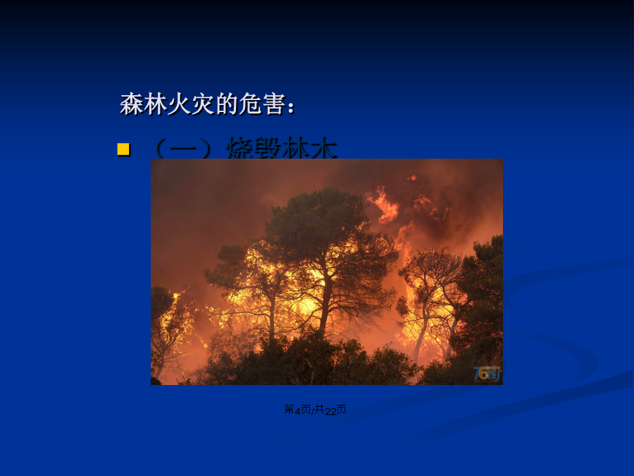 会计学森林火灾的危害:(三)危害野生动物(四)引起水土流失(五)使下游河流水质下降(六)引起空气污染(七)威胁人民生命财产安全