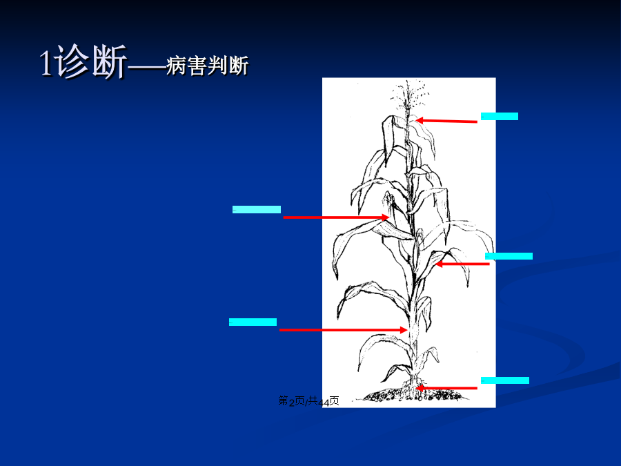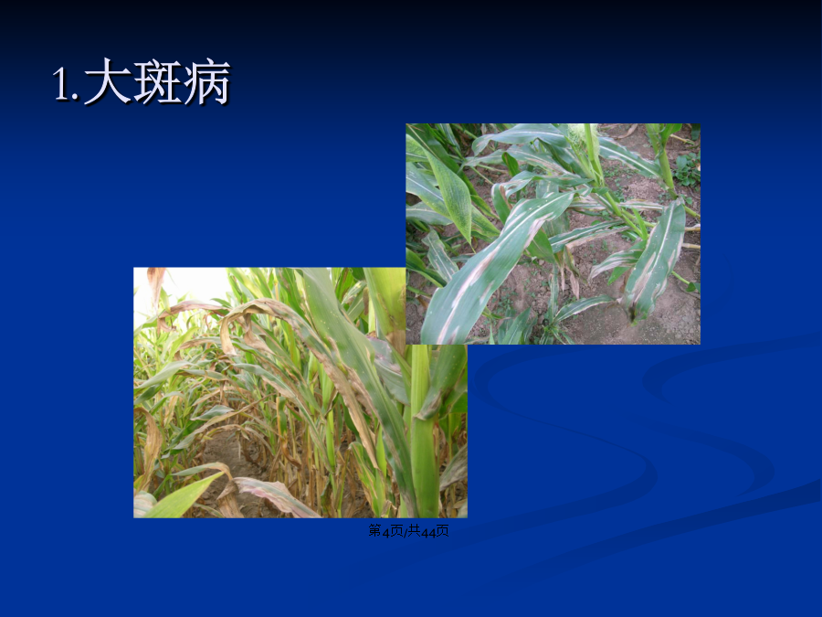 会计学1诊断—叶部判断1诊断—病害判断主要病虫害识别1.大斑病大斑病病斑防治技术2.小斑病小斑病病斑类型小斑病病斑防治技术3.灰斑病灰斑病病斑防治技术4.弯孢霉叶斑病弯孢霉叶斑病病斑防治技术5.矮花叶病叶片被害状防治技术6.瘤黑粉病瘤黑粉病所致畸型黑粉瘤发生部位防治技术7.丝黑穗病雌穗黑粉状防治技术8.茎腐病病害引起的产量损失镰刀菌茎腐病腐霉菌茎腐病细菌性茎腐病防治技术9.纹枯病菌核形成后期防治技术10.粗缩病雄虫11.玉米螟植株被害状引起穗腐防治技术赤眼蜂田间释放