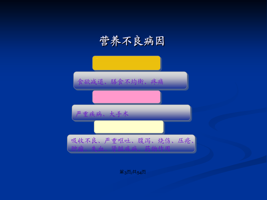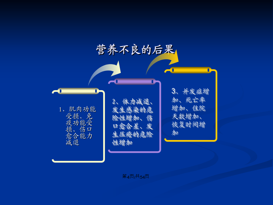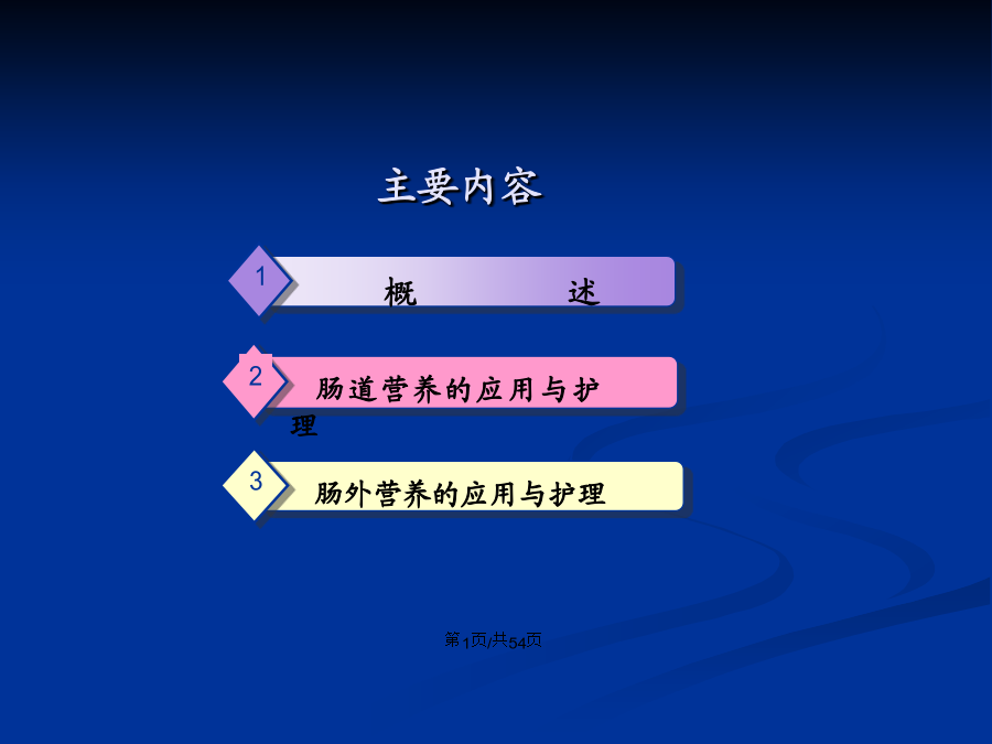 会计学主要内容临床营养治疗目的—营养不良营养不良病因营养不良的后果营养支持治疗的目的营养支持途径与选择原则肠道营养定义肠道营养适应症肠道营养禁忌症科室常用营养液科室常用营养液肠道营养输注途径肠道营养喂养方法肠道营养治疗的护理/鼻饲管的护理营养液的使用与护理营养液的使用与护理营养液的使用与护理估计胃内残留量卧位选择及口腔护理各种营养代谢的监测心理护理各种并发症防治及处理各种并发症防治及处理各种并发症防治及处理各种并发症防治及处理各种并发症防治及处理肠外营养的定义1994年,无肠女周琦思和她的女儿蔡惟与中瑞合资华瑞制药有限公司惠特林教授合影肠外营养适应症肠外营养禁忌症肠外营养支持途径与选择原则常用肠外营养液体位及高热患者的护理控制输液速度合理输液,加强观察和记录PN输注的方式单独输入氨基酸-不可取单瓶输注葡萄糖-不可取单瓶输注脂肪乳-不可取营养液护理尽早经口饮食或肠道营养导管护理导管护理观察和预防并发症观察和预防并发症观察和预防并发症观察和预防并发症观察和预防并发症观察和预防并发症代谢紊乱谢谢聆听!