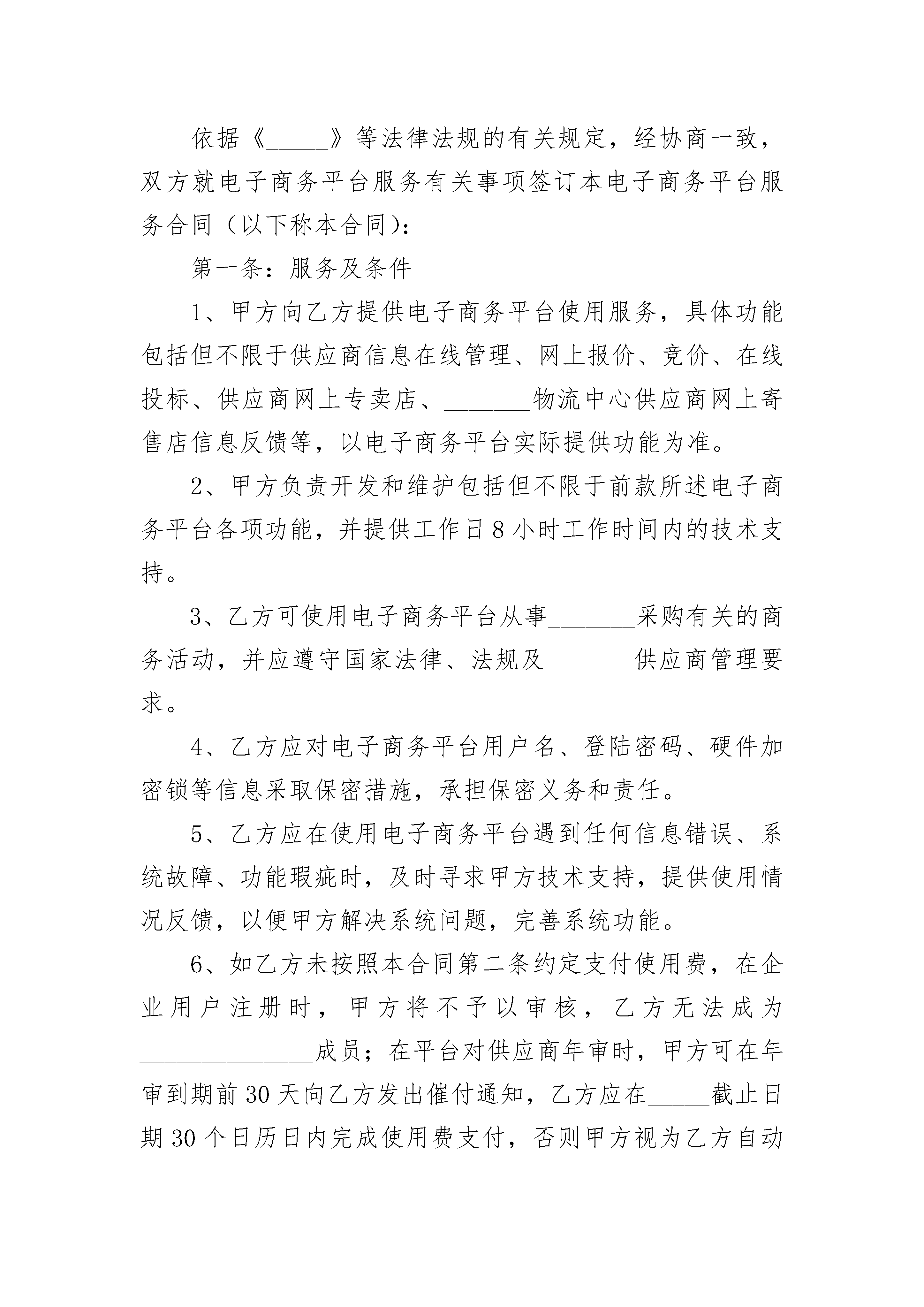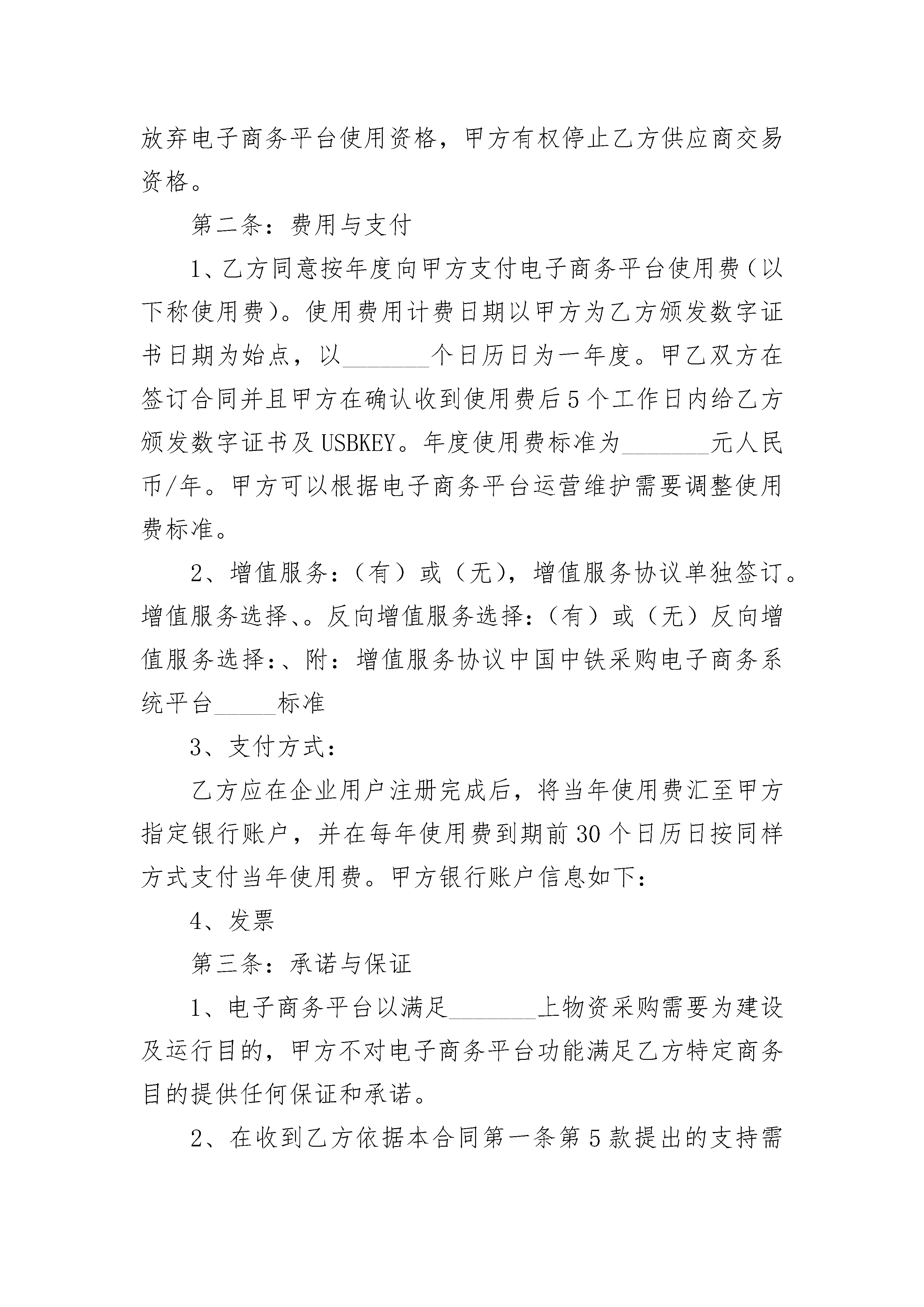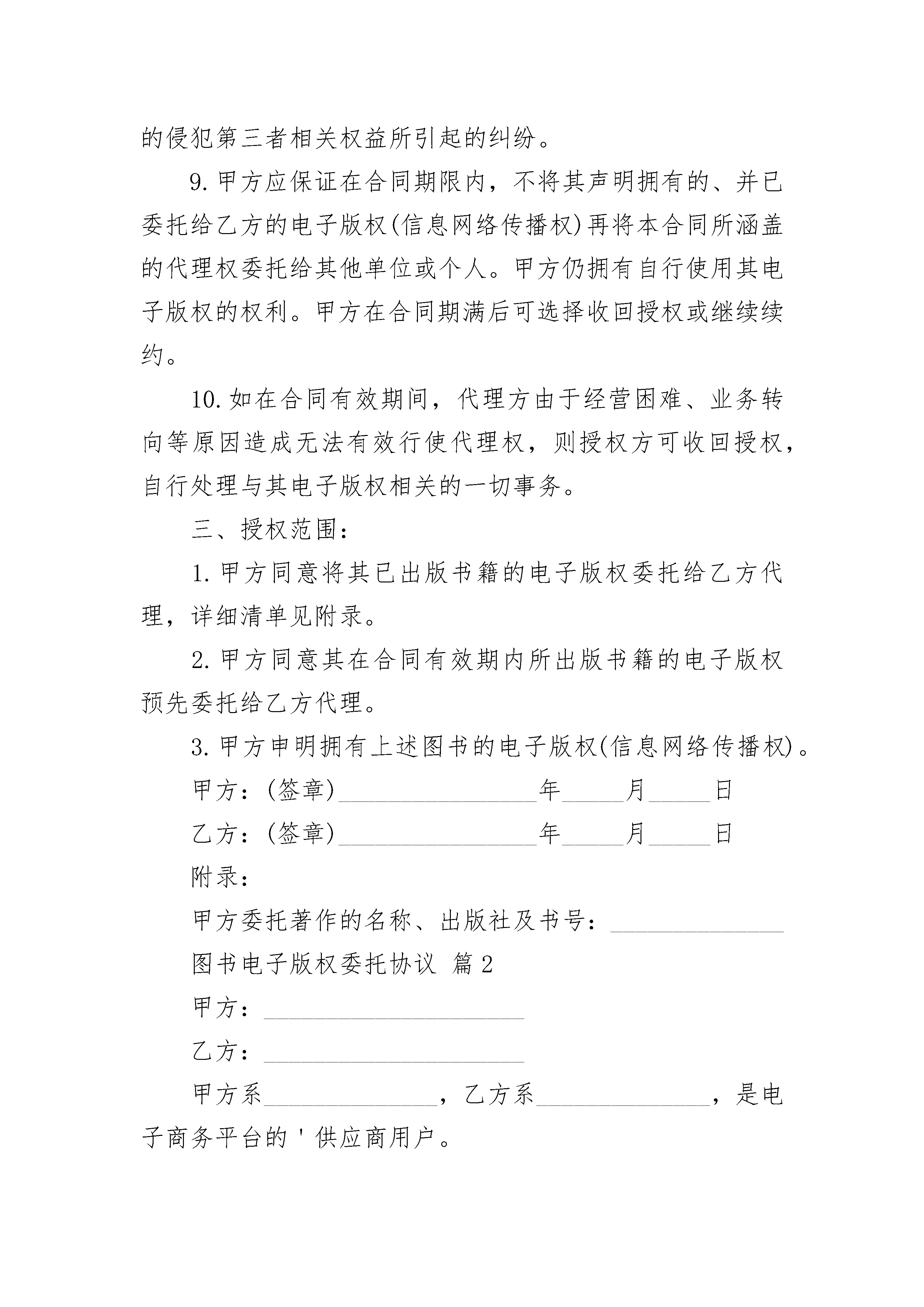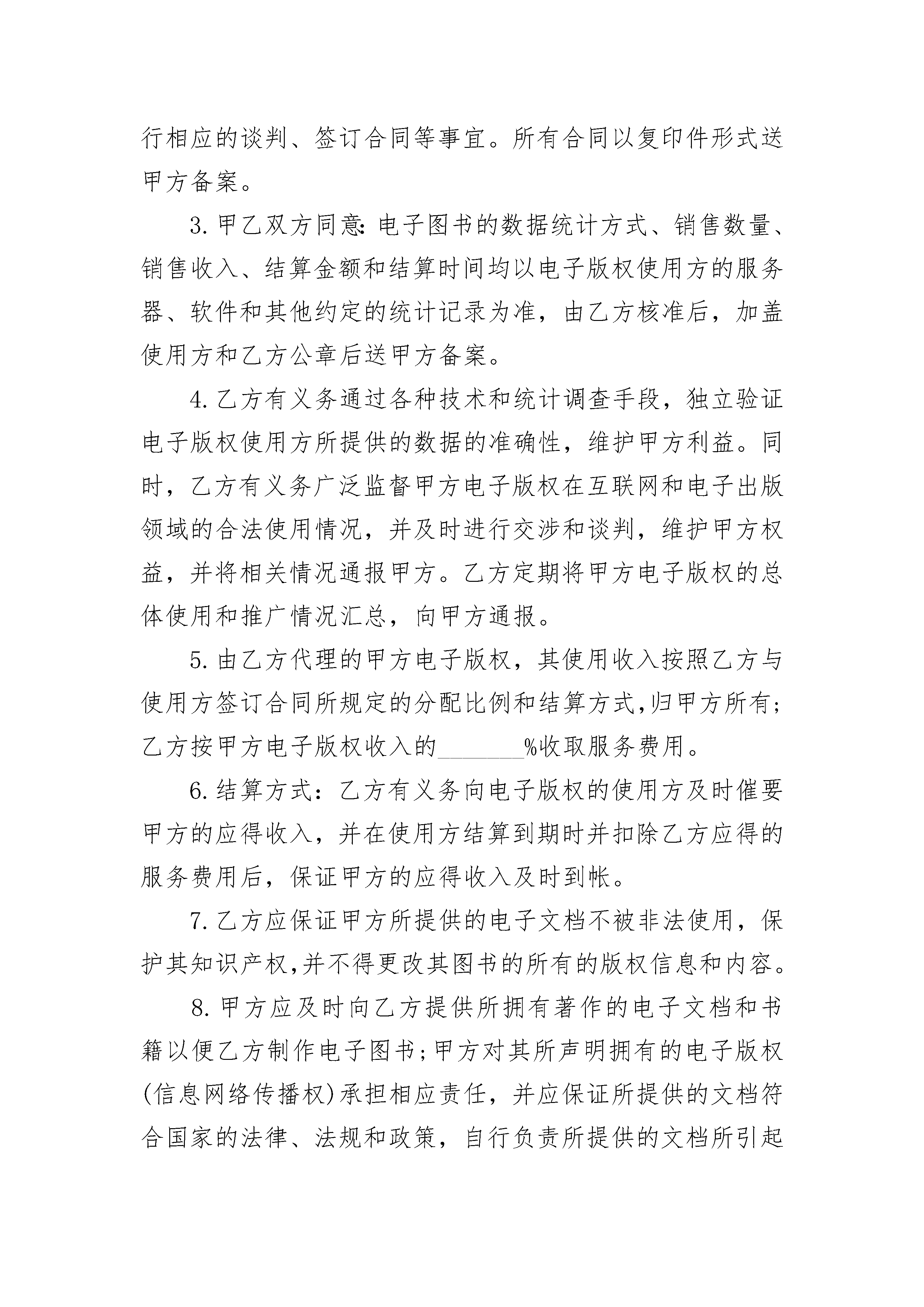 图书电子版权委托协议图书电子版权委托协议(通用3篇)图书电子版权委托协议篇1甲方(委托方):________________地址:__________________________电话:__________________________乙方(代理方):________________地址:__________________________电话:__________________________一、代理委托和代理期限:甲方将其拥有电子版权(信息网络传播权)的图书________等共____部(详见第三条)委托给甲方代理。代理期限从合同签订之日起共____年(以最后一年当年电子版权使用收入最后一次结算日为合同截止日期)。二、乙方代理内容如下:1.推广和开发甲方所委托的电子版权。包括:与_______网络事业传播部、_______学术期刊电子杂志社图书工程中心、超星数字图书馆、中国书生、中国数字图书馆等电子图书出版公司和数字图书馆机构合作,以各种技术格式制作和销售上述著作的电子图书;与其他网络和电子媒体合作,对甲方所委托的信息网络传播权进行开发利用,实现其价值增值。2.甲方委托乙方代理甲方权益,与电子版权的使用方进行相应的谈判、签订合同等事宜。所有合同以复印件形式送甲方备案。3.甲乙双方同意:电子图书的数据统计方式、销售数量、销售收入、结算金额和结算时间均以电子版权使用方的服务器、软件和其他约定的统计记录为准,由乙方核准后,加盖使用方和乙方公章后送甲方备案。4.乙方有义务通过各种技术和统计调查手段,独立验证电子版权使用方所提供的数据的准确性,维护甲方利益。同时,乙方有义务广泛监督甲方电子版权在互联网和电子出版领域的合法使用情况,并及时进行交涉和谈判,维护甲方权益,并将相关情况通报甲方。乙方定期将甲方电子版权的总体使用和推广情况汇总,向甲方通报。5.由乙方代理的甲方电子版权,其使用收入按照乙方与使用方签订合同所规定的分配比例和结算方式,归甲方所有;乙方按甲方电子版权收入的_______%收取服务费用。6.结算方式:乙方有义务向电子版权的使用方及时催要甲方的应得收入,并在使用方结算到期时并扣除乙方应得的服务费用后,保证甲方的应得收入及时到帐。7.乙方应保证甲方所提供的电子文档不被非法使用,保护其知识产权,并不得更改其图书的所有的版权信息和内容。8.甲方应及时向乙方提供所拥有著作的电子文档和书籍以便乙方制作电子图书;甲方对其所声明拥有的电子版权(信息网络传播权)承担相应责任,并应保证所提供的文档符合国家的法律、法规和政策,自行负责所提供的文档所引起的侵犯第三者相关权益所引起的纠纷。9.甲方应保证在合同期限内,不将其声明拥有的、并已委托给乙方的电子版权(信息网络传播权)再将本合同所涵盖的代理权委托给其他单位或个人。甲方仍拥有自行使用其电子版权的权利。甲方在合同期满后可选择收回授权或继续续约。10.如在合同有效期间,代理方由于经营困难、业务转向等原因造成无法有效行使代理权,则授权方可收回授权,自行处理与其电子版权相关的一切事务。三、授权范围:1.甲方同意将其已出版书籍的电子版权委托给乙方代理,详细清单见附录。2.甲方同意其在合同有效期内所出版书籍的电子版权预先委托给乙方代理。3.甲方申明拥有上述图书的电子版权(信息网络传播权)。甲方:(签章)________________年_____月_____日乙方:(签章)________________年_____月_____日附录:甲方委托著作的名称、出版社及书号:______________图书电子版权委托协议篇2甲方:_____________________乙方:_____________________甲方系______________,乙方系______________,是电子商务平台的'供应商用户。依据《_____》等法律法规的有关规定,经协商一致,双方就电子商务平台服务有关事项签订本电子商务平台服务合同(以下称本合同):第一条:服务及条件1、甲方向乙方提供电子商务平台使用服务,具体功能包括但不限于供应商信息在线管理、网上报价、竞价、在线投标、供应商网上专卖店、_______物流中心供应商网上寄售店信息反馈等,以电子商务平台实际提供功能为准。2、甲方负责开发和维护包括但不限于前款所述电子商务平台各项功能,并提供工作日8小时工作时间内的技术支持。3、乙方可使用电子商务平台从事_______采购有关的商务活动,并应遵守国家法律、法规及_______供应商管理要求。4、乙方应对电子商务平台用户名、登陆密码、硬件加密锁等信息采取保密措施,承担保密义务和责任。5、乙方应在使用电子商务平台遇到任何信息错误、系统故障、功能瑕疵时,及时寻求甲方技术支持,提供使用情况反馈,以便甲方解决系统问题