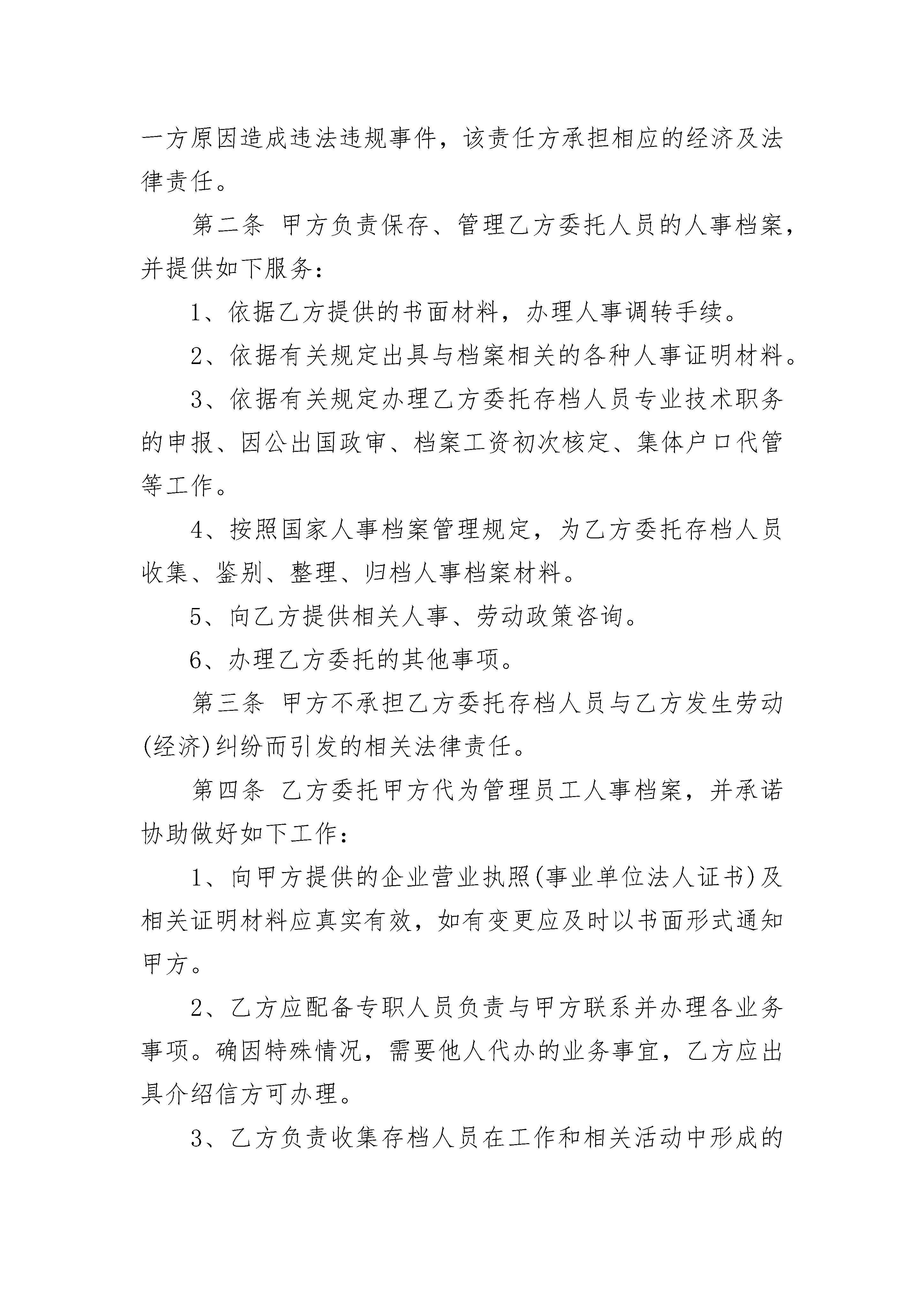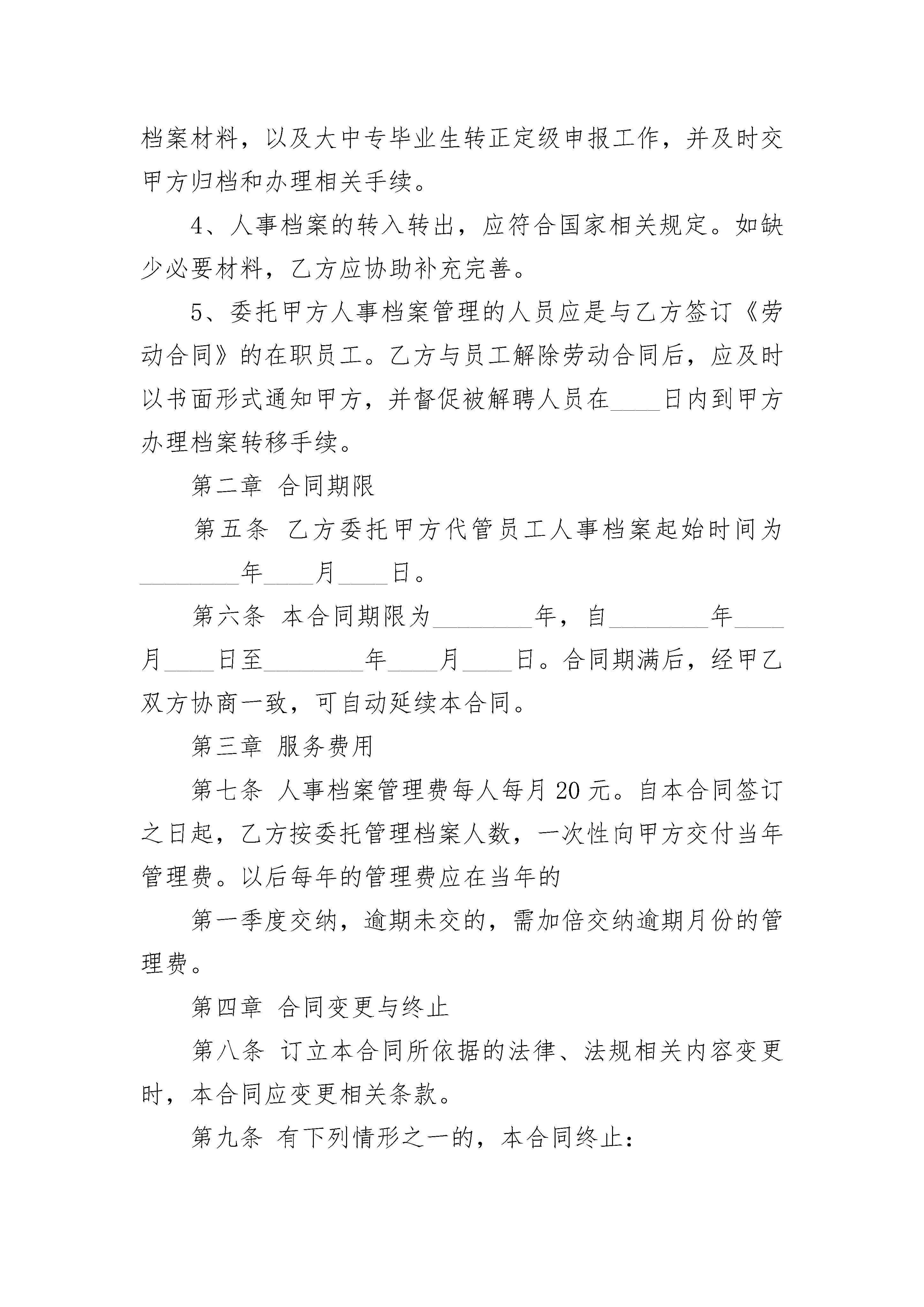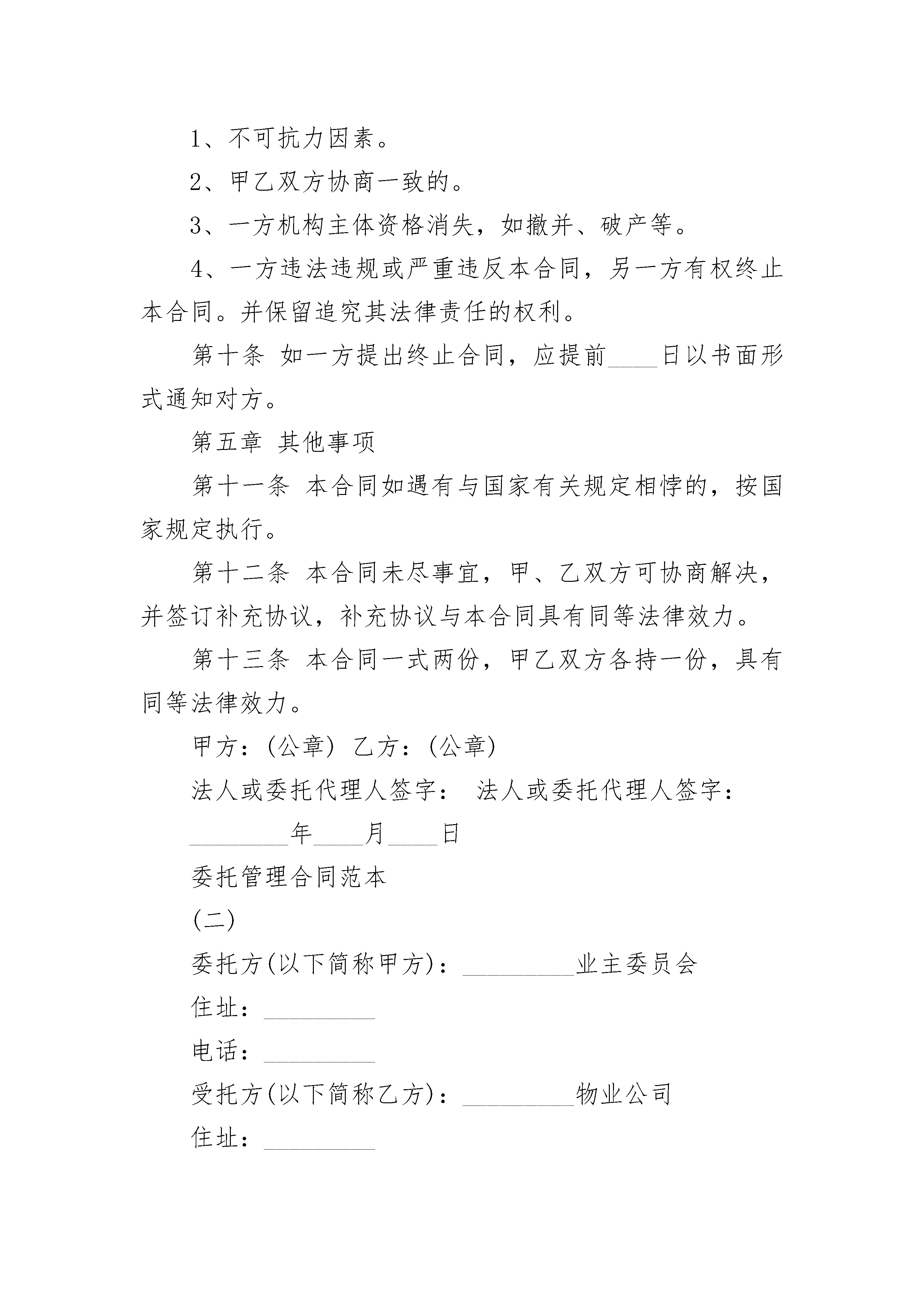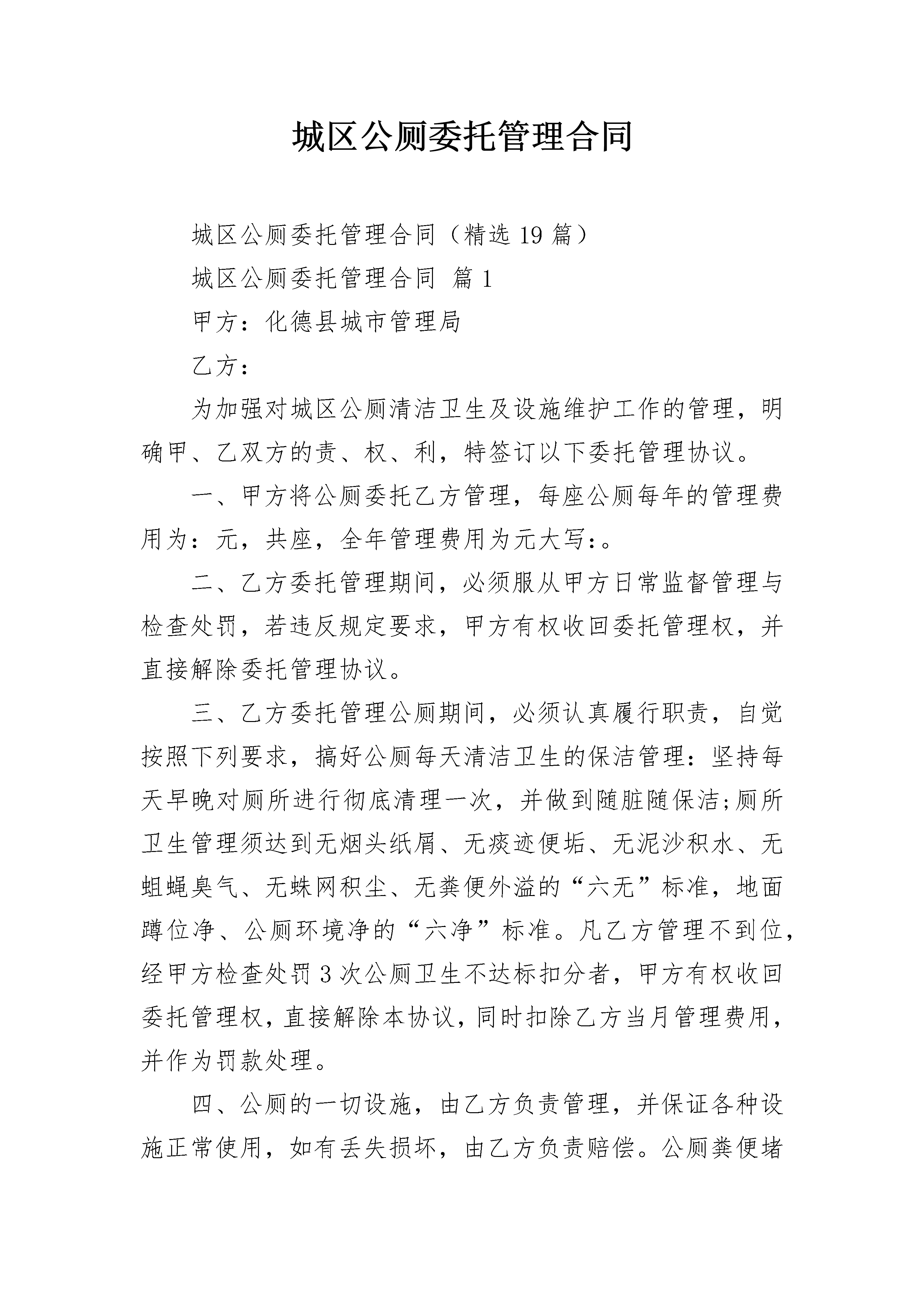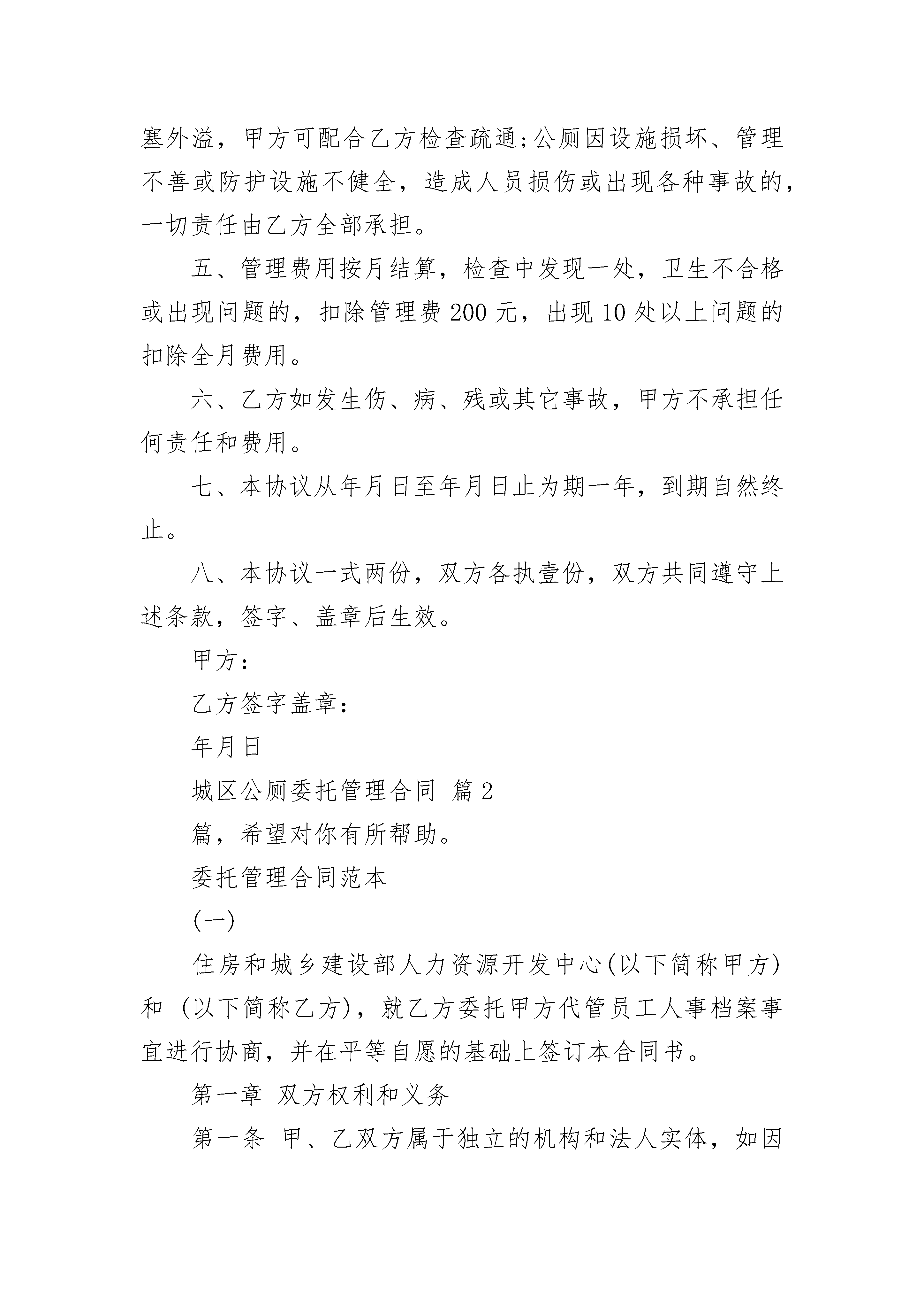 城区公厕委托管理合同城区公厕委托管理合同(精选19篇)城区公厕委托管理合同篇1甲方:化德县城市管理局乙方:为加强对城区公厕清洁卫生及设施维护工作的管理,明确甲、乙双方的责、权、利,特签订以下委托管理协议。一、甲方将公厕委托乙方管理,每座公厕每年的管理费用为:元,共座,全年管理费用为元大写:。二、乙方委托管理期间,必须服从甲方日常监督管理与检查处罚,若违反规定要求,甲方有权收回委托管理权,并直接解除委托管理协议。三、乙方委托管理公厕期间,必须认真履行职责,自觉按照下列要求,搞好公厕每天清洁卫生的保洁管理:坚持每天早晚对厕所进行彻底清理一次,并做到随脏随保洁;厕所卫生管理须达到无烟头纸屑、无痰迹便垢、无泥沙积水、无蛆蝇臭气、无蛛网积尘、无粪便外溢的“六无”标准,地面蹲位净、公厕环境净的“六净”标准。凡乙方管理不到位,经甲方检查处罚3次公厕卫生不达标扣分者,甲方有权收回委托管理权,直接解除本协议,同时扣除乙方当月管理费用,并作为罚款处理。四、公厕的一切设施,由乙方负责管理,并保证各种设施正常使用,如有丢失损坏,由乙方负责赔偿。公厕粪便堵塞外溢,甲方可配合乙方检查疏通;公厕因设施损坏、管理不善或防护设施不健全,造成人员损伤或出现各种事故的,一切责任由乙方全部承担。五、管理费用按月结算,检查中发现一处,卫生不合格或出现问题的,扣除管理费200元,出现10处以上问题的扣除全月费用。六、乙方如发生伤、病、残或其它事故,甲方不承担任何责任和费用。七、本协议从年月日至年月日止为期一年,到期自然终止。八、本协议一式两份,双方各执壹份,双方共同遵守上述条款,签字、盖章后生效。甲方:乙方签字盖章:年月日城区公厕委托管理合同篇2篇,希望对你有所帮助。委托管理合同范本(一)住房和城乡建设部人力资源开发中心(以下简称甲方)和(以下简称乙方),就乙方委托甲方代管员工人事档案事宜进行协商,并在平等自愿的基础上签订本合同书。第一章双方权利和义务第一条甲、乙双方属于独立的机构和法人实体,如因一方原因造成违法违规事件,该责任方承担相应的经济及法律责任。第二条甲方负责保存、管理乙方委托人员的人事档案,并提供如下服务:1、依据乙方提供的书面材料,办理人事调转手续。2、依据有关规定出具与档案相关的各种人事证明材料。3、依据有关规定办理乙方委托存档人员专业技术职务的申报、因公出国政审、档案工资初次核定、集体户口代管等工作。4、按照国家人事档案管理规定,为乙方委托存档人员收集、鉴别、整理、归档人事档案材料。5、向乙方提供相关人事、劳动政策咨询。6、办理乙方委托的其他事项。第三条甲方不承担乙方委托存档人员与乙方发生劳动(经济)纠纷而引发的相关法律责任。第四条乙方委托甲方代为管理员工人事档案,并承诺协助做好如下工作:1、向甲方提供的企业营业执照(事业单位法人证书)及相关证明材料应真实有效,如有变更应及时以书面形式通知甲方。2、乙方应配备专职人员负责与甲方联系并办理各业务事项。确因特殊情况,需要他人代办的业务事宜,乙方应出具介绍信方可办理。3、乙方负责收集存档人员在工作和相关活动中形成的档案材料,以及大中专毕业生转正定级申报工作,并及时交甲方归档和办理相关手续。4、人事档案的转入转出,应符合国家相关规定。如缺少必要材料,乙方应协助补充完善。5、委托甲方人事档案管理的人员应是与乙方签订《劳动合同》的在职员工。乙方与员工解除劳动合同后,应及时以书面形式通知甲方,并督促被解聘人员在____日内到甲方办理档案转移手续。第二章合同期限第五条乙方委托甲方代管员工人事档案起始时间为________年____月____日。第六条本合同期限为________年,自________年____月____日至________年____月____日。合同期满后,经甲乙双方协商一致,可自动延续本合同。第三章服务费用第七条人事档案管理费每人每月20元。自本合同签订之日起,乙方按委托管理档案人数,一次性向甲方交付当年管理费。以后每年的管理费应在当年的第一季度交纳,逾期未交的,需加倍交纳逾期月份的管理费。第四章合同变更与终止第八条订立本合同所依据的法律、法规相关内容变更时,本合同应变更相关条款。第九条有下列情形之一的,本合同终止:1、不可抗力因素。2、甲乙双方协商一致的。3、一方机构主体资格消失,如撤并、破产等。4、一方违法违规或严重违反本合同,另一方有权终止本合同。并保留追究其法律责任的权利。第十条如一方提出终止合同,应提前____日以书面形式通知对方。第五章其他事项第十一条本合同如遇有与国家有关规定相悖的,按国家规定执行。第十二条本合同未尽事宜,甲、乙双方可协商解决,并签订补充协议,补充协议与本合同具有同等法律效力。第十三条本合同一式两份,甲乙双方各持一份,具有同等法律效力。甲方:(公章)乙方:(公章)法人
